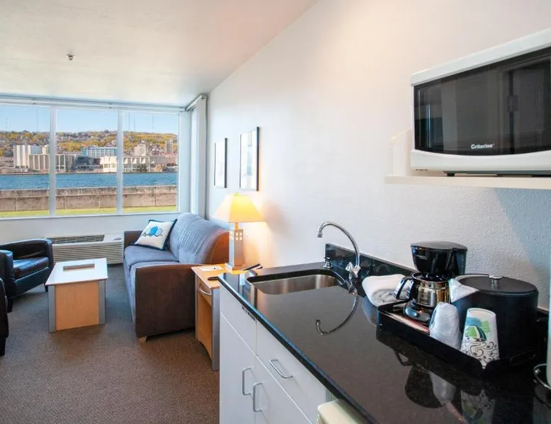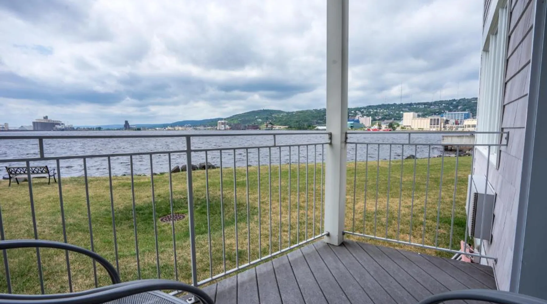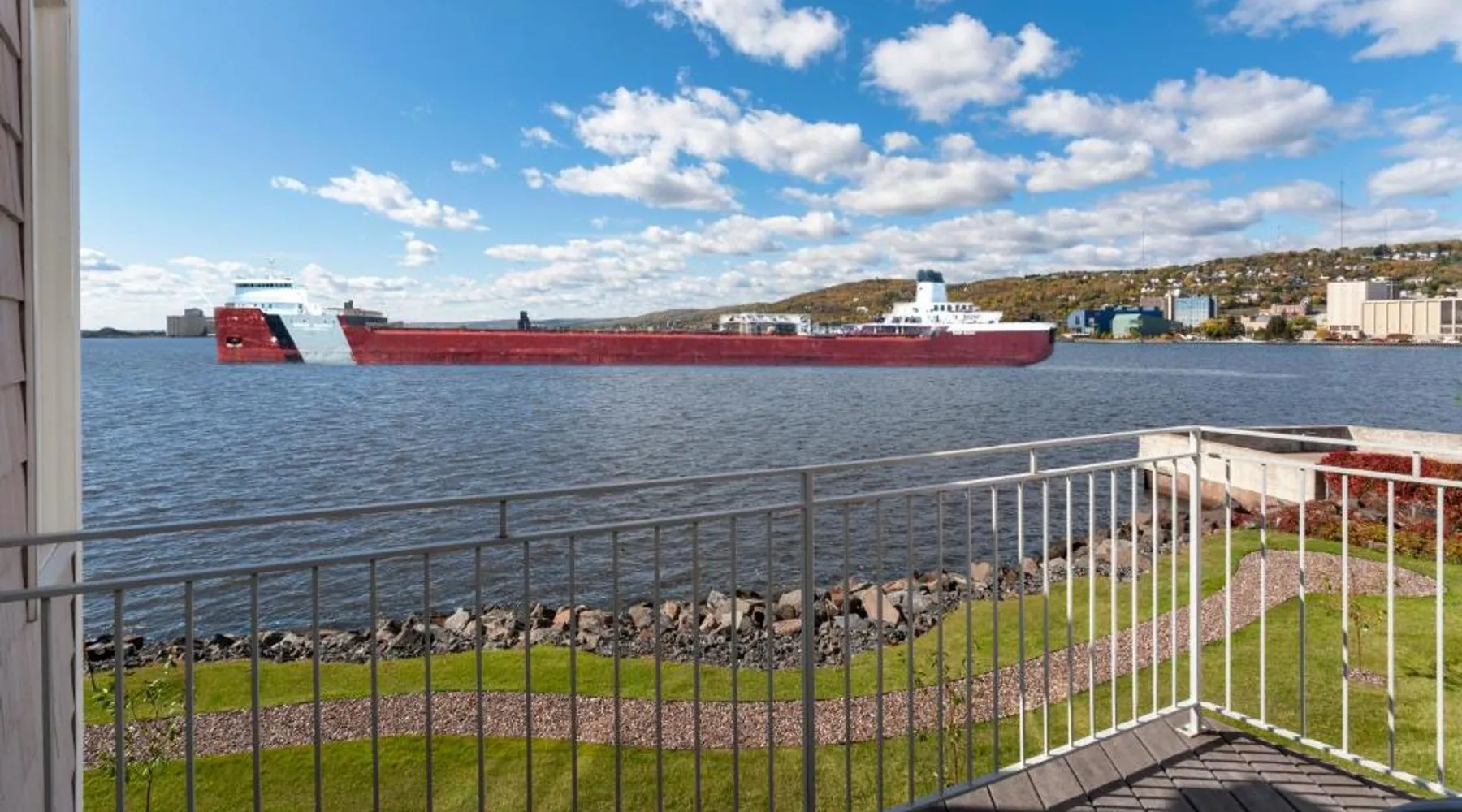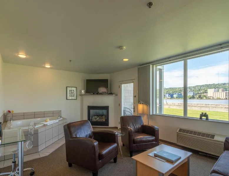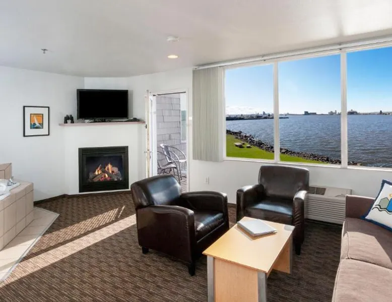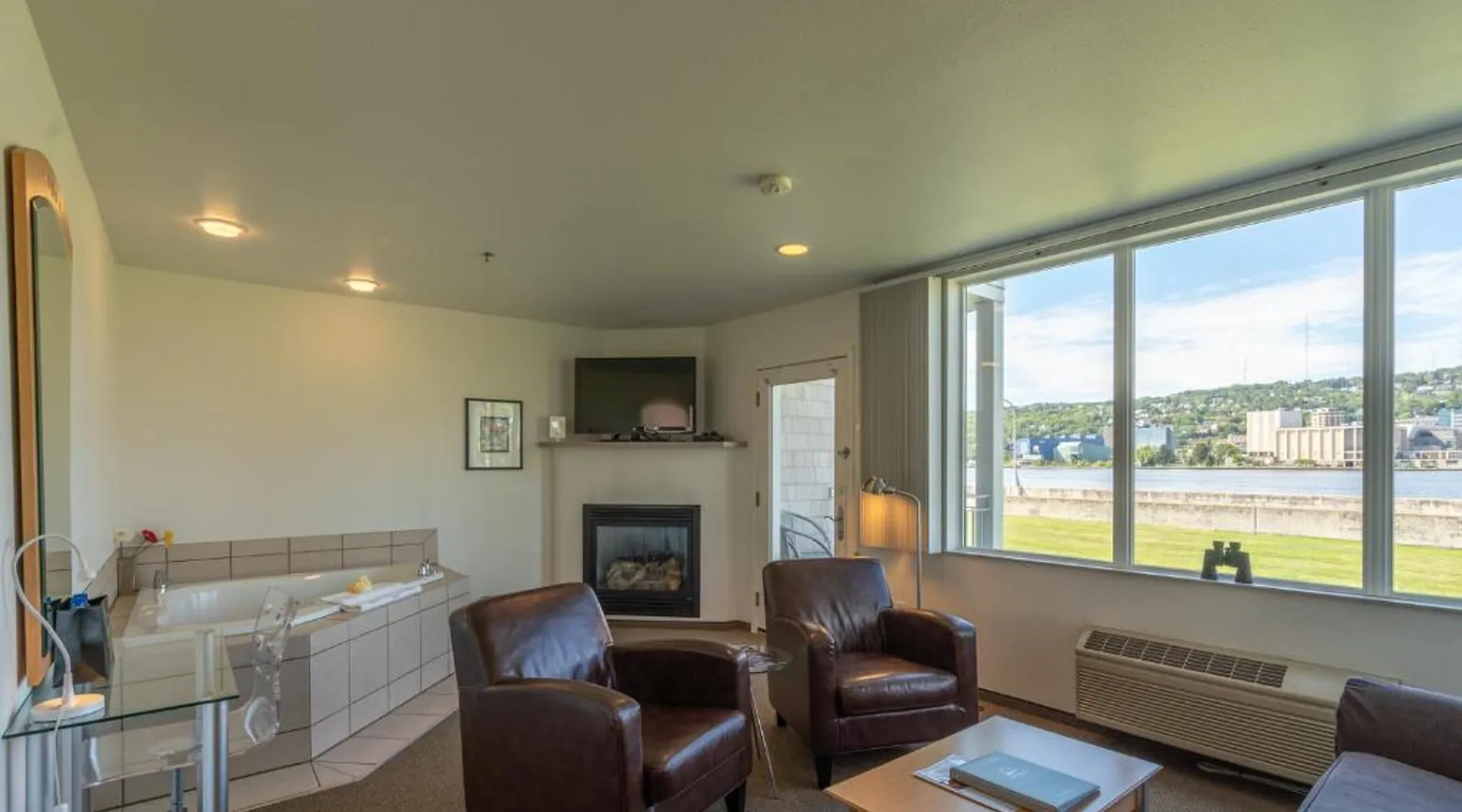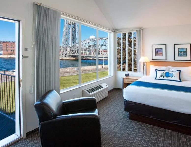 Situated between Lake Superior and Duluth Harbor Basin, this waterfront hotel is nestled at the foot of the Duluth Aerial Lift Bridge. Free Wi-Fi and a flat-screen TV are provided in every guest room. All waterfront suites at South Pier Inn have private balconies, which provide the opportunity for our guests to look eye-to-eye with ships captains, as international vessels enter the harbor under the Aerial Lift Bridge. A refrigerator and tea and coffee-making amenities are also provided in each room. Guests can enjoy a walk or enjoy a sunset from the private 400 foot shoreline path at South Pier Inn. A complimentary continental breakfast is served each morning. Duluth Entertainment Convention Center, located across the harbor, is less than one mile away. Duluth city center, Great Lakes Aquarium and Bayfront Festival Park are a 5 minute drive from this hotel. This suite has a balcony, fireplace and spa bath.