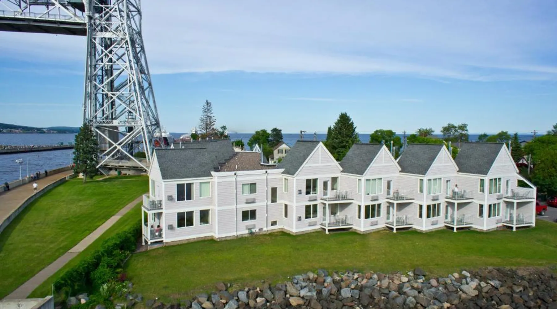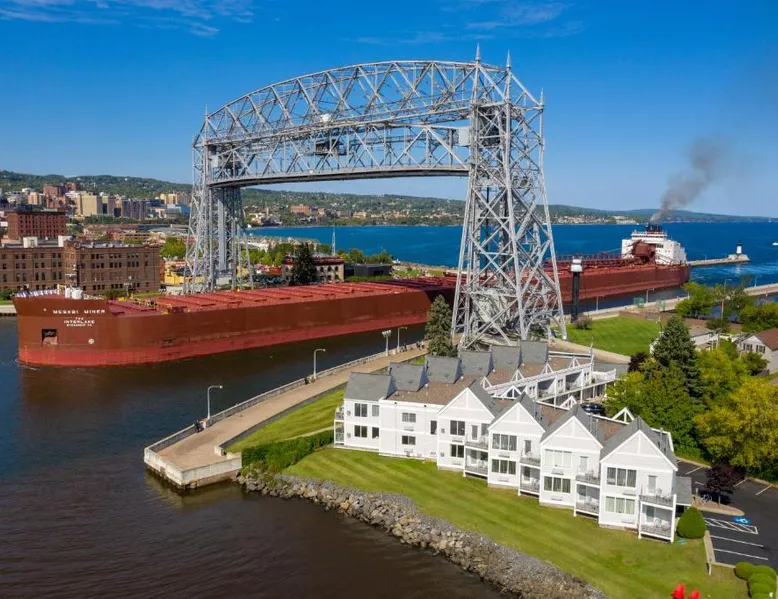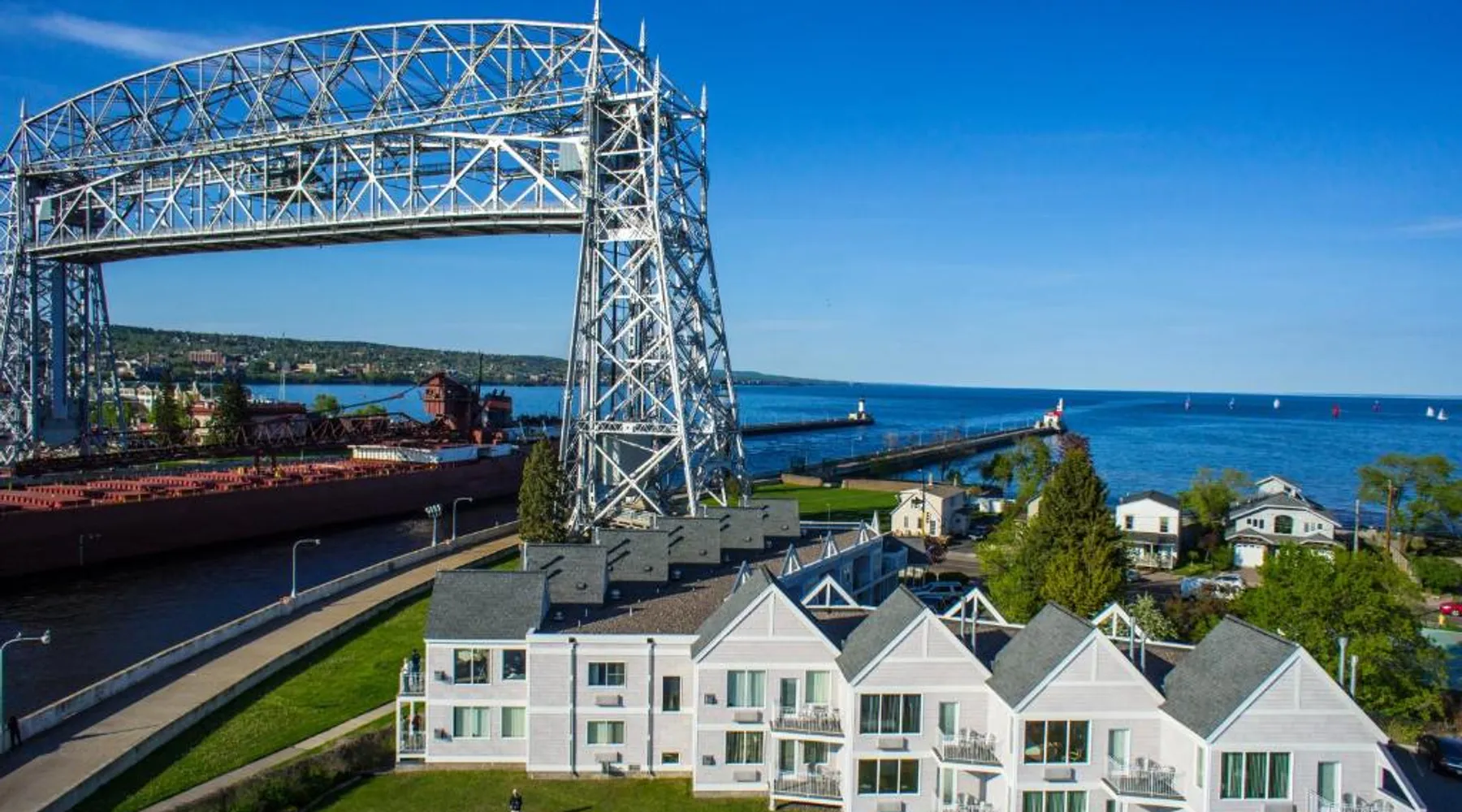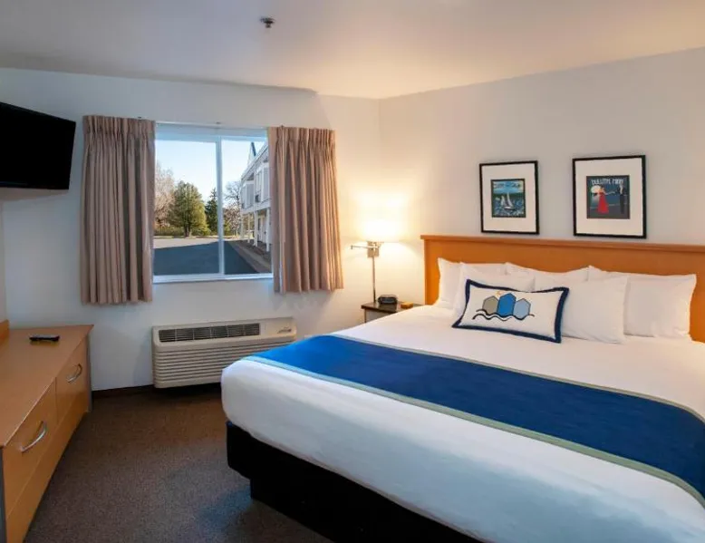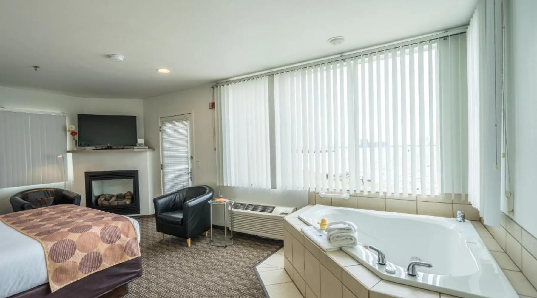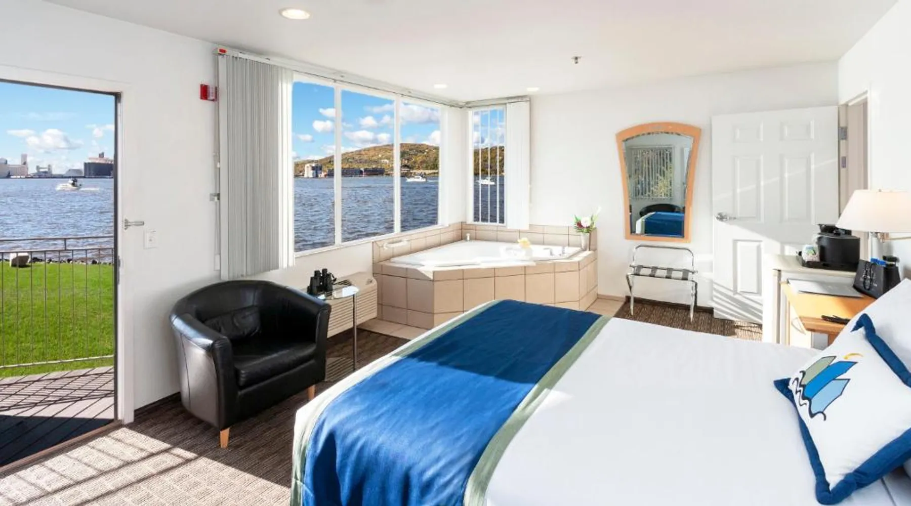 Situated between Lake Superior and Duluth Harbor Basin, this waterfront hotel is nestled at the foot of the Duluth Aerial Lift Bridge. Free Wi-Fi and a flat-screen TV are provided in every guest room. All waterfront suites at South Pier Inn have private balconies, which provide the opportunity for our guests to look eye-to-eye with ships captains, as international vessels enter the harbor under the Aerial Lift Bridge. A refrigerator and tea and coffee-making amenities are also provided in each room. Guests can enjoy a walk or enjoy a sunset from the private 400 foot shoreline path at South Pier Inn. A complimentary continental breakfast is served each morning. Duluth Entertainment Convention Center, located across the harbor, is less than one mile away. Duluth city center, Great Lakes Aquarium and Bayfront Festival Park are a 5 minute drive from this hotel. This suite has a balcony, fireplace and spa bath.