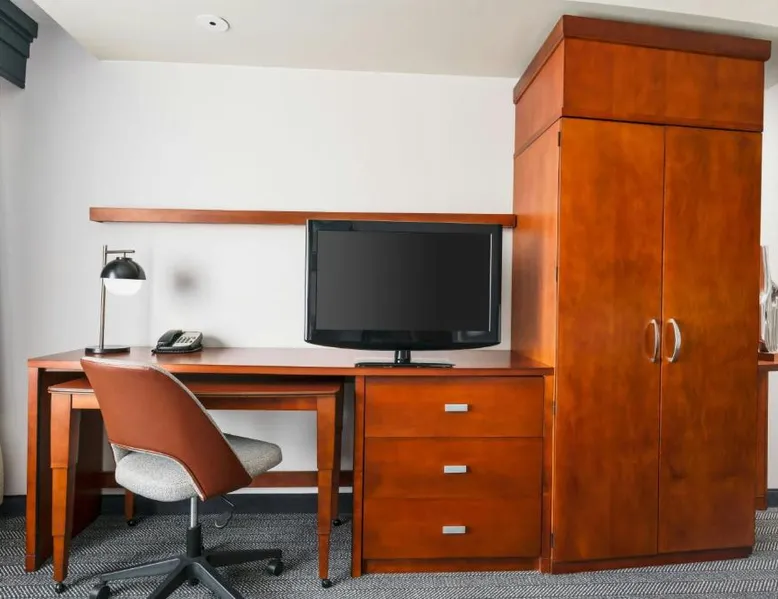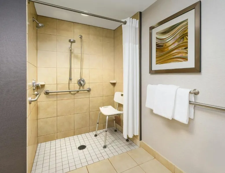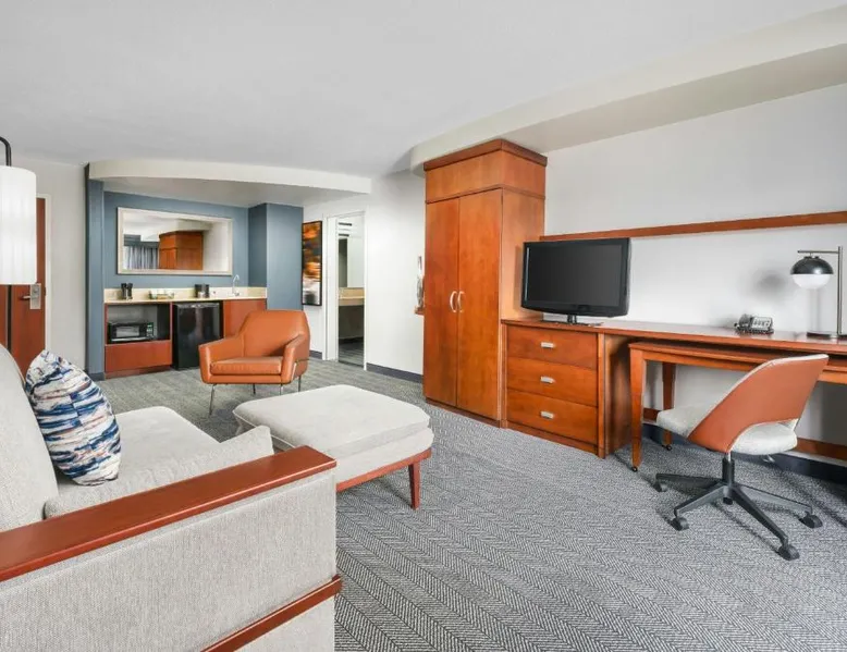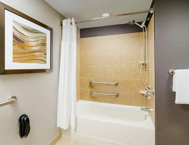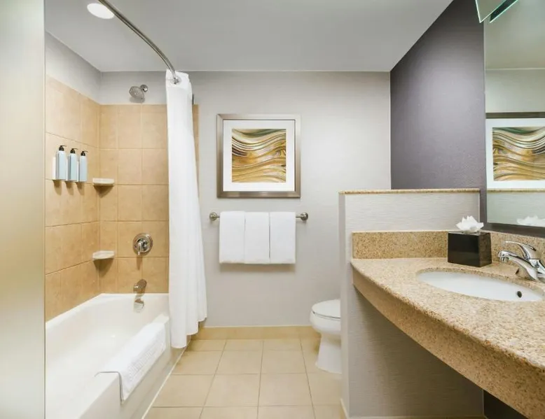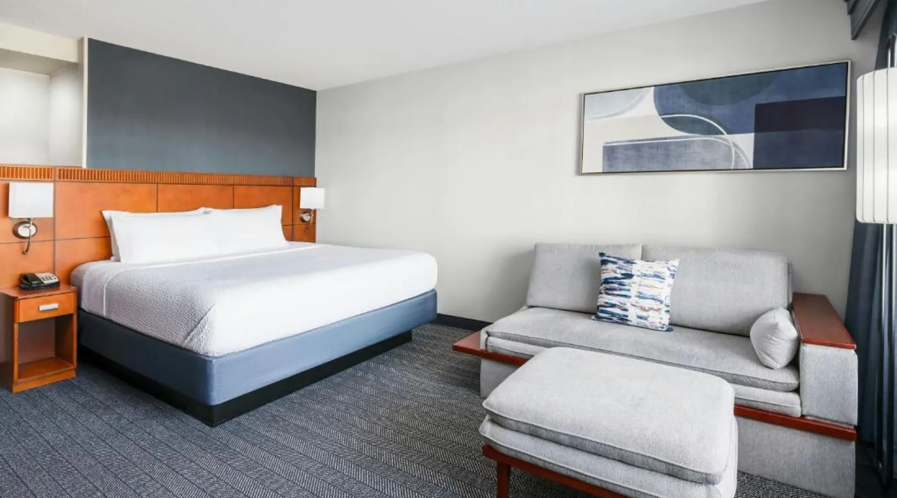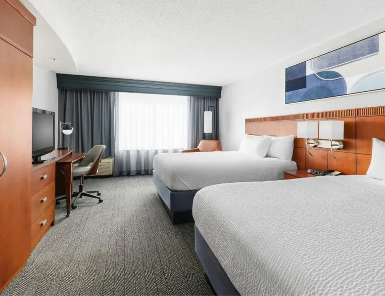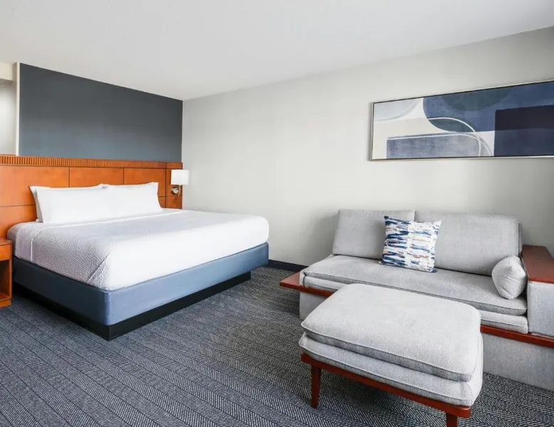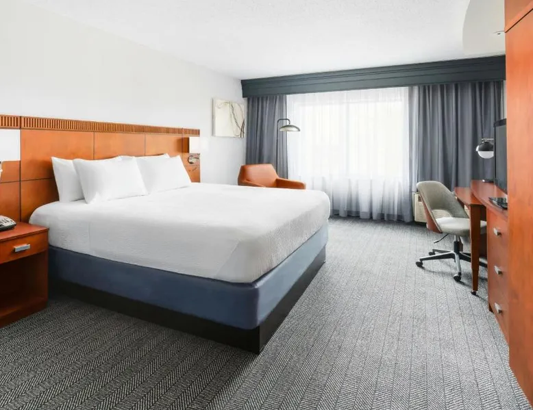 Comfortable Accommodations: Courtyard Hartford Farmington in Farmington offers air-conditioned rooms with private bathrooms, free WiFi, and modern amenities. Each room includes a work desk, TV, and complimentary toiletries. Dining and Leisure: Guests can enjoy an indoor swimming pool, terrace, restaurant, and bar. The modern restaurant serves American cuisine for dinner and cocktails. Free on-site parking is available. Convenient Location: Located 21 mi from Bradley International Airport, the hotel is near attractions such as Central Connecticut State University (2.9 mi) and the Mark Twain House (5.6 mi). An ice-skating rink is in the surroundings. Guest Satisfaction: Highly rated for room cleanliness, attentive staff, and excellent breakfast. This room has a refrigerator, coffee-making facilities, and cable TV.