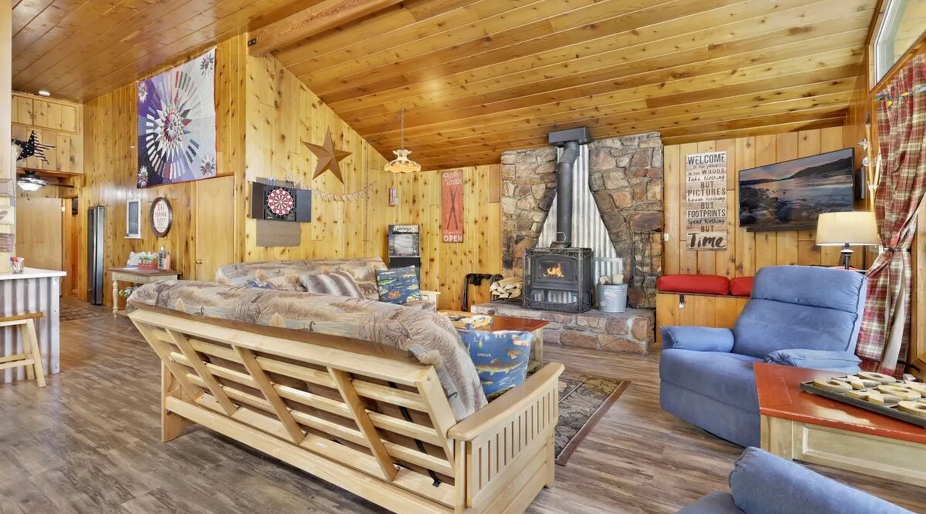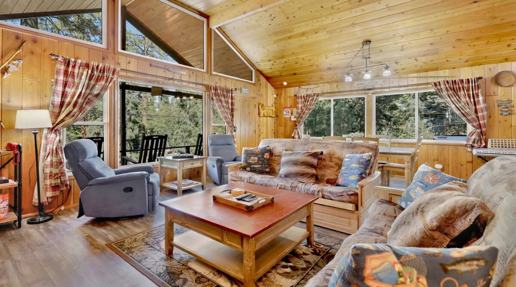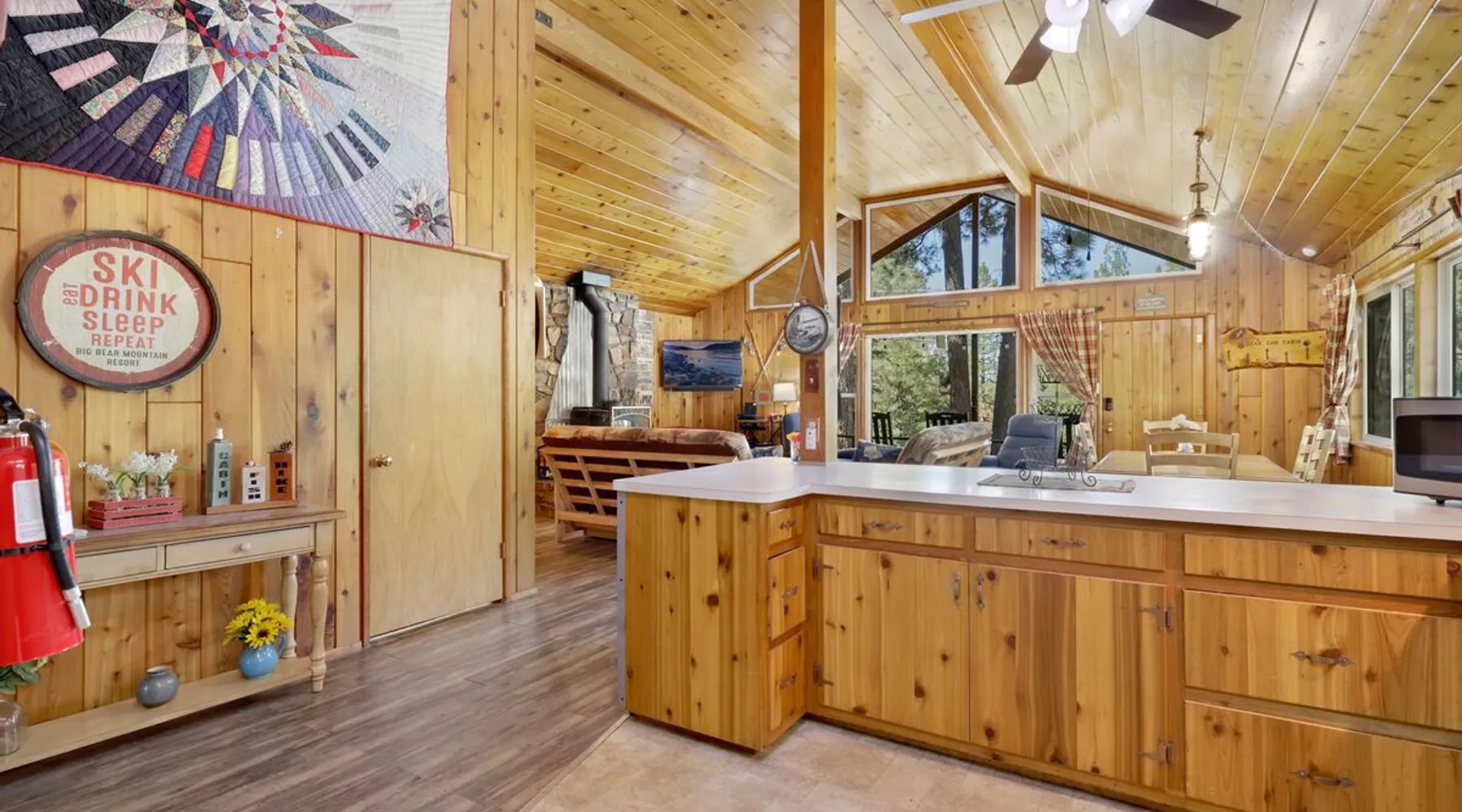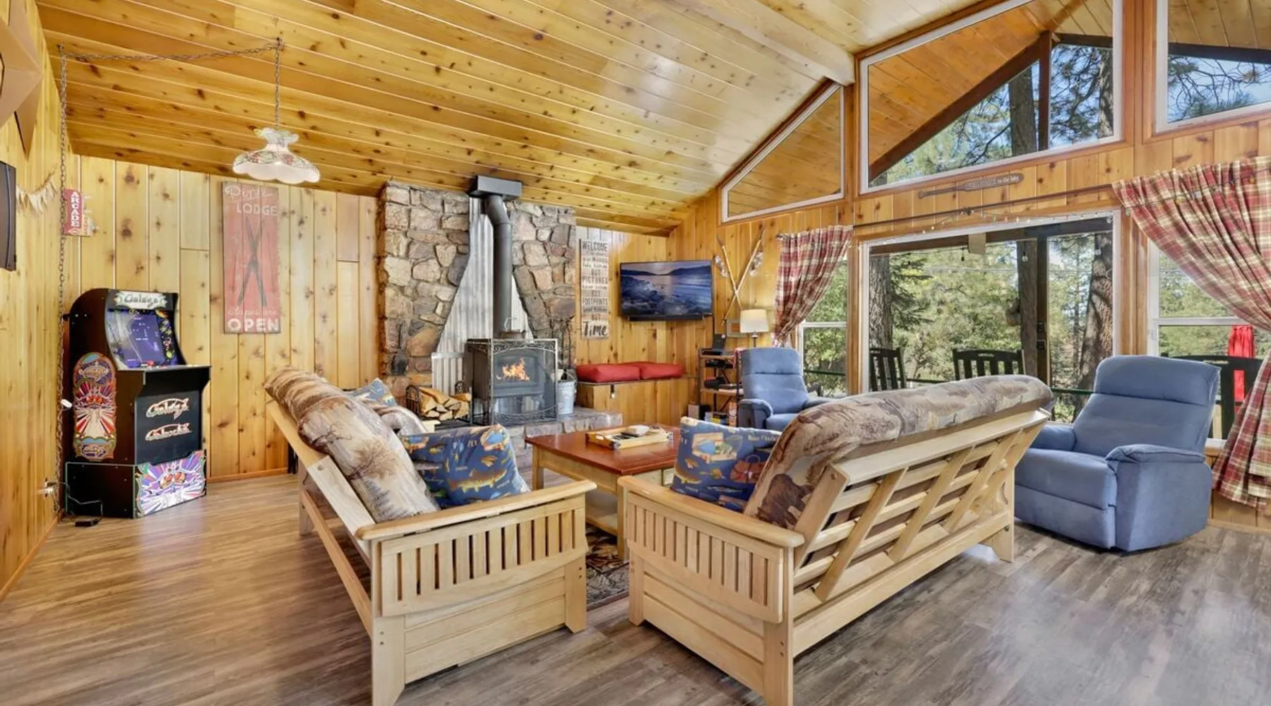 Perfect for those looking to experience the best of Big Bear our single level fully furnished Bear Cub Cabin is all that you need in your next home away from home! Boasting a secluded yet prime central location you are minutes from all local activities and especially close to Bear Mountain Resort for year round hiking, skiing, and golf plus the newly reopened Alpine Zoo is less than a half a mile away! The space Bear Cub Cabin | Cozy Resort Cabin w/ Hot Tub & Games Perfect for those looking to experience the best of Big Bear our single level fully furnished Bear Cub Cabin is all that you need in your next home away from home! Boasting a secluded yet prime central location you are minutes from all local activities and especially close to Bear Mountain Resort for year round hiking, skiing, and golf plus the newly reopened Alpine Zoo is less than a half a mile away! Featuring a spacious open floor plan with gorgeous windows for the perfect combination of natural lighting and views for watching the snow fall in the winter months. You will enter into an ultra cozy and warm living room area boasting knotty pine walls and ceilings, you will immediately feel at home. The mountain charm eludes through this cabin, with comfy sitting couches and chairs sat perfectly in front of a rock wood burning fireplace and mounted Smart TV- this is the perfect snuggle spot for those movies nights in. The open floor plan leads right into the equipped kitchen and dining areas, complete with a spacious dining table and breakfast bar stools to provide ample sitting areas for your group meals together. The chef of your group will love this cute kitchen, the pine cabinets are stocked with cookware and utensils for you to prepare your meals while a stacked washer and dryer is on hand for those wet snow clothes or long term stays. Venturing outside you will find the most serene alpine escape, with a cute front redwood deck and sitting chairs to sip your first cup of coffee in the mornings among the birds. You will also love the front deck area, covered in pine trees with a nice picnic table, rocking chairs and propane BBQ for your evenings unwinding under the stars and grilling up your catch from the lake. Stepping into the backyard, you will find a secluded private spa to end your days soaking under the stars! Bear Cub Cabin will leave you wanting to come back year after year! Sleeping Arrangements: Bedroom 1: King Bed Bedroom 2: Two Twin Beds Living Room: Queen Futon Bathroom Arrangements: Hallway 3/4 Bath (Shower Only) -Sleeps 5 -2 Cars Driveway Parking -NO PETS ALLOWED- Fines Imposed For Pets Found On Site -1,050 Total Square Feet City Permit #: VRR-2024-1629 Registration Details 2024-1629