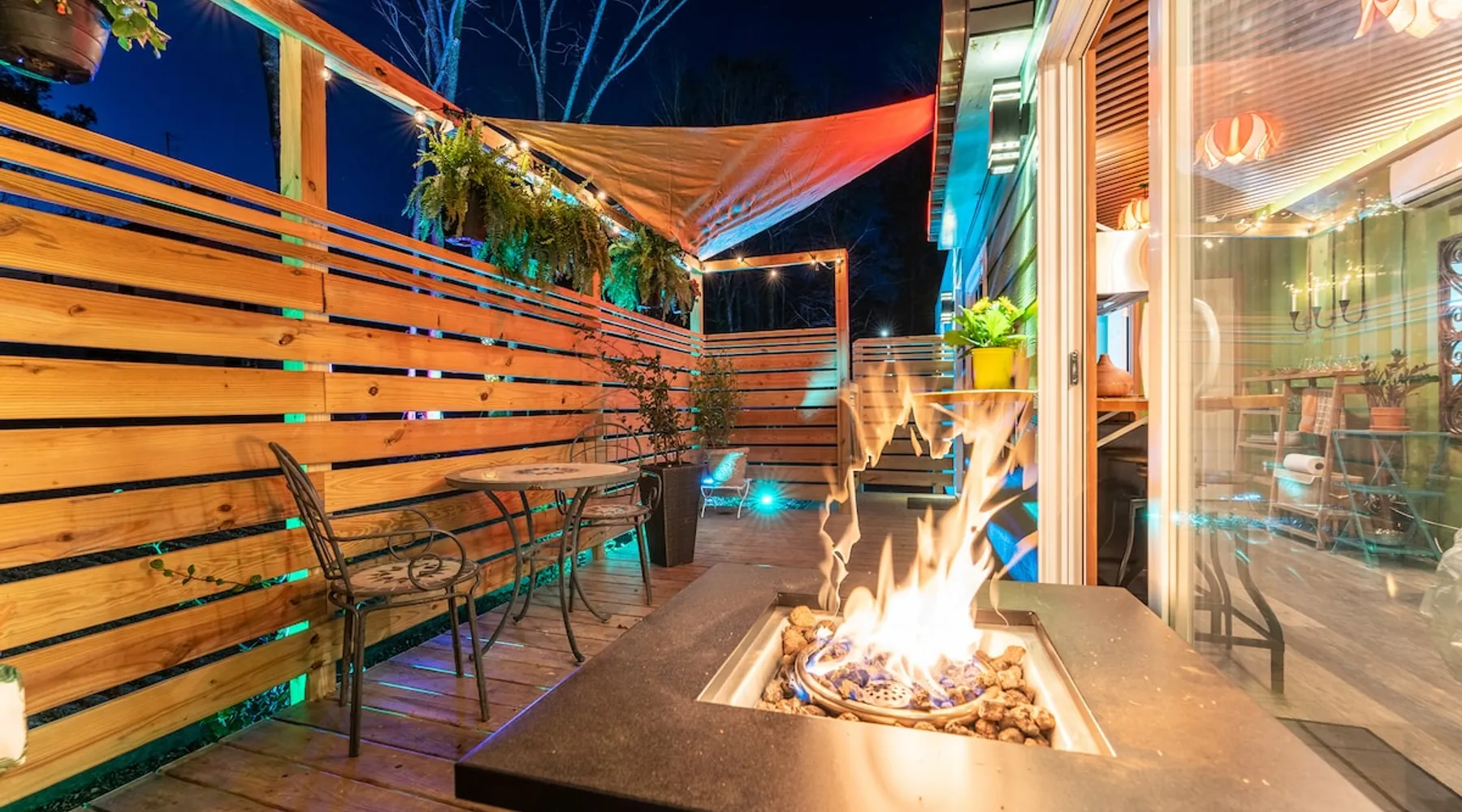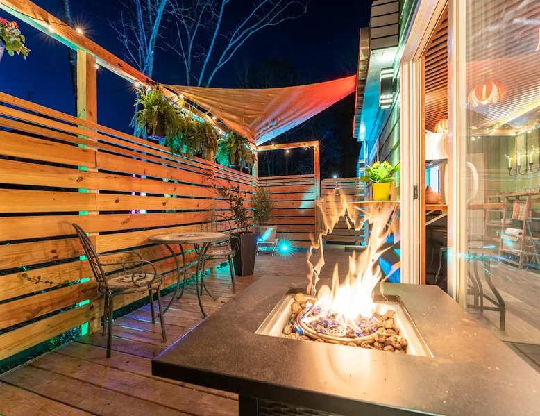 "Tiny Sun". The newest Ultra Luxury Shipping Contain built by the talented community members. In total there are 3 luxury tiny homes on the property, all available through Airbnb. It is 300 sq ft including the 80 sq ft bathroom with dual waterfall showers and heated floors. Lotus flower lights hang from 9 foot 6 inch ceilings. 200 sq ft enclosed deck for your furry family member(s). Smart lighting with 16 million color choices, 400 MB Internet, Amazon 3D speaker, TV with Prime/Netflix. The space Amenities with total luxury in mind including: indirect led lighting in the crown molding that is adjustable to 16 million different colors, heated flooring in the bathroom, Pergo scratch resistant pet friendly flooring, top of the line HVAC that is whisper quiet, superfast 400 MB Wifi internet, aromatherapy diffuser with 6 types of oils including peppermint and lavender, 80 sq ft bathroom that has a 6 foot shower with dual waterfall shower heads and a tankless water heater providing instant hot water, fully functional kitchen, queen bed on a cool foam mattress, 50" 4K TV (Amazon Prime, Netflix) with Alexa 3D sound system, and a large private fenced in deck that includes a propane firepit, grill, and bar dining area. In total, there are 3 luxury tiny homes on the property, all available on Airbnb. Guest access Plenty of parking for oversize vehicles and boats and a 5 minute walk to historic Downtown. Other things to note 10% discount for active/retired members of the Armed Forces.