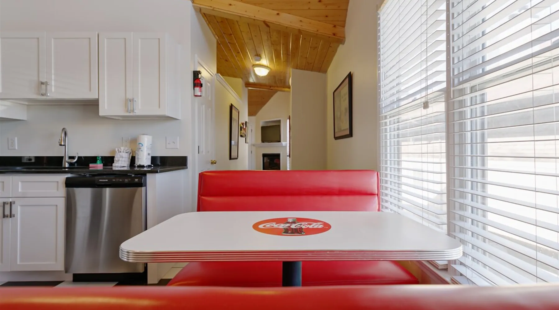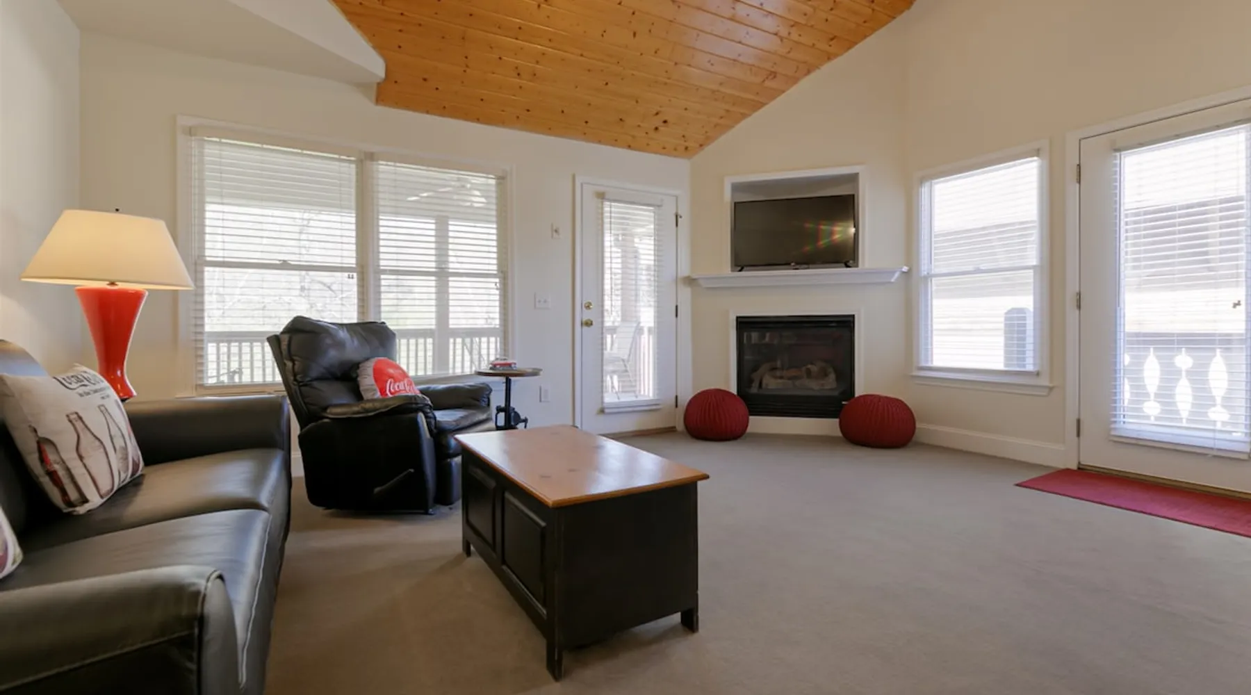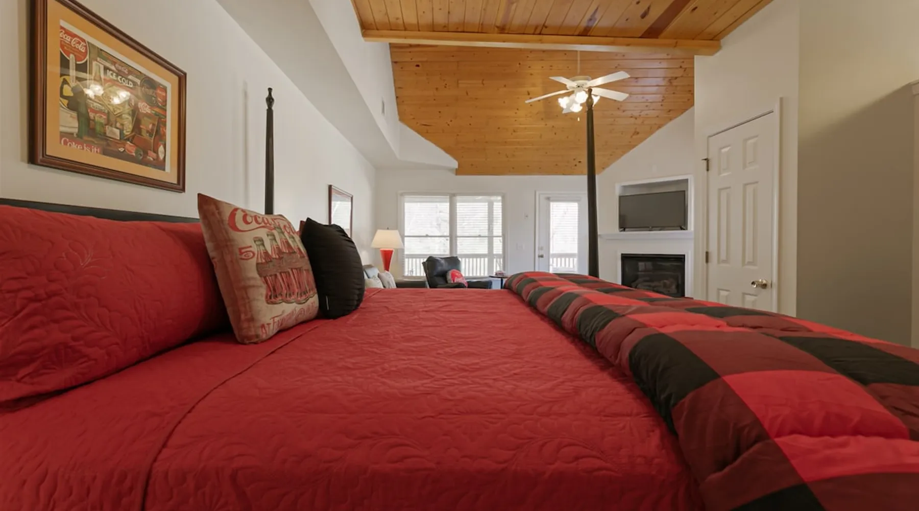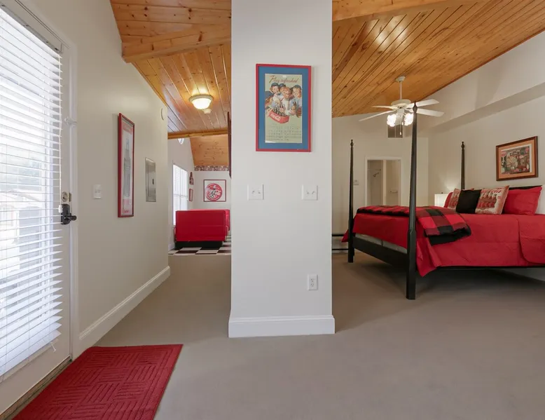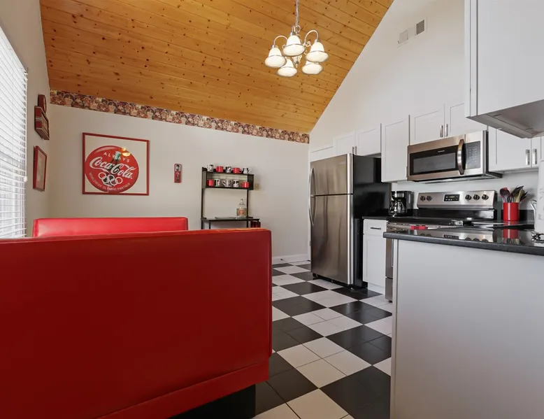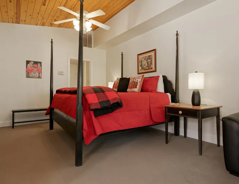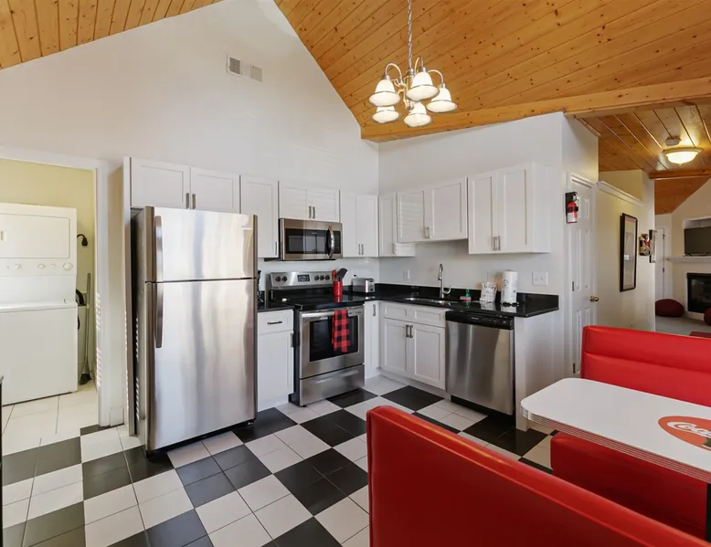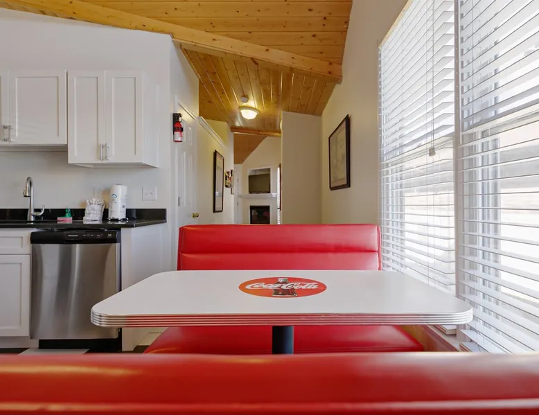 Enjoy this cozy Coca Cola Themed riverside condo minutes away from everything Helen has to offer. The space You are in the heart of all Helen has to offer. In the summer, you can walk to the access location for the Chattahoochee River Tubing. When you get back from tubing, grab a bite at the Pink Pig BBQ on your way back to the condo, or choose from one of the many other restaurants nearby. Sit out on the deck and enjoy the peacefulness as you watch the river flowing by. Grill out on the provided grill while you enjoy a glass of wine from one of our local wineries. There is so much to see and do in Helen. For the kids (and adults), there is the Alpine Coaster and several locations to play mini golf. Enjoy strolling the streets of Helen - whatever the season - and do some shopping or grab a funnel cake. Helen is a great location for family fun anytime of year. Come & visit during Oktoberfest where you can try German foods & beer, listen to authentic German music, and have the time of your life. If you prefer to enjoy nature and the more serene side of the area, there are some amazing hiking trails around Helen and outstanding waterfalls: Anna Ruby Falls near Unicoi State Park, Duke Creek Falls, or Raven Cliff Falls. There is something for everyone in Helen; make it your next vacation! Misc. - 2nd Level Unit - Coca-Cola Themed Interior - Parking for 1 Vehicle Living Room - High-Speed WiFi throughout unit - Fireplace with Gas Logs - Vaulted Tongue & Groove Ceilings - Smart TV with Streaming (Sign-In with your own accounts) - Leather Couch - Leather Recliner - Easy Access to Back Porch Overlooking River Bed Area - 1 King Bed - Dresser Bathroom - Essentials Provided - Single Vanity with Granite Countertops - Tiled Walk-In Shower Kitchen - Fully Equipped with Essentials Provided - Granite Countertops - Diner-Style Checkerboard Tiling - Stainless Steel Appliances - Refrigerator / Freezer - Oven / Range - Microwave - Toaster - Drip Coffee Maker - Coffee Mugs - Flatware - Glassware - Pots & Pans - Cookware - Stacked Washer & Dryer Dining Area - Diner Style Coca-Cola Themed Booth Dining Table Back Porch - Views of Chattahoochee River - Patio Table Common Area - Propane Grill (Propane Provided) Other things to note 25+ age requirement for lead guest. No exceptions. This property is not pet-friendly. No exceptions. Digital rental agreement will be required to sign and complete after property is booked. Tubes/kayaks not supplied. Georgia fishing license required for fishing on the property. This unit is on 2nd level of building. Parking available for 2 vehicles.