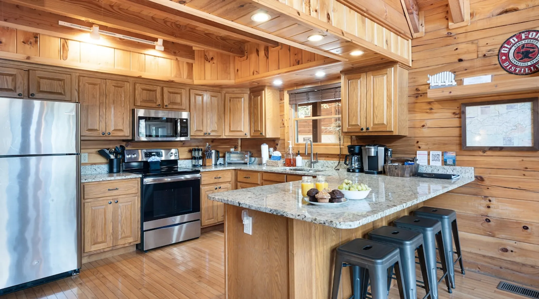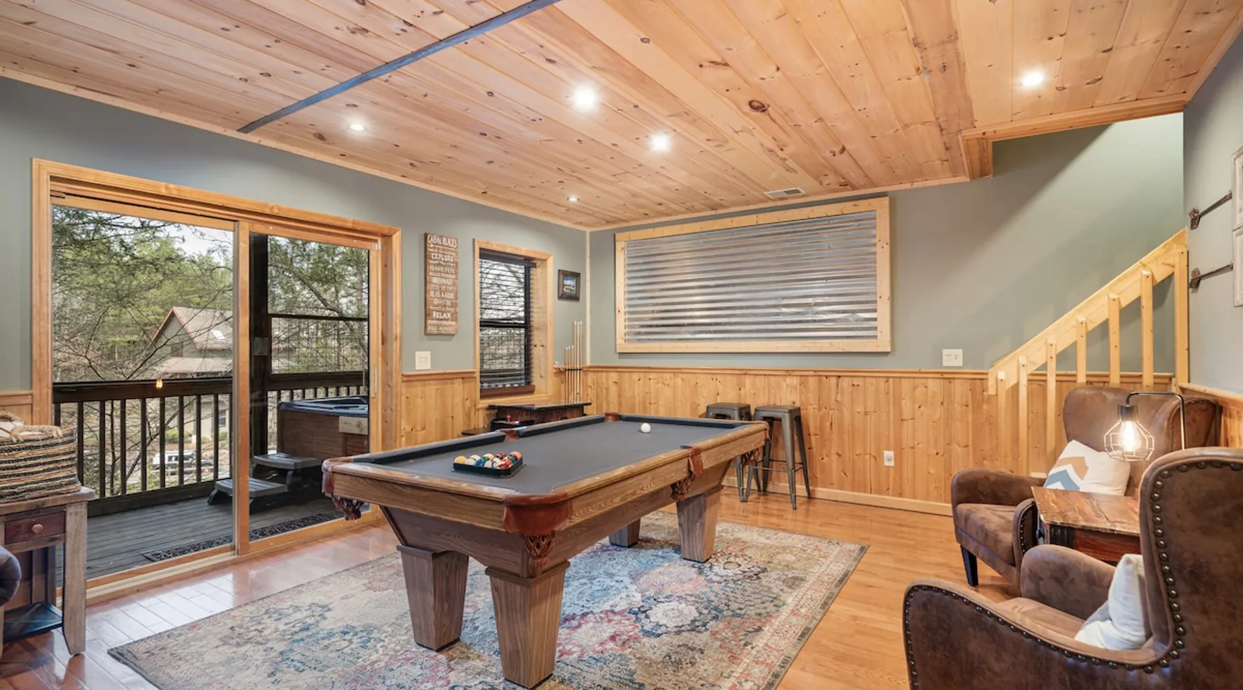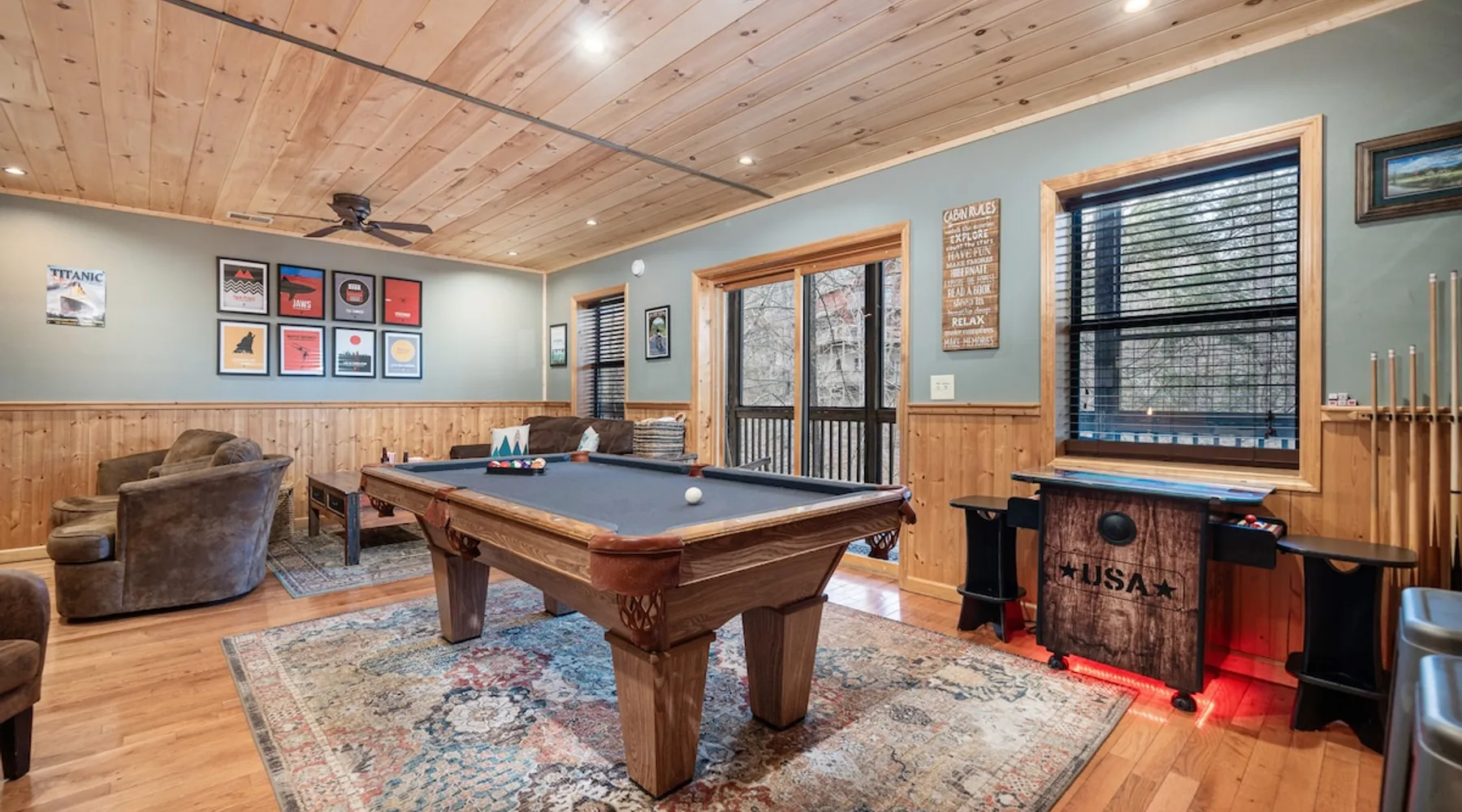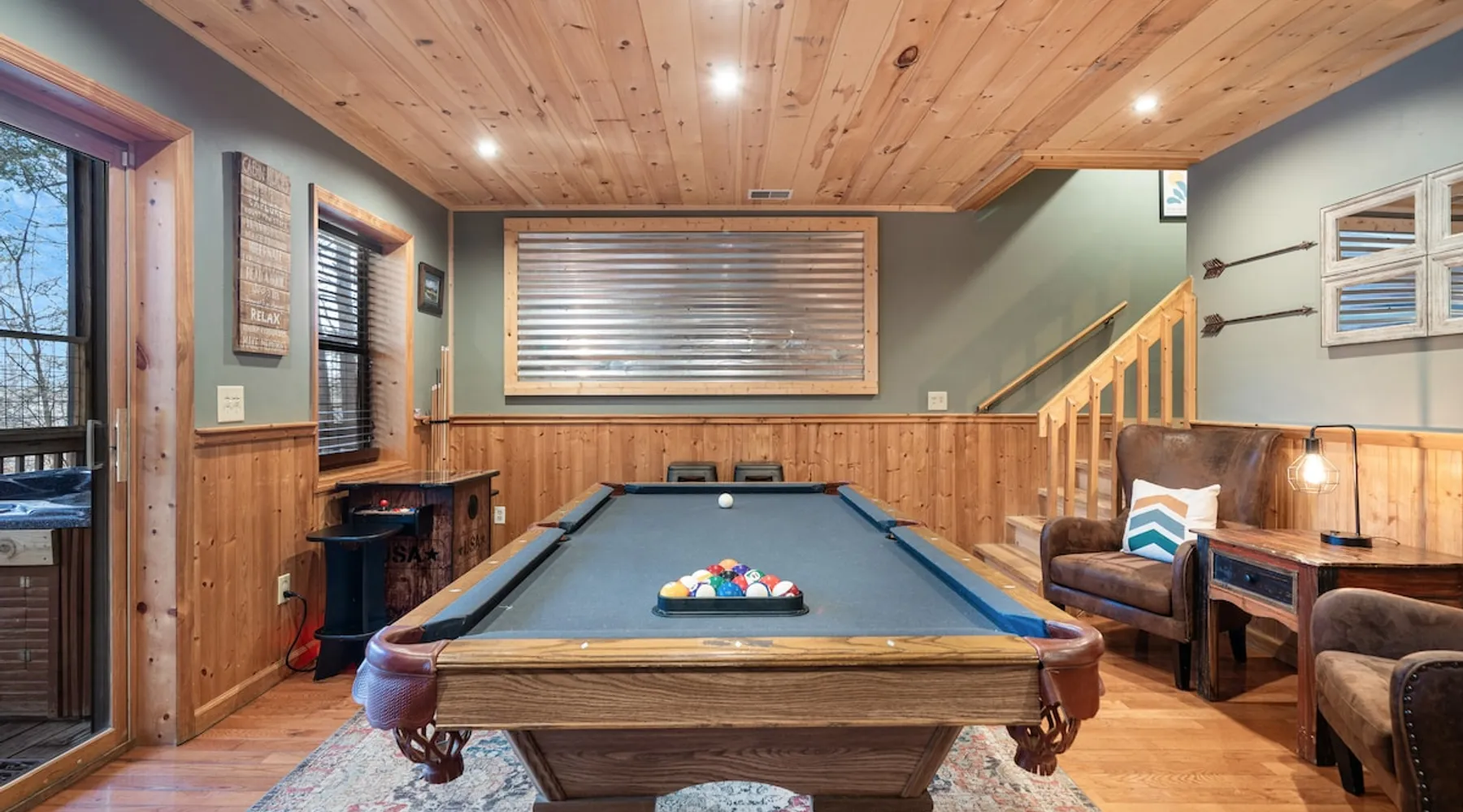 • LOCATION! centrally located in Pigeon Forge (Smoky Mountains) • 2 min drive to Pigeon Forge Parkway! • 8 min drive to Dollywood • Hot tub • Game Room w/ billiard table & arcade games • Community pool just 2 min walking distance from the cabin • 4 bedrooms / 4 bathrooms • Sleeps up to 14 guests • Pet friendly (up to 3 dogs) • Located within the renowned Brookstone Village Resort • Parking for 3+ vehicles • Fully stocked kitchen • All TV’s with 125+ channels and High Speed Wifi • SuperHost The space "Forge Ahead" is a Luxury 2,200 sqft log Cabin located in the beautiful Brookstone Village Resort with access to a community pool. Follow us on FB or Insta: smokymoutainsretreats ► COMMUNITY POOL Community pool is conveniently located just 3 minutes walking distance from the cabin. It is open from May-September. ► BEDROOMS This three-story cabin accommodates up to 14 guests. Main Level: - 1 Master bedroom with a King size bed & an in-suite bathroom (sleeps 2). - The living room can turn into a sleeping space with the queen sofa bed (sleeps 2). Lower Level: - 1 bedroom with a King size bed and a full bathroom (sleeps 2). Upper Level: - 1 bedroom with a Queen size bunk bed (sleeps 4) and an in-suite bathroom. - 1 bedroom with a Full size bunk bed (sleeps 4) and a bathroom. ► KITCHEN The kitchen is equipped with all the cookware, cutlery, and appliances you need to prepare delicious meals during your stay. Refrigerator, stove, microwave, dishwasher, toaster, blender, tea kettle, Crockpot, Keurig Duo with carafe & single serve pod coffee maker. The dining table comfortably seats eight, and there are four additional stools at the large kitchen island so everyone in your group can enjoy meals together. ► OUTDOOR GRILL There is a private Gas Grill. We provide the Gas. ► OUTDOOR SPACE After a day of hiking and sightseeing, you have a lot of options to chill: *soak in the private hot tub *kick back in the rocking chairs and enjoy the fresh mountain breeze *take a dip in the pool. Community pool is only 2 min walking distance (open May to September). ► GAME ROOM All ages will fall in love with this fun space! The room has a billiard table, an arcade game, a lounge area with a large TV where you can watch your favorite shows/games. There is also an assortment of board game & an Xbox. ► PETS We are a pet friendly cabin and you can bring up to 3 dogs as long as they are house broken/potty trained. We welcome all breeds of dogs and have no restrictions on weight. The pet fee is $175 for the whole stay for up to 3 dogs (the fee is not per dog). ► INTERNET/CABLE High Speed Wireless Internet Smart TVs in the living room/game room as well as in each bedrooms. ► LAUNDRY Full size washer and dryer. ► AMENITIES Our cleaning service provides start-up supplies including: paper towels, dish soap, dish washer soap, kitchen trash can liners, toilet paper, hand soap and bathroom trash liners. Depending on the length of your stay, you may need to purchase additional items when the initial supply runs out. ► PRIVATE PARKING Flat parking for up to 3 vehicles in the driveway. ► ENTRY The front door is equipped with an electronic keypad, we will send a personalized door code. ► SMOKING No Smoking indoors. You can smoke on the decks though. We will always strive to obtain a 5-star ★★★★★ review from all our guest and can’t wait to host your next holidays and make them UNFORGETTABLE! *** Please favorite the property by clicking "save" or "heart shape" in the upper right-hand corner, this will help you find it again and share with others *** Guest access Guests will enjoy the entire cabin/private hot tub and have access to the community pool (May to September). Other things to note For security reasons, we have placed 2 outside cameras, one is located on the entry porch facing the entrance door and one is located facing the driveway. Wyze cameras in place and actively recording. Wyze cameras are activated by motion and will record anyone that walks in front of them. These recordings are saved and can be reviewed and shared with the booking platform. If we believe that house rules are being violated, we have the ability to access these cameras in real time. Please remember that you are staying in our home away from home. Please treat our cabin with respect. "Out of our control" problems could arise, please note we will do everything in our power to resolve any issue ASAP, as your comfort means everything to us.