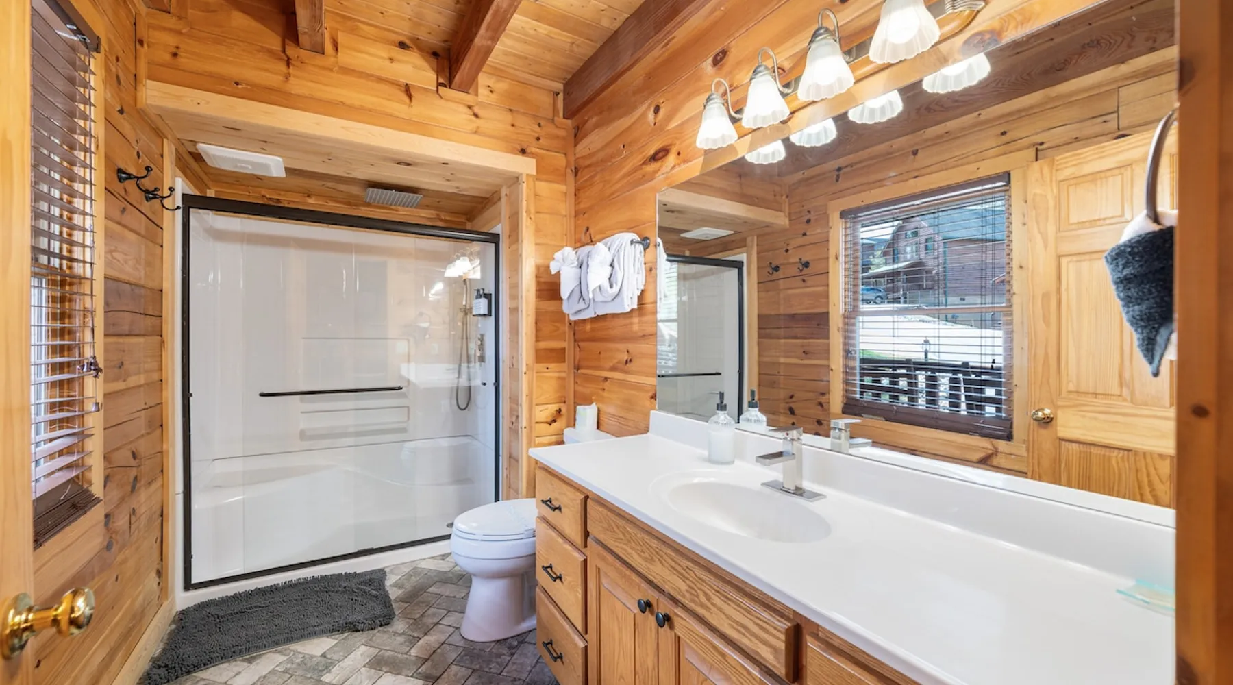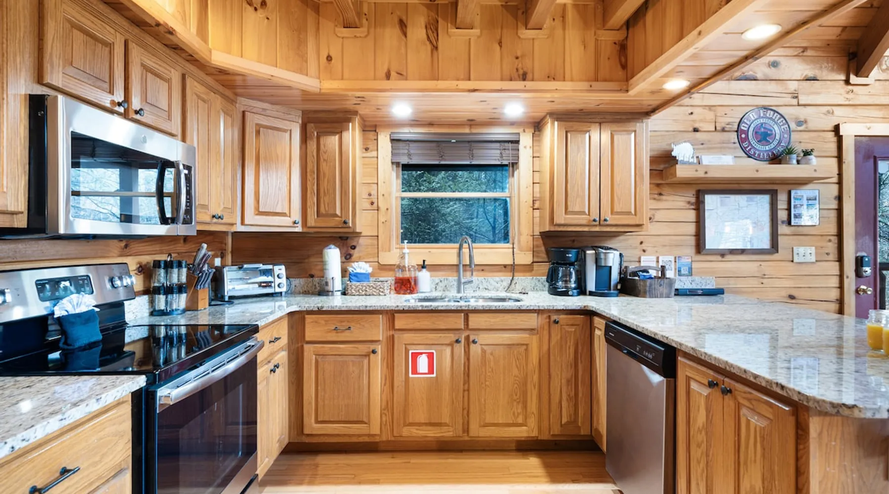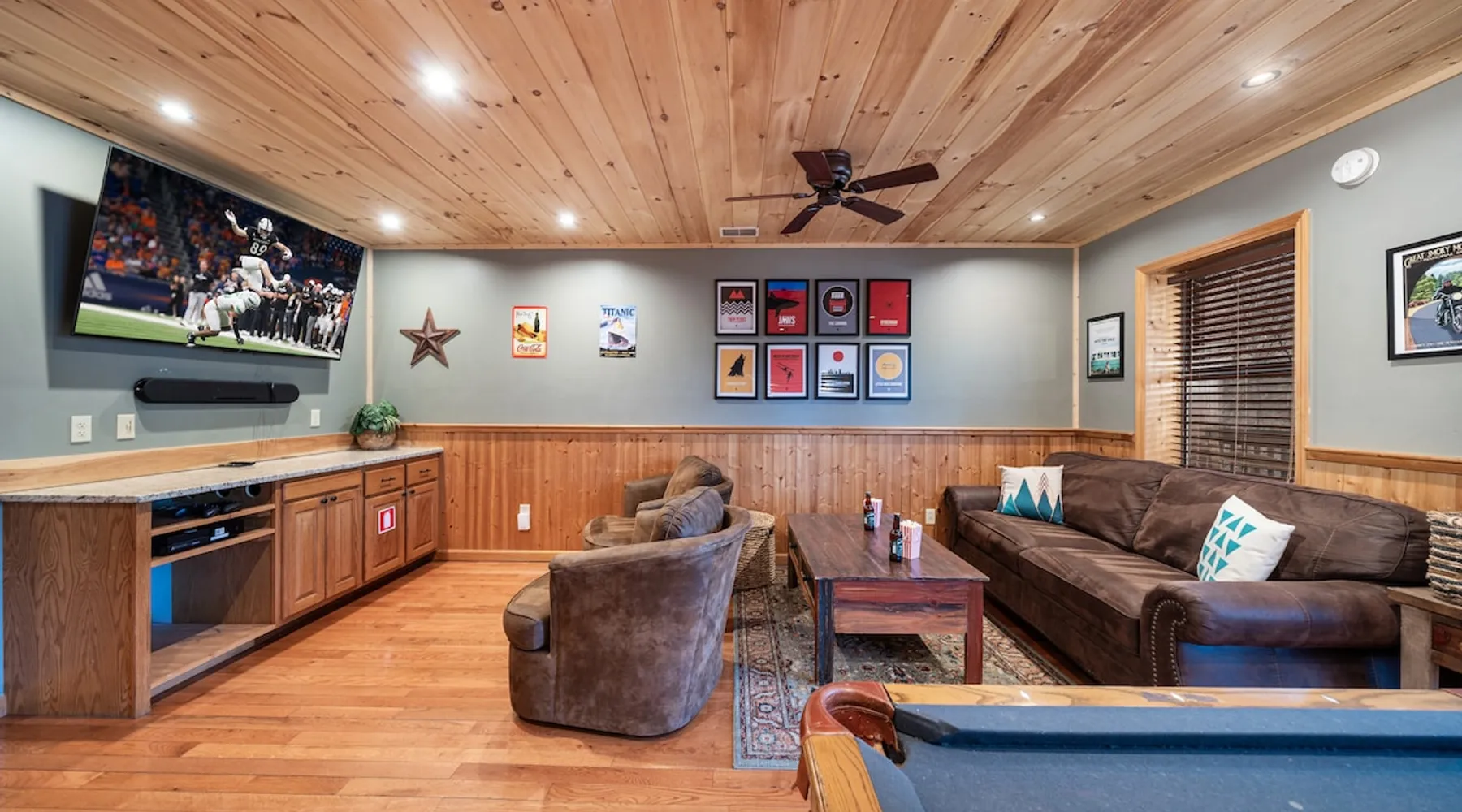 • LOCATION! centrally located in Pigeon Forge (Smoky Mountains) • 2 min drive to Pigeon Forge Parkway! • 8 min drive to Dollywood • Hot tub • Game Room w/ billiard table & arcade games • Community pool just 2 min walking distance from the cabin • 4 bedrooms / 4 bathrooms • Sleeps up to 14 guests • Pet friendly (up to 3 dogs) • Located within the renowned Brookstone Village Resort • Parking for 3+ vehicles • Fully stocked kitchen • All TV’s with 125+ channels and High Speed Wifi • SuperHost The space "Forge Ahead" is a Luxury 2,200 sqft log Cabin located in the beautiful Brookstone Village Resort with access to a community pool. Follow us on FB or Insta: smokymoutainsretreats ► COMMUNITY POOL Community pool is conveniently located just 3 minutes walking distance from the cabin. It is open from May-September. ► BEDROOMS This three-story cabin accommodates up to 14 guests. Main Level: - 1 Master bedroom with a King size bed & an in-suite bathroom (sleeps 2). - The living room can turn into a sleeping space with the queen sofa bed (sleeps 2). Lower Level: - 1 bedroom with a King size bed and a full bathroom (sleeps 2). Upper Level: - 1 bedroom with a Queen size bunk bed (sleeps 4) and an in-suite bathroom. - 1 bedroom with a Full size bunk bed (sleeps 4) and a bathroom. ► KITCHEN The kitchen is equipped with all the cookware, cutlery, and appliances you need to prepare delicious meals during your stay. Refrigerator, stove, microwave, dishwasher, toaster, blender, tea kettle, Crockpot, Keurig Duo with carafe & single serve pod coffee maker. The dining table comfortably seats eight, and there are four additional stools at the large kitchen island so everyone in your group can enjoy meals together. ► OUTDOOR GRILL There is a private Gas Grill. We provide the Gas. ► OUTDOOR SPACE After a day of hiking and sightseeing, you have a lot of options to chill: *soak in the private hot tub *kick back in the rocking chairs and enjoy the fresh mountain breeze *take a dip in the pool. Community pool is only 2 min walking distance (open May to September). ► GAME ROOM All ages will fall in love with this fun space! The room has a billiard table, an arcade game, a lounge area with a large TV where you can watch your favorite shows/games. There is also an assortment of board game & an Xbox. ► PETS We are a pet friendly cabin and you can bring up to 3 dogs as long as they are house broken/potty trained. We welcome all breeds of dogs and have no restrictions on weight. The pet fee is $175 for the whole stay for up to 3 dogs (the fee is not per dog). ► INTERNET/CABLE High Speed Wireless Internet Smart TVs in the living room/game room as well as in each bedrooms. ► LAUNDRY Full size washer and dryer. ► AMENITIES Our cleaning service provides start-up supplies including: paper towels, dish soap, dish washer soap, kitchen trash can liners, toilet paper, hand soap and bathroom trash liners. Depending on the length of your stay, you may need to purchase additional items when the initial supply runs out. ► PRIVATE PARKING Flat parking for up to 3 vehicles in the driveway. ► ENTRY The front door is equipped with an electronic keypad, we will send a personalized door code. ► SMOKING No Smoking indoors. You can smoke on the decks though. We will always strive to obtain a 5-star ★★★★★ review from all our guest and can’t wait to host your next holidays and make them UNFORGETTABLE! *** Please favorite the property by clicking "save" or "heart shape" in the upper right-hand corner, this will help you find it again and share with others *** Guest access Guests will enjoy the entire cabin/private hot tub and have access to the community pool (May to September). Other things to note For security reasons, we have placed 2 outside cameras, one is located on the entry porch facing the entrance door and one is located facing the driveway. Wyze cameras in place and actively recording. Wyze cameras are activated by motion and will record anyone that walks in front of them. These recordings are saved and can be reviewed and shared with the booking platform. If we believe that house rules are being violated, we have the ability to access these cameras in real time. Please remember that you are staying in our home away from home. Please treat our cabin with respect. "Out of our control" problems could arise, please note we will do everything in our power to resolve any issue ASAP, as your comfort means everything to us.