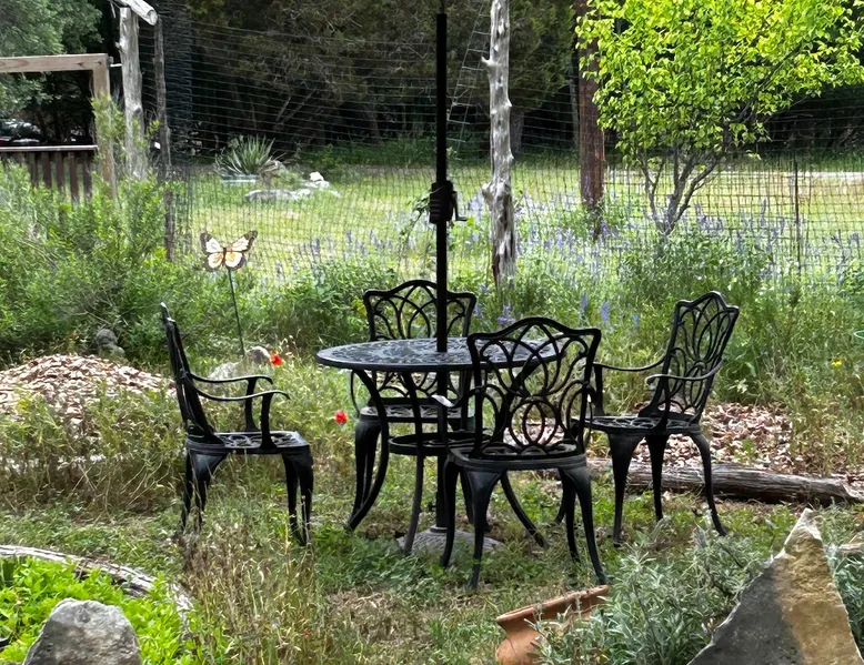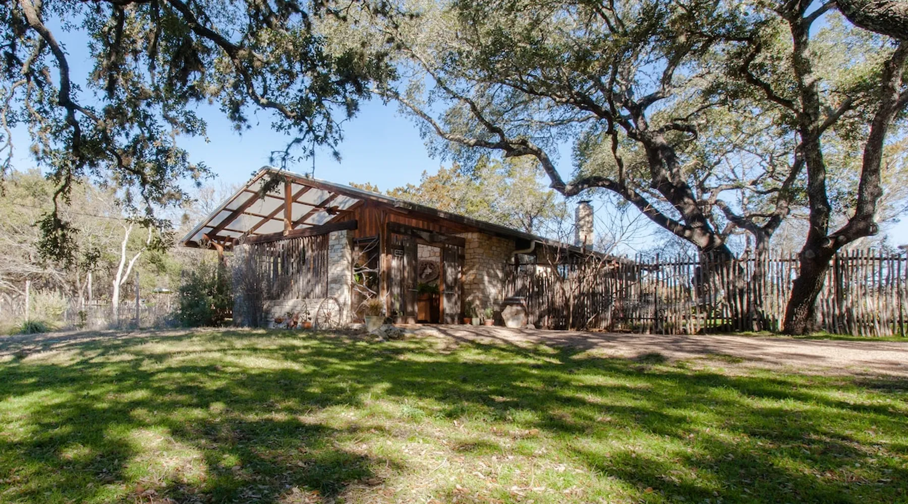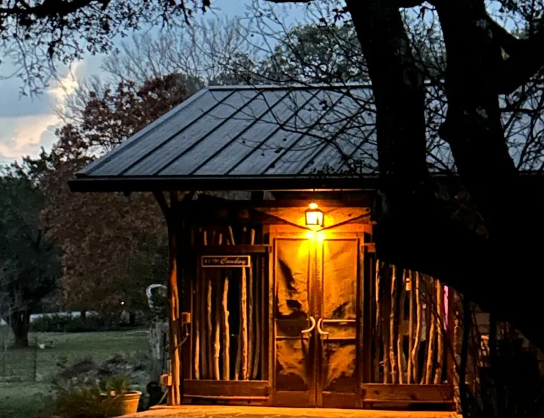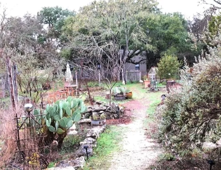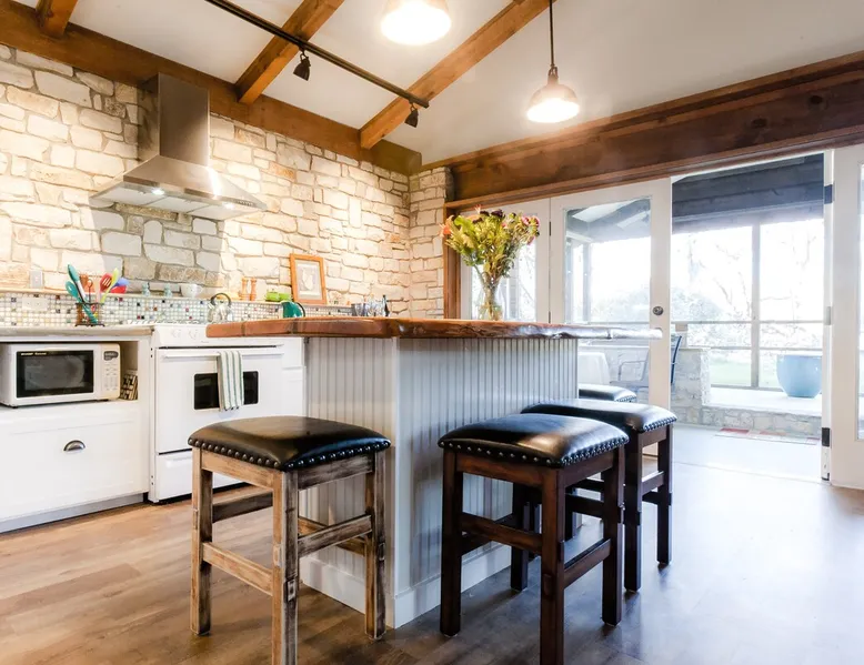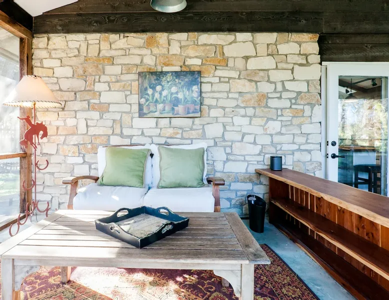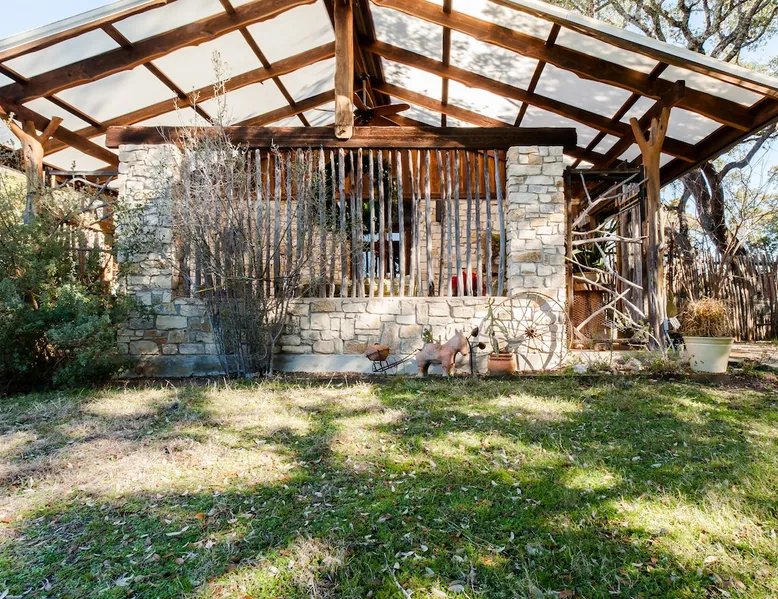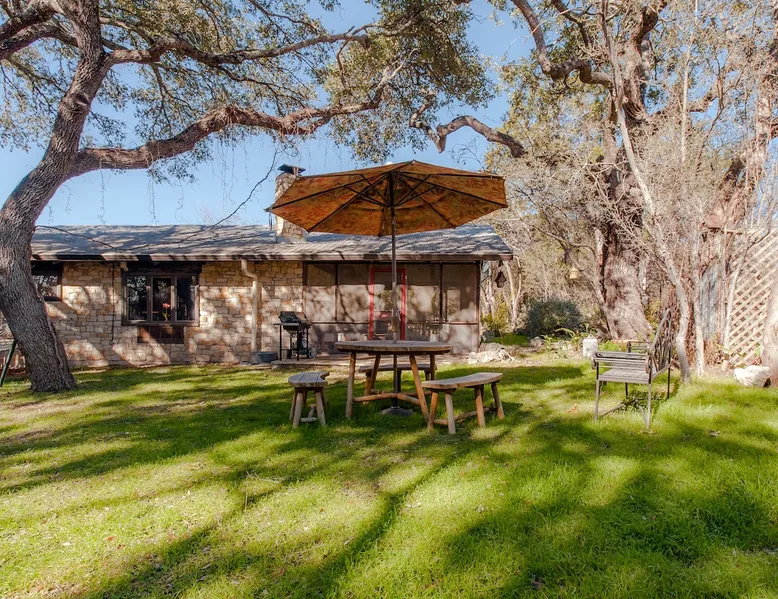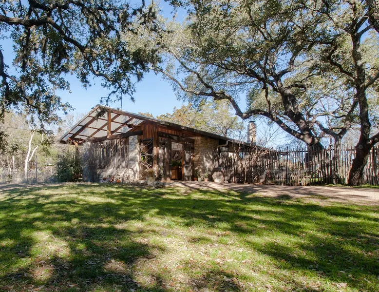 Located 10 miles NW of Wimberley, TX in the Blanco river valley. Majestic oaks, starry nights and a wonderful, quiet stone house so comfortable you won't want to leave. Adults only, must be 21 years of age to reserve. Longer stays with reduced pricing are possible, subject to existing reservations. The space As you enter the driveway you'll pass a magnificent 200 year old oak tree and enter the cottage thru a spacious outdoor living area with a view of the garden. We have laying hens in the coop along the driveway and most afternoons we let them out to free range. Pull up a chair with your favorite beverage and enjoy "chick TV"!! Thick stone exterior walls make for a quiet, relaxing retreat. A fully equipped kitchen and casual dining center around a handcrafted cherry wood topped island. The living area, anchored by a floor to ceiling rock fireplace, beckons you with comfy sofa and sumptuous leather chairs. Light fills the living area thru large patio doors opening onto a screened porch that extends across the entire back of the house with relaxing seating and dining. Outside off the stone patio is a deck overlooking a dry creek. Tucked behind the oak tree is a (cold) outdoor shower. Enjoy a peaceful night's rest on a queen size bed in a quiet, cozy bedroom. The spacious bathroom, with a window to the garden, has a large tiled shower with a stone floor. Guest access Guest have access to entire property including deck overlooking a dry creek, grill area, outdoor shower (cold only) and a large garden with a greenhouse - perfect for morning jo and evening beverages... check it out! The garden area is shared with the tenant in the house next door. Other things to note The Cowboy is great for a couple or friends that want to get away, cook a great meal and chill. Excellent setting for artist and writers. Internet access for browsing and streaming music, satellite TV, AT&T cell service - all others iffy. Guest supply their own firewood, which can be purchased locally at HEB, Ace Hardware and Brookshire Bro’s. Duraflame type logs are not allowed. For your listening enjoyment, we have the Sonos wireless speaker system that you can access by downloading the Sonos app. Pandora and Sonos music is provided and you can also add your own music service. Many scenic drives, an award winning regional park-Blue Hole in Wimberley, famous Jacobs Well natural area, Emily Ann theatre, The Wimberley Players theater and local restaurants, to name a few : Mima's (TexMex), The Leaning Pear, Wimberley Cafe, Chills, The Shady Llama (beer/wine, great views) and others. Casual attire at all establishments. And don't forget the many shops in and around the town square. Book your stay over the first Saturday, March thru December, and enjoy Market Days - a flea market that draws shoppers from across the region.