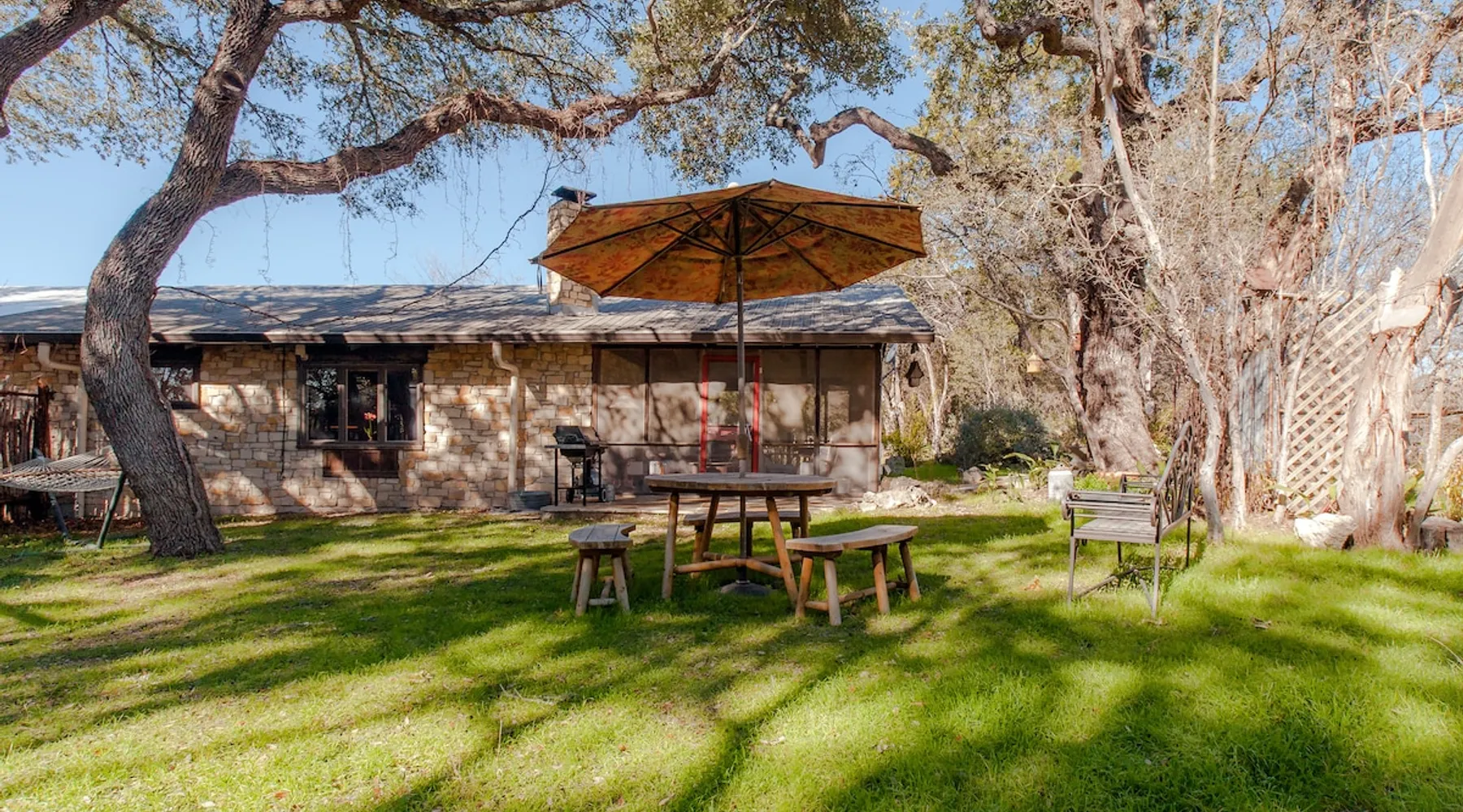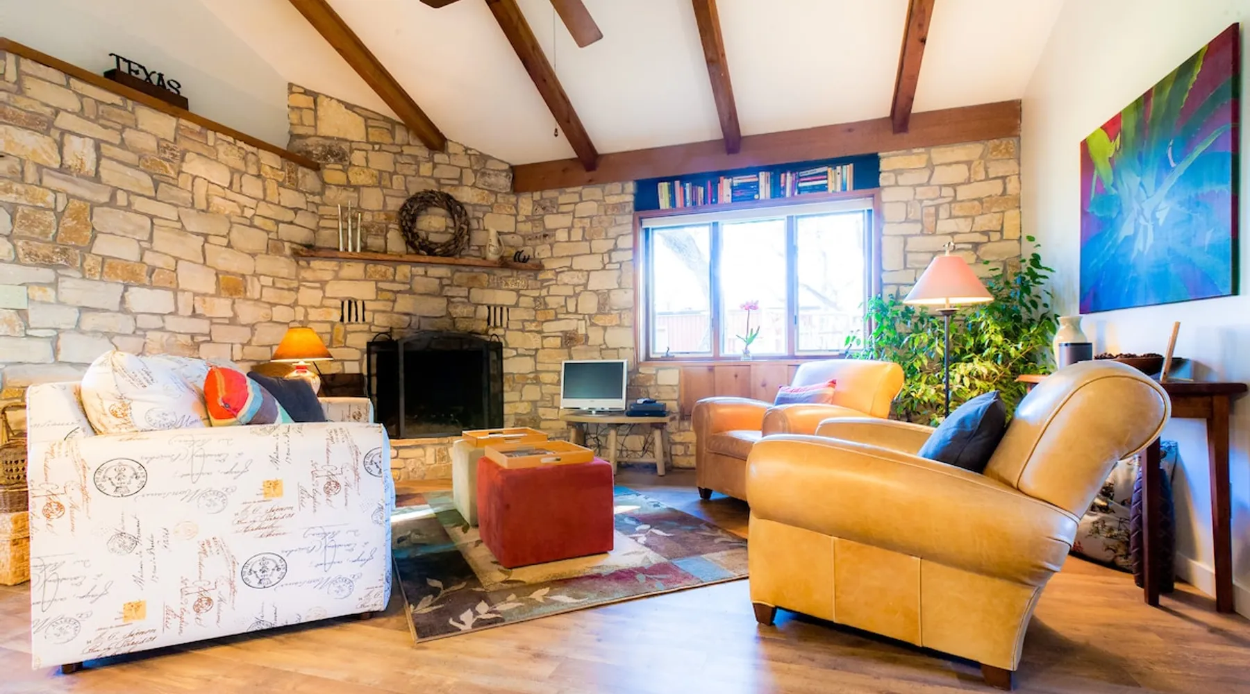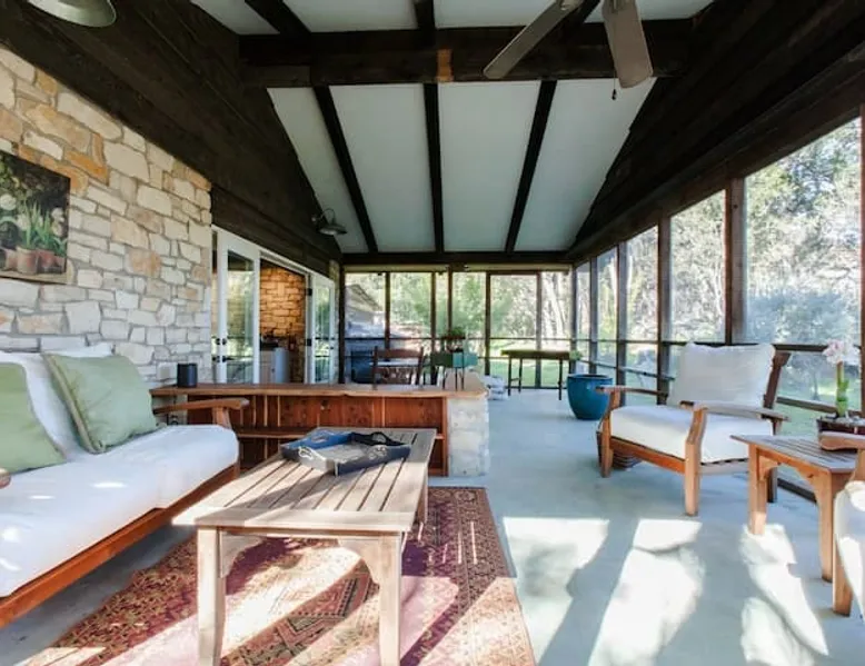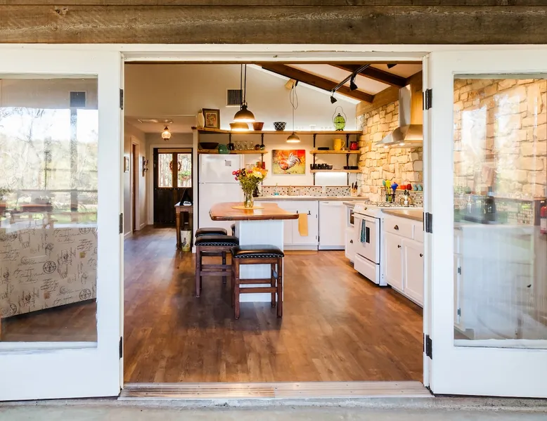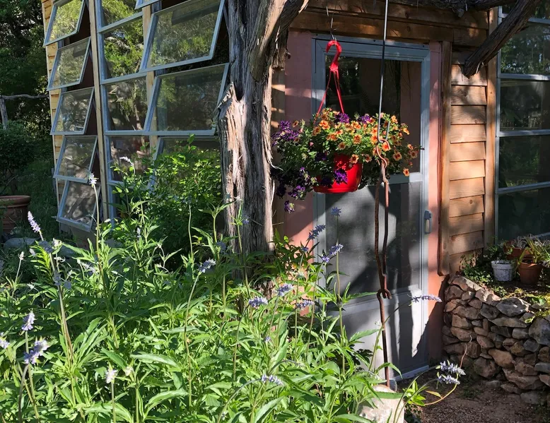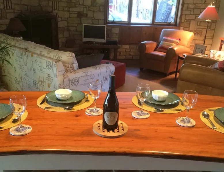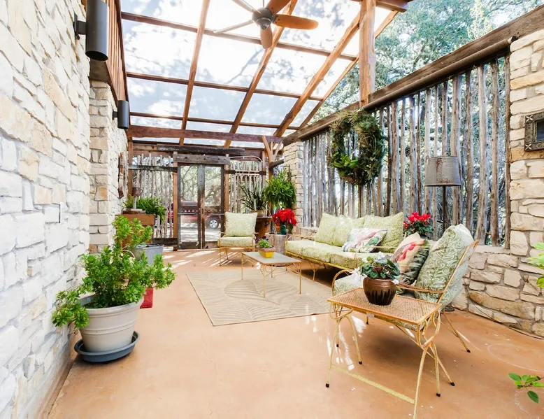 Located 10 miles NW of Wimberley, TX in the Blanco river valley. Majestic oaks, starry nights and a wonderful, quiet stone house so comfortable you won't want to leave. Adults only, must be 21 years of age to reserve. Longer stays with reduced pricing are possible, subject to existing reservations. The space As you enter the driveway you'll pass a magnificent 200 year old oak tree and enter the cottage thru a spacious outdoor living area with a view of the garden. We have laying hens in the coop along the driveway and most afternoons we let them out to free range. Pull up a chair with your favorite beverage and enjoy "chick TV"!! Thick stone exterior walls make for a quiet, relaxing retreat. A fully equipped kitchen and casual dining center around a handcrafted cherry wood topped island. The living area, anchored by a floor to ceiling rock fireplace, beckons you with comfy sofa and sumptuous leather chairs. Light fills the living area thru large patio doors opening onto a screened porch that extends across the entire back of the house with relaxing seating and dining. Outside off the stone patio is a deck overlooking a dry creek. Tucked behind the oak tree is a (cold) outdoor shower. Enjoy a peaceful night's rest on a queen size bed in a quiet, cozy bedroom. The spacious bathroom, with a window to the garden, has a large tiled shower with a stone floor. Guest access Guest have access to entire property including deck overlooking a dry creek, grill area, outdoor shower (cold only) and a large garden with a greenhouse - perfect for morning jo and evening beverages... check it out! The garden area is shared with the tenant in the house next door. Other things to note The Cowboy is great for a couple or friends that want to get away, cook a great meal and chill. Excellent setting for artist and writers. Internet access for browsing and streaming music, satellite TV, AT&T cell service - all others iffy. Guest supply their own firewood, which can be purchased locally at HEB, Ace Hardware and Brookshire Bro’s. Duraflame type logs are not allowed. For your listening enjoyment, we have the Sonos wireless speaker system that you can access by downloading the Sonos app. Pandora and Sonos music is provided and you can also add your own music service. Many scenic drives, an award winning regional park-Blue Hole in Wimberley, famous Jacobs Well natural area, Emily Ann theatre, The Wimberley Players theater and local restaurants, to name a few : Mima's (TexMex), The Leaning Pear, Wimberley Cafe, Chills, The Shady Llama (beer/wine, great views) and others. Casual attire at all establishments. And don't forget the many shops in and around the town square. Book your stay over the first Saturday, March thru December, and enjoy Market Days - a flea market that draws shoppers from across the region.