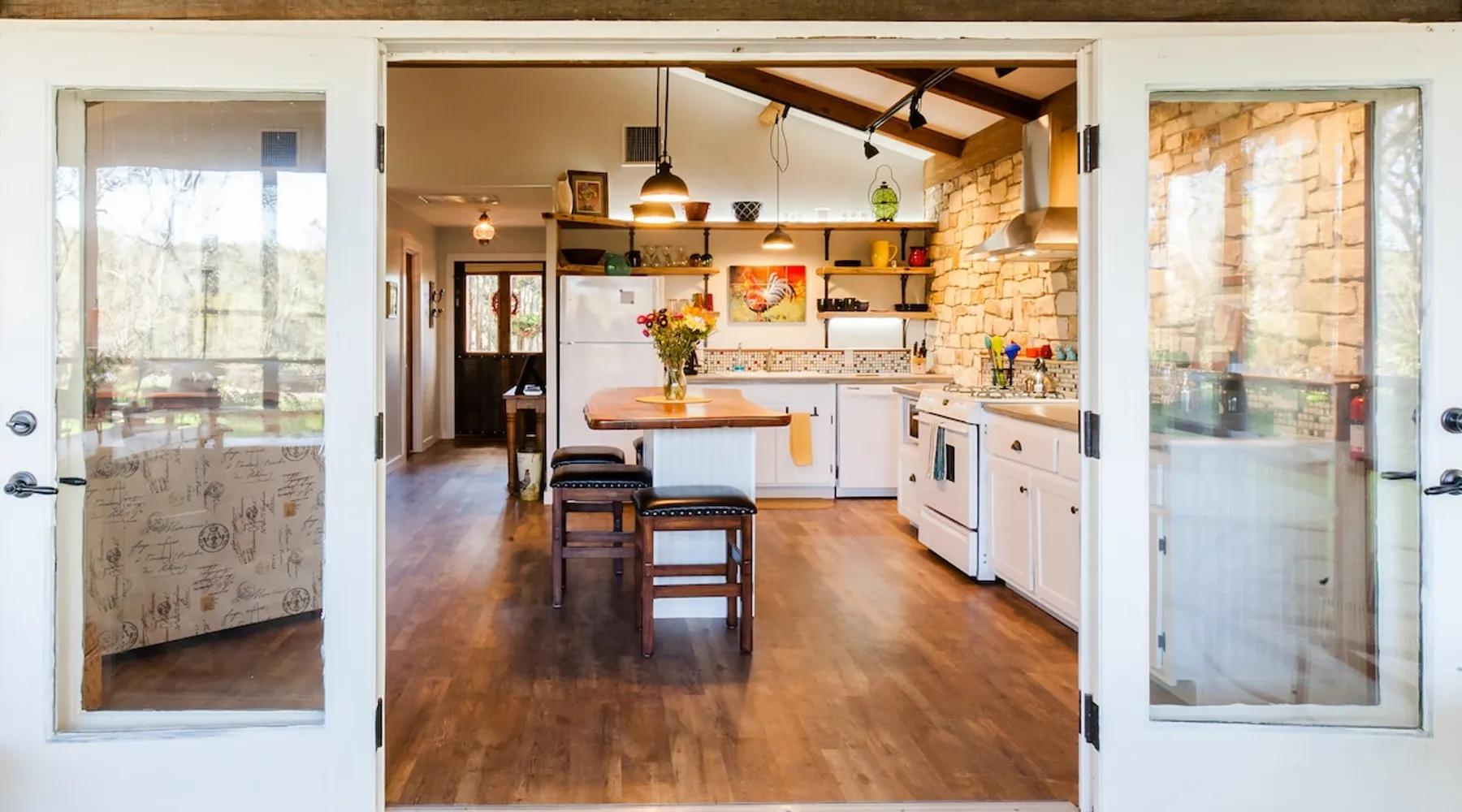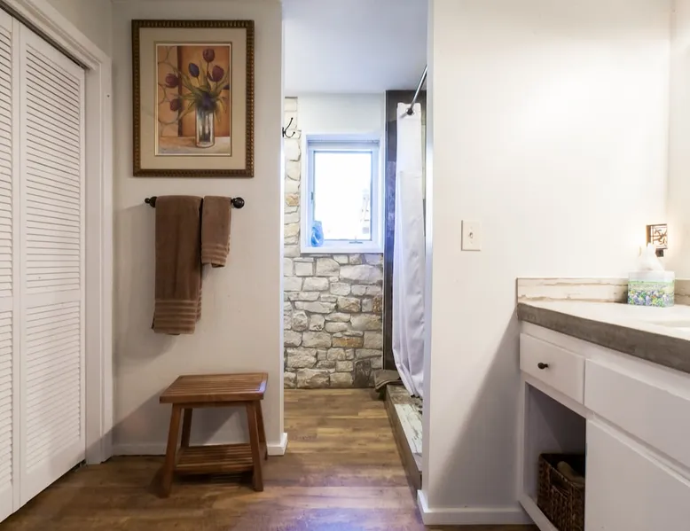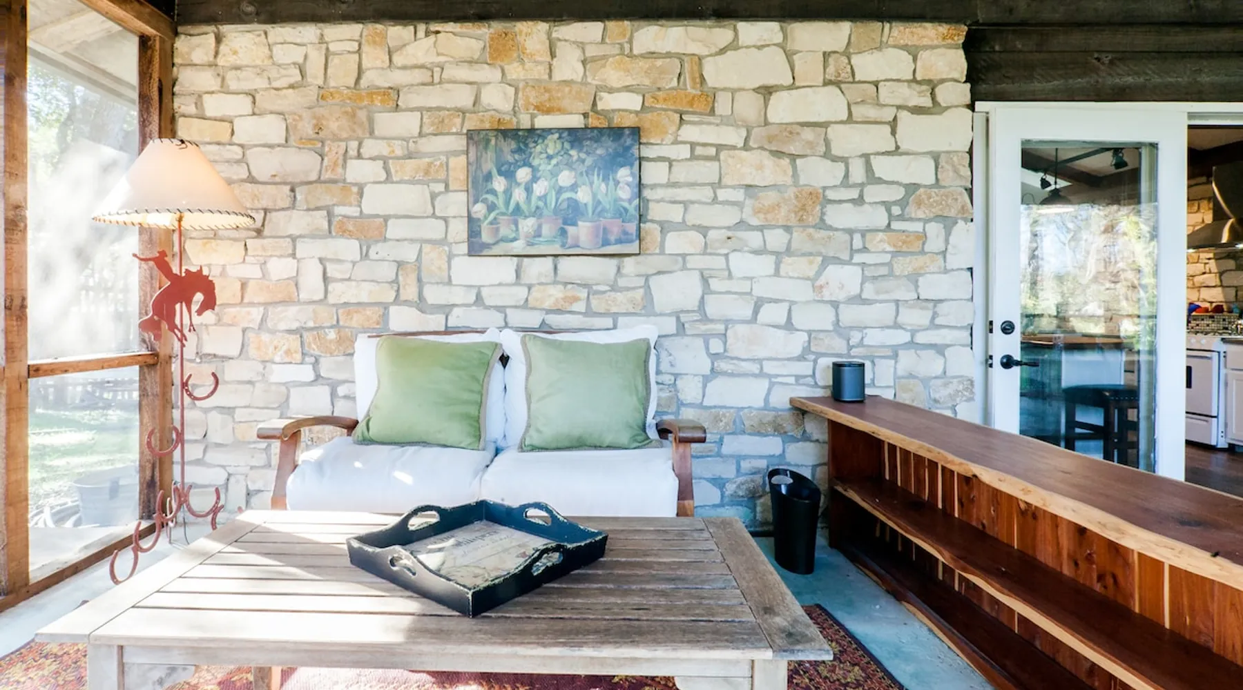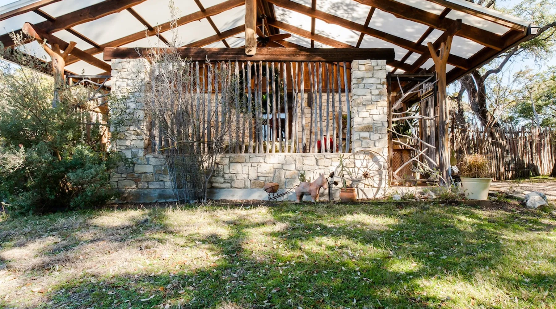 Located 10 miles NW of Wimberley, TX in the Blanco river valley. Majestic oaks, starry nights and a wonderful, quiet stone house so comfortable you won't want to leave. Adults only, must be 21 years of age to reserve. Longer stays with reduced pricing are possible, subject to existing reservations. The space As you enter the driveway you'll pass a magnificent 200 year old oak tree and enter the cottage thru a spacious outdoor living area with a view of the garden. We have laying hens in the coop along the driveway and most afternoons we let them out to free range. Pull up a chair with your favorite beverage and enjoy "chick TV"!! Thick stone exterior walls make for a quiet, relaxing retreat. A fully equipped kitchen and casual dining center around a handcrafted cherry wood topped island. The living area, anchored by a floor to ceiling rock fireplace, beckons you with comfy sofa and sumptuous leather chairs. Light fills the living area thru large patio doors opening onto a screened porch that extends across the entire back of the house with relaxing seating and dining. Outside off the stone patio is a deck overlooking a dry creek. Tucked behind the oak tree is a (cold) outdoor shower. Enjoy a peaceful night's rest on a queen size bed in a quiet, cozy bedroom. The spacious bathroom, with a window to the garden, has a large tiled shower with a stone floor. Guest access Guest have access to entire property including deck overlooking a dry creek, grill area, outdoor shower (cold only) and a large garden with a greenhouse - perfect for morning jo and evening beverages... check it out! The garden area is shared with the tenant in the house next door. Other things to note The Cowboy is great for a couple or friends that want to get away, cook a great meal and chill. Excellent setting for artist and writers. Internet access for browsing and streaming music, satellite TV, AT&T cell service - all others iffy. Guest supply their own firewood, which can be purchased locally at HEB, Ace Hardware and Brookshire Bro’s. Duraflame type logs are not allowed. For your listening enjoyment, we have the Sonos wireless speaker system that you can access by downloading the Sonos app. Pandora and Sonos music is provided and you can also add your own music service. Many scenic drives, an award winning regional park-Blue Hole in Wimberley, famous Jacobs Well natural area, Emily Ann theatre, The Wimberley Players theater and local restaurants, to name a few : Mima's (TexMex), The Leaning Pear, Wimberley Cafe, Chills, The Shady Llama (beer/wine, great views) and others. Casual attire at all establishments. And don't forget the many shops in and around the town square. Book your stay over the first Saturday, March thru December, and enjoy Market Days - a flea market that draws shoppers from across the region.
