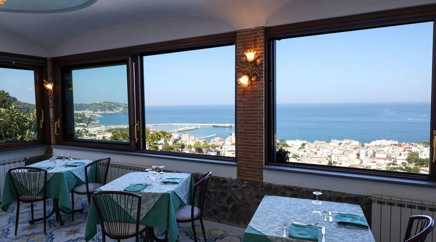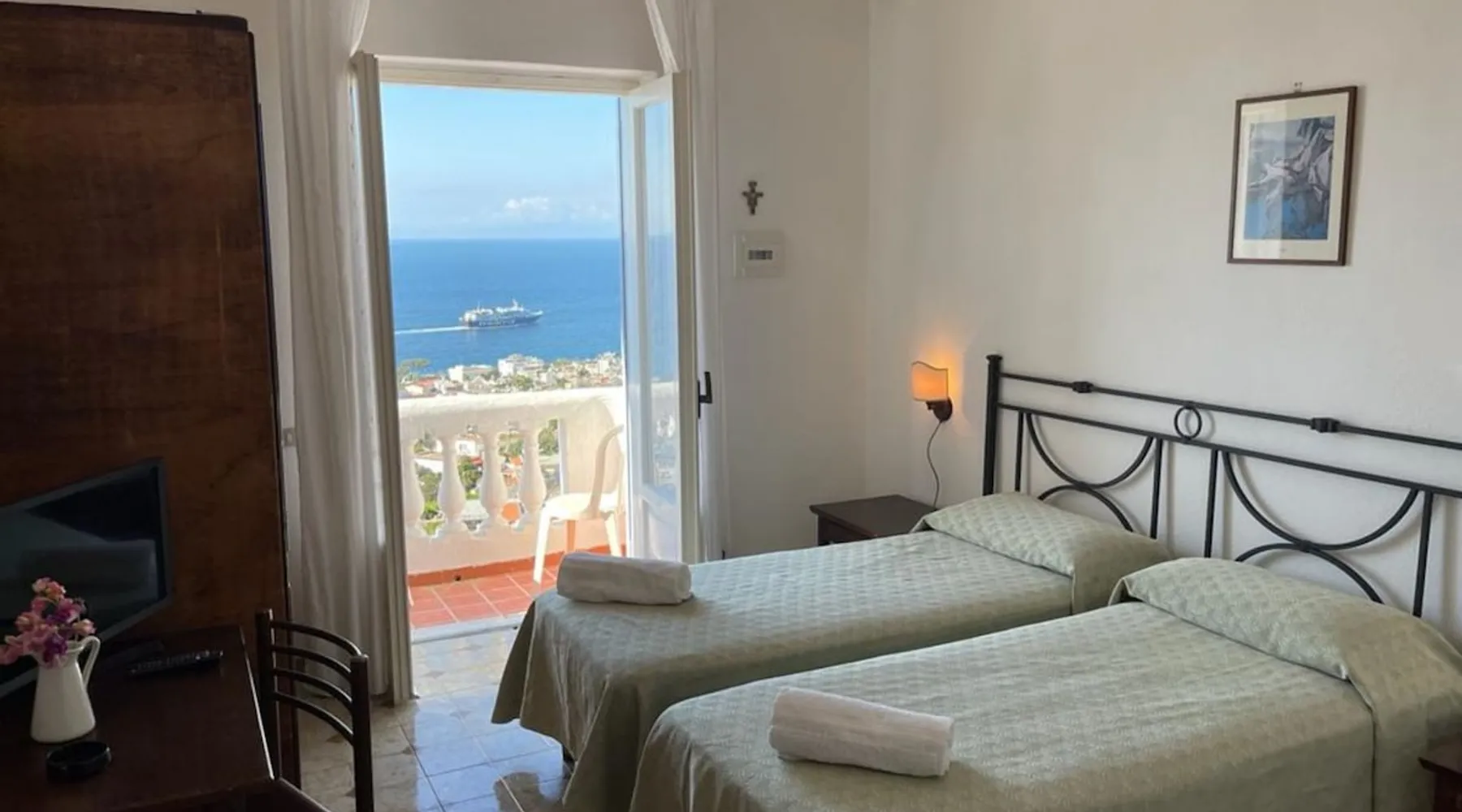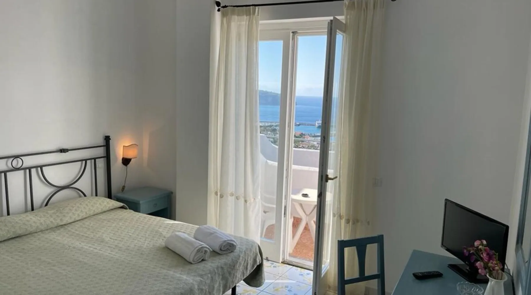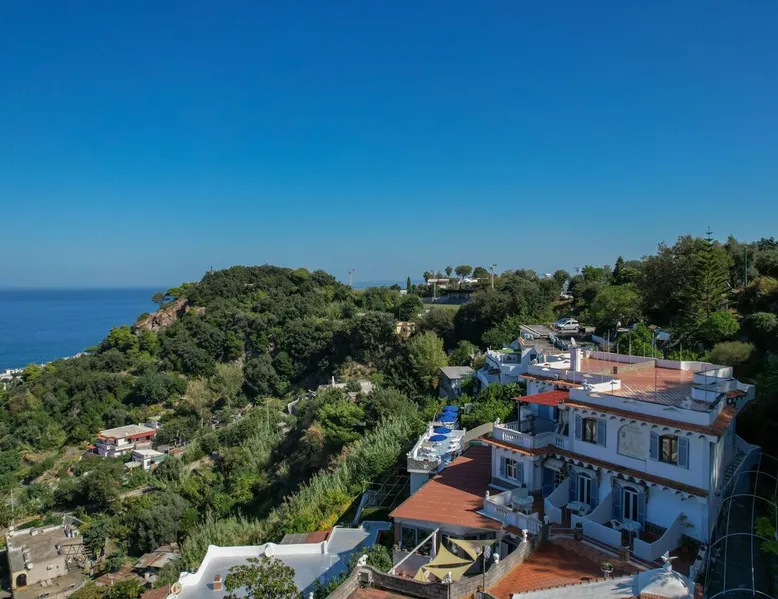 Double room with sea view The space The rooms are all equipped with large panoramic terraces overlooking the sea for absolute tranquility and independent heating. Toilets are always private, with shower and a hairdryer, bathroom linen is changed daily. It is possible to request the beds either as two single beds or as a double bed. All the rooms have a Television, and some rooms have air conditioning available for an extra fee. Pets are allowed. The Hotel is located on a hill 75 meters above sea level, in the middle of the green of chestnut trees and vineyards. In a wonderful position with a view of the sea, the port of Casamicciola and the bay of Lacco Ameno. With large panoramic terraces, absolute tranquility, heating, private parking. Thermal pool - sauna and inhalations with natural fumarole shower heads. For spa treatments in the pool and sauna, the hotel benefits from the precious natural geothermal resource, kept 80 meters deep, under a pile of volcanic rocks and clayey layers of marine origin Registration Details IT063019A1M9KAJJ72