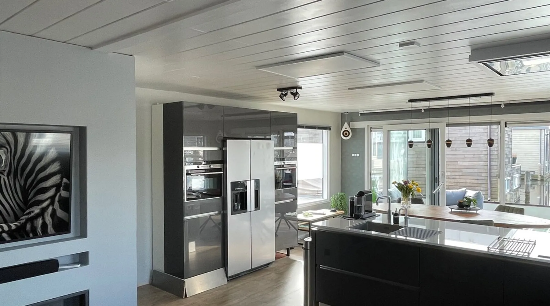 Very luxurious houseboat with whirlpool, sauna and shower with sunshower for max. 2 pers. Large terrace with view of the water. Amsterdam: 30 minutes by car / 1 hour by public transport Free parking, 15 min. walk from the village. The 1st cozy restaurant is half this distance. No children / Babies Longer rental is cheaper. The space The houseboat is heated by underfloor heating, and electric heating. The living room and bedroom have air conditioning. The living room is 45m2, has an oval dining table with dimmable lighting and a view over the harbor. The kitchen is equipped with an American fridge / freezer, induction hob, a Quooker, dishwasher, an oven and a combi-oven / microwave, Nespresso and a regular coffee maker. In the TV corner is a comfortable sofa, 55 inch smart TV, a soundbar and an electric fireplace. The spacious bedroom (20m2), has air conditioning, a king-size bed (2.10 x 1.80) and a double sink. Here too there is a smart TV and you can dim the lighting to a cozy romantic atmosphere. The wellness area (15m2) consists of: a two-person Finnish sauna, a whirlpool (1.90x 0.80) and a luxury shower (1.80x 1.00) with sun shower. Also in this room the lighting is dimmable and can even be changed in a number of color settings (philips hue). Through the sliding door in the living room you enter the large terrace with a beautiful view of the harbor and the "Kleine Poel". There are 2 comfortable chairs and a small dining table with 2 chairs. The sun protection covers the entire terrace. There is also patio heating. A wonderful place to enjoy the rippling water with its inhabitants (water birds). Guest access The entire houseboat (20 meters long) is entirely at your disposal. No spaces need to be shared with others. The parking lot of the harbor is spacious. There are no fixed parking spaces. Possibility to charge your electric car: in the middle of the village (15 minutes walk). The bus stop to get on for a visit to Amsterdam: 17 minutes walk