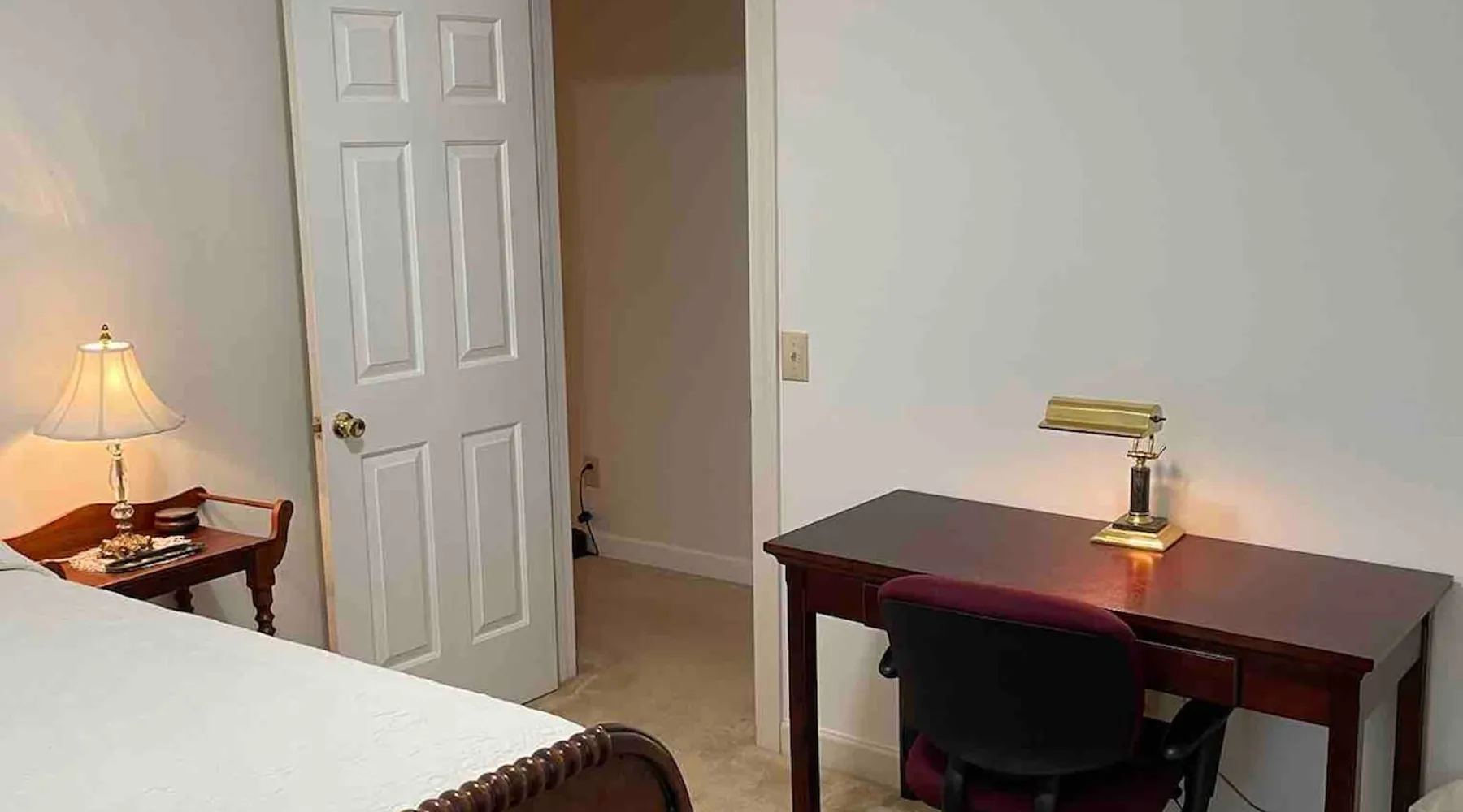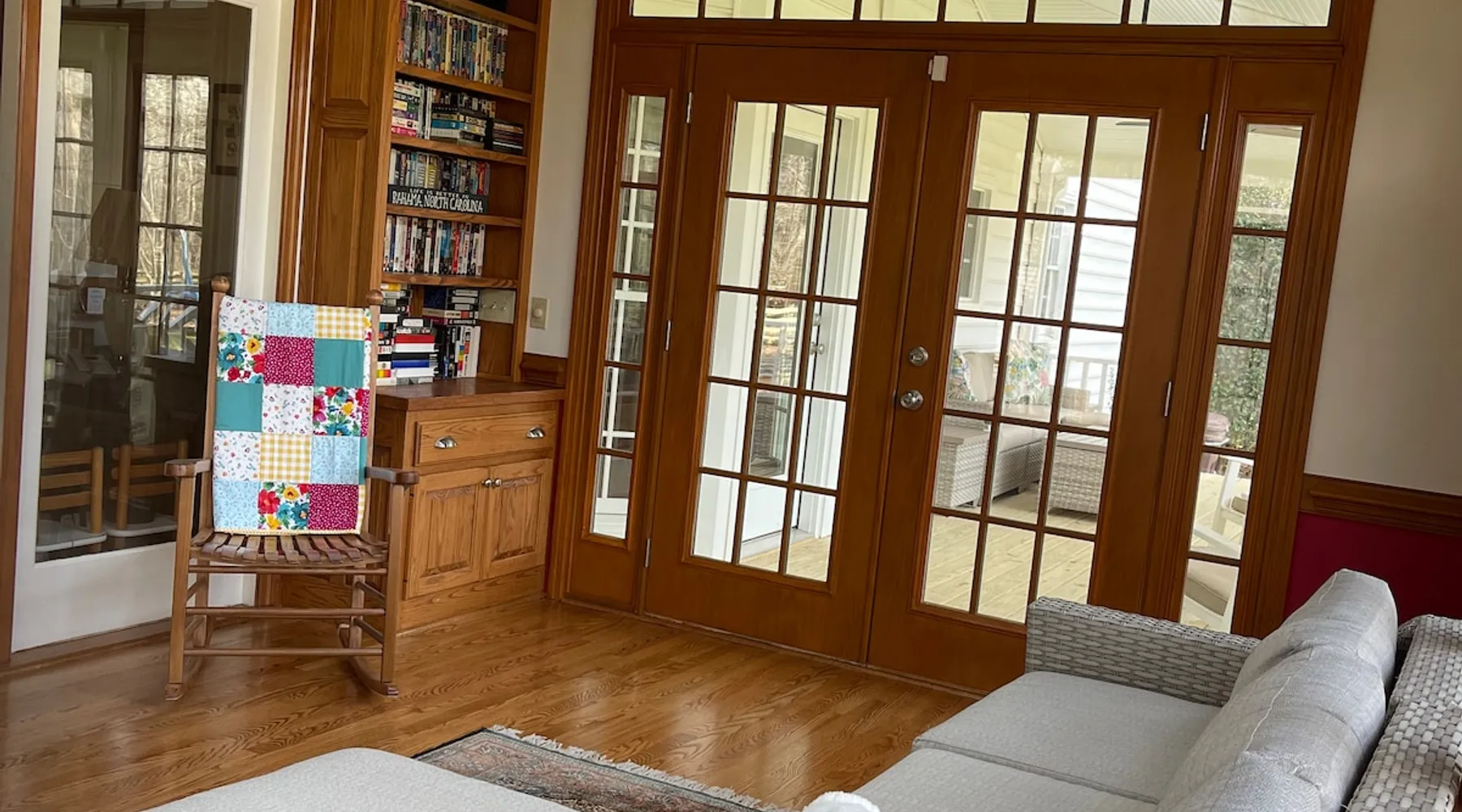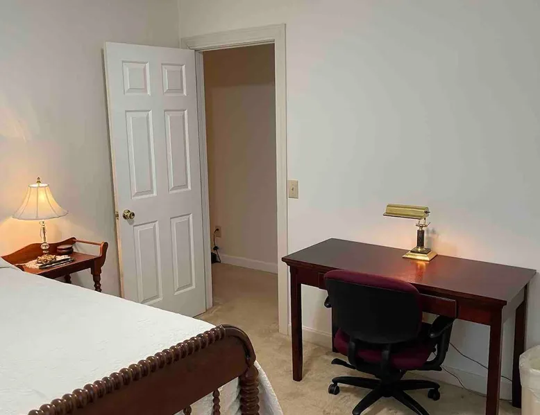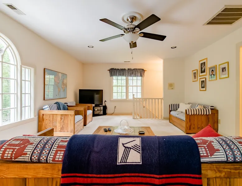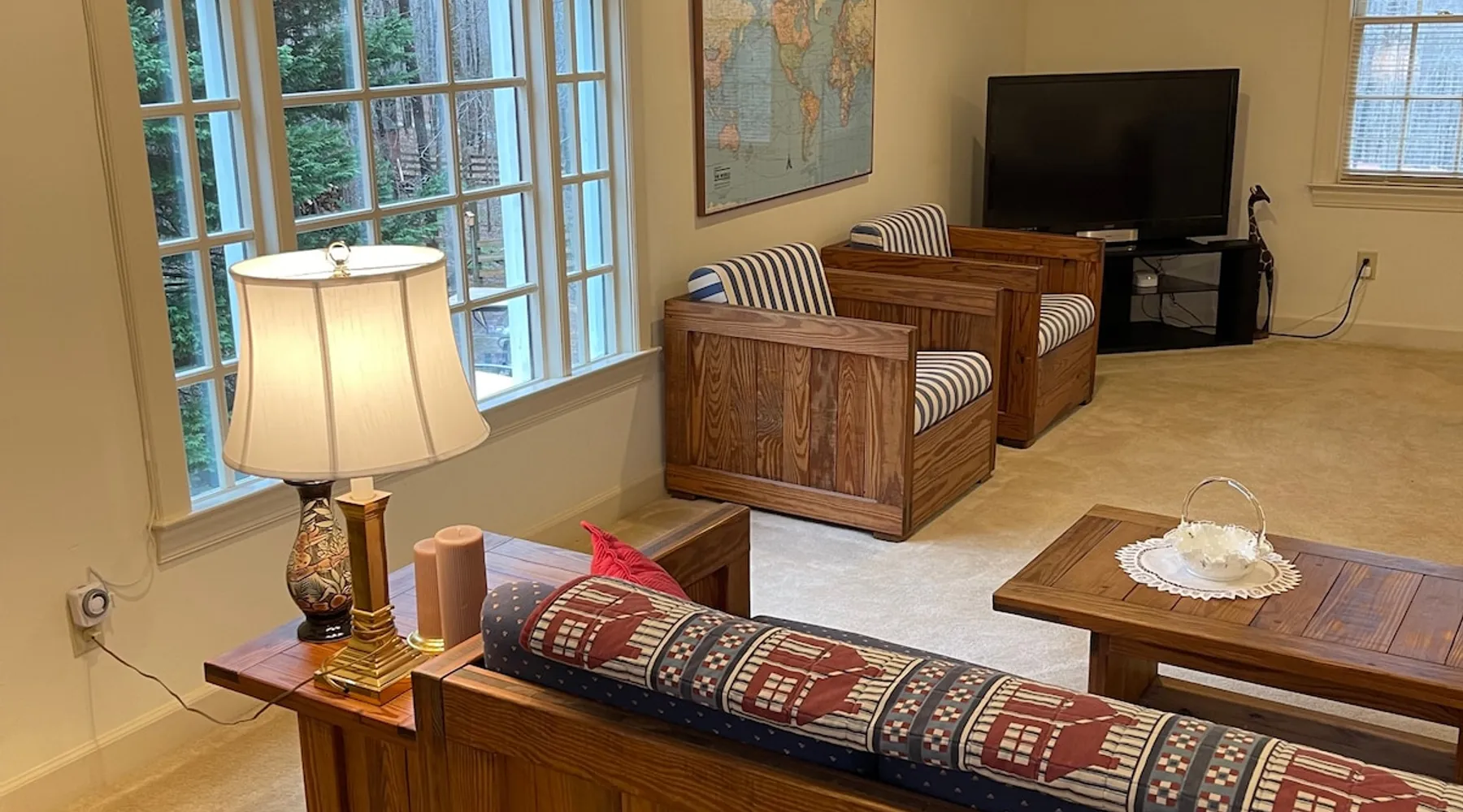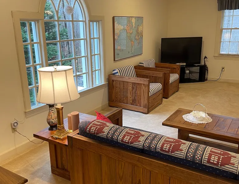This house is over 4000 sq ft. The bedroom comes with a large living room that is shared if the other bedrooms are rented. There is a large flat screen TV with Netflix, Amazon Prime, Paramount and Hulu in the living room and in each bedroom. The entry doors to the living room can be closed for privacy. Walk in laundry room and screened back porch. There are 27 private acres if you want to take a walk in the woods, 4 miles of community trails, and a pool and tennis courts are also available. The space There is also a 12 X 24 screened in back porch that is shared. Guest access The sunroom is not available for use at this time. During your stay Feel free to text or call me before or during your stay if you have any questions, needs or concerns. Other things to note The sunroom is not available at this time. Early checkin and late checkout can be accommodated if there is availability but you must contact host to discuss for approval. Please- do not wear shoes on hardwood floors. do not burn candles. do not burn incense. no plug-ins or air fresheners. do not use perfume or cologne inside the house. do not remove the mattress pad from bed. unregistered guest are not allowed unless approved ahead of time. ear buds are provided if you want to watch TV in your room after quiet hours. use family friendly language. Smoking is not allowed in the home, garage or screened in back porch. You may smoke on the front porch, in the yard or in the covered treehouse in the back yard. This is a family home, drinking in a respectful manner and in moderation is acceptable. However, if you have a problem with alcohol or drugs, this home would not be a good fit for you. It is important to me that my guest feel like they are at their home away from home and know that they are welcome here.