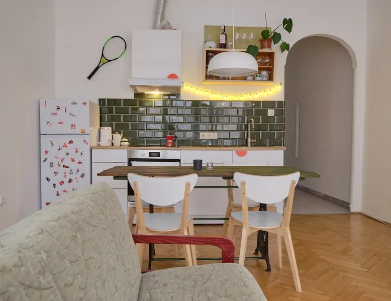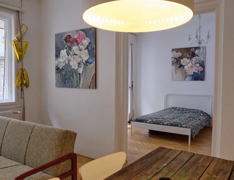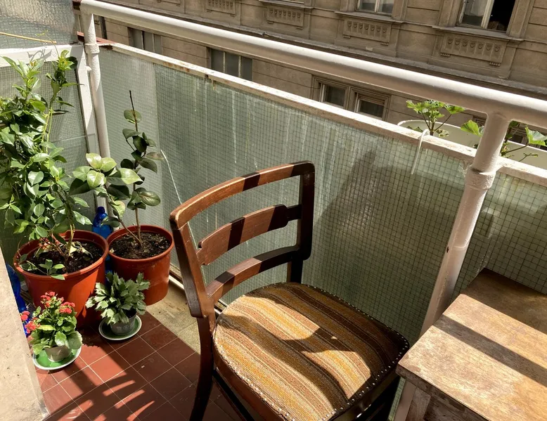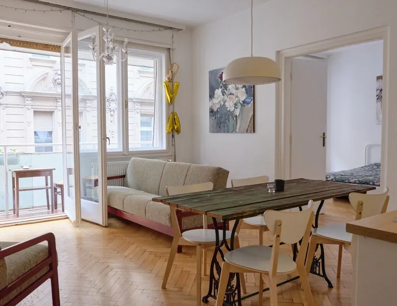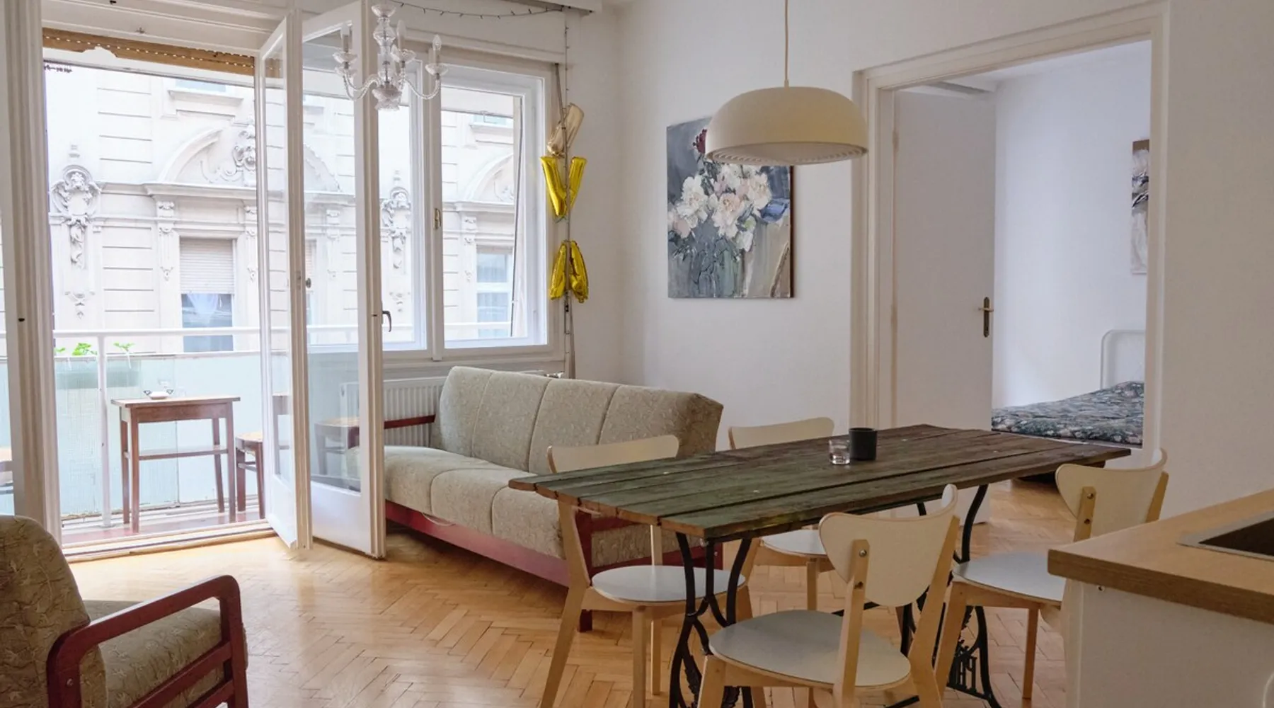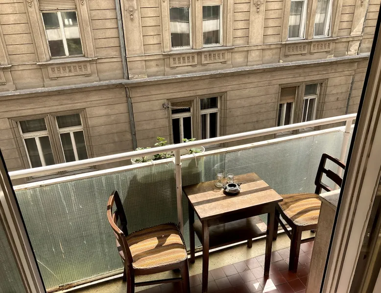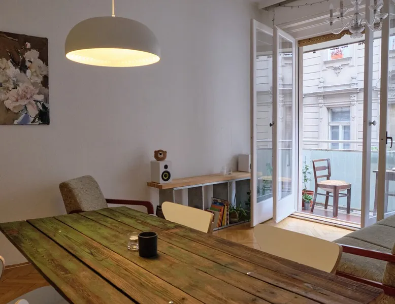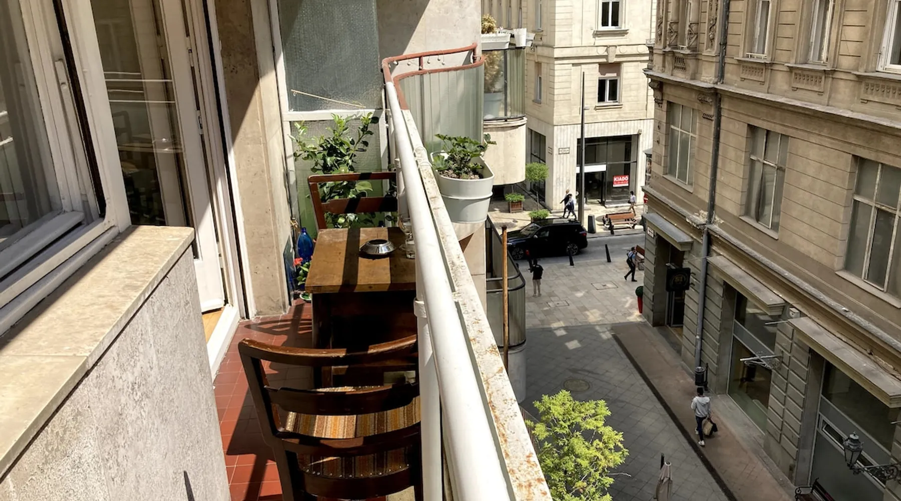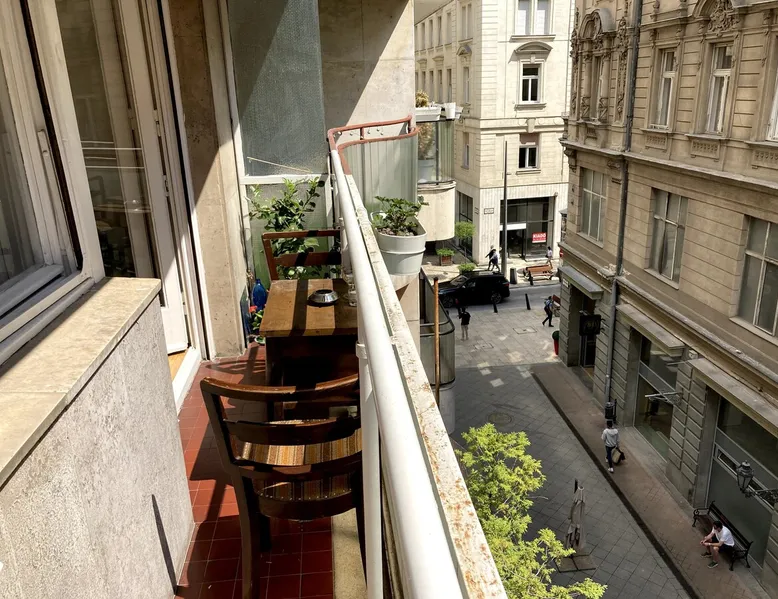 In a unique house on the third floor in the Bauhaus style (built in 1944), located on a quiet pedestrian street. Just 5 minutes walk from the Danube promenade and in the absolute center. Apartment with a huge balcony and giant windows, located on a quiet pedestrian street. The space This 58 m² apartment is wonderfully located in the heart of the 5th district. You are in few steps from the famous Váci Street, the main fashion shopping street in Budapest, with souvenir stores and breath-taking architecture. The famous St. Stephen's Basilika and Andrássy Avenue (the Hungarian "Champs Elysées”) is about 10 minutes, the Danube is just 2 blocks, the famous Vörösmarty Square (where the Christmas market takes place) is only 7 minutes. This is the best location you could possibly get in Budapest. Guest access The new self-made kitchen area contains everything you need for cooking. The dining area has a small seating area and a table on the balcony. The bedroom contains a children's room with a bed and a play area underneath. The adult part of the bedroom is separated by a special curtain. Other things to note Please note, that this is a house with real neighbors with regular lifestyles (and wanting to rest at night). So if you would like to party it is not the place for you unfortunately. Registration Details MA19017482