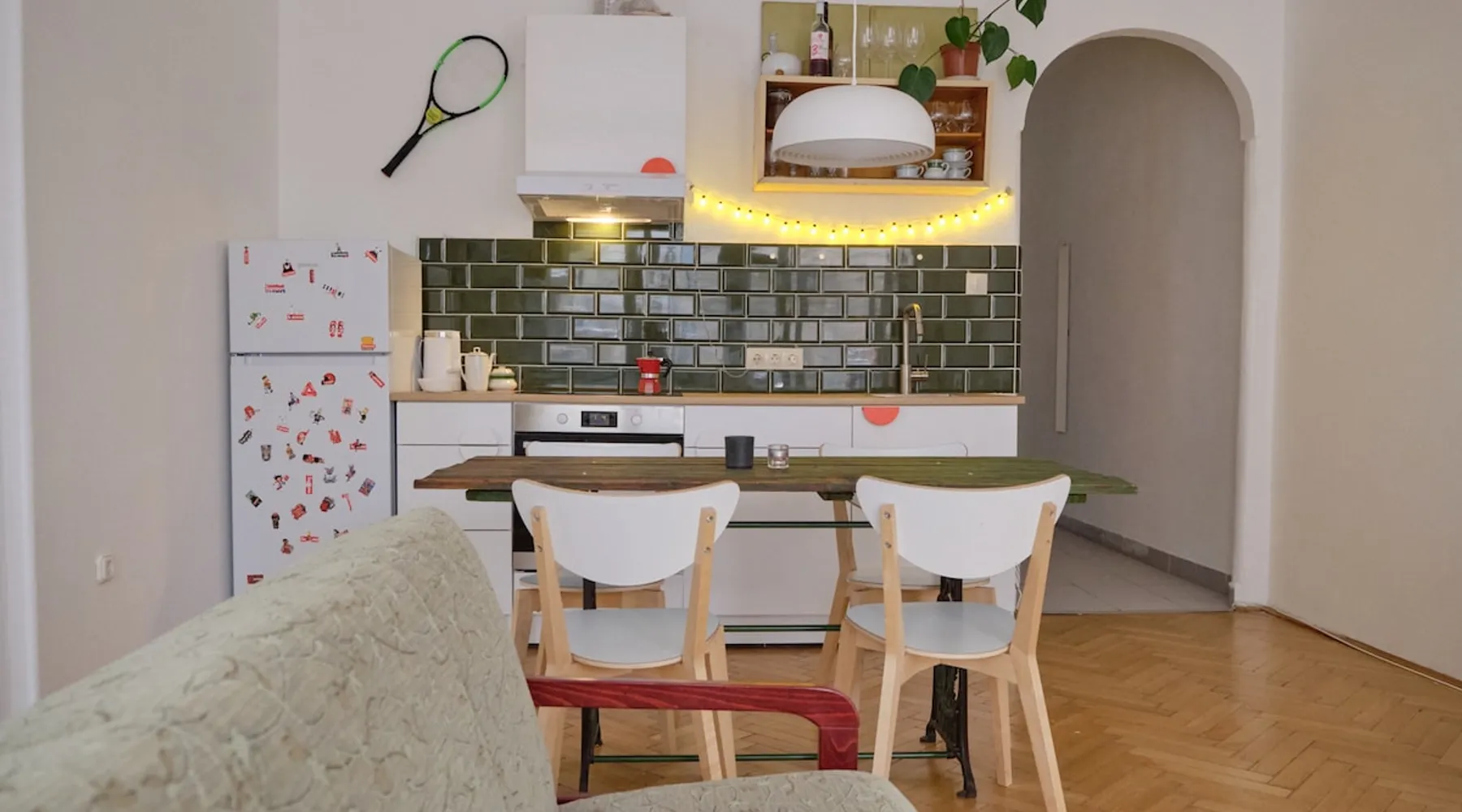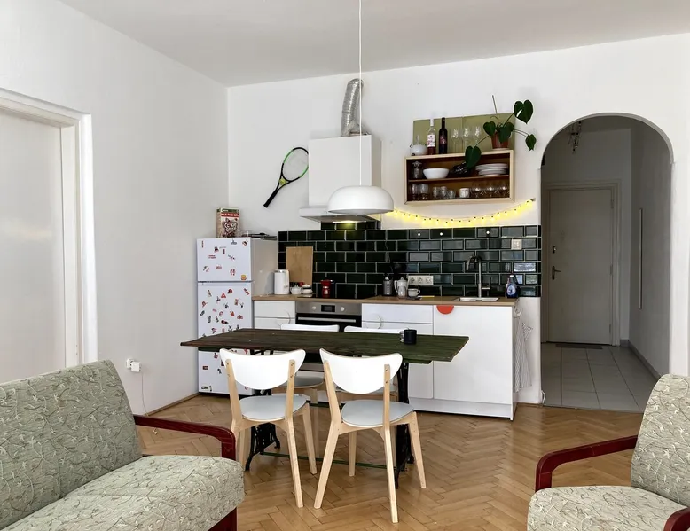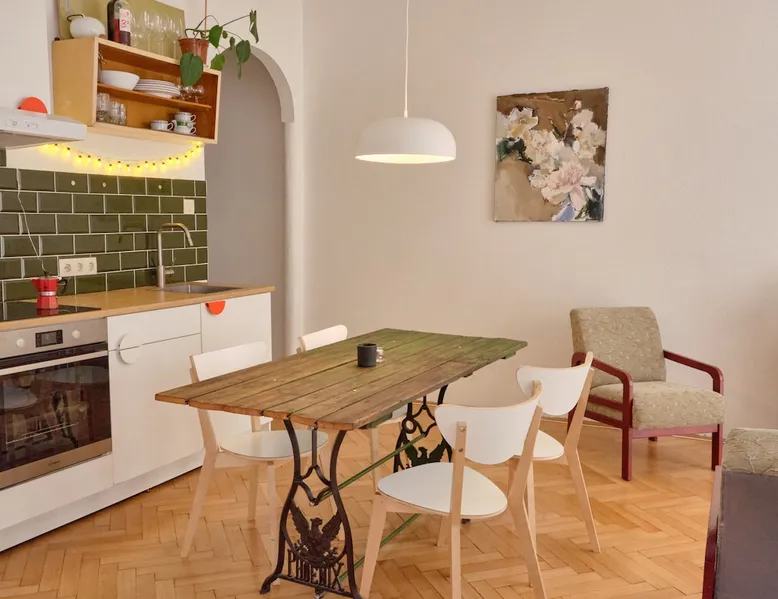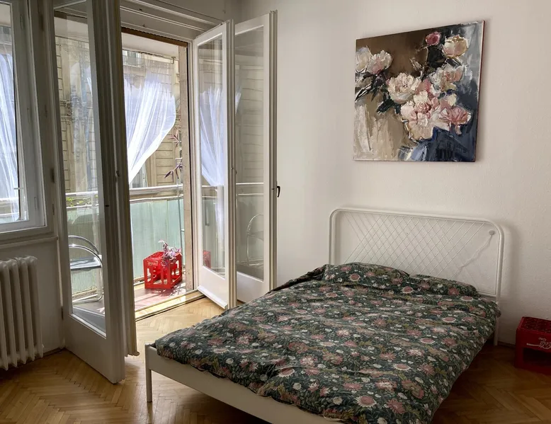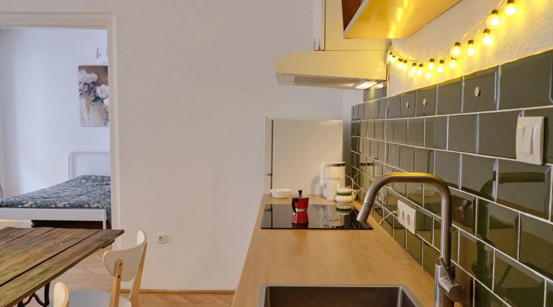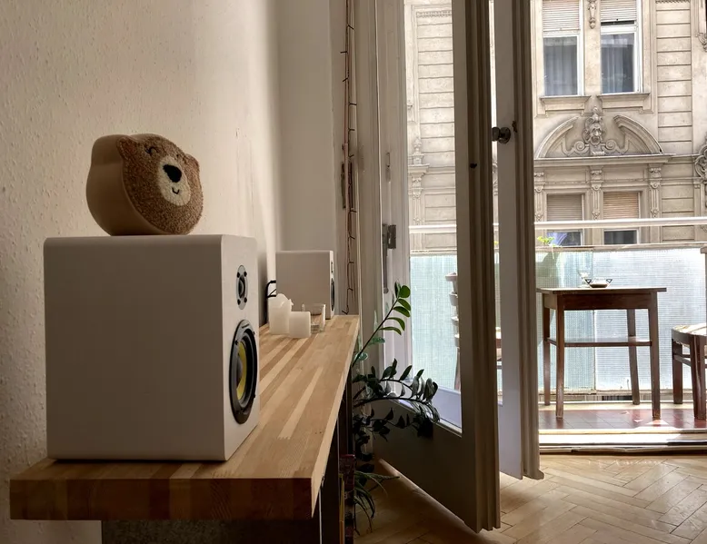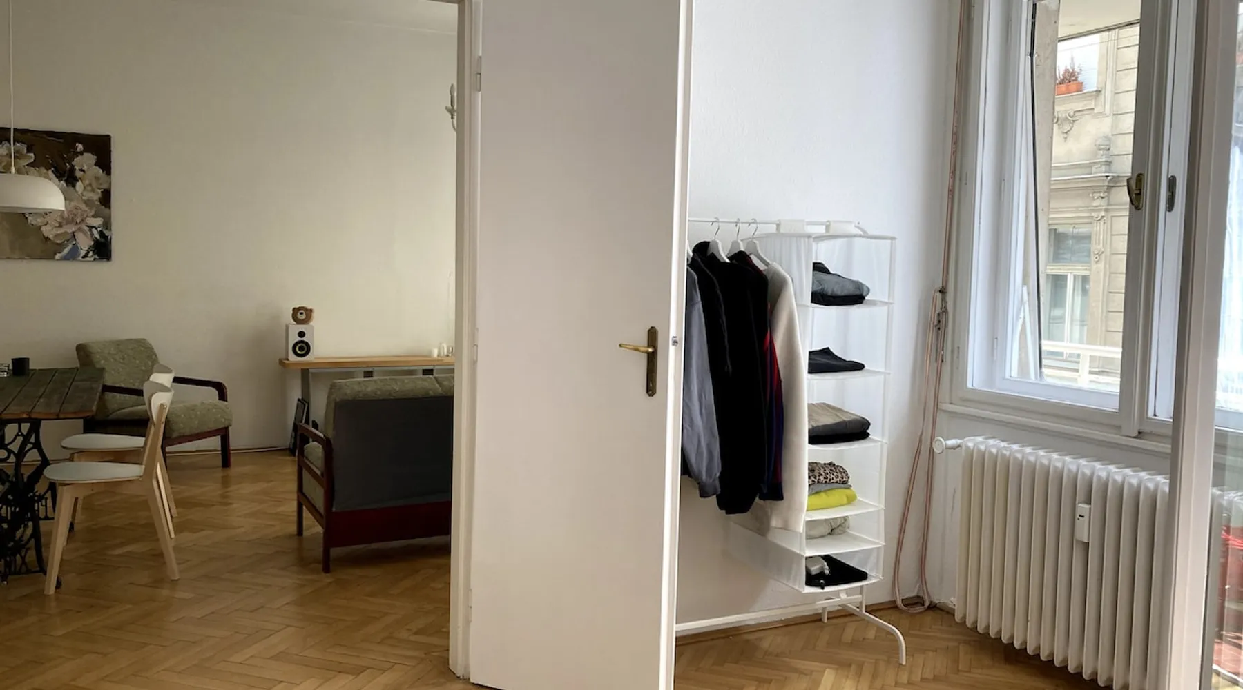 In a unique house on the third floor in the Bauhaus style (built in 1944), located on a quiet pedestrian street. Just 5 minutes walk from the Danube promenade and in the absolute center. Apartment with a huge balcony and giant windows, located on a quiet pedestrian street. The space This 58 m² apartment is wonderfully located in the heart of the 5th district. You are in few steps from the famous Váci Street, the main fashion shopping street in Budapest, with souvenir stores and breath-taking architecture. The famous St. Stephen's Basilika and Andrássy Avenue (the Hungarian "Champs Elysées”) is about 10 minutes, the Danube is just 2 blocks, the famous Vörösmarty Square (where the Christmas market takes place) is only 7 minutes. This is the best location you could possibly get in Budapest. Guest access The new self-made kitchen area contains everything you need for cooking. The dining area has a small seating area and a table on the balcony. The bedroom contains a children's room with a bed and a play area underneath. The adult part of the bedroom is separated by a special curtain. Other things to note Please note, that this is a house with real neighbors with regular lifestyles (and wanting to rest at night). So if you would like to party it is not the place for you unfortunately. Registration Details MA19017482