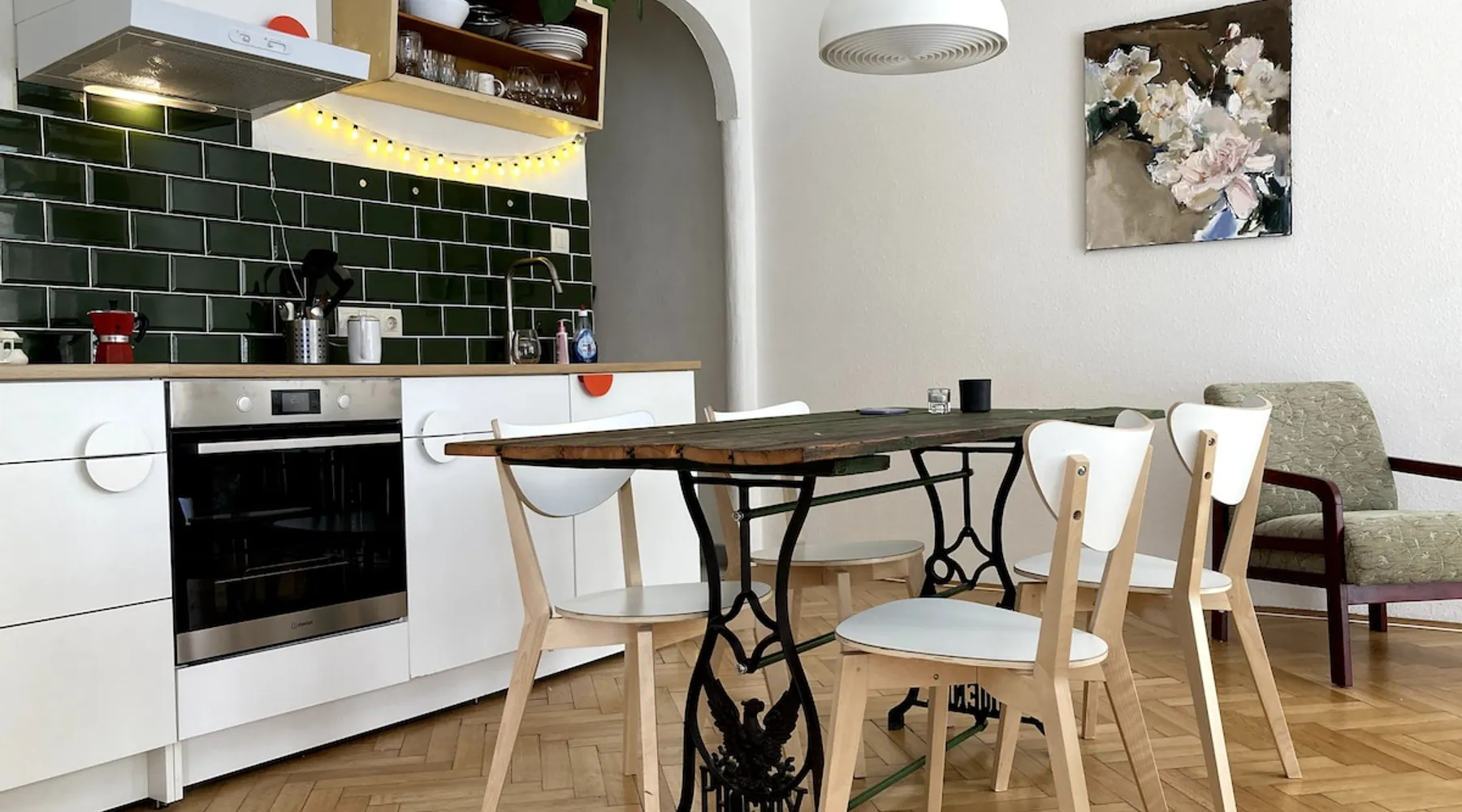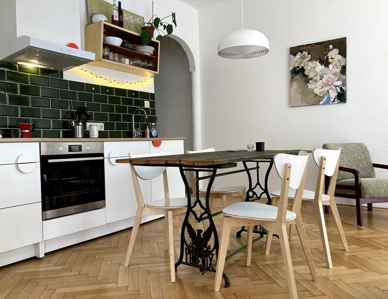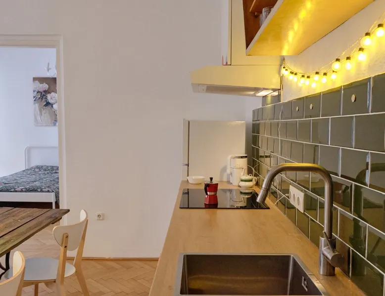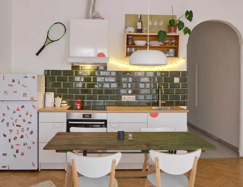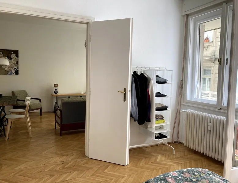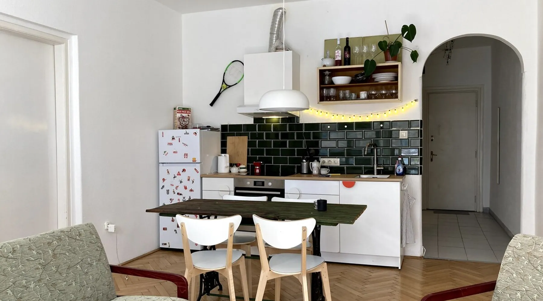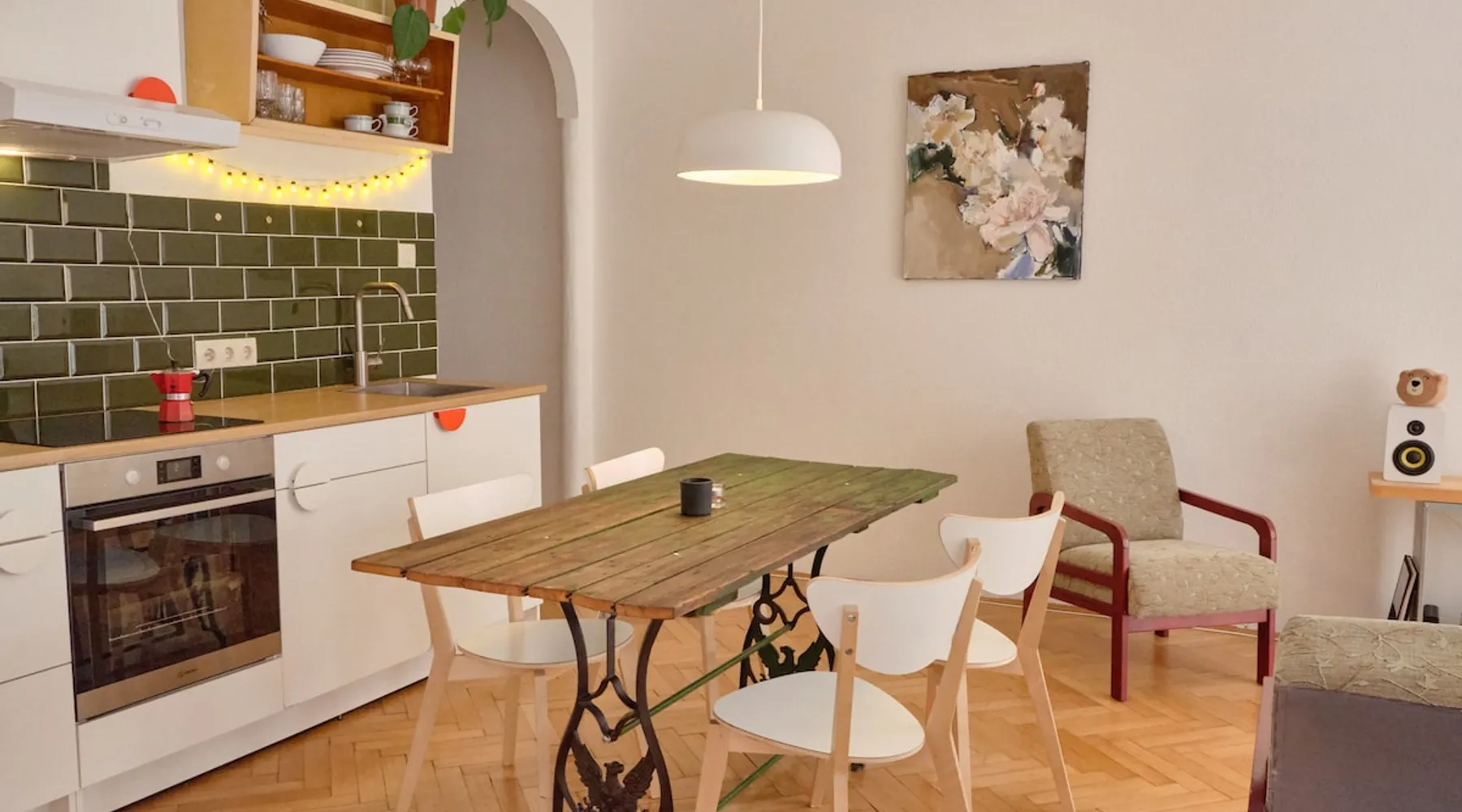In a unique house on the third floor in the Bauhaus style (built in 1944), located on a quiet pedestrian street. Just 5 minutes walk from the Danube promenade and in the absolute center. Apartment with a huge balcony and giant windows, located on a quiet pedestrian street. The space This 58 m² apartment is wonderfully located in the heart of the 5th district. You are in few steps from the famous Váci Street, the main fashion shopping street in Budapest, with souvenir stores and breath-taking architecture. The famous St. Stephen's Basilika and Andrássy Avenue (the Hungarian "Champs Elysées”) is about 10 minutes, the Danube is just 2 blocks, the famous Vörösmarty Square (where the Christmas market takes place) is only 7 minutes. This is the best location you could possibly get in Budapest. Guest access The new self-made kitchen area contains everything you need for cooking. The dining area has a small seating area and a table on the balcony. The bedroom contains a children's room with a bed and a play area underneath. The adult part of the bedroom is separated by a special curtain. Other things to note Please note, that this is a house with real neighbors with regular lifestyles (and wanting to rest at night). So if you would like to party it is not the place for you unfortunately. Registration Details MA19017482