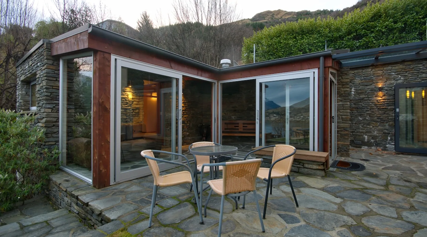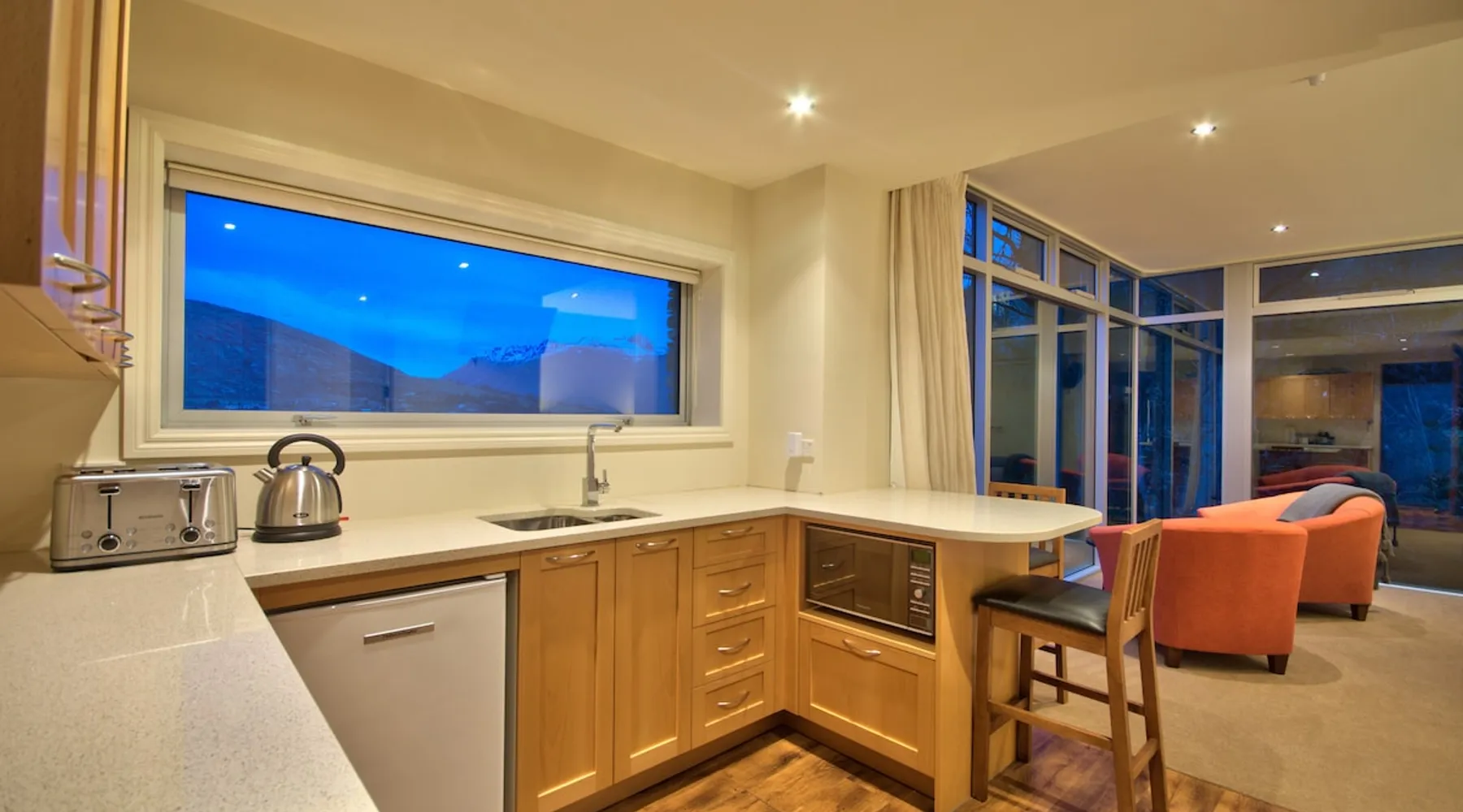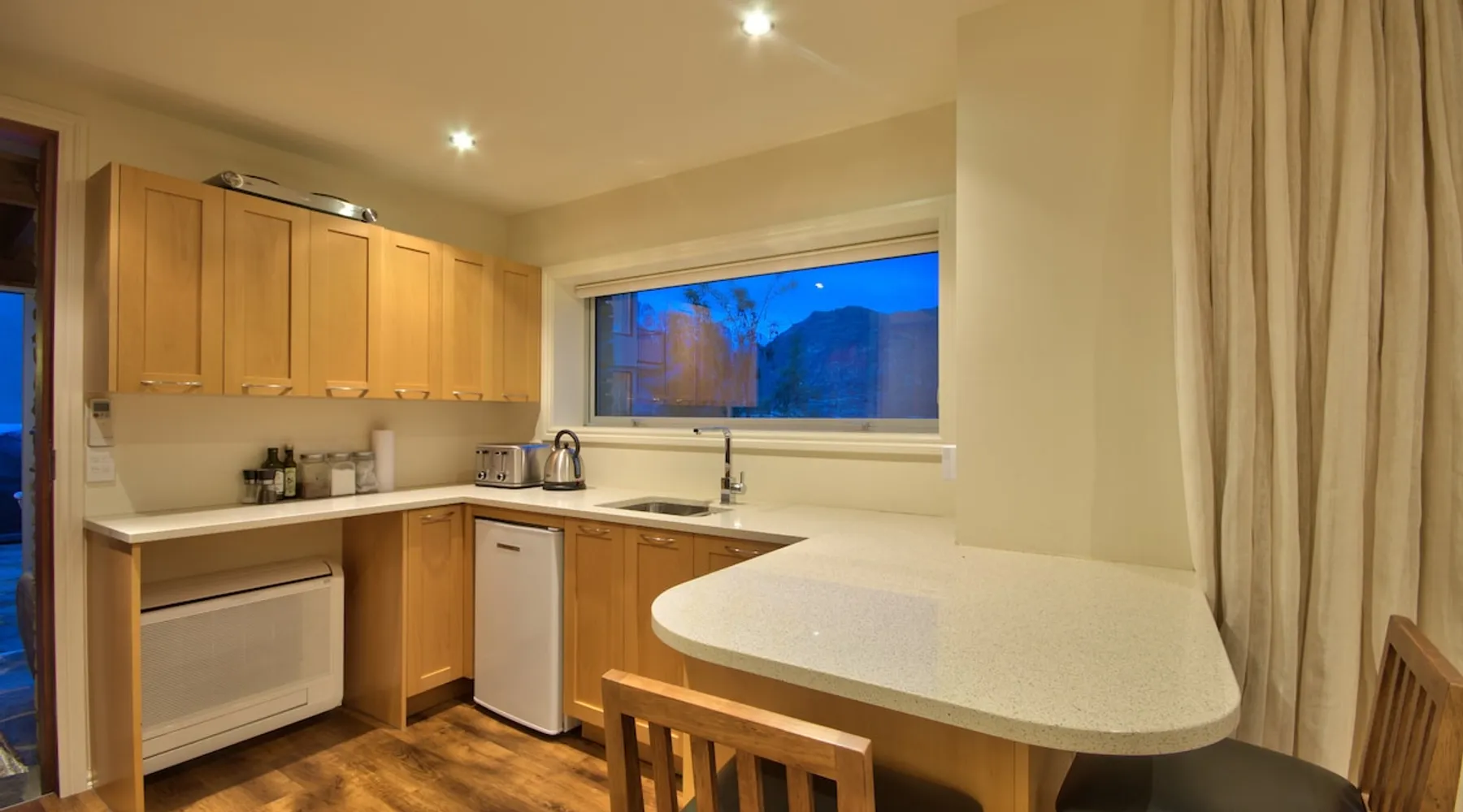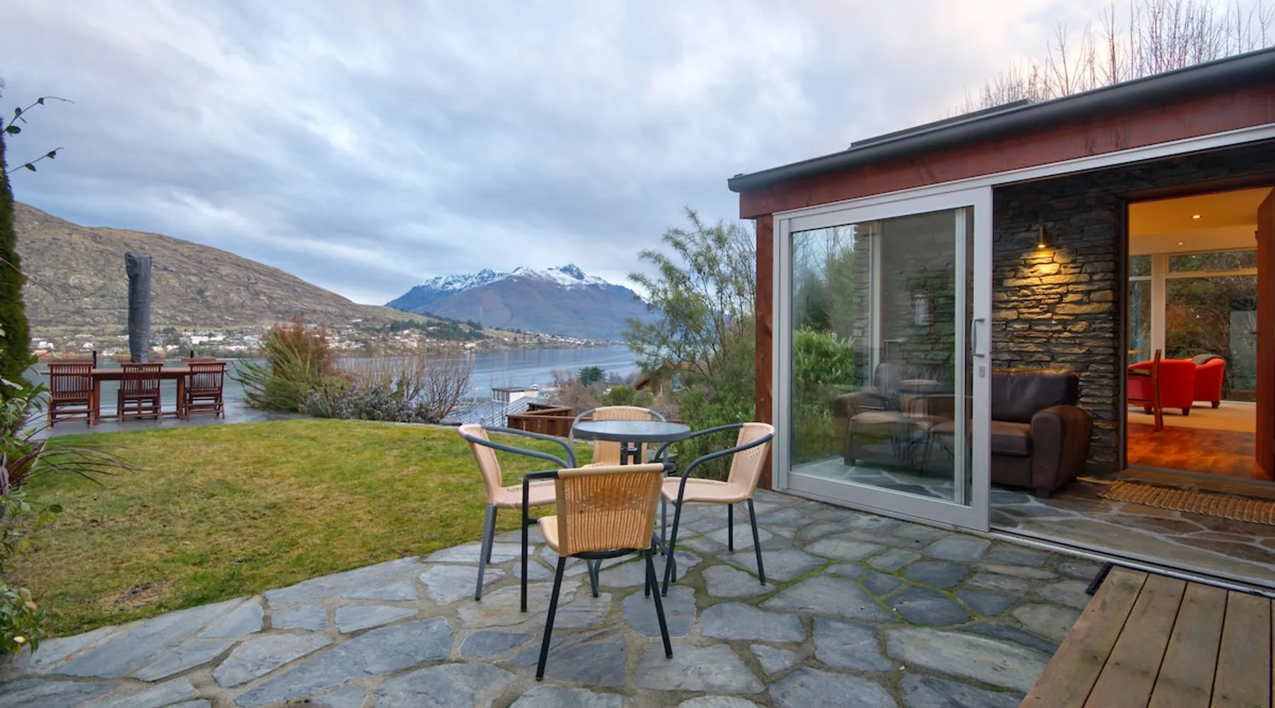 The names Four Peaks Guest House speaks for itself. It is a beautiful guesthouse with stunning views of Lake Whakatipu and the four peaks (The Remarkables, Deer Park Heights, Cecil Peak and Walter Peak) and the surrounding mountains. The space Our Guesthouse is detached from the main house with it's own separate access and is very private, set amongst native trees and looking out towards the lake and mountains. It is ideal for a couple, with one luxurious queen-size bed with electric blanket and high quality linen and bedding. The fully equipped hotel style kitchen has a microwave and an electrical portable hob. You'll find towels, a hairdryer and organic body wash provided in the bathroom. Other features include a large wardrobe, iron and ironing board, clothes hangers and a sitting area with two comfortable chairs. It also has an outdoor seating area to enjoy the remarkable view. There is a television with Freeview and unlimited WIFI plus a heat-pump to keep you cosy in winter. Guest access You have full use of the guesthouse which includes a bench seat outside the front door as well as a small outdoor table with four chairs on the lawn. The guesthouse is semi attached to the main house which is also rented on a short term basis. Those guests have a seperate access point as well as seperate outside dinning/ living areas. Other things to note AGE OF GUESTS Guest(s) making a booking must be over 18 years of age. Additionally, all guests who are unaccompanied by a parent or guardian must also be over 18 years of age. MINIMUM RENTAL PERIOD The minimum rental period is 2 nights, public holidays have a minimum stay of 3 nights, and Christmas and New Year Periods have a minimum stay of 5 nights. TEMPERAMENTAL WI-FI AND SATELLITE TV AT TIMES Please note that due to the beautifully placed location of the guesthouse, the wifi and satellite television can sometimes be temperamental. If you are wanting high speed internet, most cafes and surrounding restaurants have high speed Wi-Fi available free of charge. No smoking or Pets.