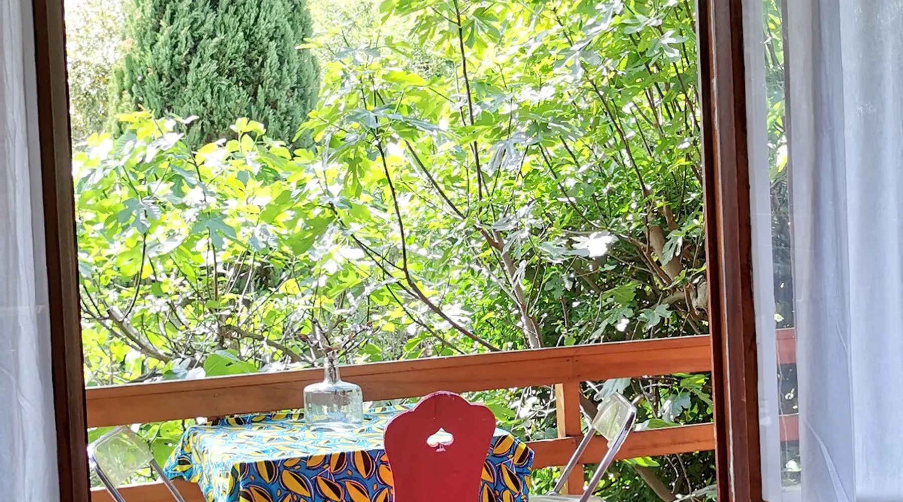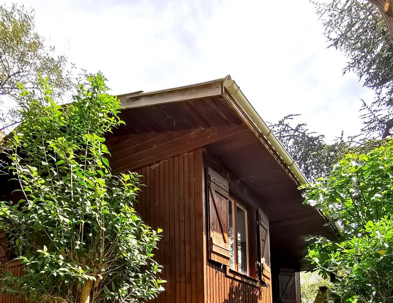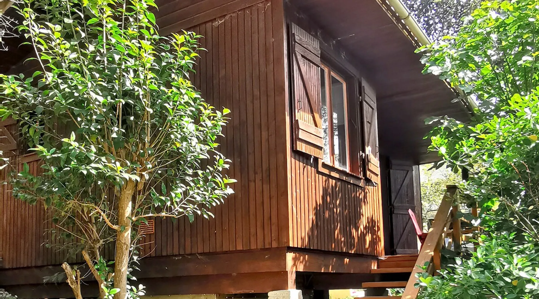 Wooden cabin in the middle of the trees, quiet and fully equipped. Enjoy a private outdoor area with pool access. Garage space available for city dwellers.
