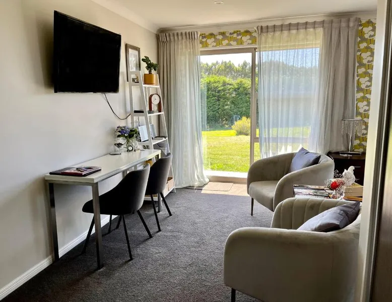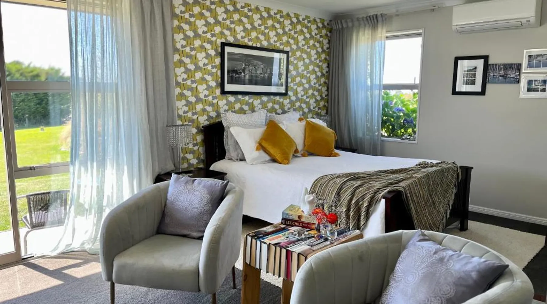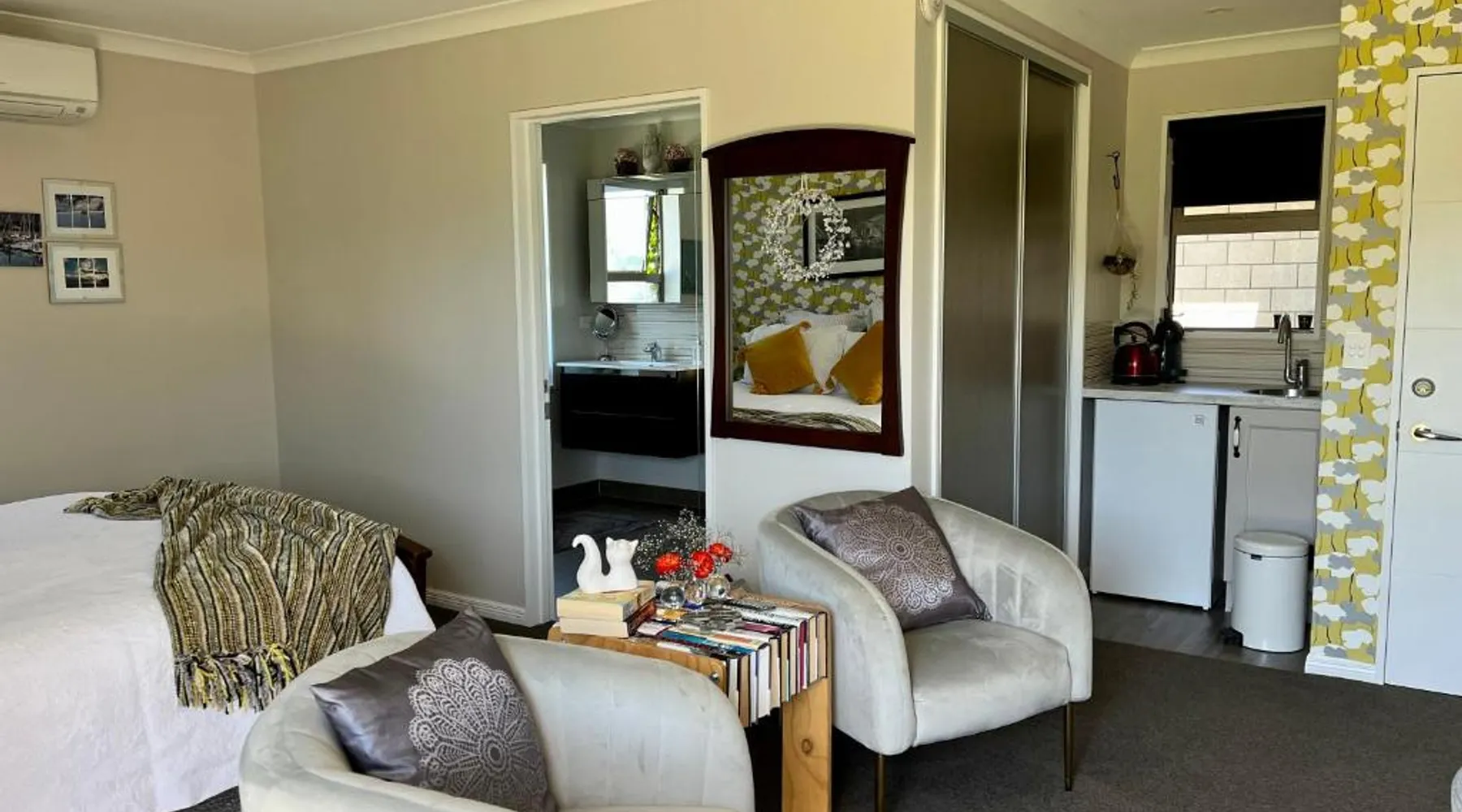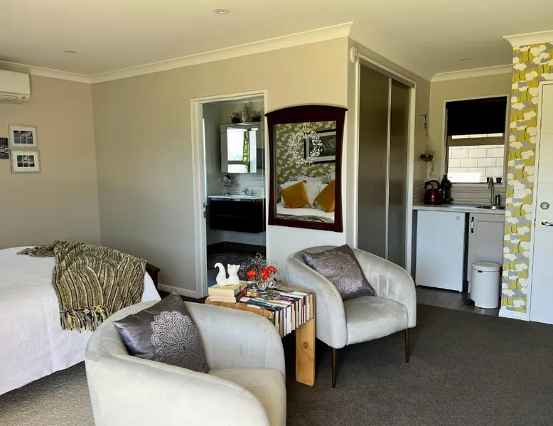 Comfortable Accommodations: Ra-ata Farm in Rangiora offers a bed and breakfast with one bedroom and a living room. Guests enjoy sea views, air-conditioning, and a private entrance. The property features a sun terrace, garden, and free WiFi. Modern Amenities: The bed and breakfast provides free on-site private parking, a private check-in and check-out service, and breakfast in the room. Additional facilities include an outdoor seating area, picnic area, family rooms, bicycle parking, and free WiFi throughout. Convenient Location: Located 24 mi from Christchurch International Airport, the property is near attractions such as Christchurch Art Gallery (25 mi) and Canterbury Museum (25 mi). Guests appreciate the quietness of the area and the comfort of the rooms. Featuring a private entrance, this air-conditioned suite consists of 1 living room, 1 separate bedroom and 1 bathroom with a walk-in shower and a hairdryer. This wheelchair accessible suite features a tea and coffee maker, a seating area with a flat-screen TV and a roll-in shower. The unit offers 1 bed.