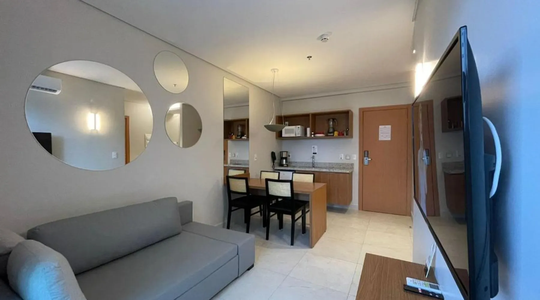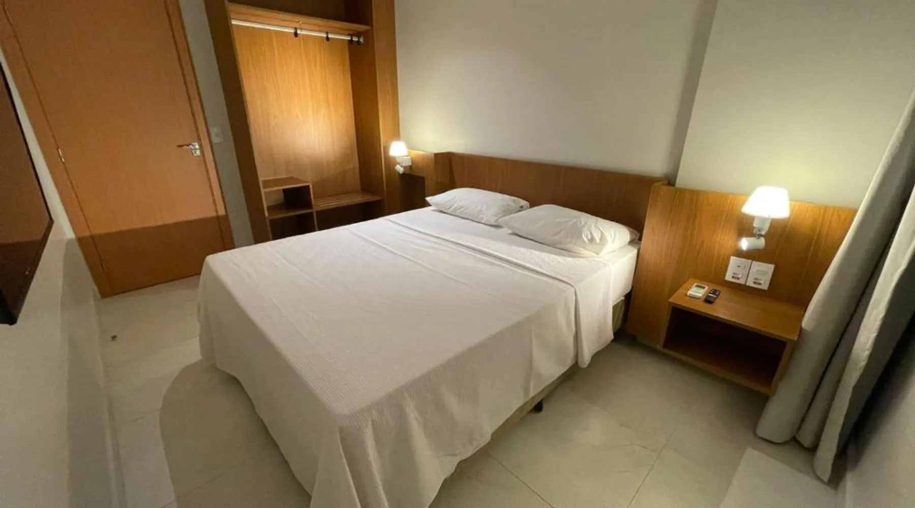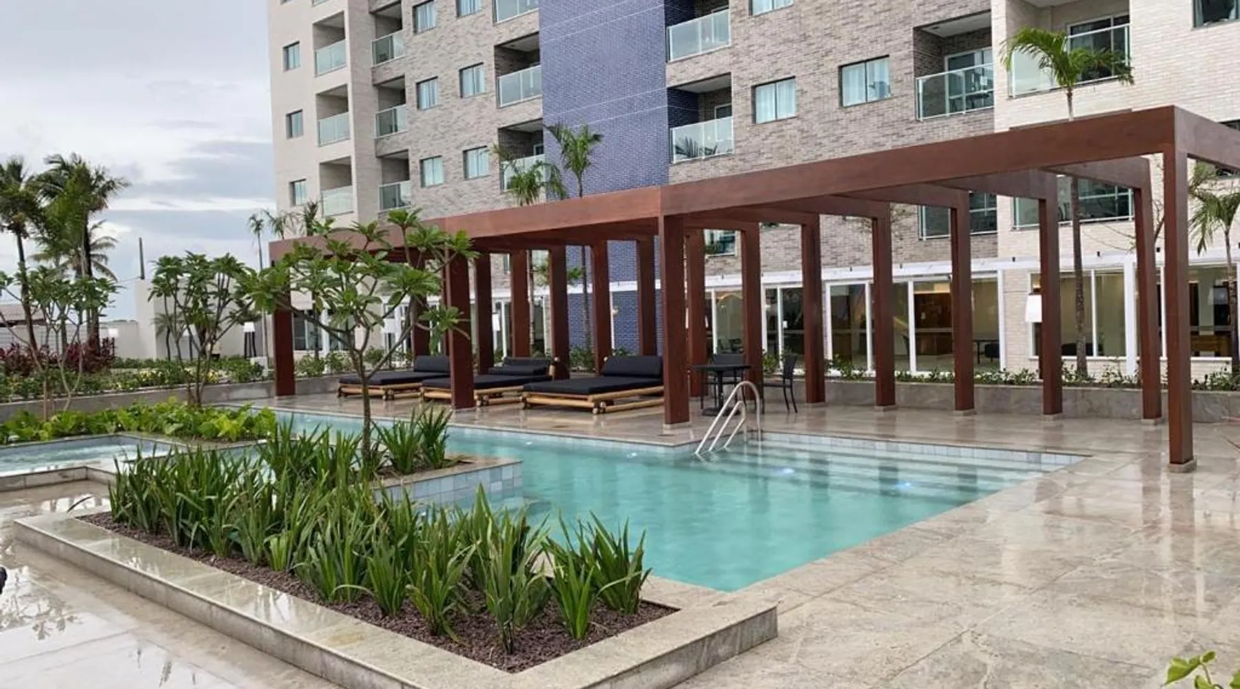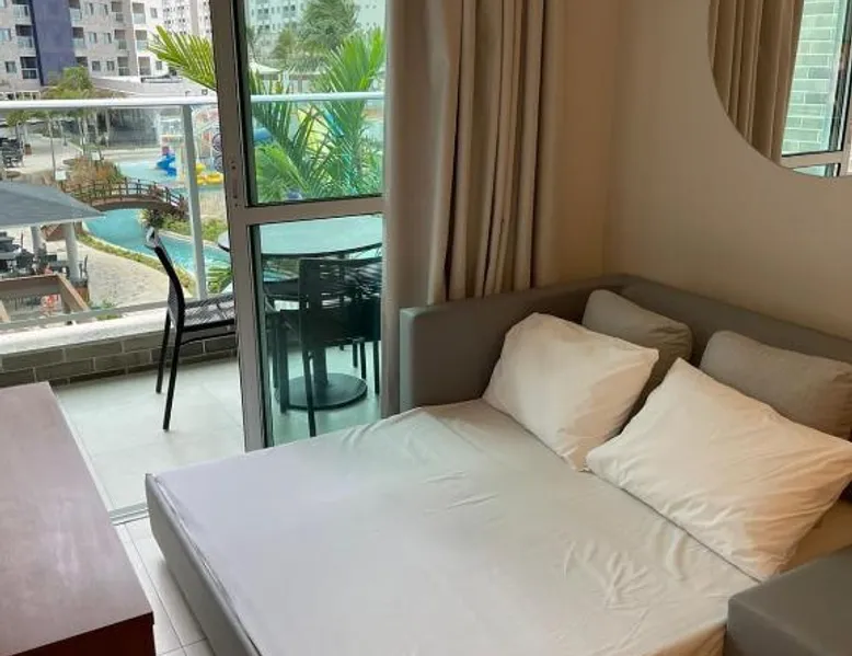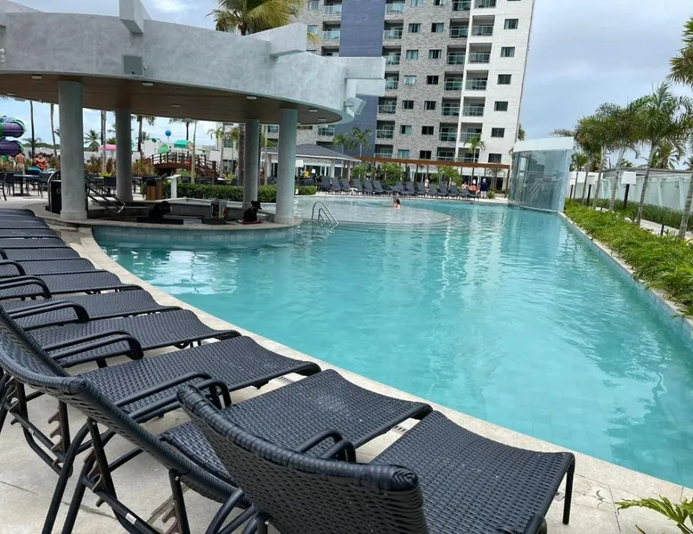 Comfortable Accommodations: Salinas Exclusive Resort in Salinópolis offers one-bedroom apartments with balconies and modern amenities. Each unit includes a fully equipped kitchen, air-conditioning, and a living room with a sofa bed. Leisure Facilities: Guests can enjoy a sauna, fitness center, and a year-round outdoor swimming pool. The resort features a garden, bar, and free WiFi, ensuring a relaxing and connected stay. Convenient Services: The aparthotel provides housekeeping, room service, and a pool bar. Free on-site private parking is available, and Salinópolis Airport is 8.7 mi away. Atalaia Beach is located 1.2 mi from the property. The air-conditioned apartment has 1 bedroom, 1 bathroom and a kitchen. The apartment's kitchen, which features kitchenware and a microwave, is available for cooking and storing food. Boasting a balcony with pool views, this apartment also features a tiled floor and a flat-screen TV. The unit has 2 beds.