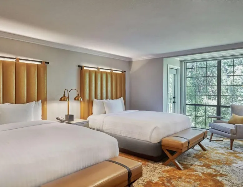 Comfortable Accommodations: The Inn at Saratoga in Saratoga offers family rooms with air-conditioning, balconies, and modern amenities. Guests enjoy free WiFi, bathrobes, and flat-screen TVs. Dining and Leisure: The modern, family-friendly restaurant serves vegetarian, vegan, and gluten-free options. Additional facilities include a fitness center, sun terrace, and outdoor fireplace. Convenient Location: Located 9.9 mi from Norman Y. Mineta San Jose International Airport, the inn is near attractions such as Winchester Mystery House (6.8 mi) and San Jose Convention Center (11 mi). Guests appreciate the room comfort and cleanliness. This suite has air conditioning, a tea and coffee maker, a flat-screen TV with cable channels and a balcony. The unit has 2 beds.