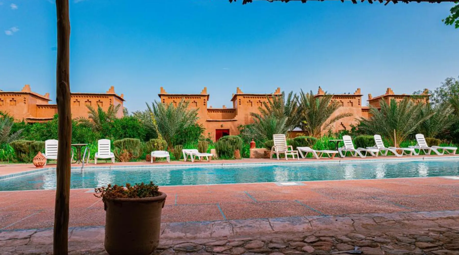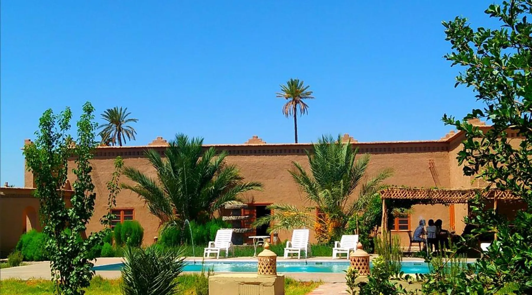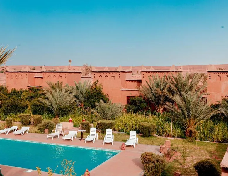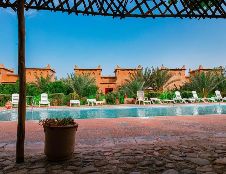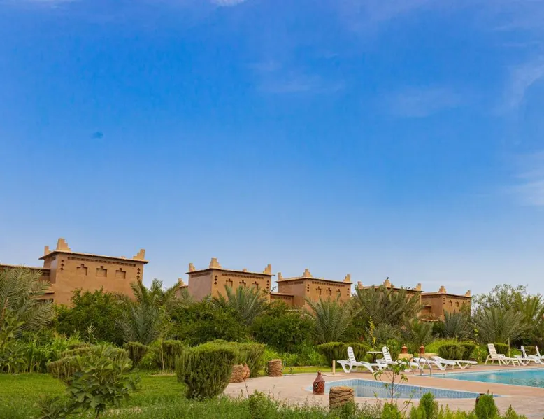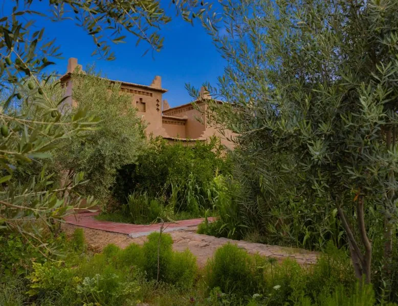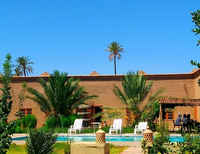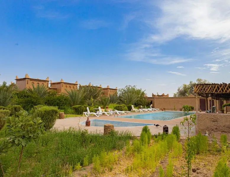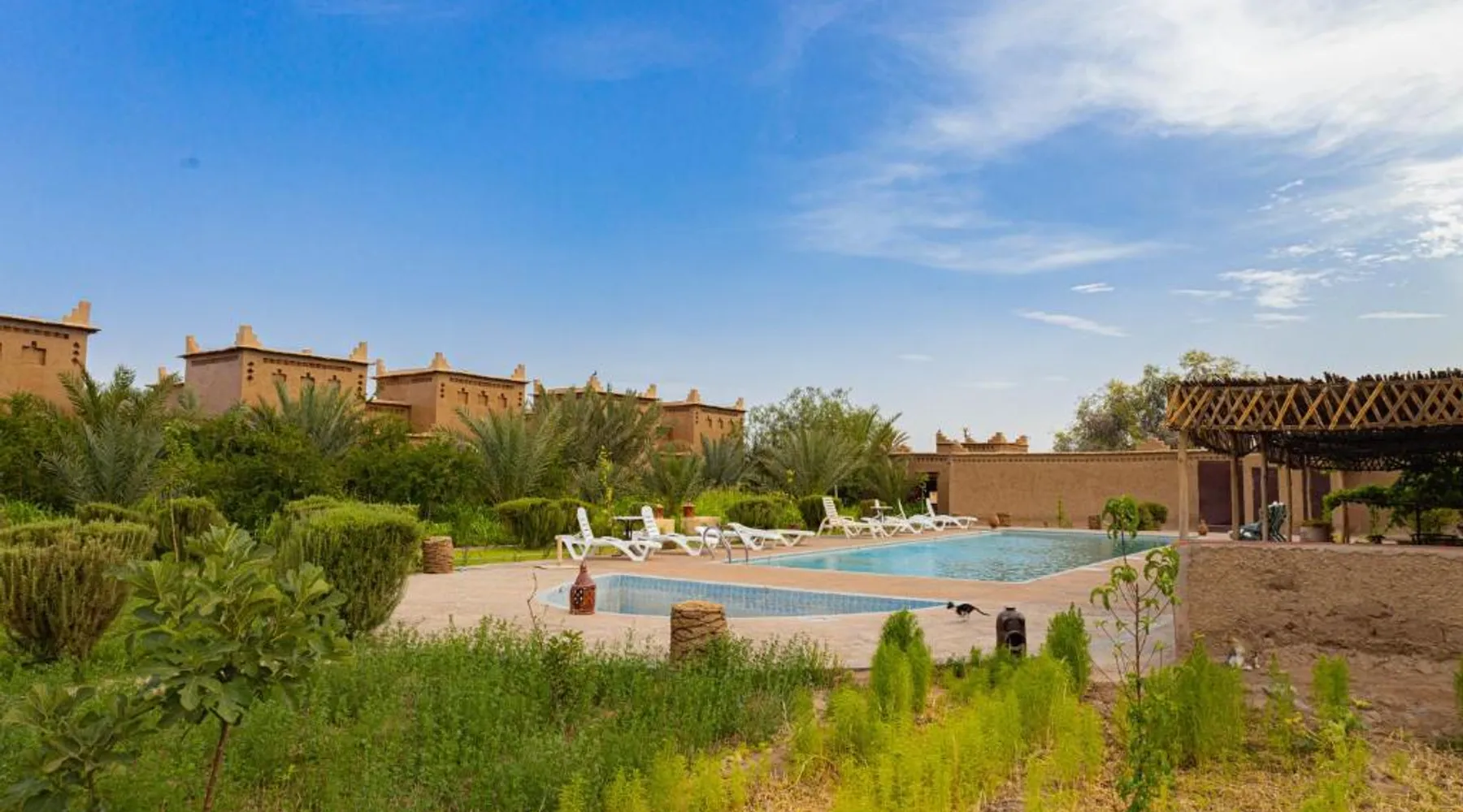 Comfortable Accommodations: Maison D'hôte Amridil in Skoura offers family rooms with air-conditioning, private bathrooms, and garden views. Each room includes a wardrobe, free toiletries, and a dining area. Exceptional Facilities: Guests enjoy a sun terrace, seasonal outdoor swimming pool, and a lush garden. The property features a restaurant, coffee shop, and free WiFi. Additional amenities include a terrace, pool, and mountain views. Dining Experience: The family-friendly restaurant serves African cuisine with halal, kosher, vegetarian, vegan, and gluten-free options. Breakfast includes continental, American, buffet, Italian, full English/Irish, and local specialties. Prime Location: Located 23 mi from Ouarzazate Airport, the guest house is a 5-minute walk from Kasbah Amridil. Nearby attractions include the Skoura Palm Grove and the Atlas Mountains. The spacious double room features air conditioning, a private entrance, as well as a private bathroom boasting a shower and a bidet. Among the room amenities are a wardrobe, tumble dryer, heating as well as outdoor furniture and garden views.