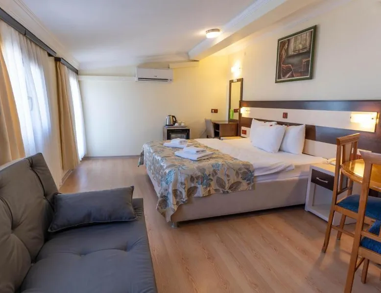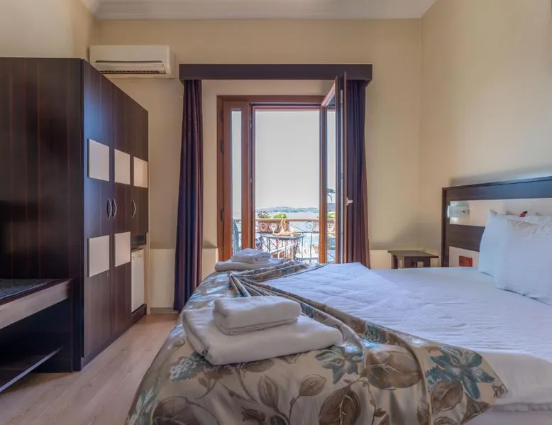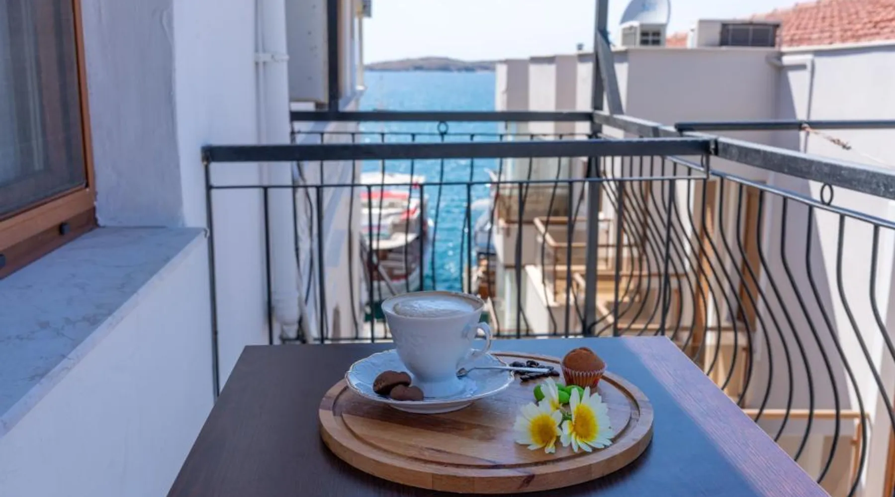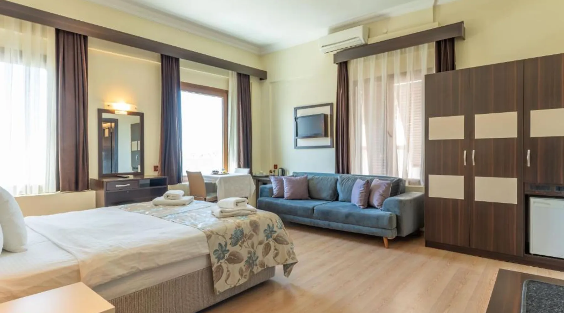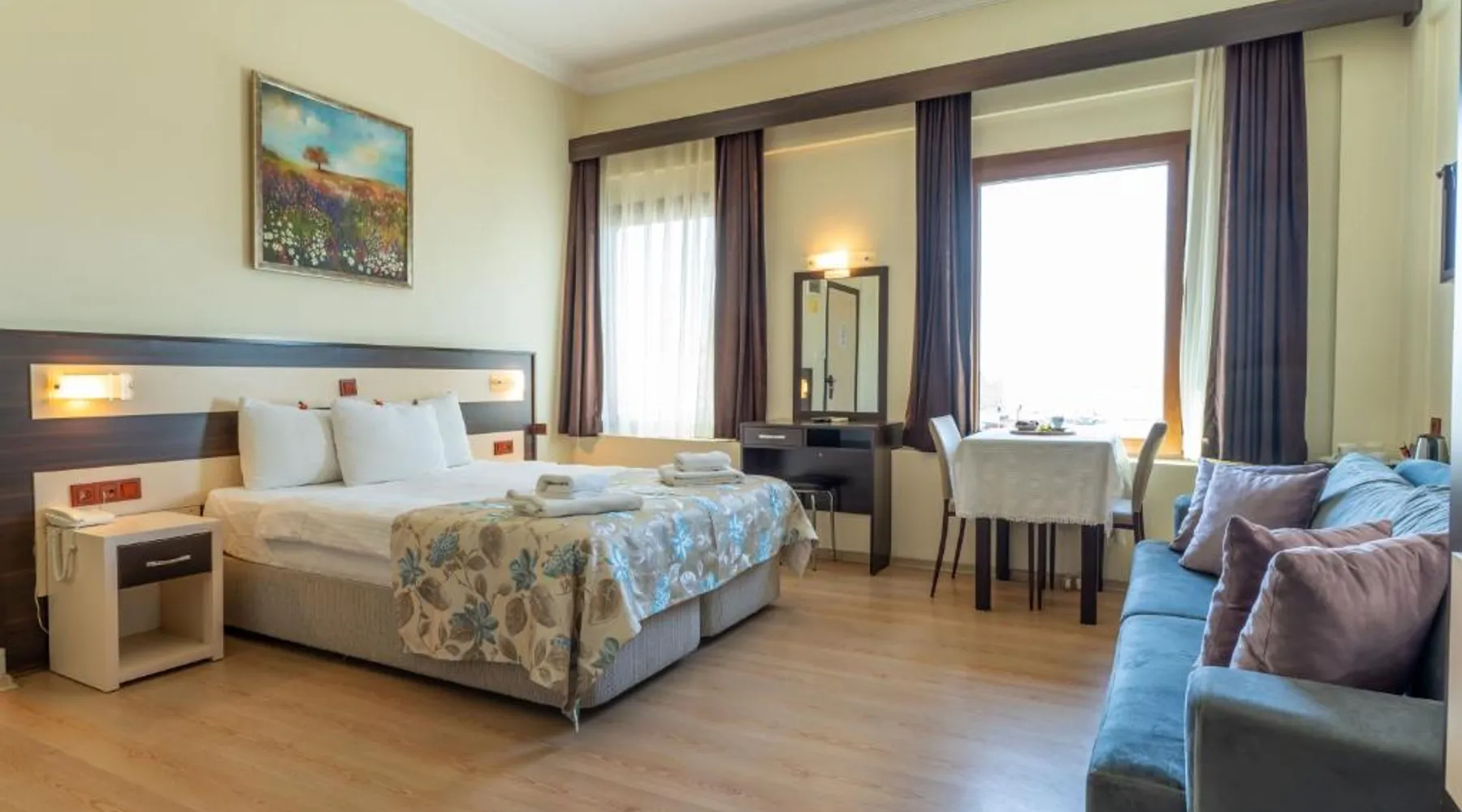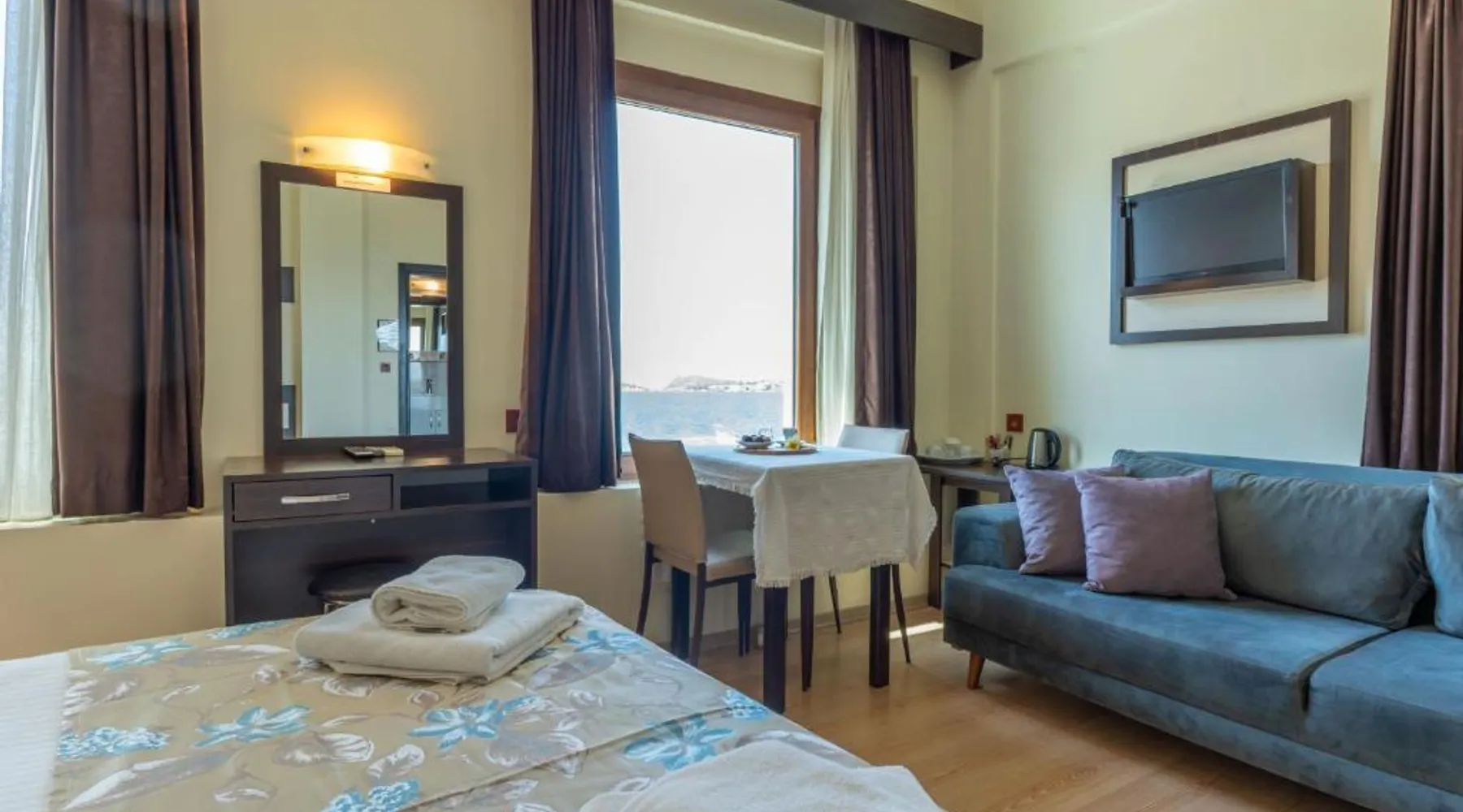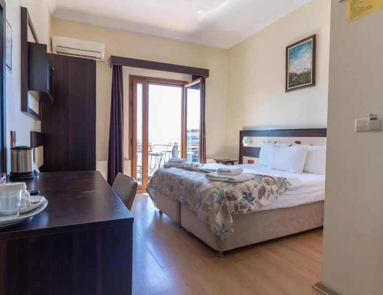 Beachfront Location: Hotel Karacam in Foca offers direct beachfront access, a lush garden, and a spacious terrace. Guests can relax by the bar and enjoy free WiFi throughout the property. Comfortable Accommodations: Rooms feature air-conditioning, private bathrooms, sea or city views, balconies, and modern amenities such as mini-bars and flat-screen TVs. Family rooms and sofa beds cater to all travelers. Dining Options: Breakfast includes continental, buffet, à la carte, vegetarian, and halal options with local specialties, warm dishes, fresh pastries, cheese, and fruits. The on-site coffee shop serves a variety of beverages. Convenient Services: The hotel provides a paid shuttle service, lounge, 24-hour front desk, concierge, housekeeping, room service, bike hire, and luggage storage. Free private parking is available. Izmir Adnan Menderes Airport is 58 mi away. This room has a balcony with sea view.
