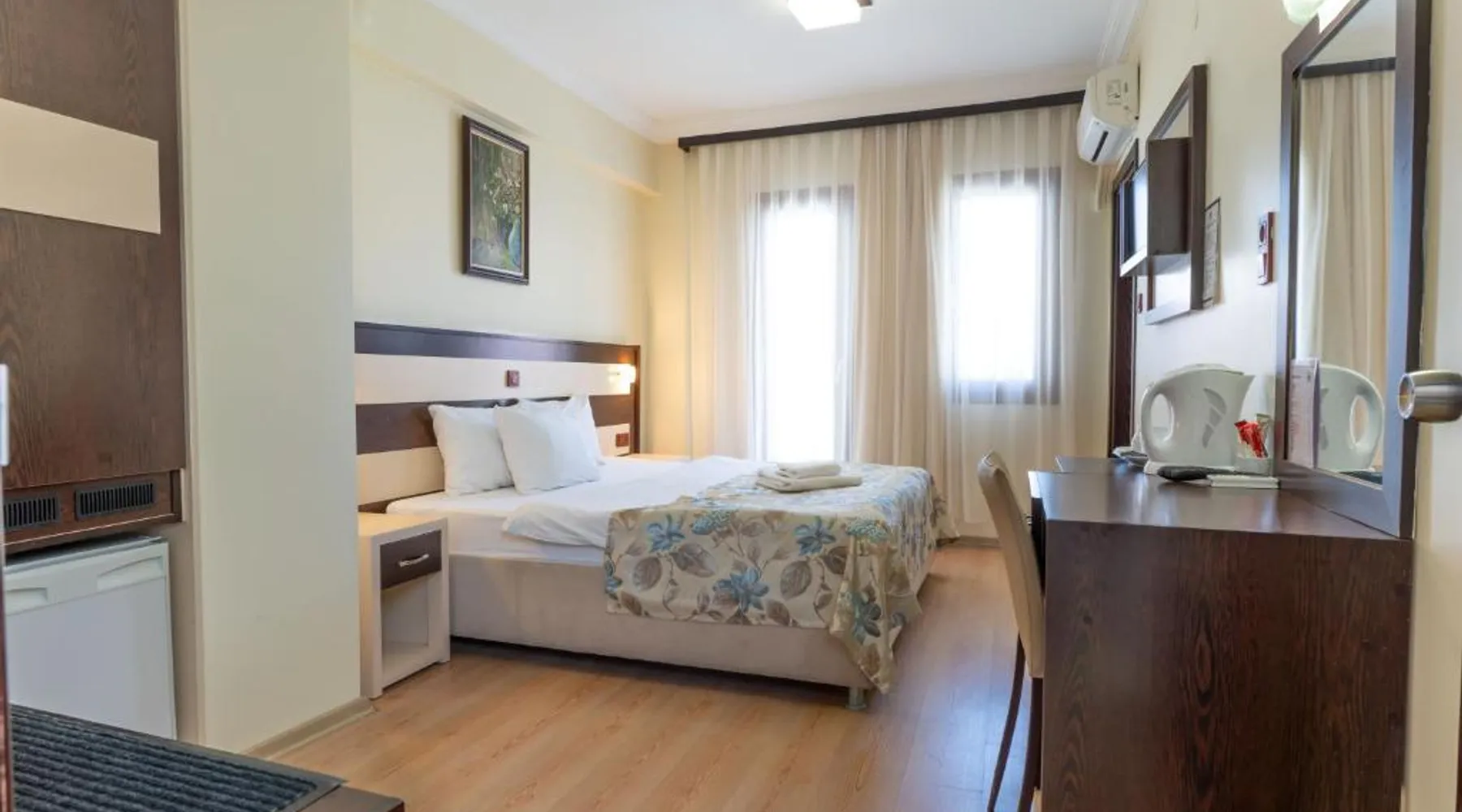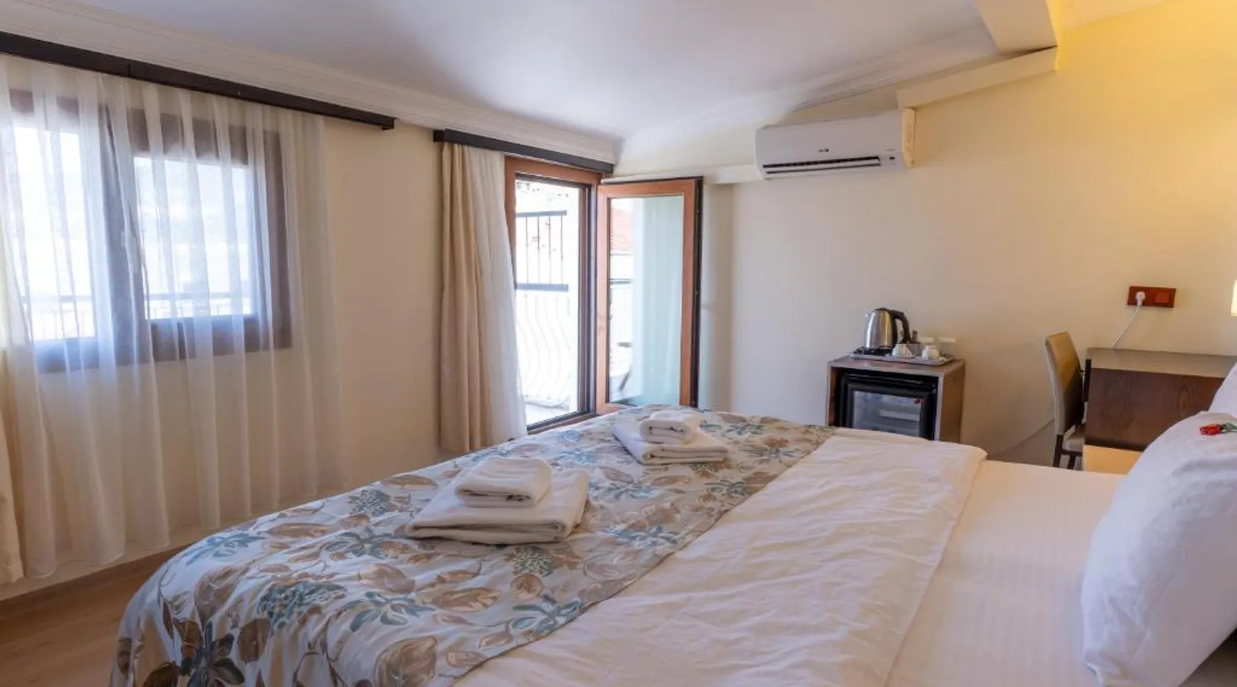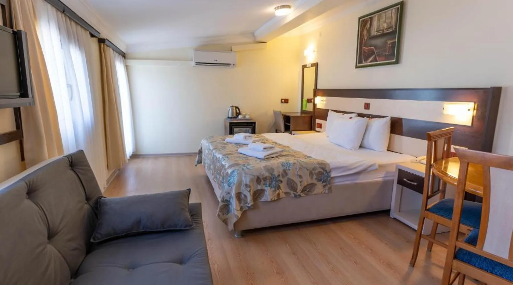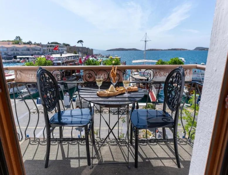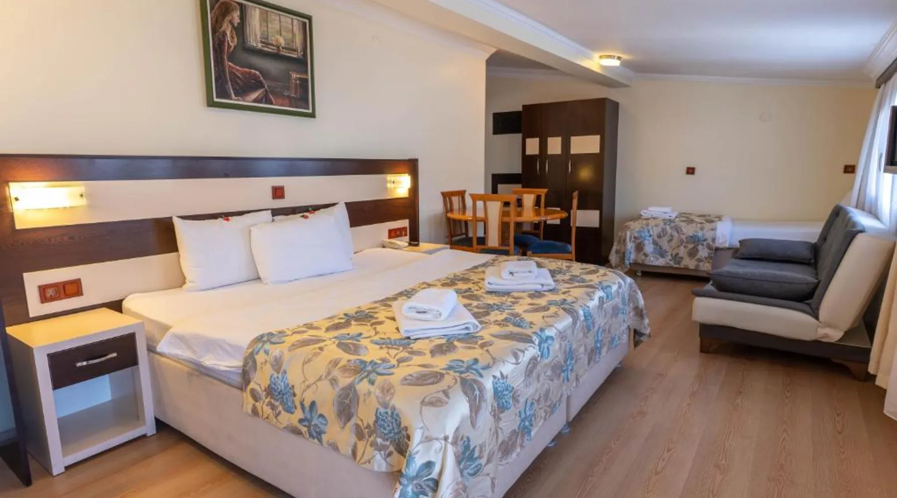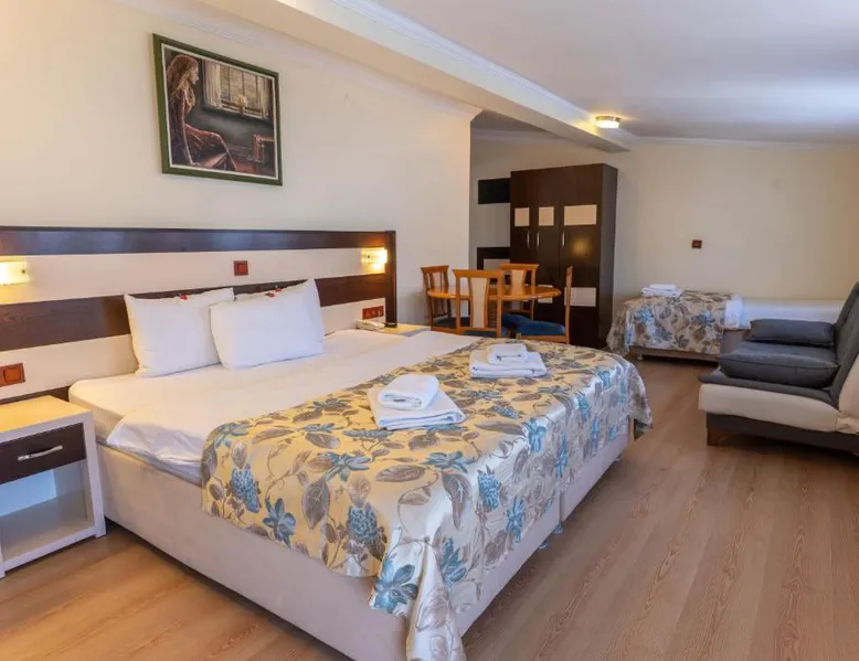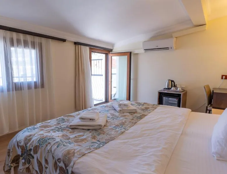 Beachfront Location: Hotel Karacam in Foca offers direct beachfront access, a lush garden, and a spacious terrace. Guests can relax by the bar and enjoy free WiFi throughout the property. Comfortable Accommodations: Rooms feature air-conditioning, private bathrooms, sea or city views, balconies, and modern amenities such as mini-bars and flat-screen TVs. Family rooms and sofa beds cater to all travelers. Dining Options: Breakfast includes continental, buffet, à la carte, vegetarian, and halal options with local specialties, warm dishes, fresh pastries, cheese, and fruits. The on-site coffee shop serves a variety of beverages. Convenient Services: The hotel provides a paid shuttle service, lounge, 24-hour front desk, concierge, housekeeping, room service, bike hire, and luggage storage. Free private parking is available. Izmir Adnan Menderes Airport is 58 mi away. This room has a balcony with sea view.