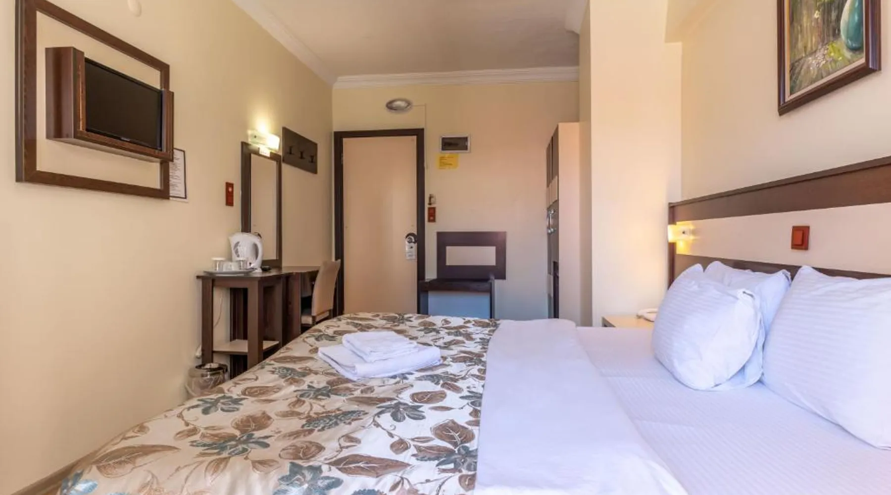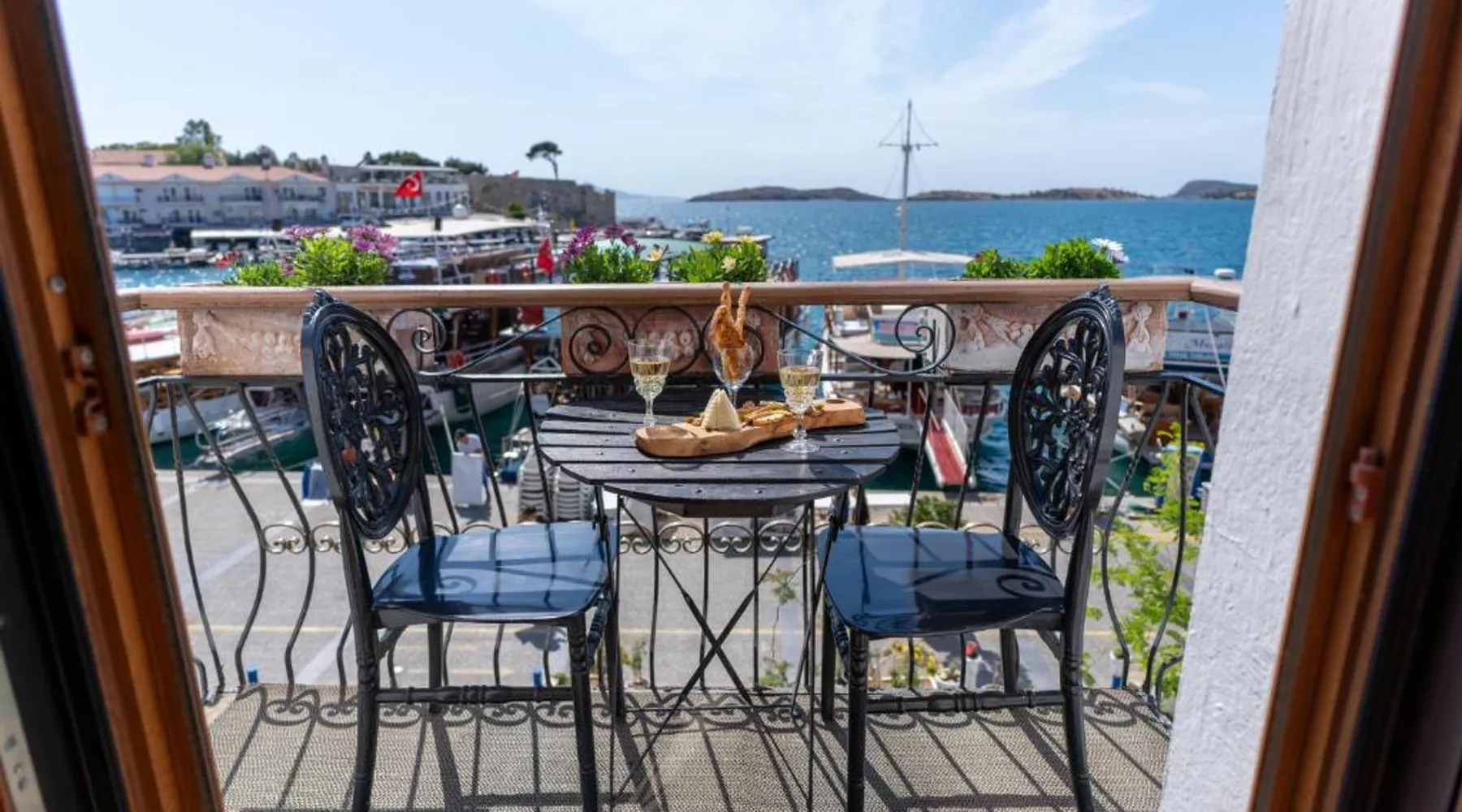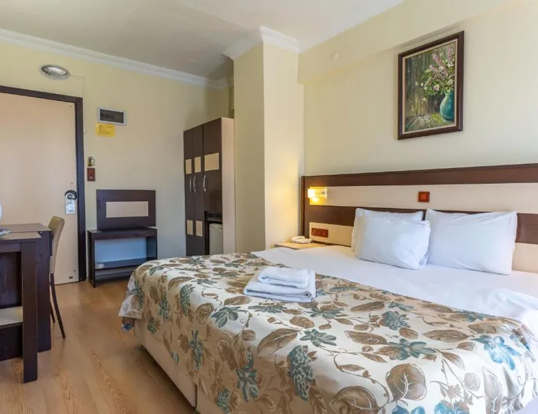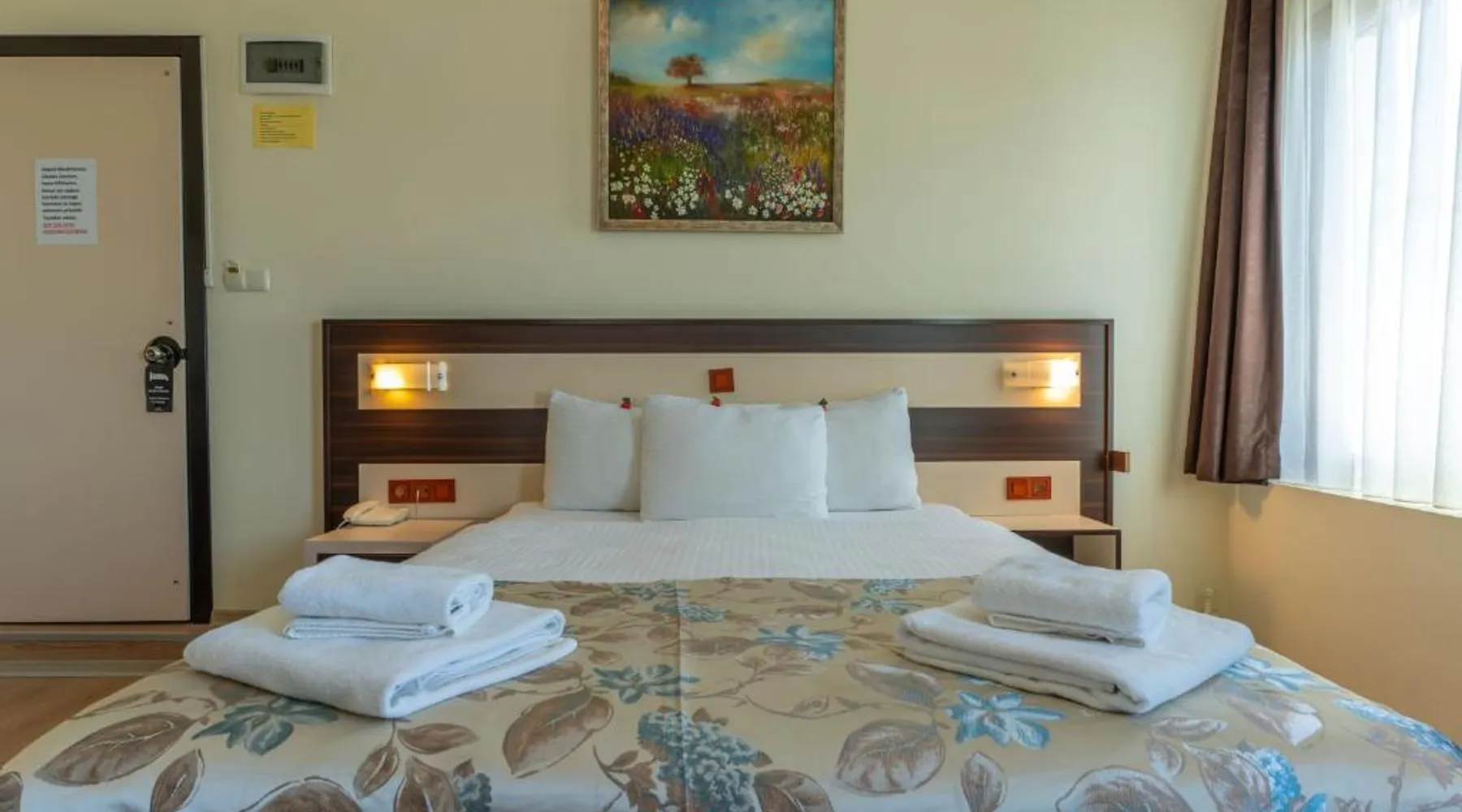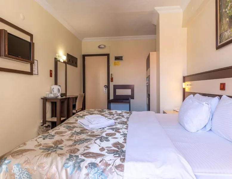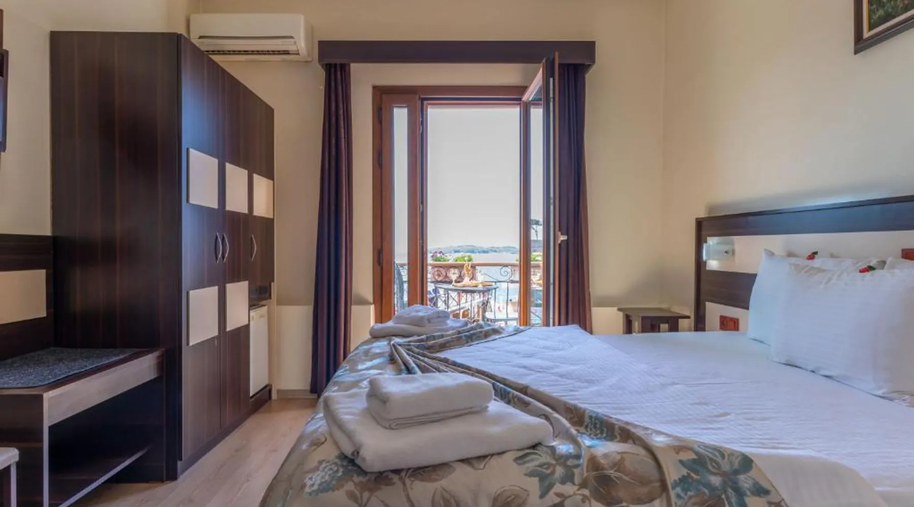 Beachfront Location: Hotel Karacam in Foca offers direct beachfront access, a lush garden, and a spacious terrace. Guests can relax by the bar and enjoy free WiFi throughout the property. Comfortable Accommodations: Rooms feature air-conditioning, private bathrooms, sea or city views, balconies, and modern amenities such as mini-bars and flat-screen TVs. Family rooms and sofa beds cater to all travelers. Dining Options: Breakfast includes continental, buffet, à la carte, vegetarian, and halal options with local specialties, warm dishes, fresh pastries, cheese, and fruits. The on-site coffee shop serves a variety of beverages. Convenient Services: The hotel provides a paid shuttle service, lounge, 24-hour front desk, concierge, housekeeping, room service, bike hire, and luggage storage. Free private parking is available. Izmir Adnan Menderes Airport is 58 mi away. This room has a balcony with sea view.