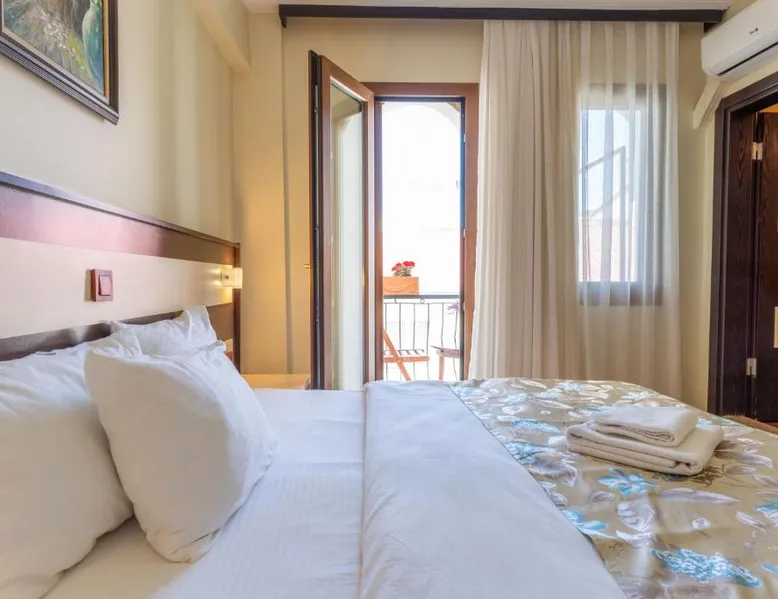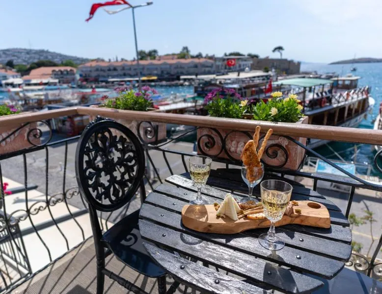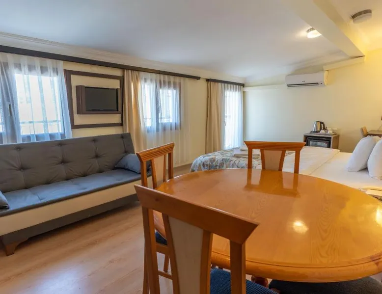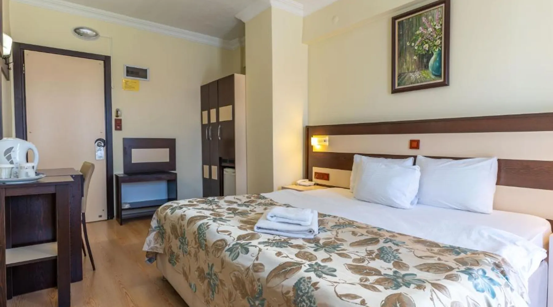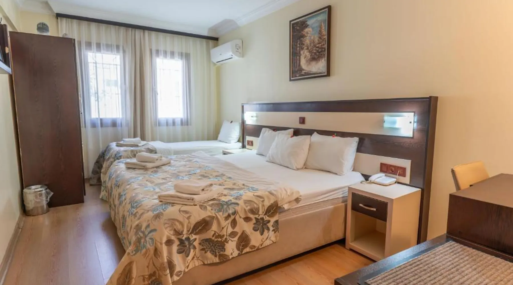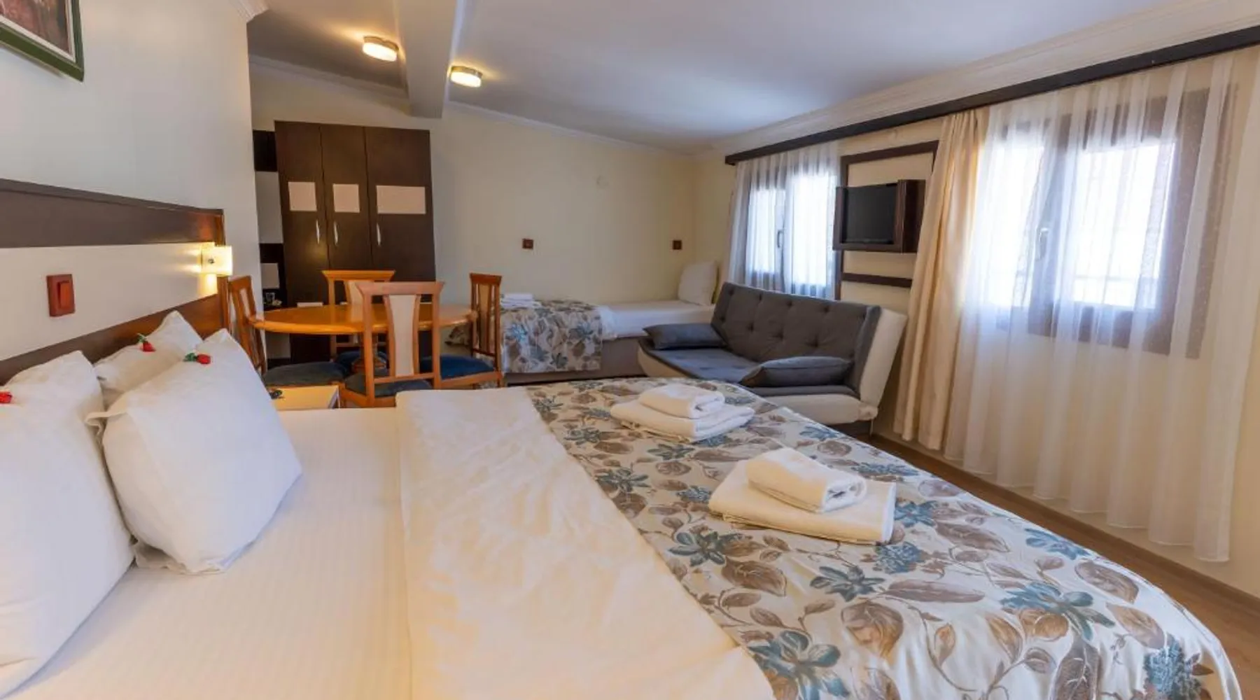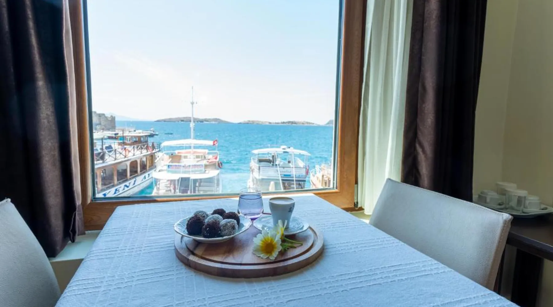Beachfront Location: Hotel Karacam in Foca offers direct beachfront access, a lush garden, and a spacious terrace. Guests can relax by the bar and enjoy free WiFi throughout the property. Comfortable Accommodations: Rooms feature air-conditioning, private bathrooms, sea or city views, balconies, and modern amenities such as mini-bars and flat-screen TVs. Family rooms and sofa beds cater to all travelers. Dining Options: Breakfast includes continental, buffet, à la carte, vegetarian, and halal options with local specialties, warm dishes, fresh pastries, cheese, and fruits. The on-site coffee shop serves a variety of beverages. Convenient Services: The hotel provides a paid shuttle service, lounge, 24-hour front desk, concierge, housekeeping, room service, bike hire, and luggage storage. Free private parking is available. Izmir Adnan Menderes Airport is 58 mi away. This room has a balcony with sea view.