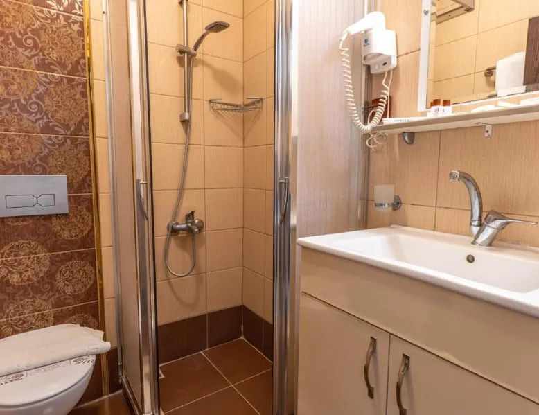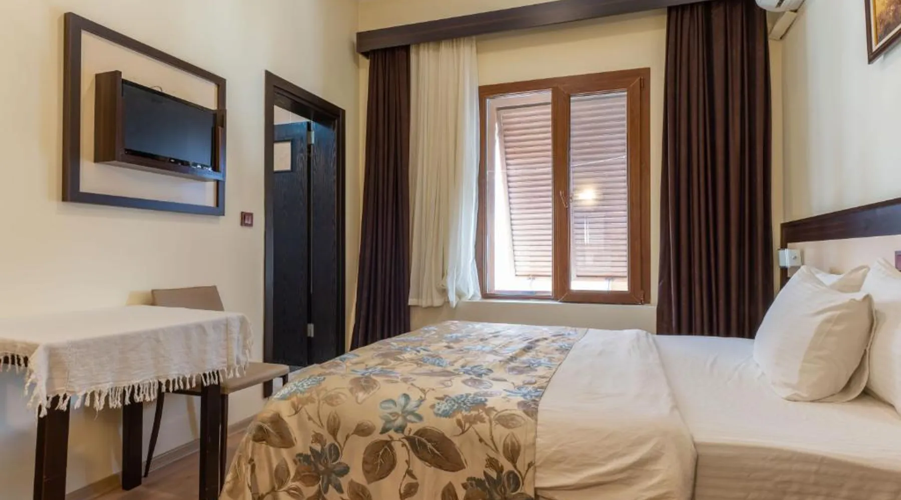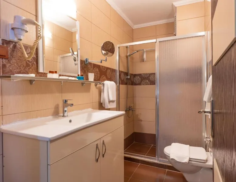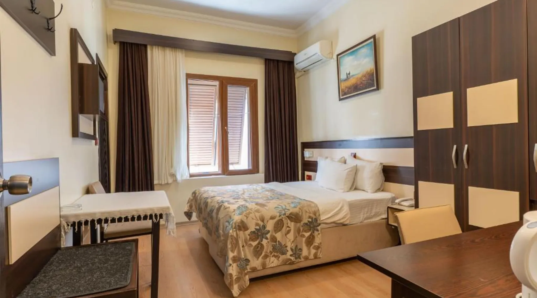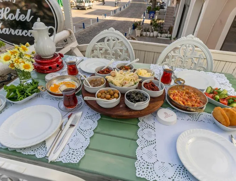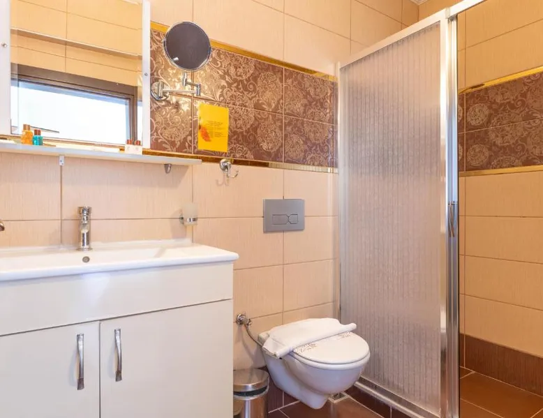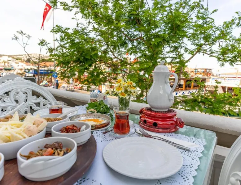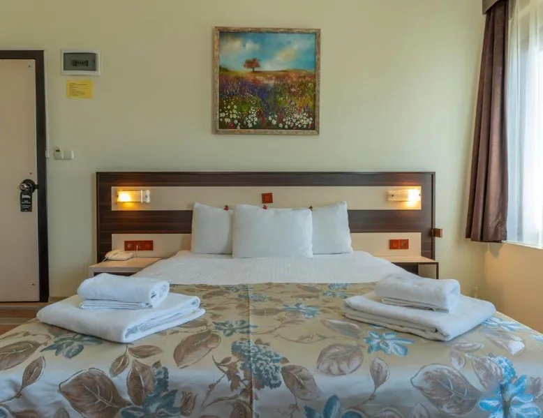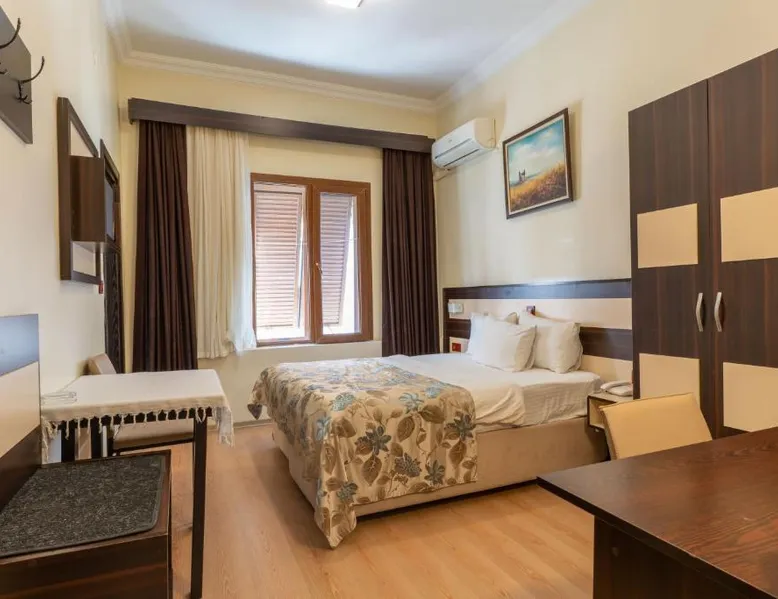 Beachfront Location: Hotel Karacam in Foca offers direct beachfront access, a lush garden, and a spacious terrace. Guests can relax by the bar and enjoy free WiFi throughout the property. Comfortable Accommodations: Rooms feature air-conditioning, private bathrooms, sea or city views, balconies, and modern amenities such as mini-bars and flat-screen TVs. Family rooms and sofa beds cater to all travelers. Dining Options: Breakfast includes continental, buffet, à la carte, vegetarian, and halal options with local specialties, warm dishes, fresh pastries, cheese, and fruits. The on-site coffee shop serves a variety of beverages. Convenient Services: The hotel provides a paid shuttle service, lounge, 24-hour front desk, concierge, housekeeping, room service, bike hire, and luggage storage. Free private parking is available. Izmir Adnan Menderes Airport is 58 mi away. This room has a balcony with sea view.