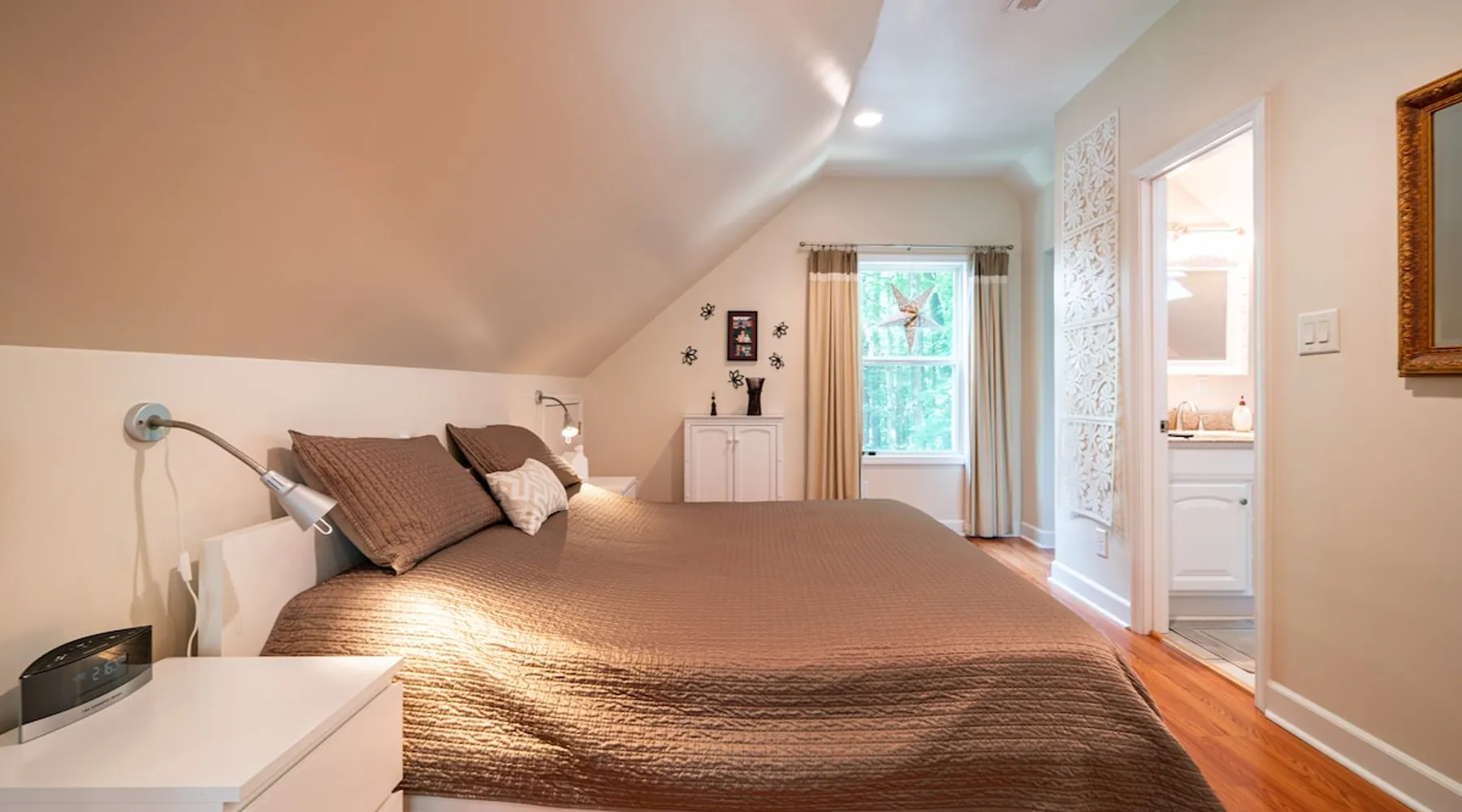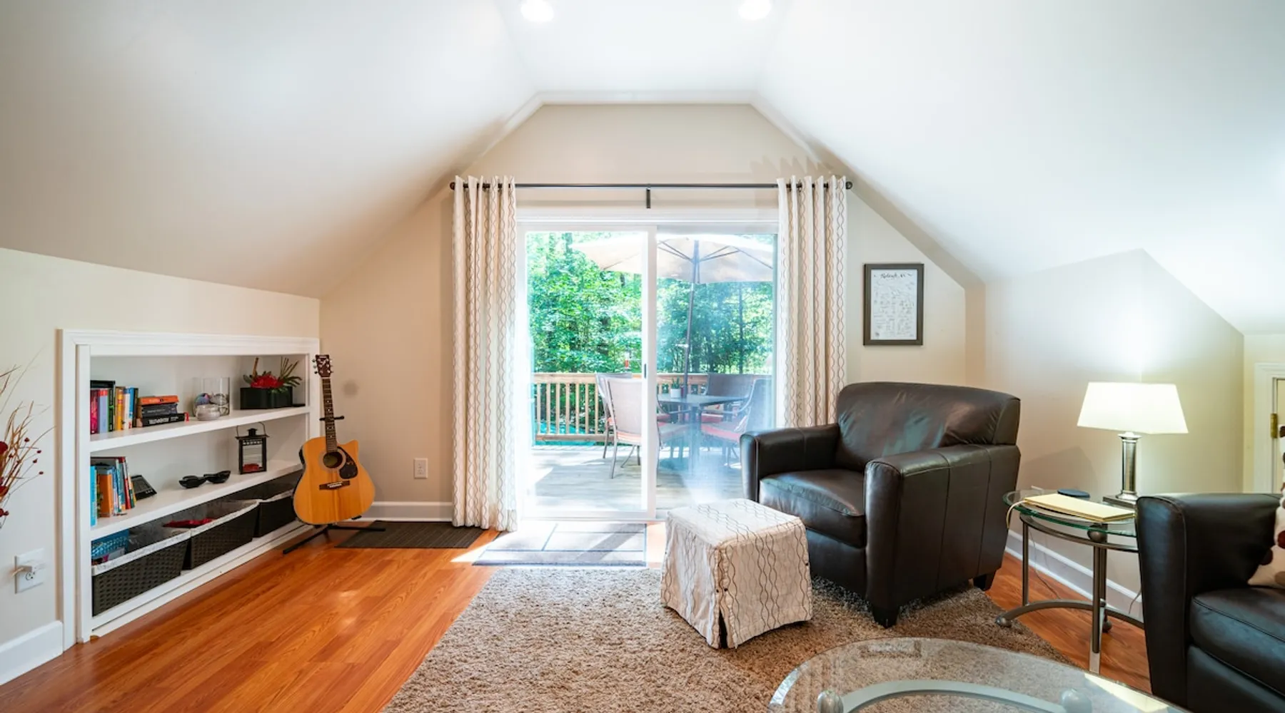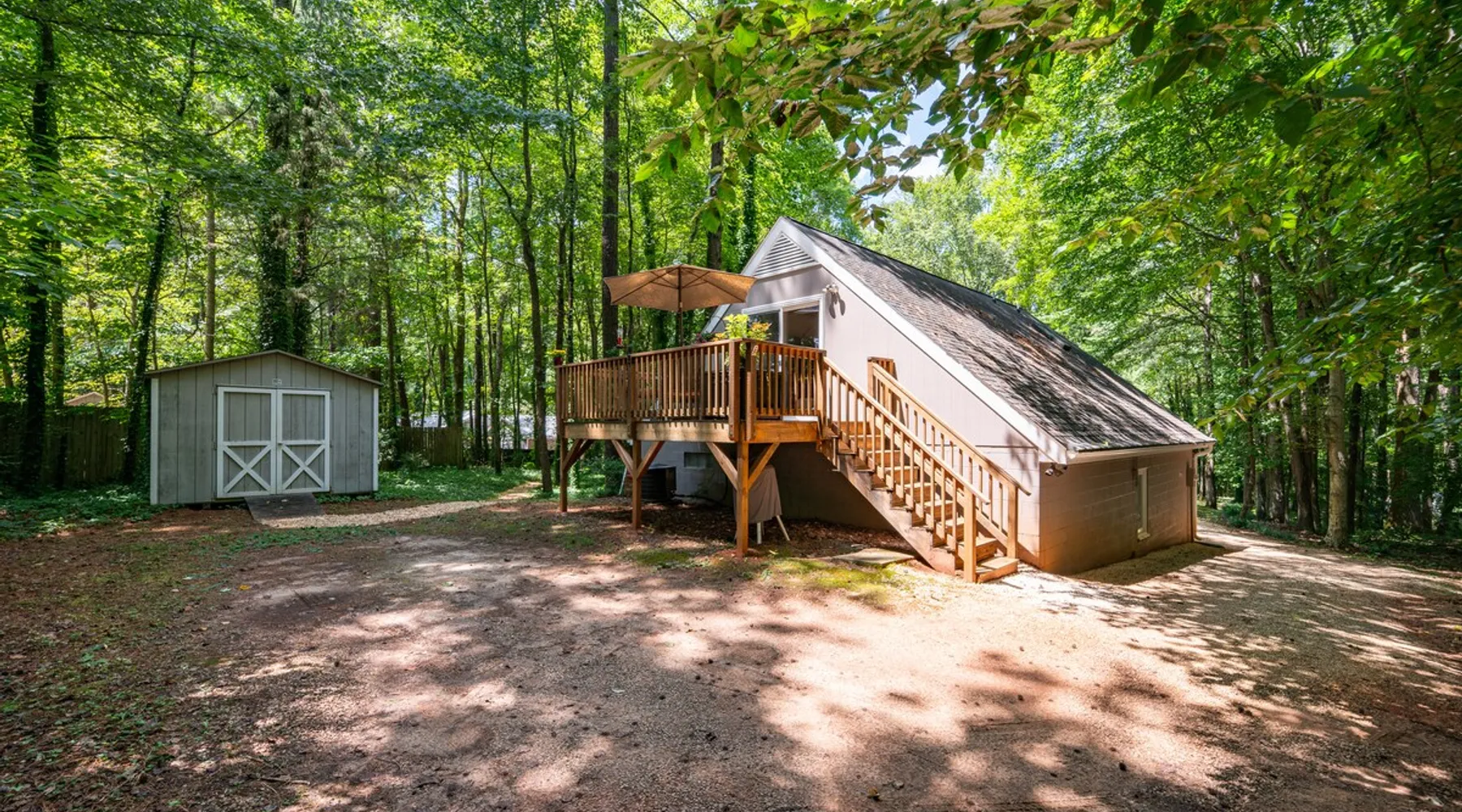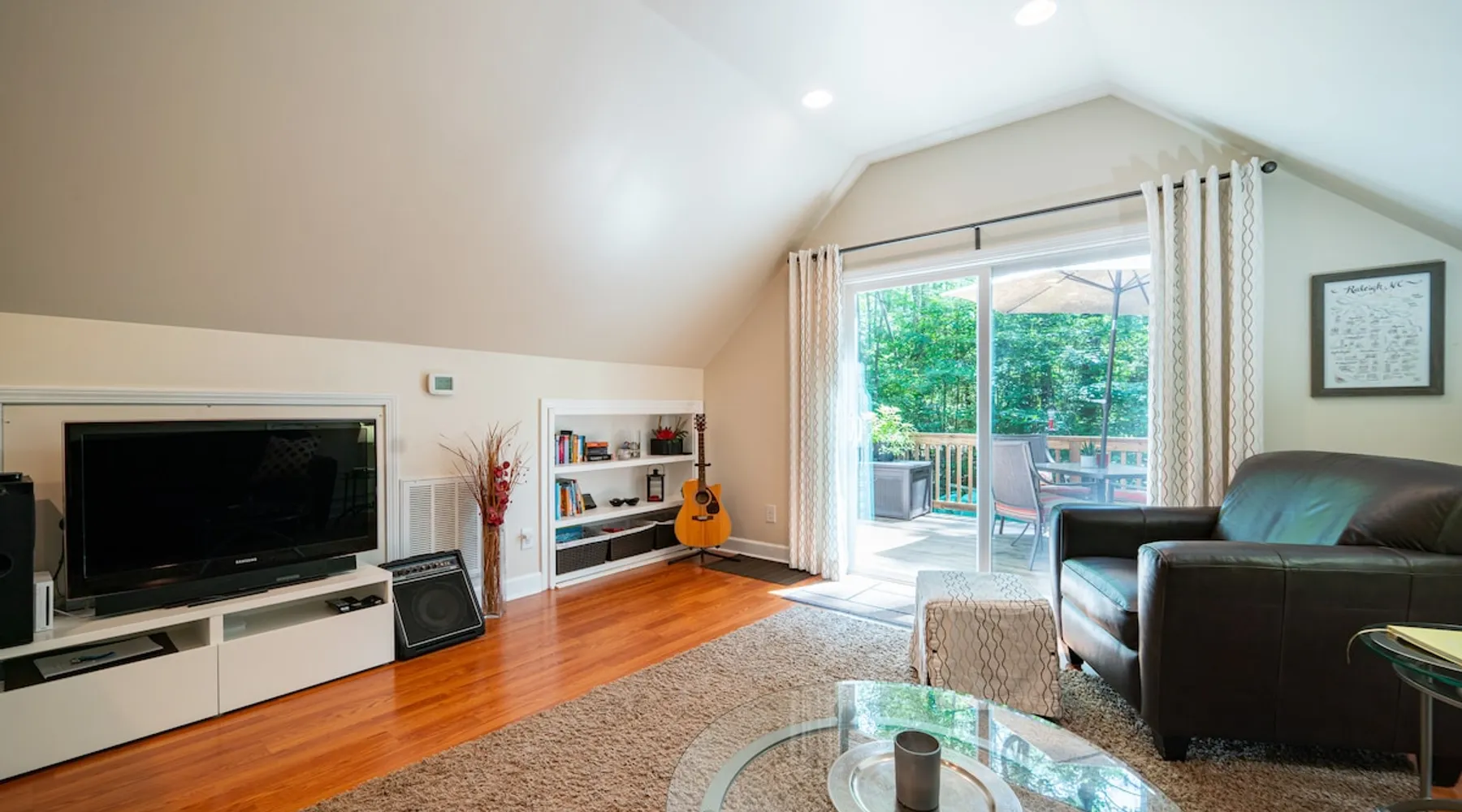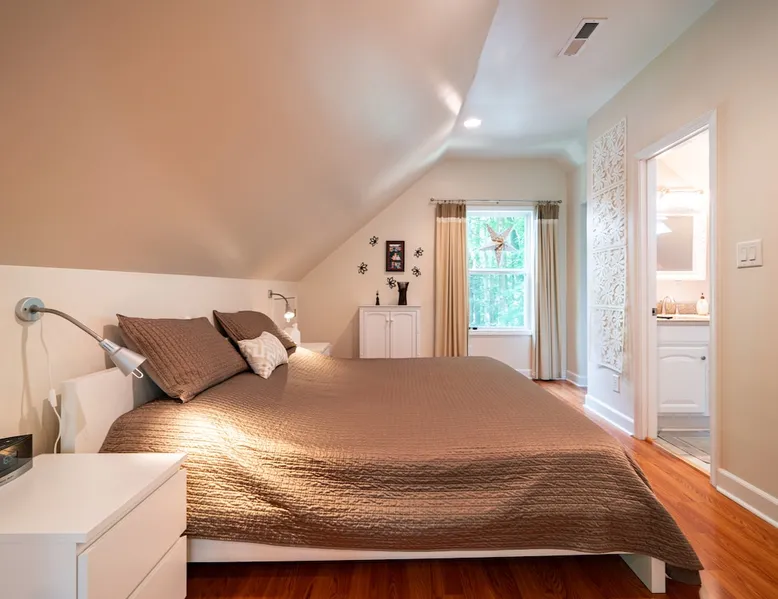 Contemporary guesthouse in quiet residential area with large private deck on wooded lot. Conveniently located to I-540, the airport, RTP and Brier Creek shopping and restaurants. Just outside of Raleigh city limits, but a close drive to everything. King sized bed, spacious shower bath, fully equipped kitchen, dining area and living area - all in a airy and bright loft. Free wi-fi. Large TV with Roku. No parties and no events please. No smoking, no pets. The space Guest suite above detached garage facing away from the main house. Private deck on wooded lot. Guest access You have use of the loft apartment, which includes a living area, dining area, kitchen, sleeping area with king size bed, walk-in closet, shower bath and a deck. You can park next to or behind the garage. If traveling with children, feel free to use the play structure or trampoline at your own risk. Other things to note Please park next to the garage and don't block the garage doors. Please drive cautiously on our driveway, as we have a child and a dog.