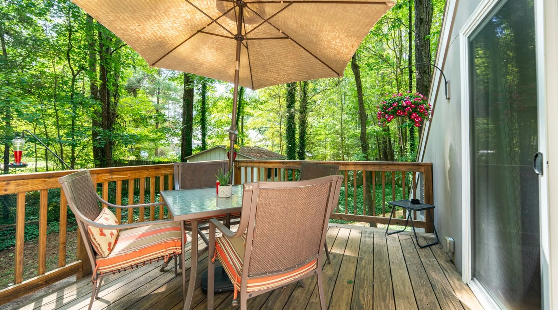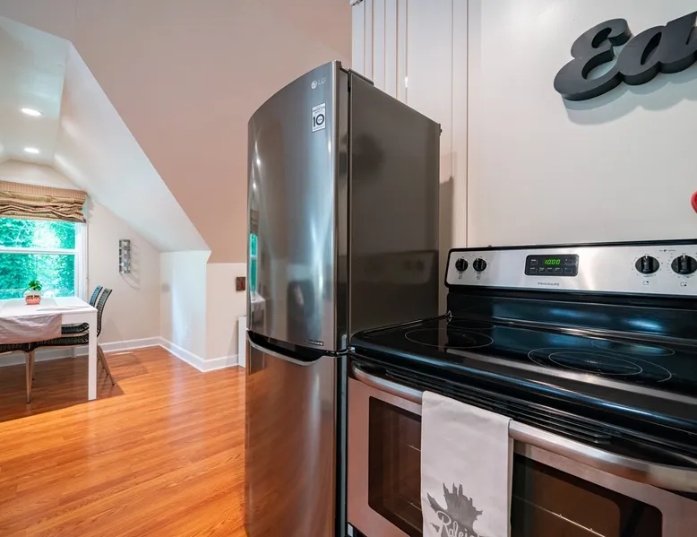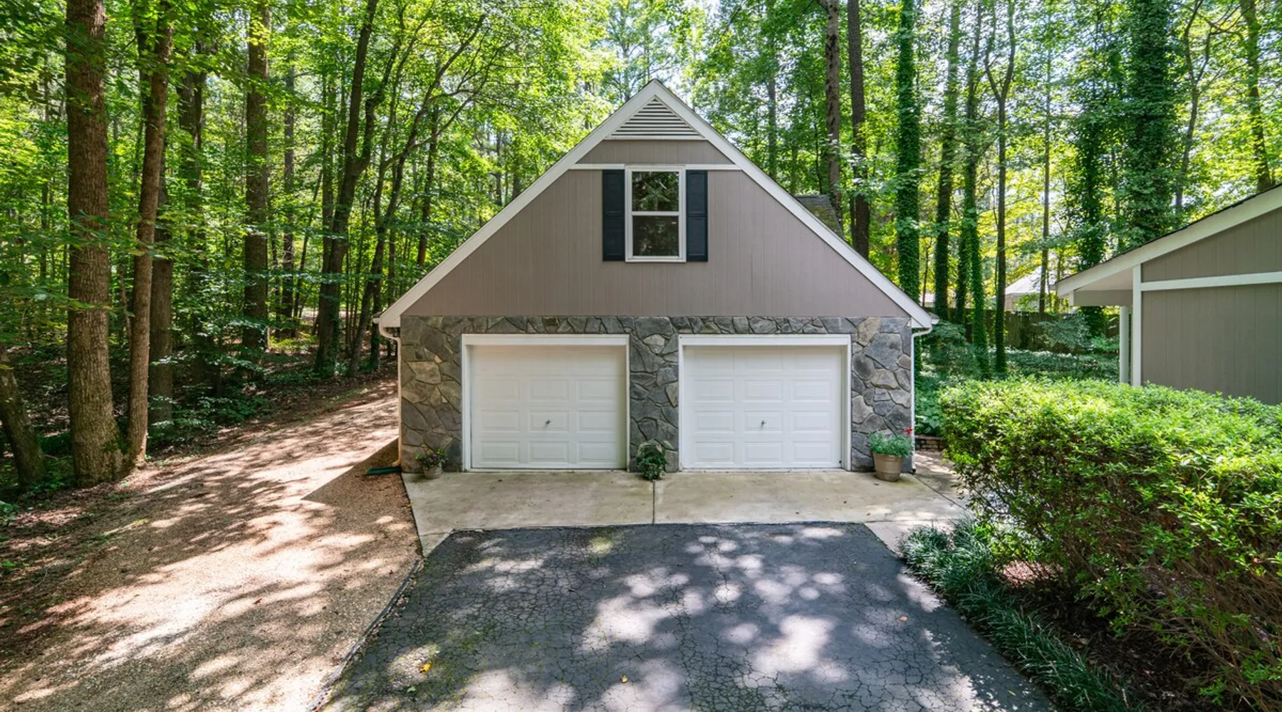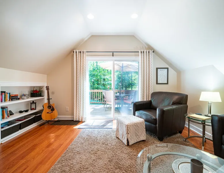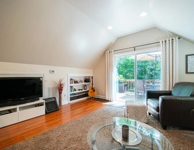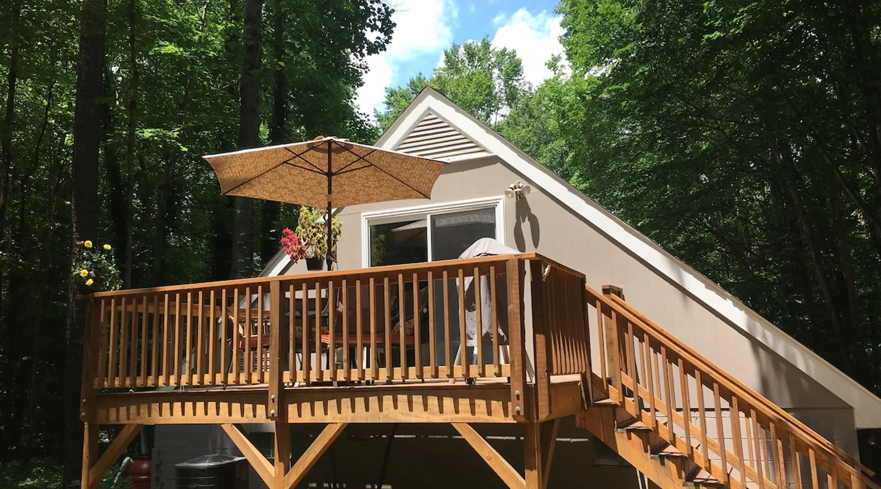Contemporary guesthouse in quiet residential area with large private deck on wooded lot. Conveniently located to I-540, the airport, RTP and Brier Creek shopping and restaurants. Just outside of Raleigh city limits, but a close drive to everything. King sized bed, spacious shower bath, fully equipped kitchen, dining area and living area - all in a airy and bright loft. Free wi-fi. Large TV with Roku. No parties and no events please. No smoking, no pets. The space Guest suite above detached garage facing away from the main house. Private deck on wooded lot. Guest access You have use of the loft apartment, which includes a living area, dining area, kitchen, sleeping area with king size bed, walk-in closet, shower bath and a deck. You can park next to or behind the garage. If traveling with children, feel free to use the play structure or trampoline at your own risk. Other things to note Please park next to the garage and don't block the garage doors. Please drive cautiously on our driveway, as we have a child and a dog.