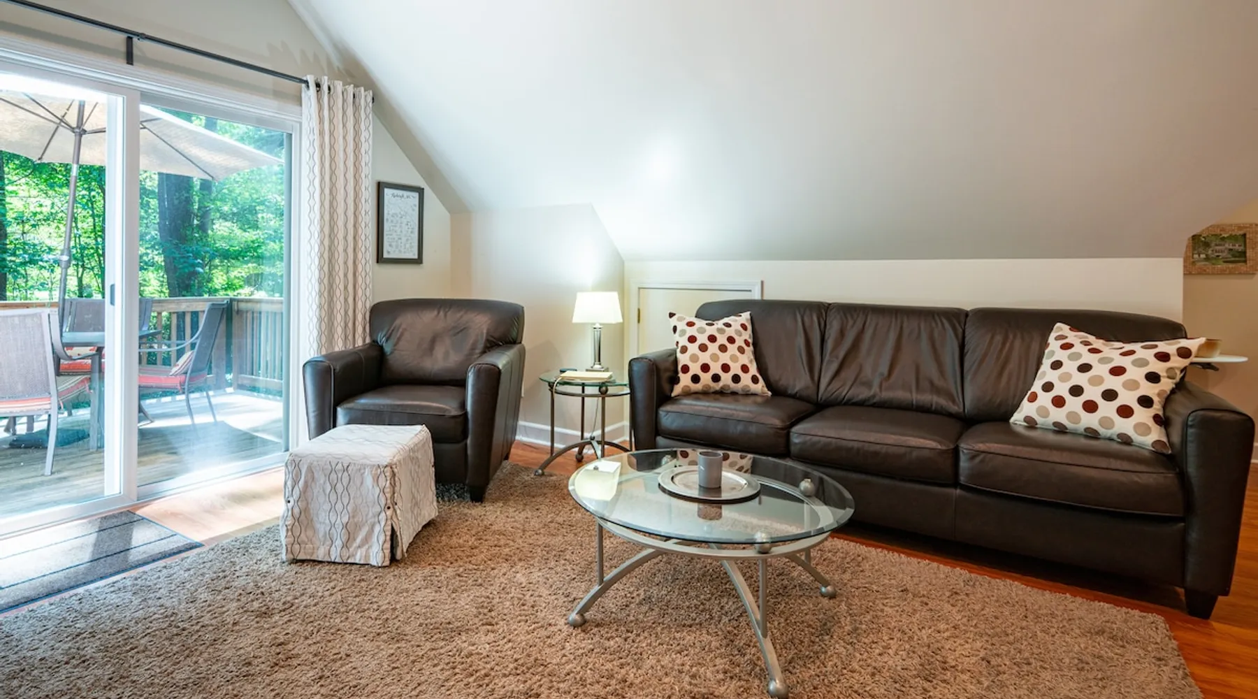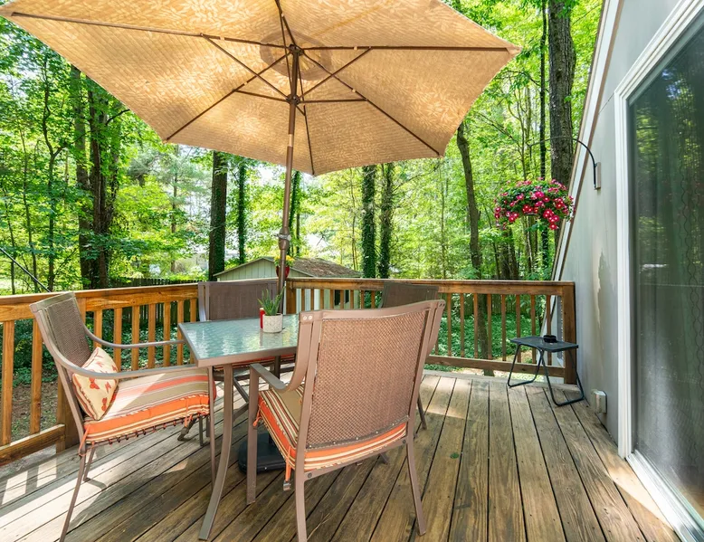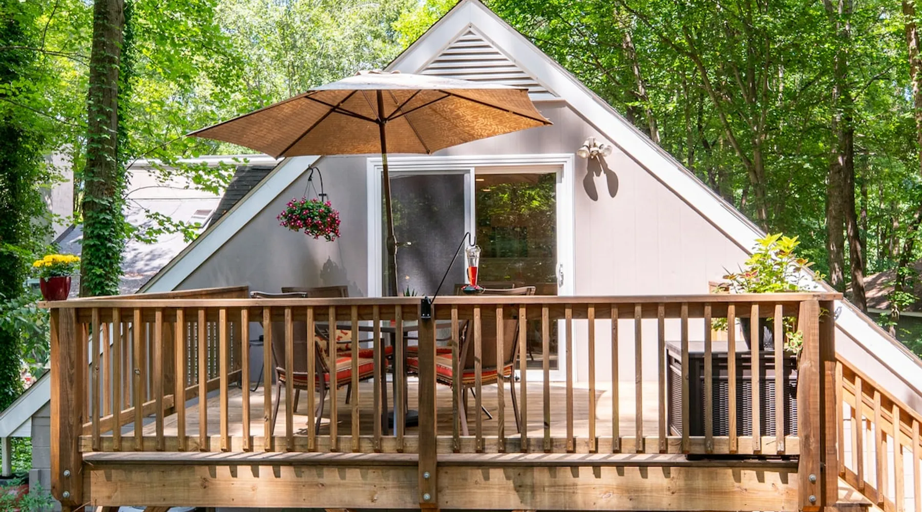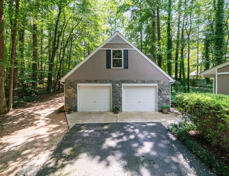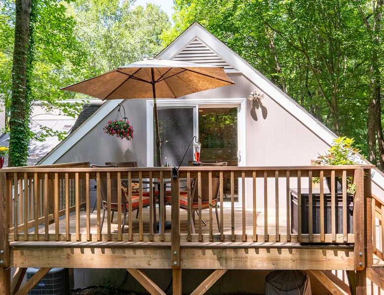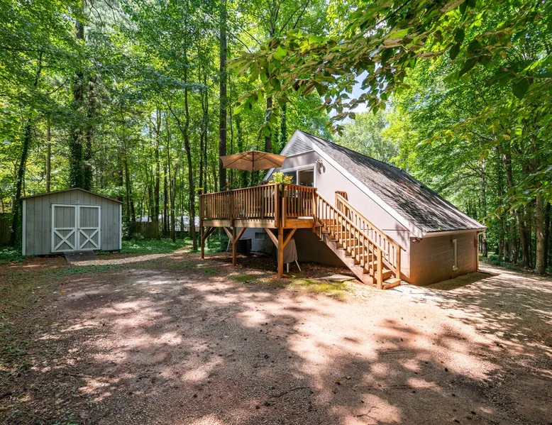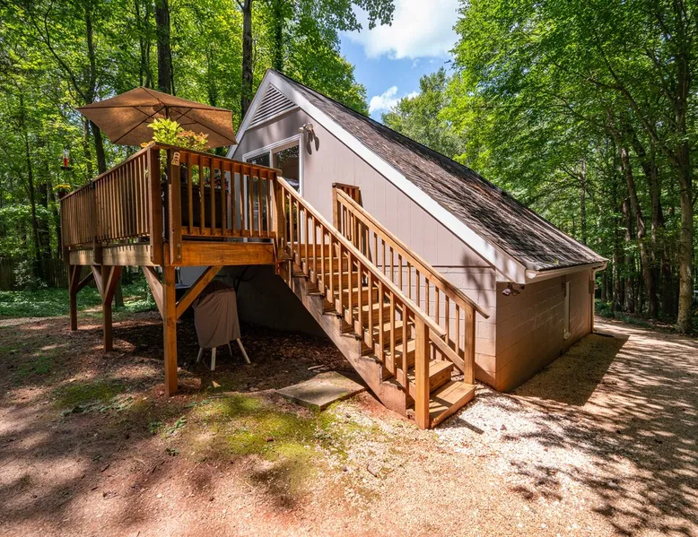 Contemporary guesthouse in quiet residential area with large private deck on wooded lot. Conveniently located to I-540, the airport, RTP and Brier Creek shopping and restaurants. Just outside of Raleigh city limits, but a close drive to everything. King sized bed, spacious shower bath, fully equipped kitchen, dining area and living area - all in a airy and bright loft. Free wi-fi. Large TV with Roku. No parties and no events please. No smoking, no pets. The space Guest suite above detached garage facing away from the main house. Private deck on wooded lot. Guest access You have use of the loft apartment, which includes a living area, dining area, kitchen, sleeping area with king size bed, walk-in closet, shower bath and a deck. You can park next to or behind the garage. If traveling with children, feel free to use the play structure or trampoline at your own risk. Other things to note Please park next to the garage and don't block the garage doors. Please drive cautiously on our driveway, as we have a child and a dog.