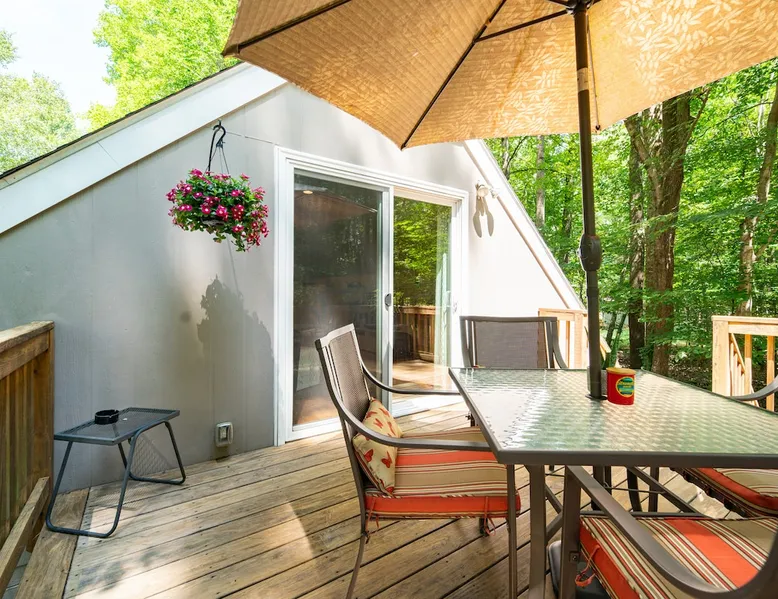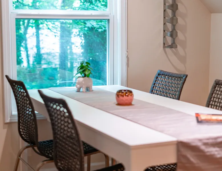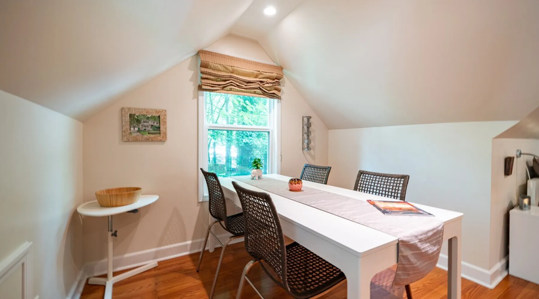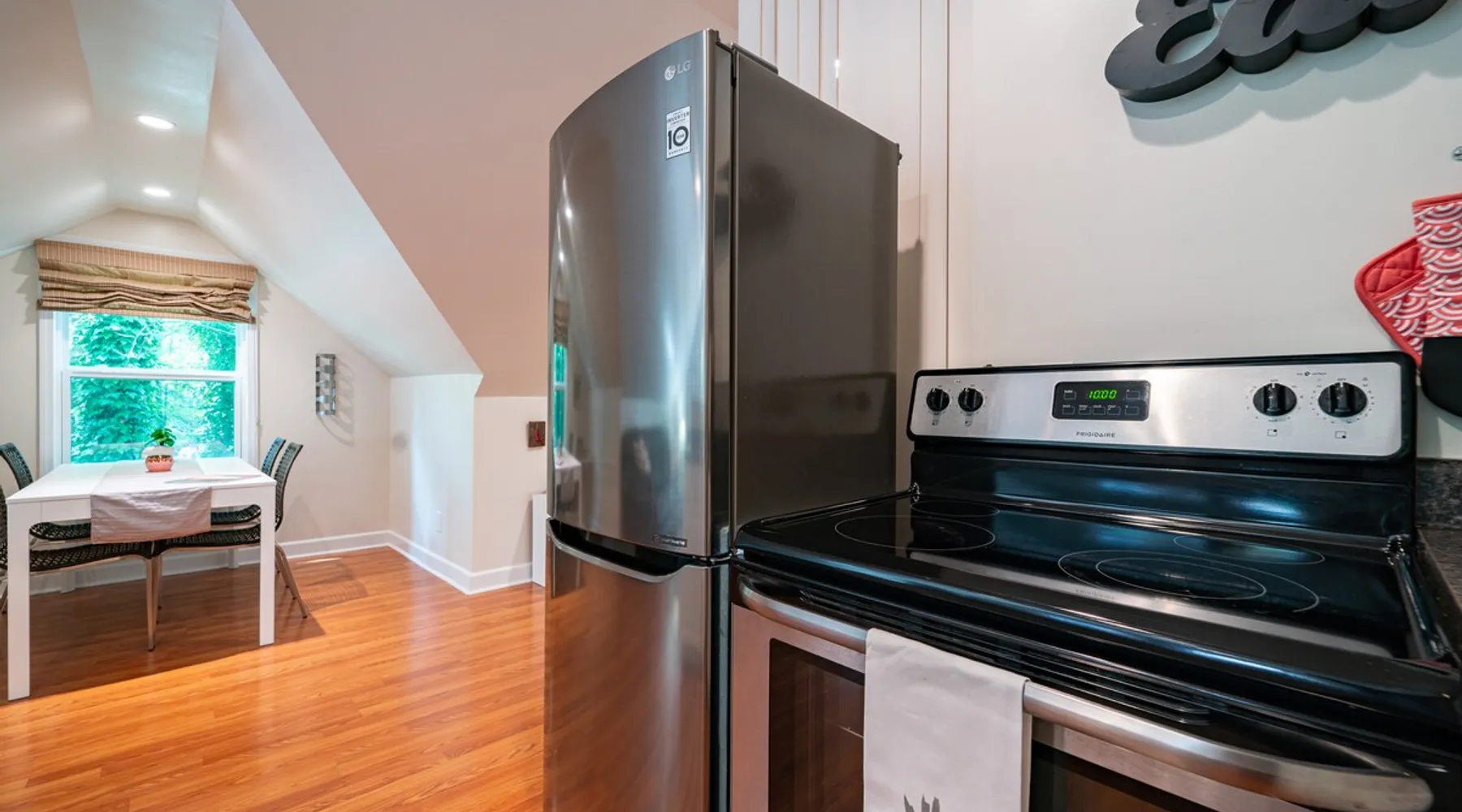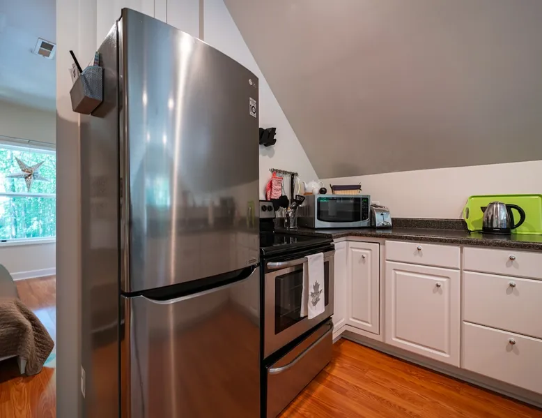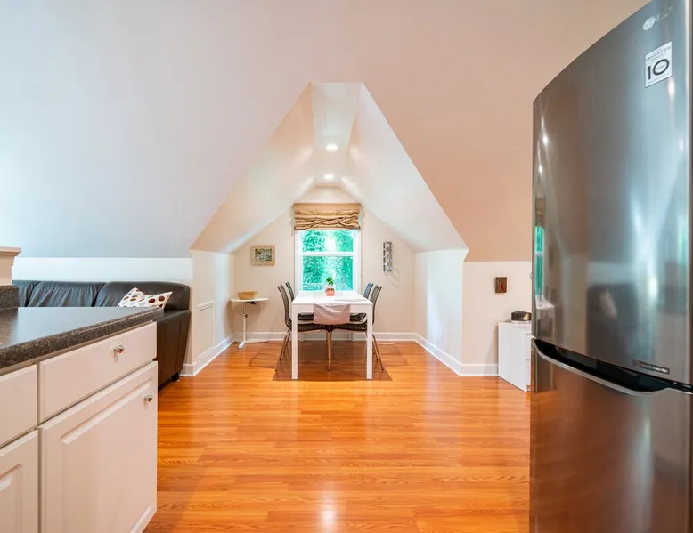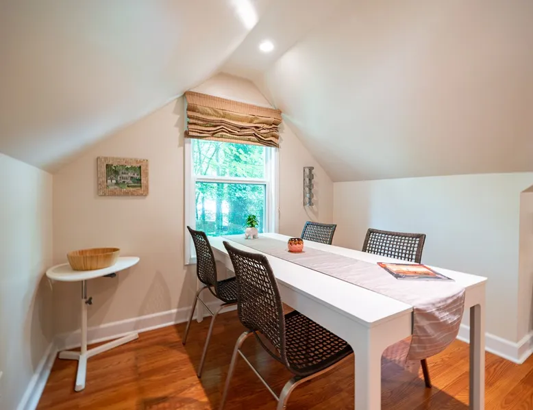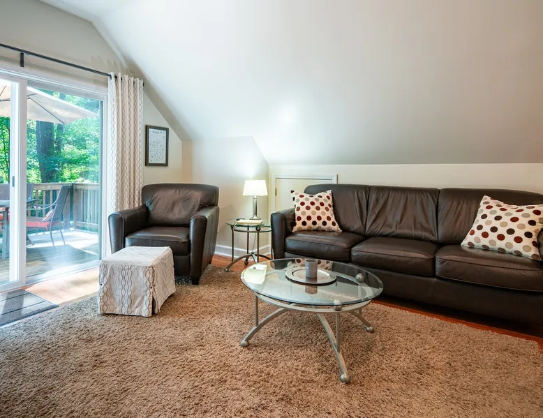 Contemporary guesthouse in quiet residential area with large private deck on wooded lot. Conveniently located to I-540, the airport, RTP and Brier Creek shopping and restaurants. Just outside of Raleigh city limits, but a close drive to everything. King sized bed, spacious shower bath, fully equipped kitchen, dining area and living area - all in a airy and bright loft. Free wi-fi. Large TV with Roku. No parties and no events please. No smoking, no pets. The space Guest suite above detached garage facing away from the main house. Private deck on wooded lot. Guest access You have use of the loft apartment, which includes a living area, dining area, kitchen, sleeping area with king size bed, walk-in closet, shower bath and a deck. You can park next to or behind the garage. If traveling with children, feel free to use the play structure or trampoline at your own risk. Other things to note Please park next to the garage and don't block the garage doors. Please drive cautiously on our driveway, as we have a child and a dog.