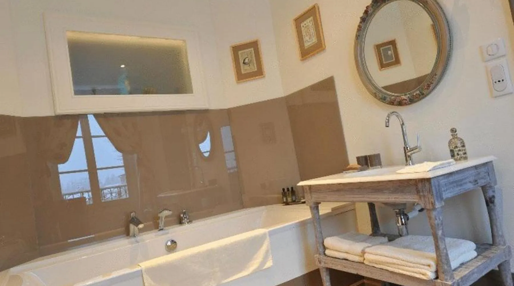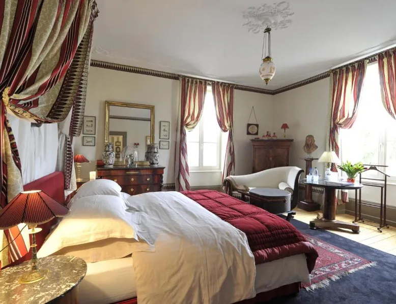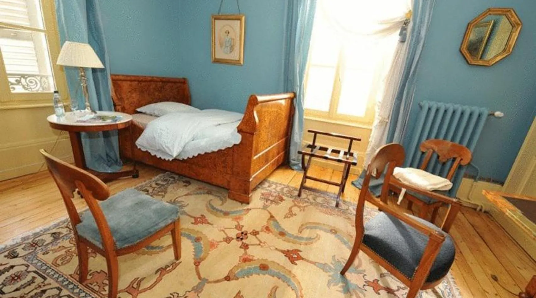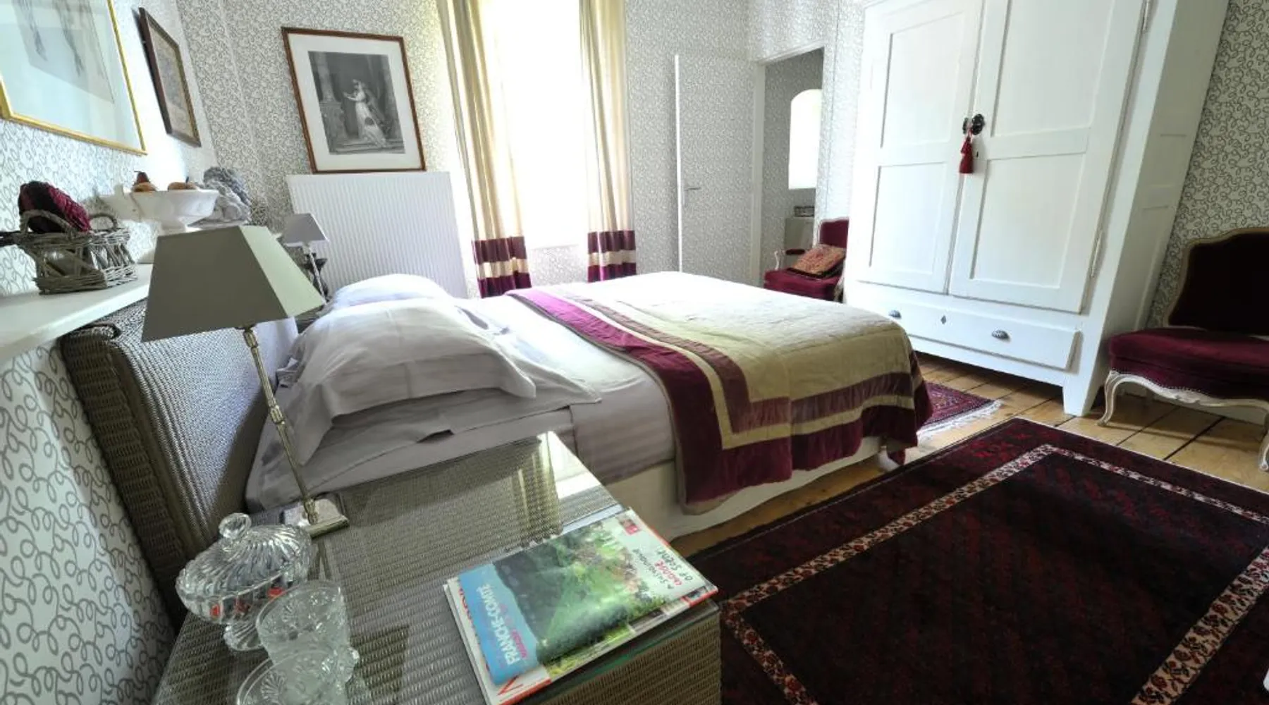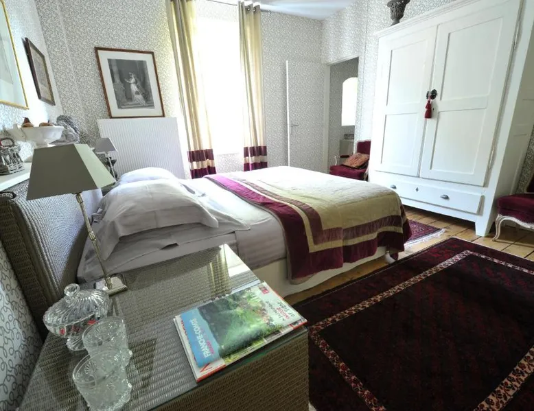 Historic Charm: La Maison D'hôtes du Parc in Ronchamp offers a unique stay within a historic building. Guests enjoy garden views and a sun terrace, complemented by free WiFi throughout the property. Comfortable Accommodations: The bed and breakfast features family rooms with private bathrooms, balconies, and parquet floors. Additional amenities include bathrobes, soundproofing, and a work desk, ensuring a relaxing and productive stay. Delicious Breakfast: A continental buffet breakfast is served daily, including local specialties, fresh pastries, pancakes, cheese, fruits, and juice. Vegetarian and gluten-free options are available, catering to diverse dietary needs. Activities and Attractions: Guests can participate in walking and bike tours, exploring nearby attractions such as Montbeliard Castle (20 mi) and the Museum of Modern Art of Belfort (13 mi). EuroAirport Mulhouse is 55 mi away, providing convenient travel options. Antique furniture and a view of the garden feature in this room. The bathroom has a massaging-jet shower.