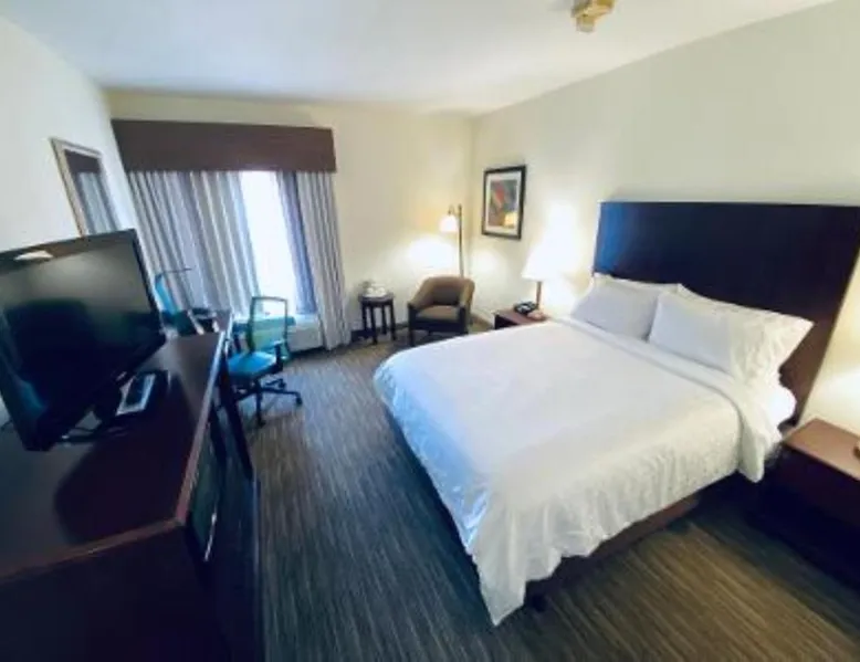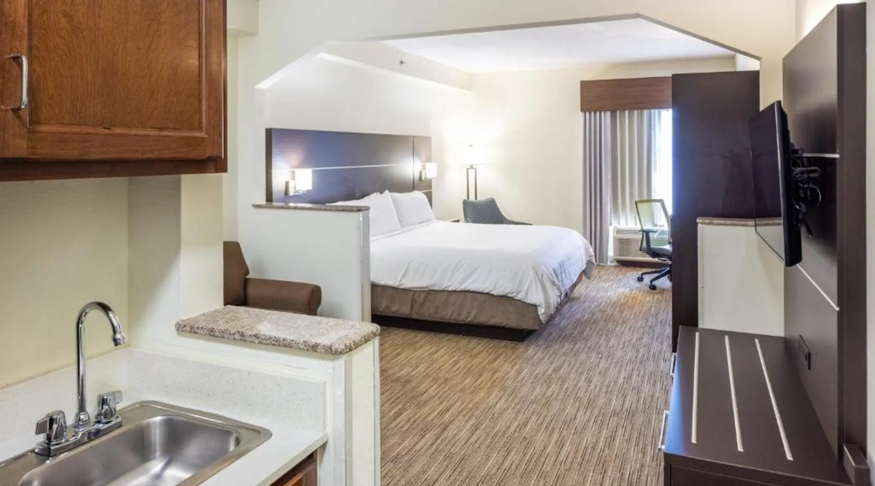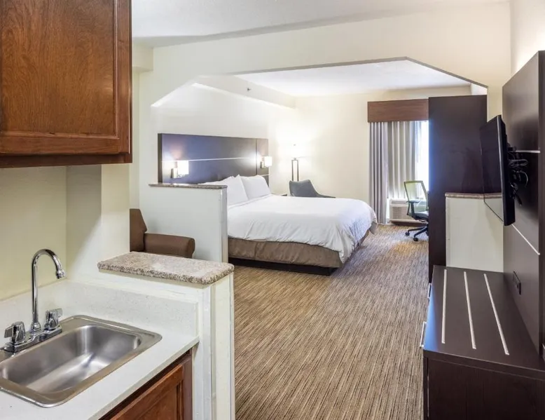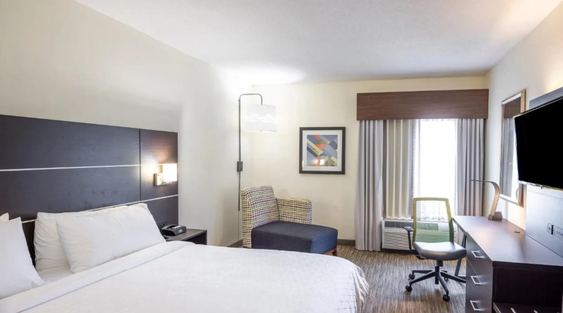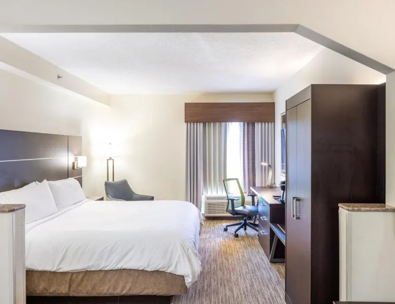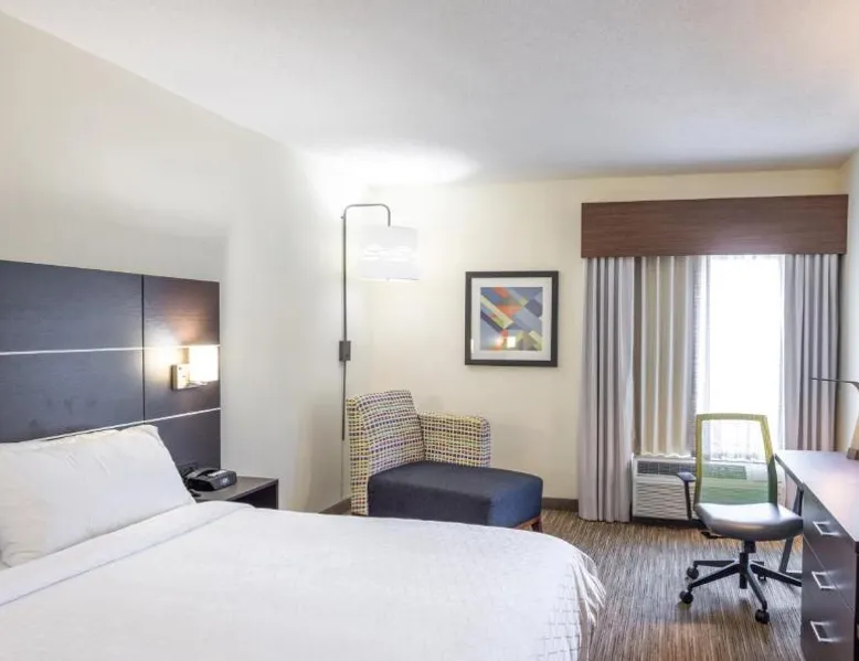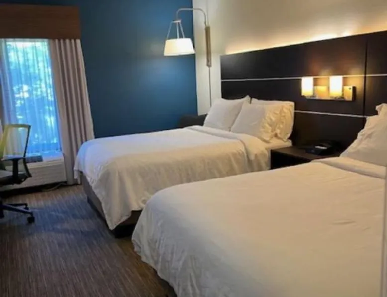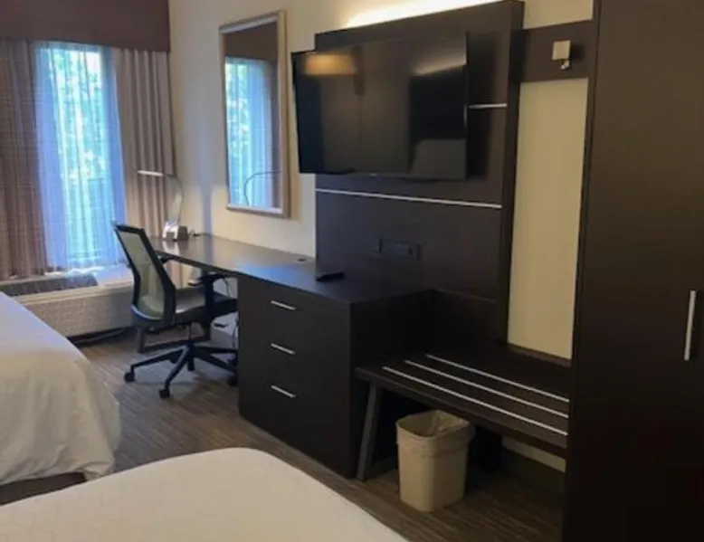 Comfortable Accommodations: Holiday Inn Express Hotel & Suites Fort Payne by IHG in Fort Payne offers rooms with air-conditioning, private bathrooms, and modern amenities. Guests appreciate the room cleanliness and comfort. Leisure Facilities: The hotel features a fitness center, seasonal outdoor swimming pool, and free WiFi. Additional facilities include a lounge, fitness room, elevator, 24-hour front desk, minimarket, business area, outdoor seating area, and luggage storage. Dining Options: A complimentary American buffet breakfast is served daily, including warm dishes, juice, fresh pastries, pancakes, cheese, fruits, and more. Location and Access: Located 61 mi from Chattanooga Metropolitan Airport, the hotel provides free on-site parking. Highly rated for its excellent service and comfortable accommodations. This room features a 50" satellite Smart TV and coffee-making facilities.