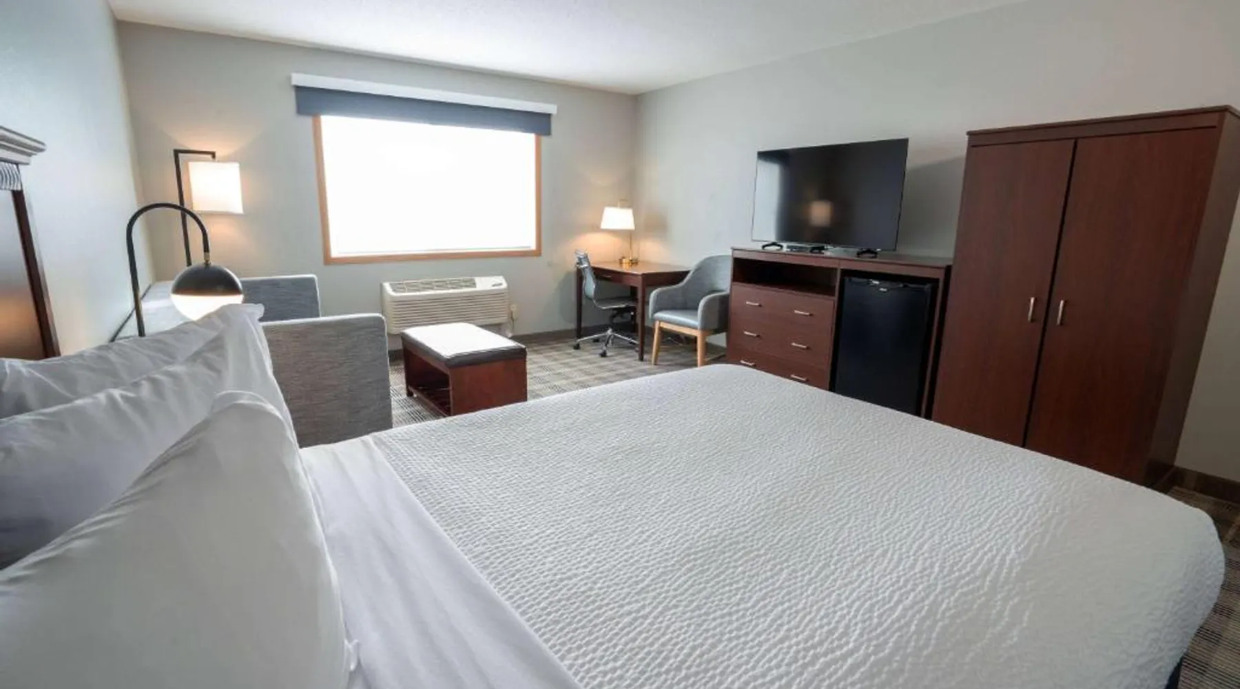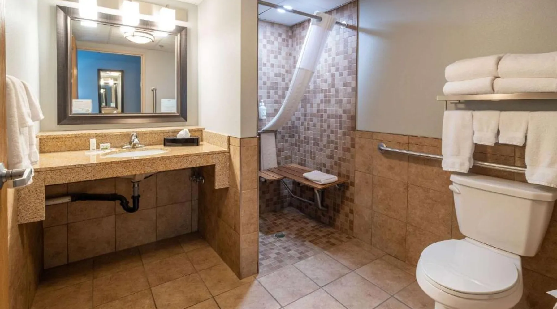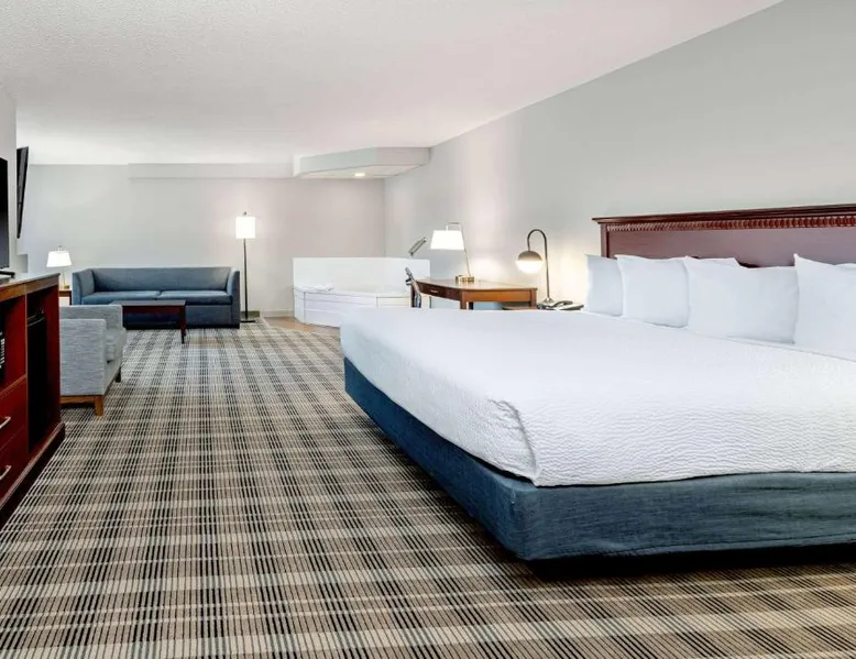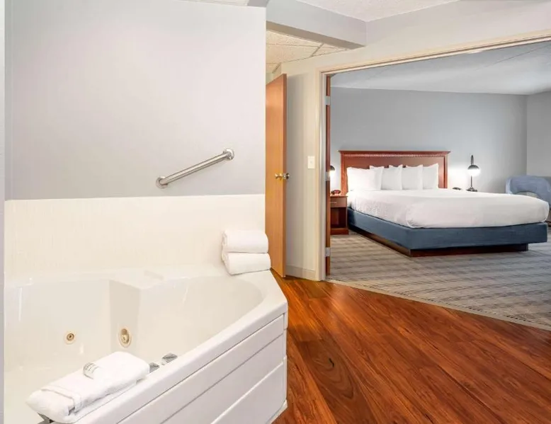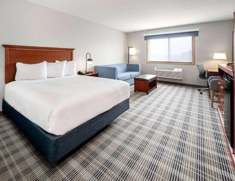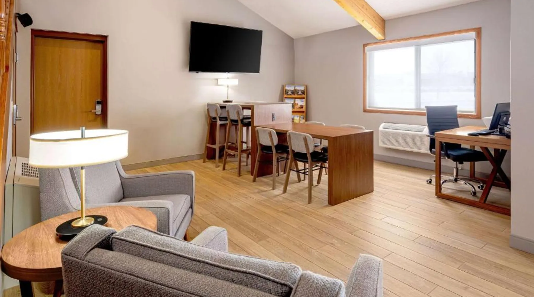 Comfortable Accommodations: AmericInn by Wyndham Valley City Conference Center in Valley City offers family rooms with air-conditioning, private bathrooms, and modern amenities. Each room includes a work desk, free toiletries, and a TV. Exceptional Facilities: Guests can enjoy a sauna, fitness center, indoor swimming pool, and free WiFi. Additional facilities include a hot tub, outdoor fireplace, and a lounge. Dining Experience: The modern restaurant serves American cuisine with vegetarian and gluten-free options. Breakfast includes warm dishes, fresh pastries, and a variety of beverages. Convenient Location: Located 34 mi from Jamestown Regional Airport, the hotel provides free on-site private parking. Nearby attractions include the Valley City Museum and the North Dakota State Fairgrounds. The air-conditioned suite features 1 bedroom and 1 bathroom with a shower and a hairdryer. This wheelchair accessible suite has a tea and coffee maker, a seating area with a flat-screen TV and a toilet with grab rails. The unit offers 1 bed.