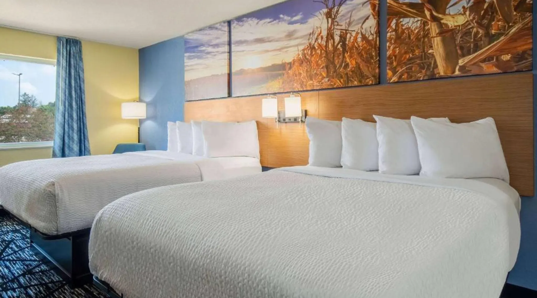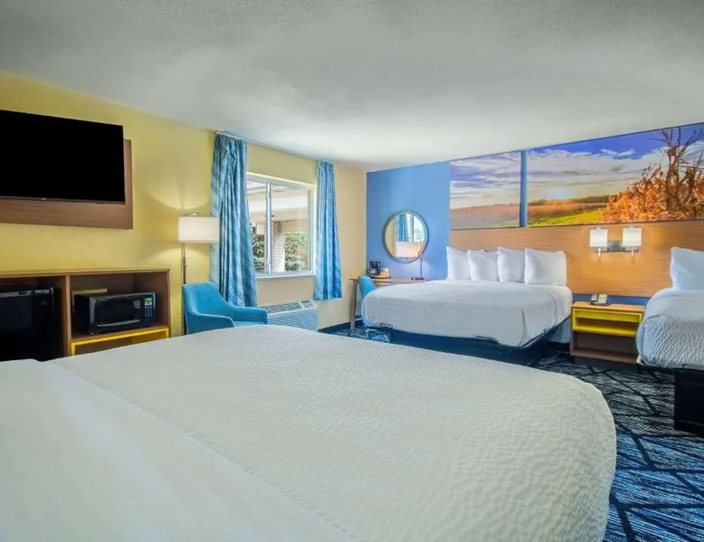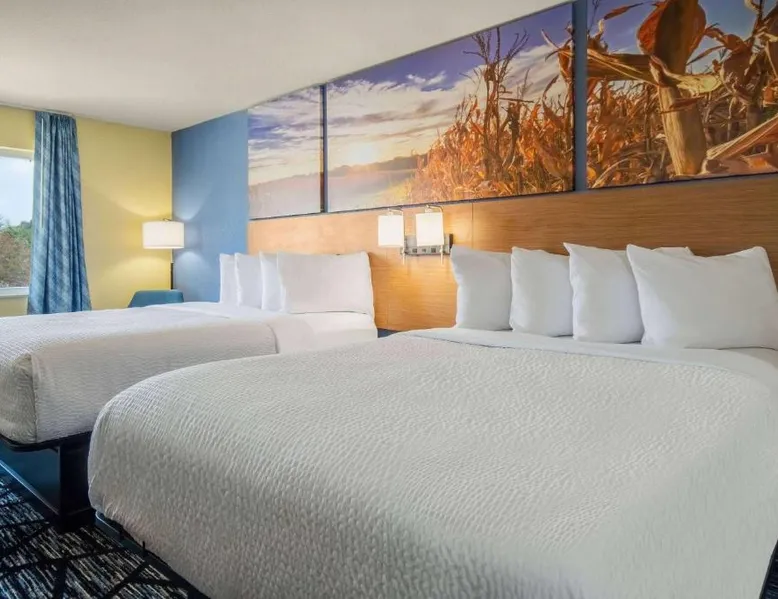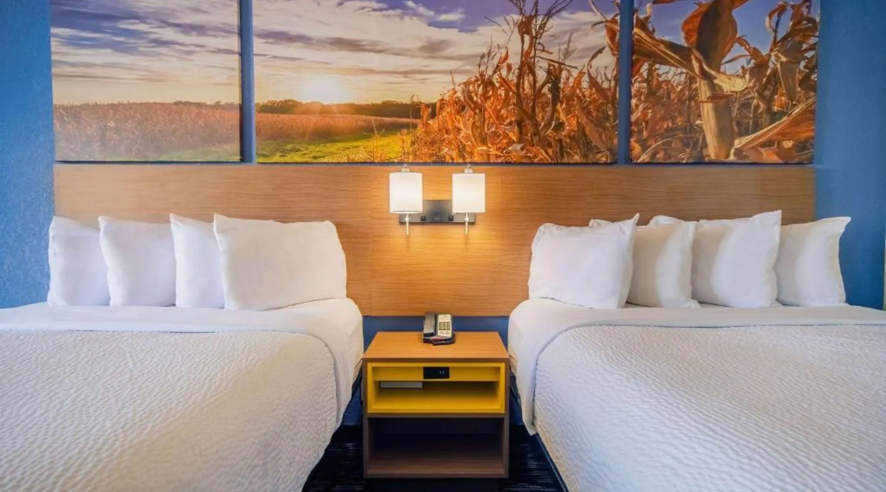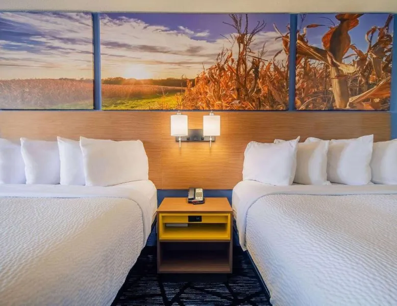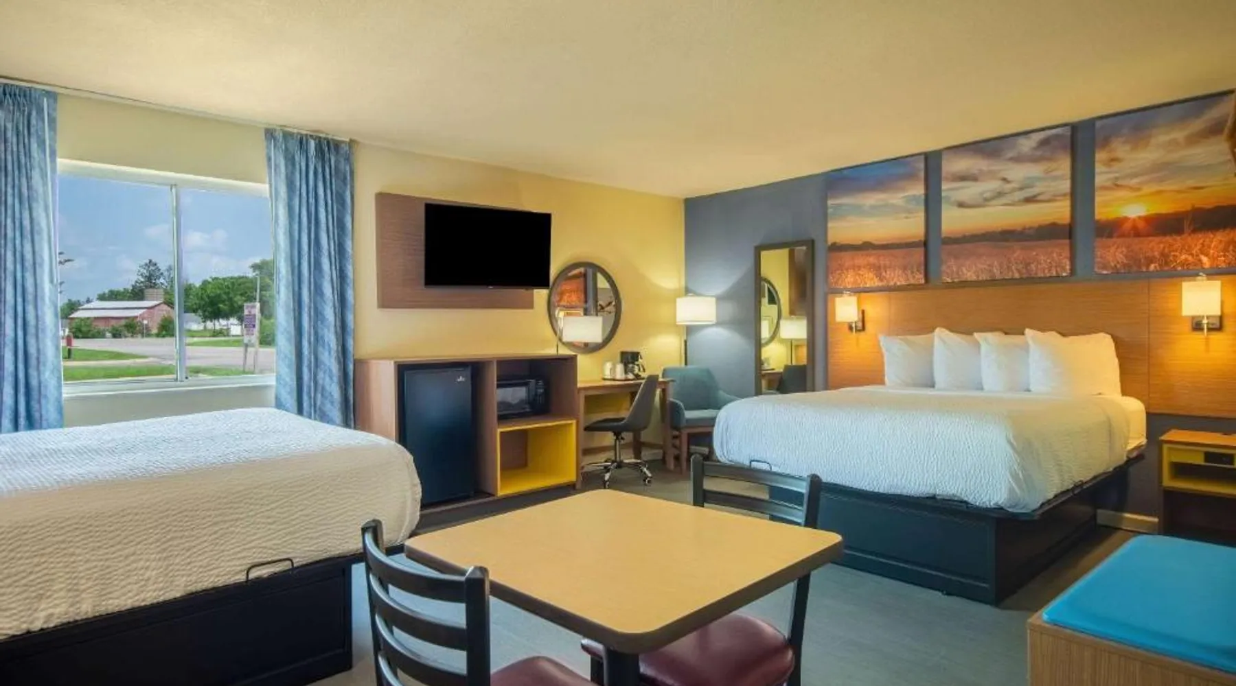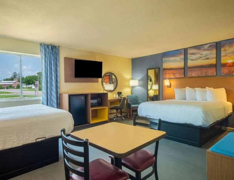 Comfortable Accommodations: Rooms feature air-conditioning, private bathrooms, hairdryers, refrigerators, microwaves, and TVs. Additional amenities include kitchenettes, baths, tea and coffee makers, work desks, and free toiletries. Facilities and Services: Guests can enjoy a fitness center and indoor swimming pool. The hotel offers a 24-hour front desk, daily housekeeping, family rooms, bicycle parking, express check-in and check-out, and luggage storage. Free on-site parking is available. Dining Options: A continental breakfast is served with juice, fresh pastries, cheese, and fruits. Location and Attractions: Located in Evansdale, the hotel is 9.9 mi from Waterloo Regional Airport and 14 mi from Gallagher Bluedorn Performing Arts Center. Guests appreciate the room cleanliness, attentive staff, and quality breakfast. This air-conditioned family room is consisted of a flat-screen TV with cable channels and a private bathroom. The unit has 2 beds.