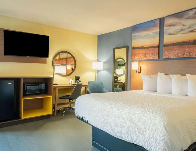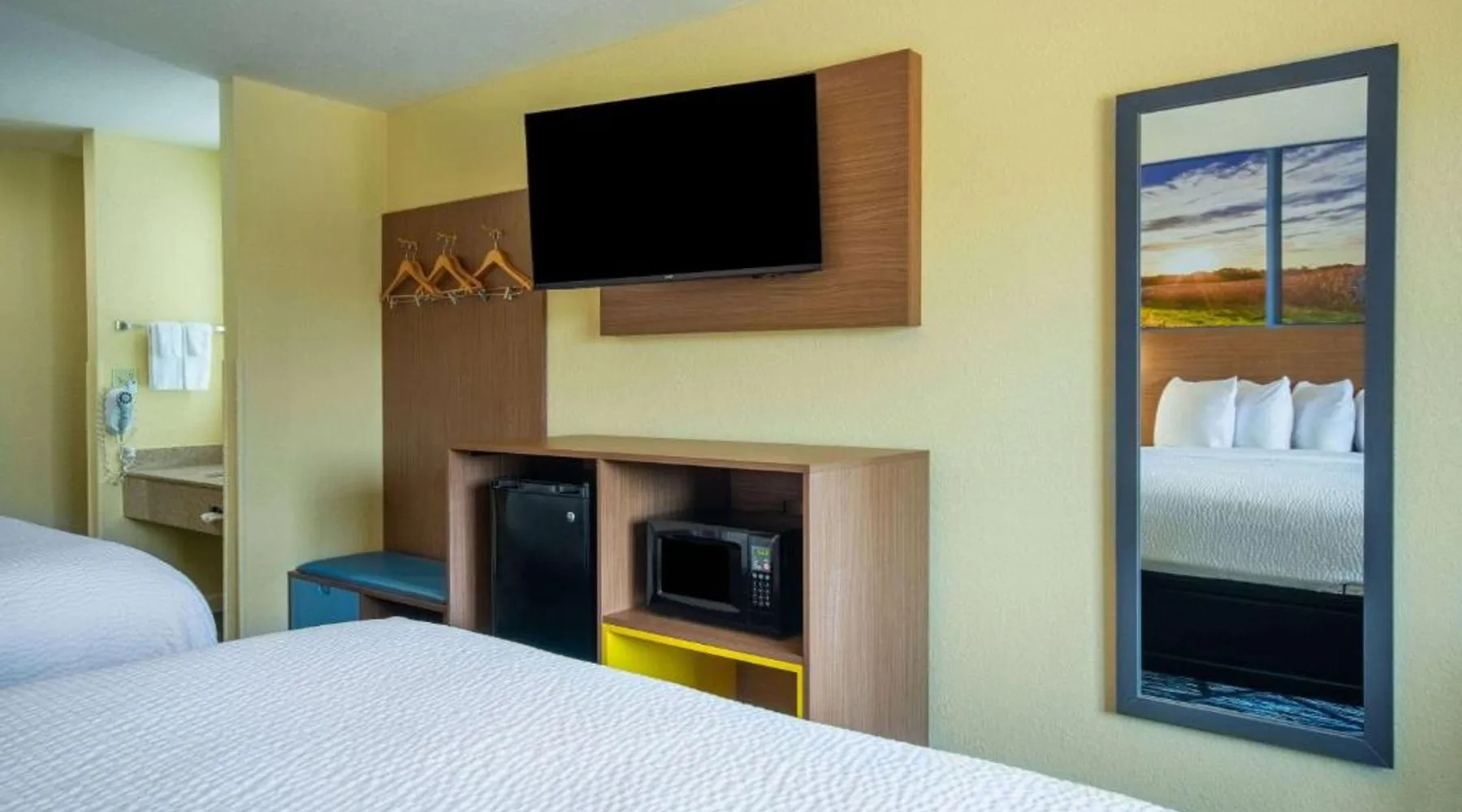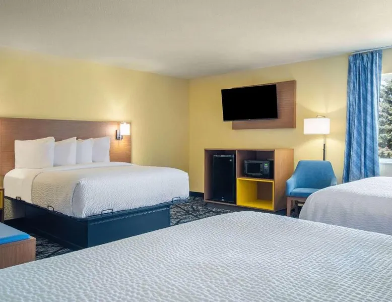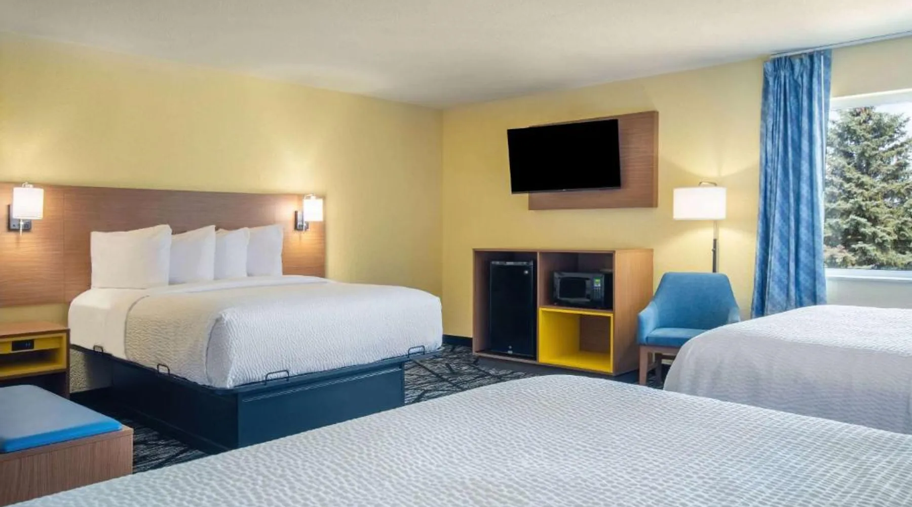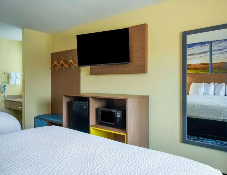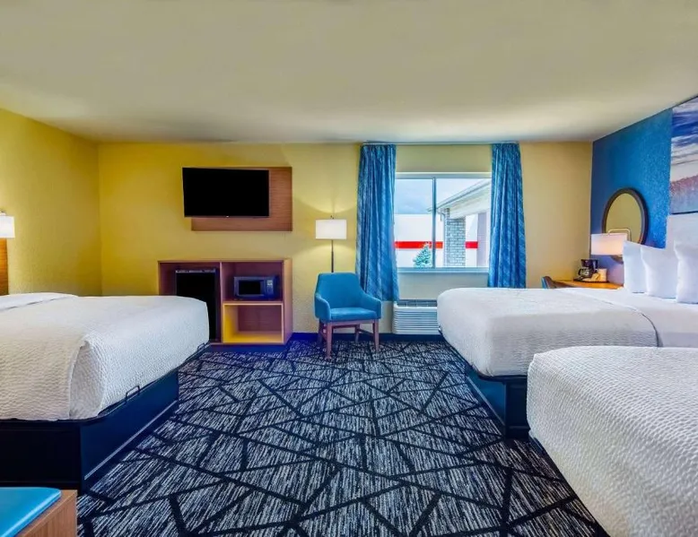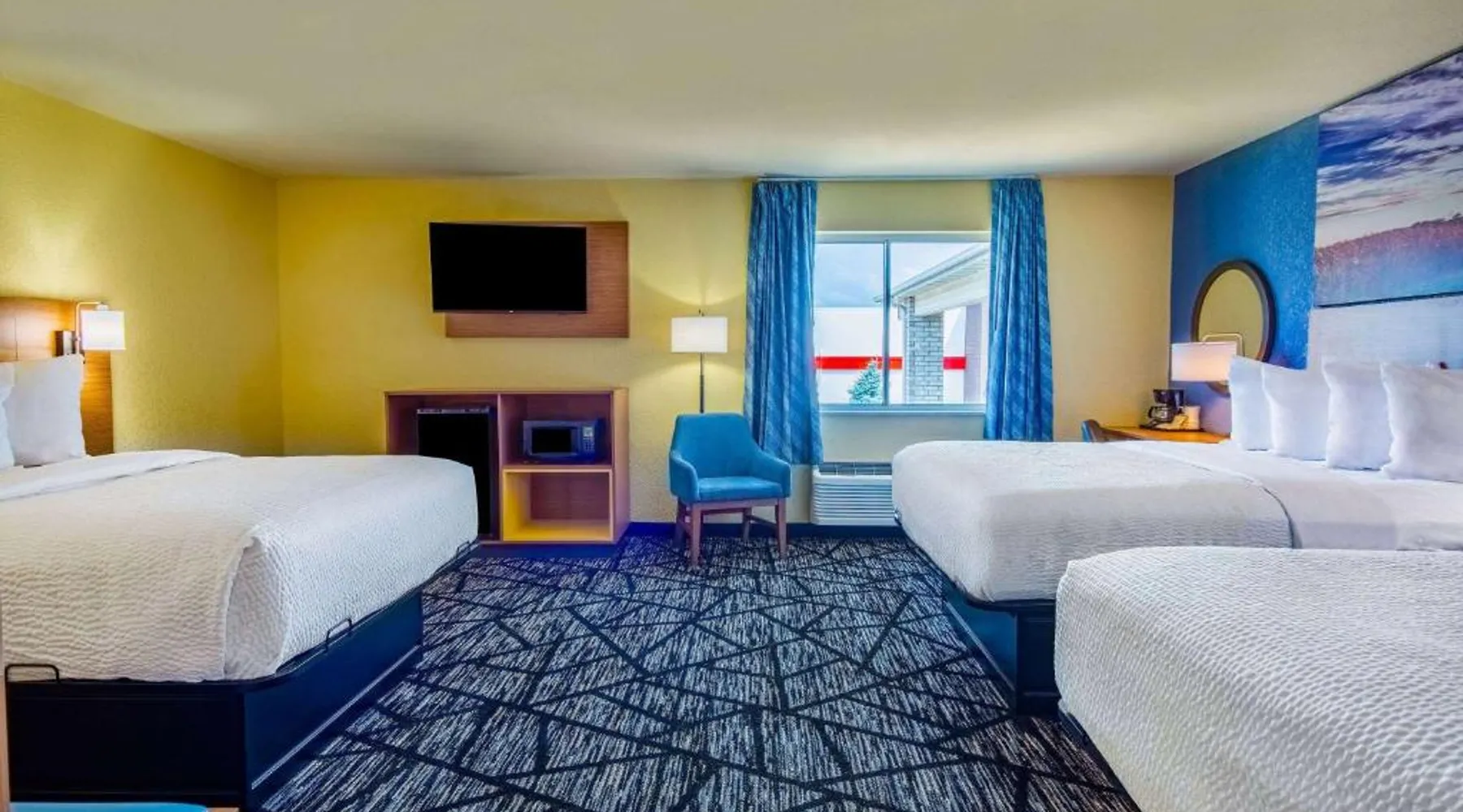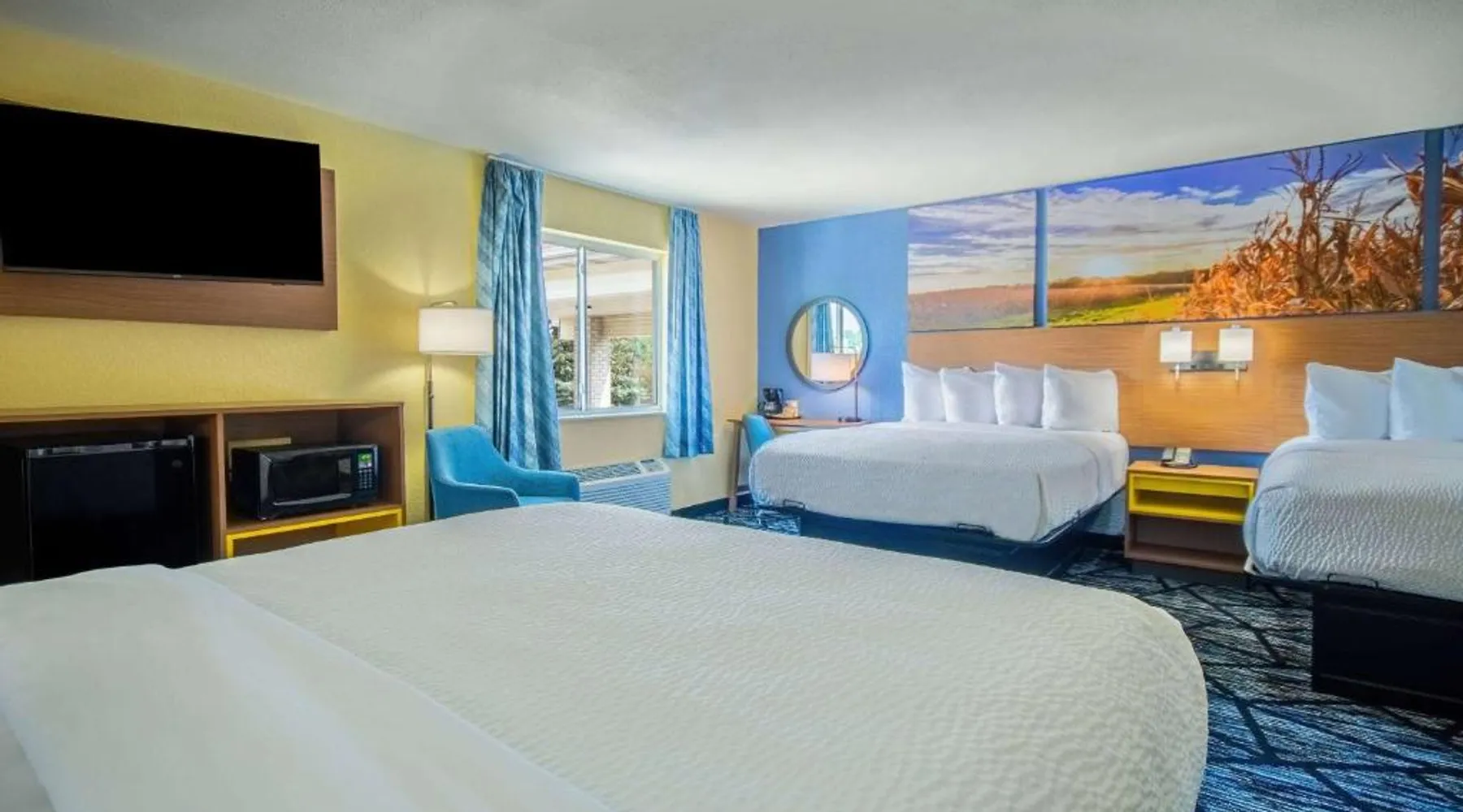 Comfortable Accommodations: Rooms feature air-conditioning, private bathrooms, hairdryers, refrigerators, microwaves, and TVs. Additional amenities include kitchenettes, baths, tea and coffee makers, work desks, and free toiletries. Facilities and Services: Guests can enjoy a fitness center and indoor swimming pool. The hotel offers a 24-hour front desk, daily housekeeping, family rooms, bicycle parking, express check-in and check-out, and luggage storage. Free on-site parking is available. Dining Options: A continental breakfast is served with juice, fresh pastries, cheese, and fruits. Location and Attractions: Located in Evansdale, the hotel is 9.9 mi from Waterloo Regional Airport and 14 mi from Gallagher Bluedorn Performing Arts Center. Guests appreciate the room cleanliness, attentive staff, and quality breakfast. This air-conditioned family room is consisted of a flat-screen TV with cable channels and a private bathroom. The unit has 2 beds.