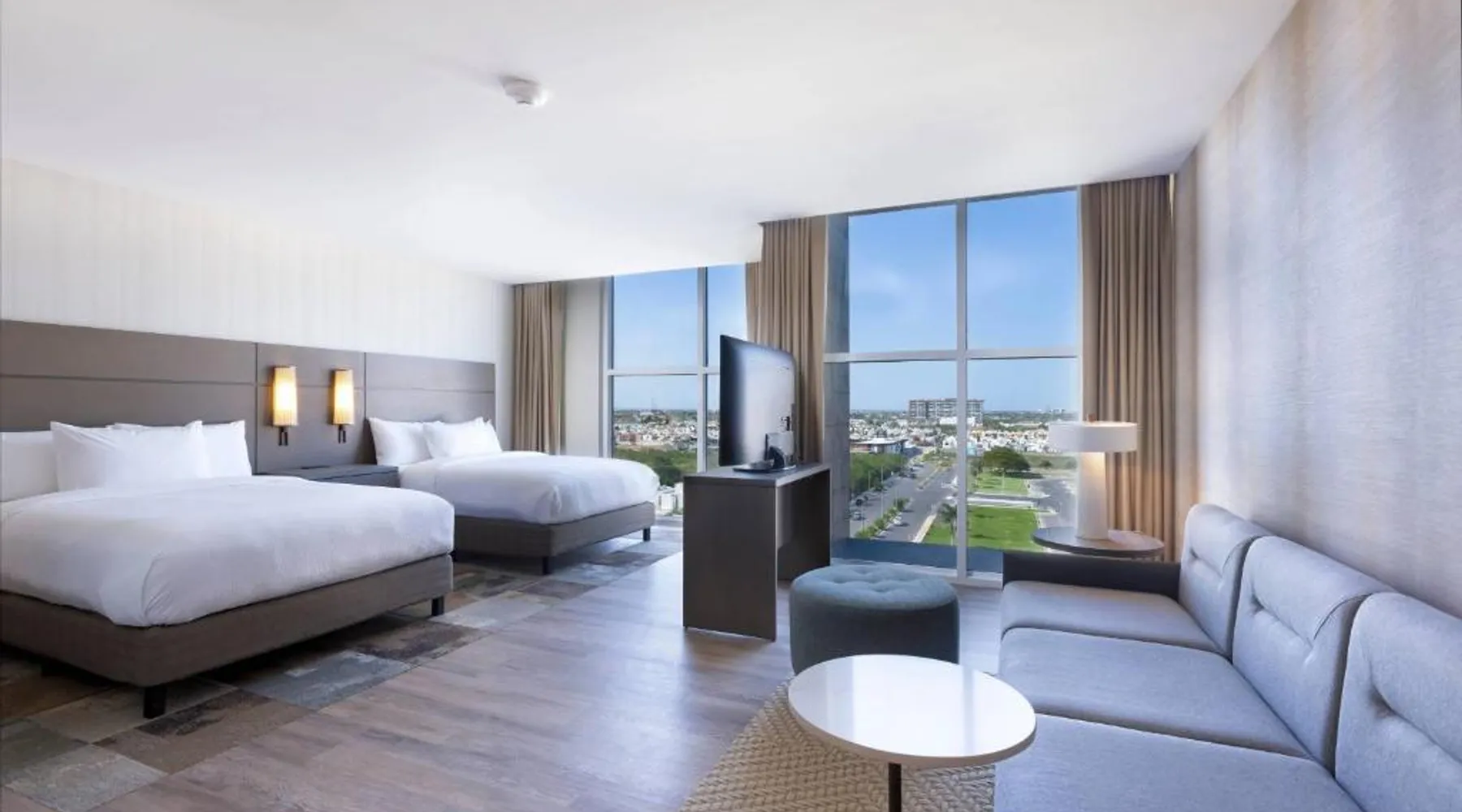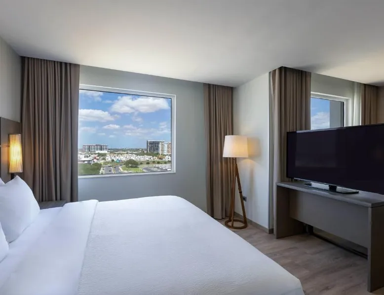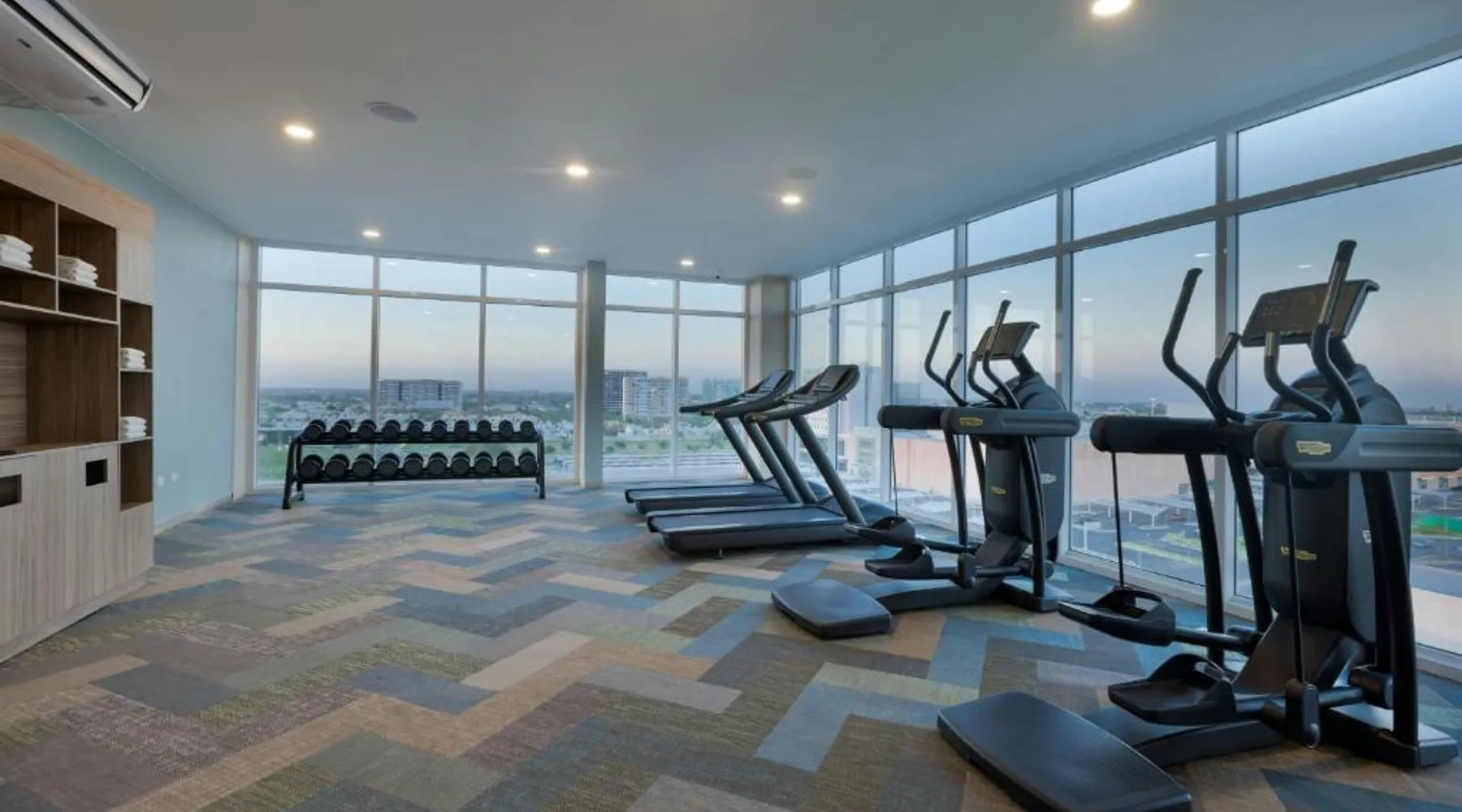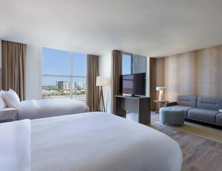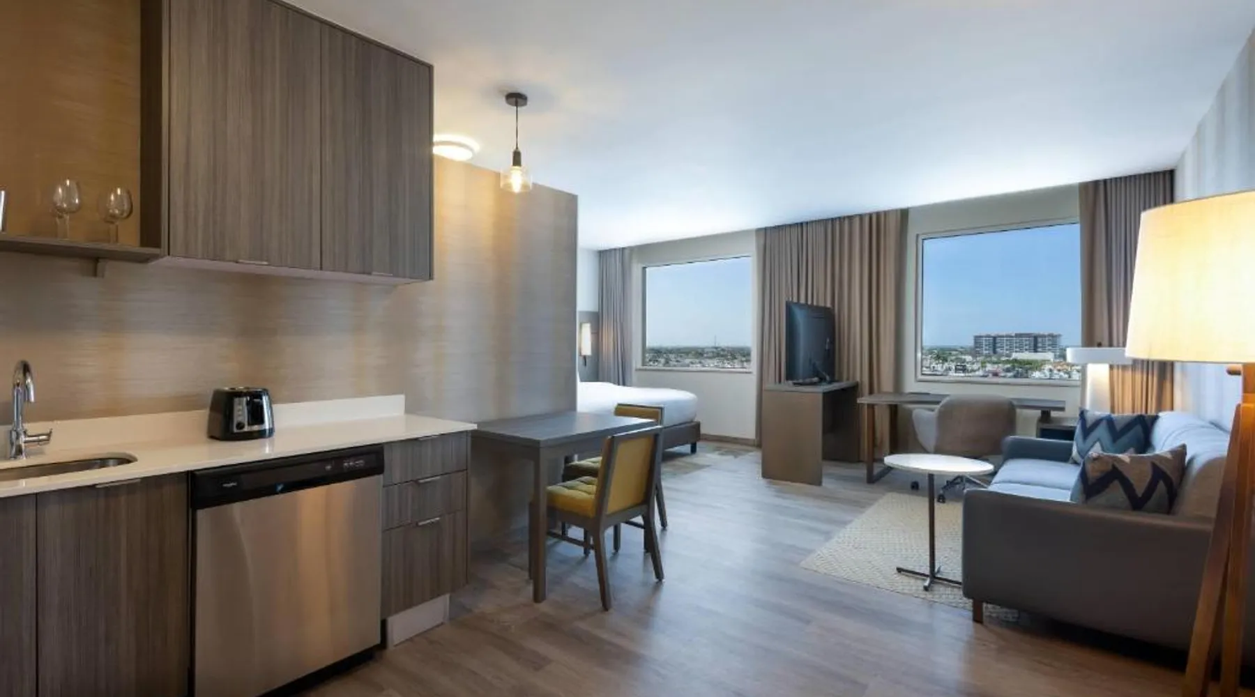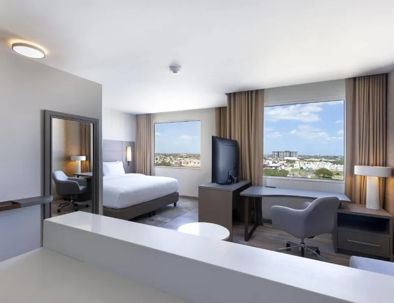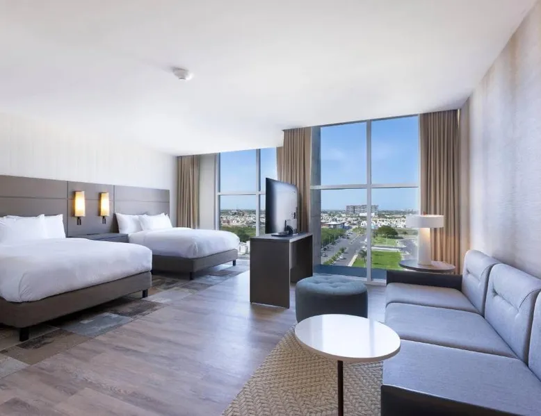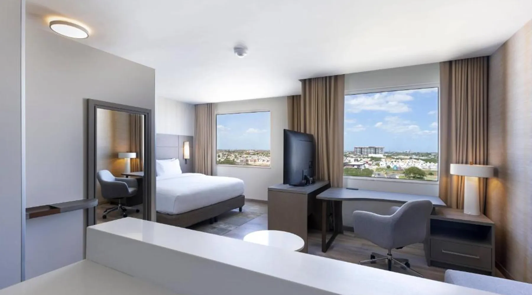Comfortable Accommodations: Residence Inn by Marriott Merida in Merida offers spacious rooms with air-conditioning, private bathrooms, and modern amenities. Guests appreciate the room comfort, size, and cleanliness. Exceptional Facilities: The hotel features a rooftop swimming pool, fitness center, sun terrace, and free WiFi. Additional facilities include a restaurant, public bath, fitness room, and 24-hour front desk. Dining Experience: A family-friendly restaurant serves local cuisine with an American breakfast. Outdoor seating areas provide a pleasant dining atmosphere. Prime Location: Located 8.7 mi from Manuel Crescencio Rejón International Airport, the hotel is near attractions such as Conventions Center Century XXI and Mundo Maya Museum, both 1.2 mi away. An ice-skating rink is in the surroundings. Featuring free toiletries, this double room includes a private bathroom with a walk-in shower. Guests can make meals in the kitchen that features a stovetop, a refrigerator, a dishwasher and kitchenware. The spacious air-conditioned double room features a flat-screen TV with satellite channels, a private entrance, a tea and coffee maker, a seating area as well as city views. The unit has 2 beds.