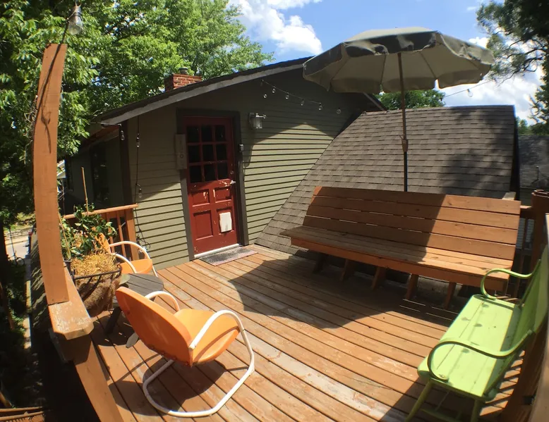 Second floor studio apartment in two story home in the heart of Bloomington. Space is entirely self-sufficient with private entrance. Three blocks from Bryan Park, this peaceful neighborhood of Elm Heights is within short walking distance of downtown and campus. Pets are welcome, but there is a pet fee. The space The space i am offering is comfortable, private and full of art (some that i make out of concrete and some by other talented folks) with vintage/modern decor. It is a renovated second story area in a home originally built in 1911 in the historic Elm Heights neighborhood. It is our home and we love it, and hope that you love it as much as us. Guest access Guests will have private access to the entire second floor. There is a nice fenced backyard with a firepit as well. There are occasionally musicians playing around it, and you are free to join in or just listen if you are so inclined. Other things to note Free off-street parking and use of washer and dryer upon request. Please Note: Pets are welcome, however there is a pet fee of $25/pet/night. Please count each pet as an extra guest when booking. Security cameras are present on the property. One aimed at the parking area, and one aimed at the steps leading up to the rental unit.