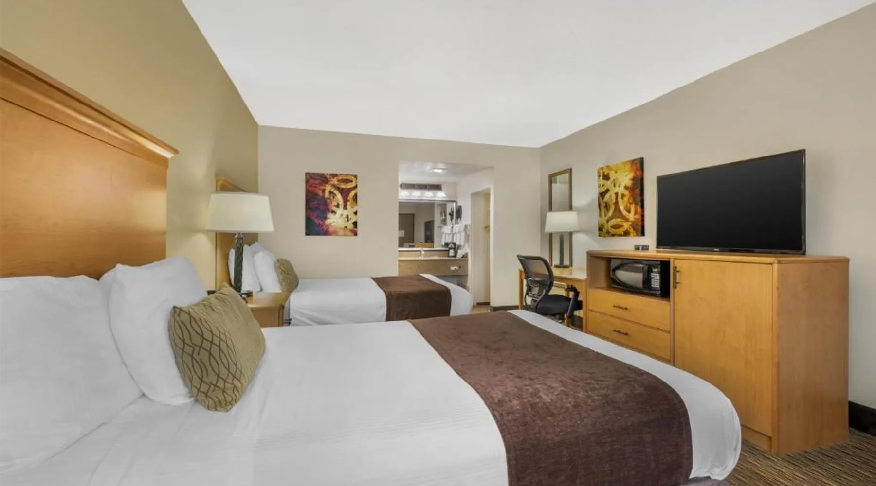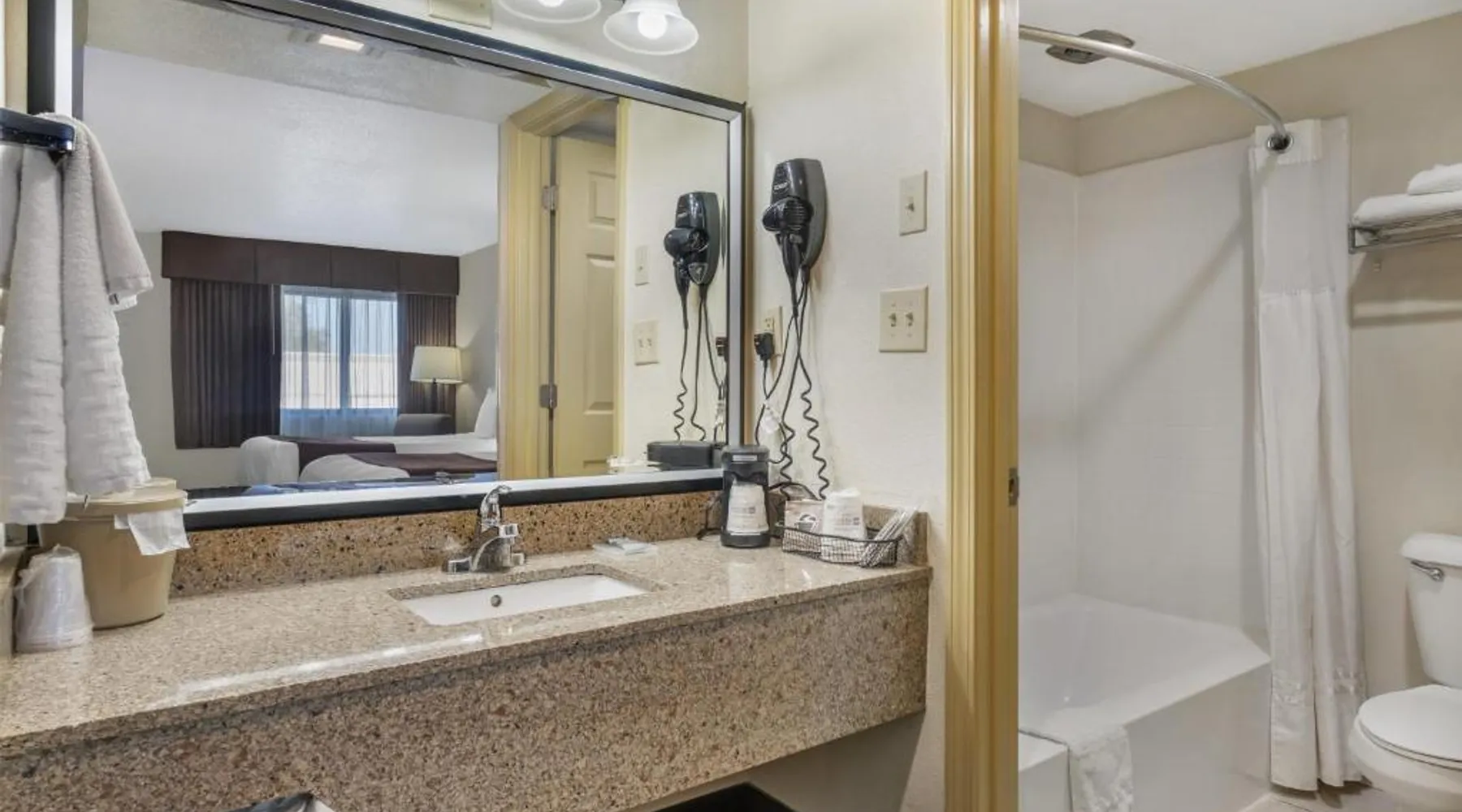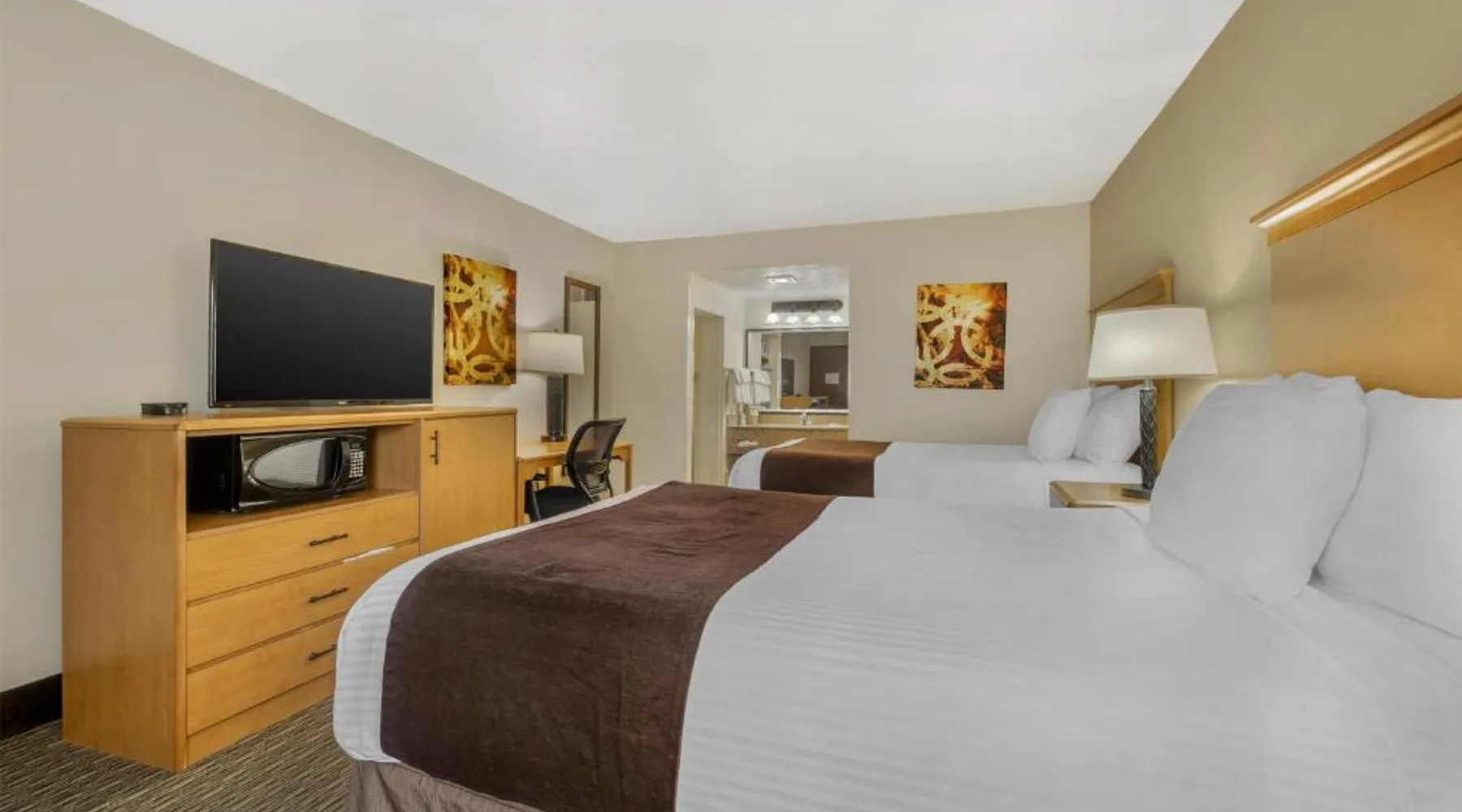 Comfortable Accommodations: Best Western Winchester Hotel in Winchester offers air-conditioned rooms with private bathrooms, tea and coffee makers, hairdryers, refrigerators, work desks, microwaves, bath or showers, carpeted floors, and TVs. Essential Facilities: Guests enjoy free WiFi, a 24-hour front desk, express check-in and check-out services, and free on-site private parking. Breakfast and Amenities: A continental breakfast is served with fresh pastries and fruits, providing a pleasant start to the day. Local Attractions: Located 25 mi from Blue Grass Airport, the hotel is near Fort Boonesborough State Park (9.9 mi), Mets Center and Boone Station State Historic Park (16 mi), and other attractions. This room has a cable TV, microwave and refrigerator.