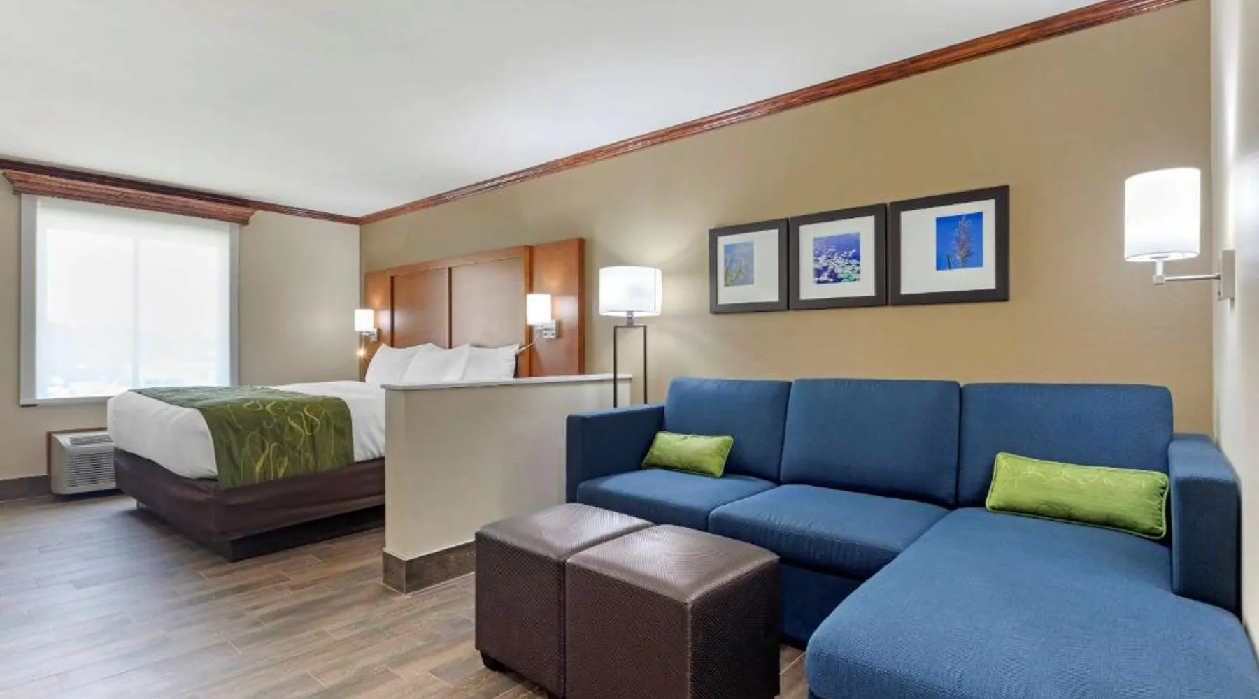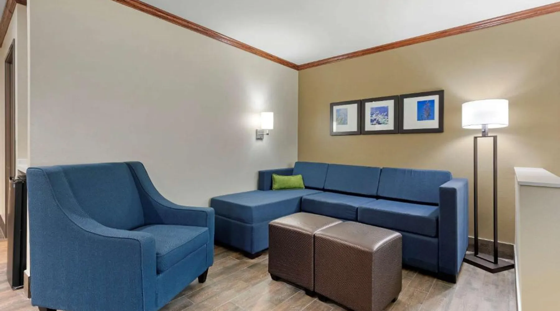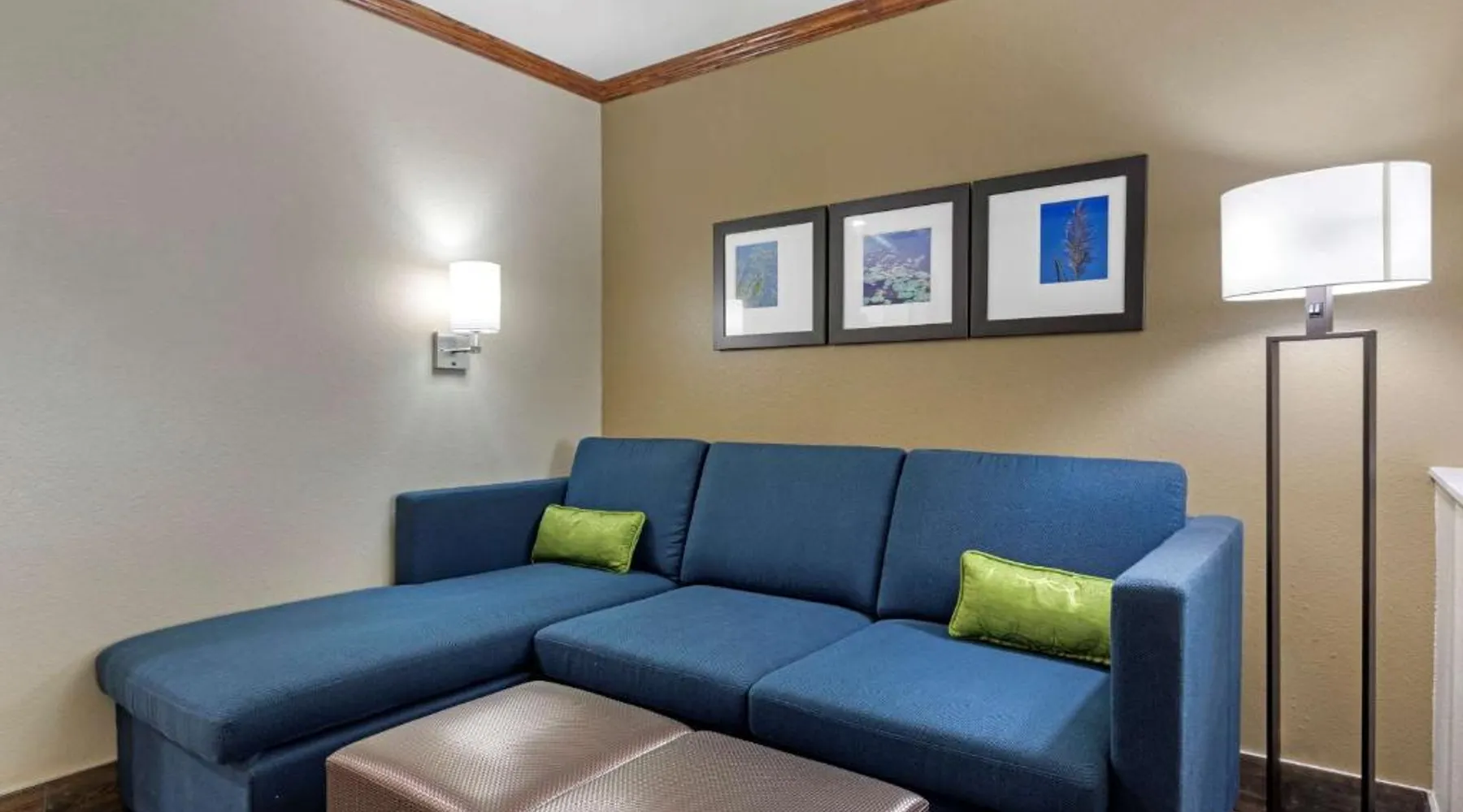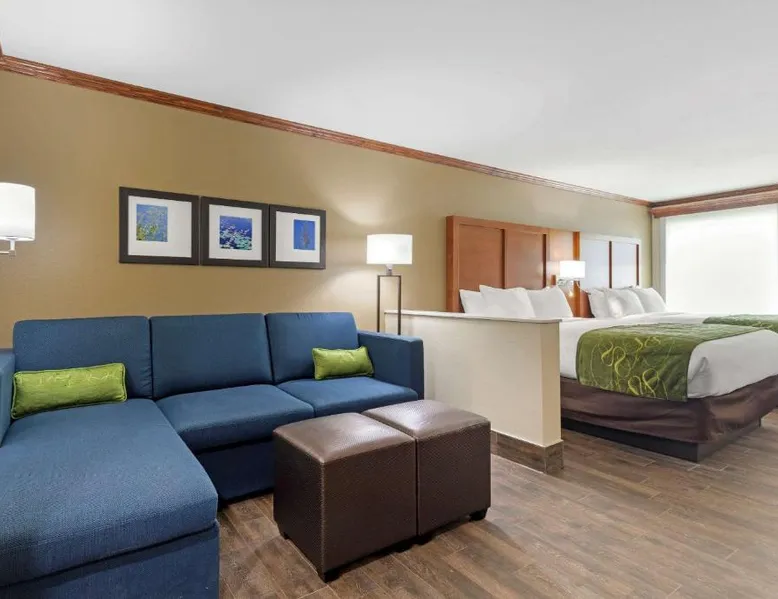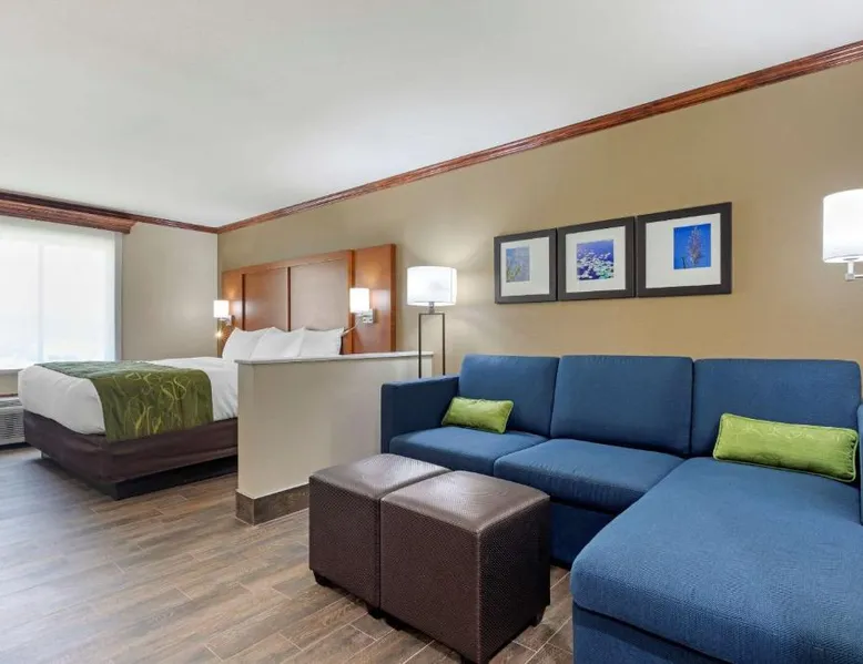 Comfortable Accommodations: Comfort Suites West Monroe near Ike Hamilton Expo Center in West Monroe offers comfortable rooms with free WiFi, air-conditioning, and modern amenities. Leisure Facilities: Guests can enjoy a fitness center, indoor swimming pool, and a bar. Additional facilities include a elevator, 24-hour front desk, business area, and free on-site private parking. Dining Experience: A complimentary American buffet breakfast is served daily, featuring warm dishes, juice, fresh pastries, pancakes, and fruits. Convenient Location: Located 11 mi from Monroe Regional Airport, the hotel is near attractions such as Ike Hamilton Expo Center (1.9 mi) and Malone Stadium (11 mi). Guests appreciate the convenient location and excellent breakfast. Meals can be prepared in the kitchen, which has a refrigerator, a microwave and a tea and coffee maker. The suite is furnished with a desk and a seating area.