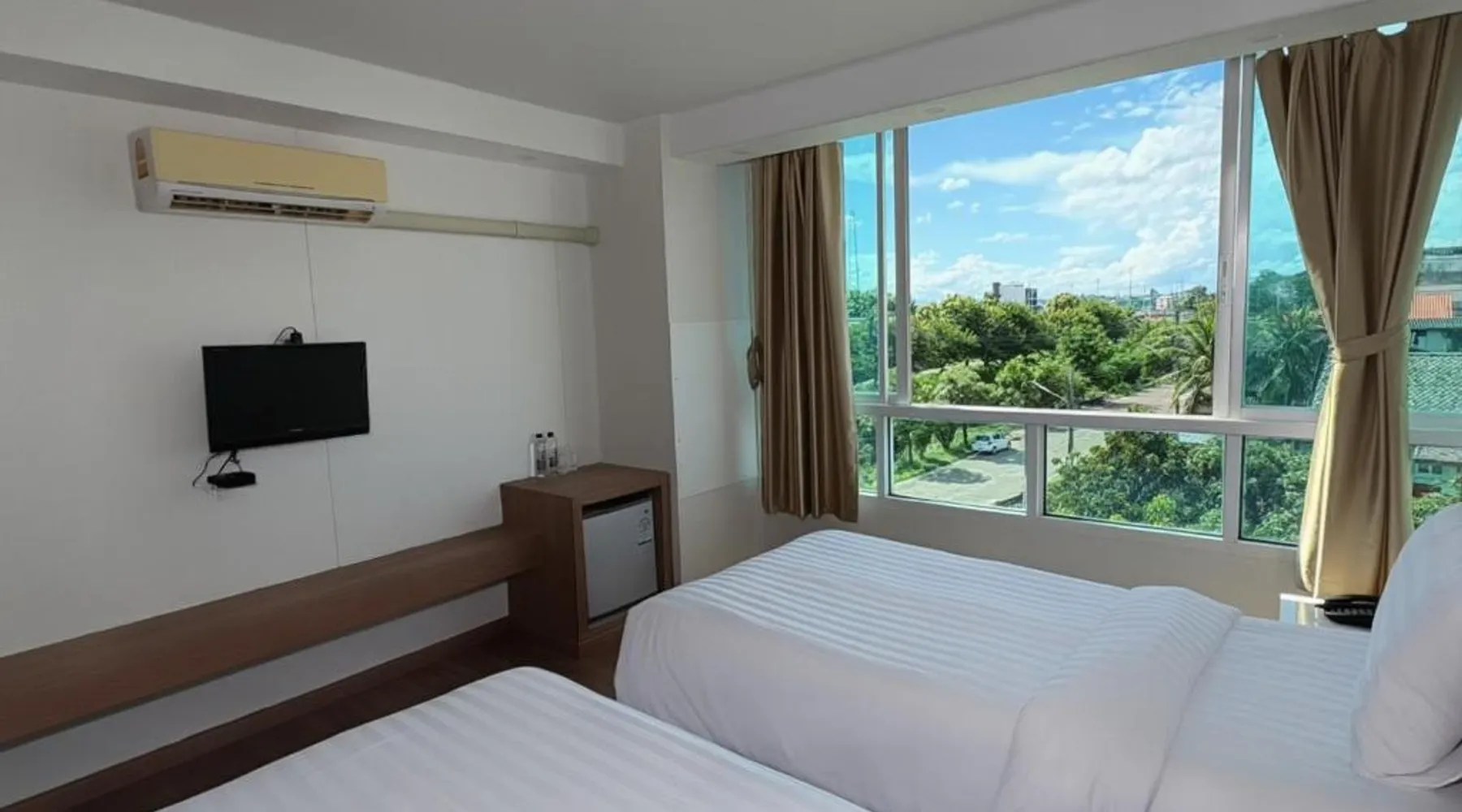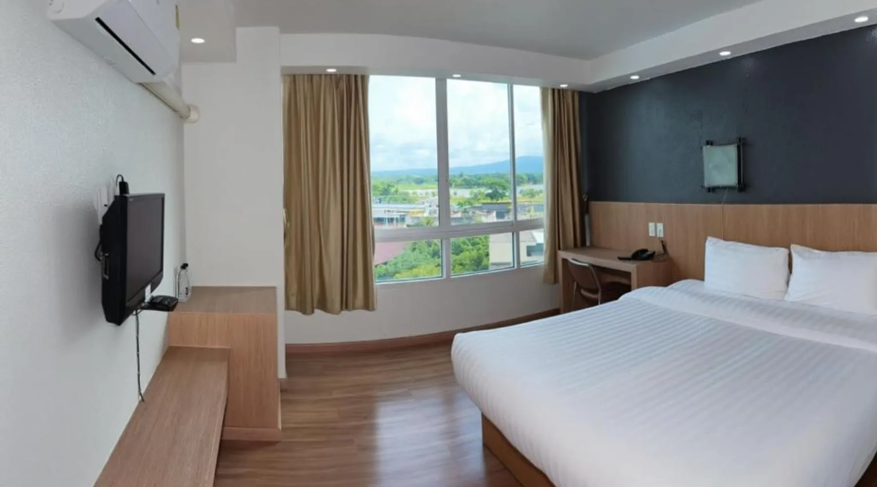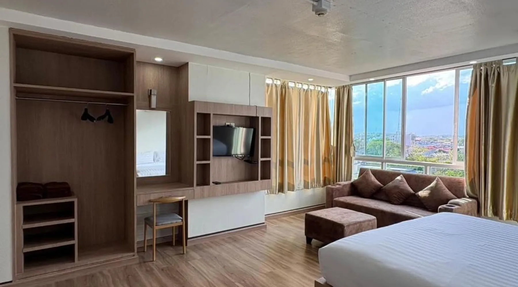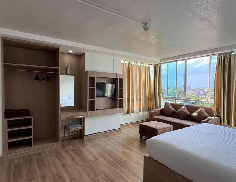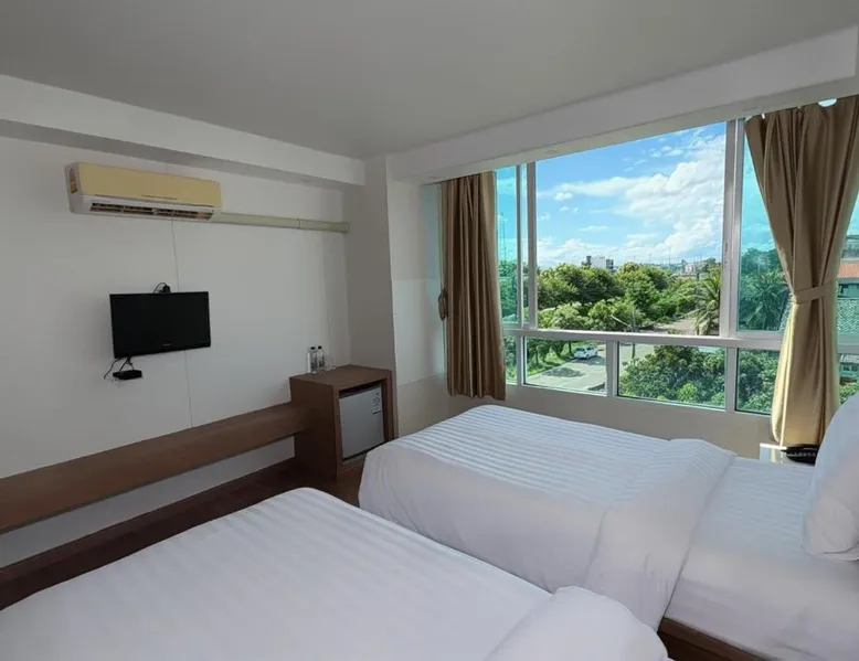 Comfortable Accommodations: KM Kwanphayao Hotel in Phayao offers family rooms with air-conditioning, private bathrooms, and city views. Each room includes a refrigerator, shower, TV, and wardrobe. Dining and Leisure: The family-friendly restaurant serves Thai and local cuisines with vegetarian and vegan options. Guests can also enjoy free WiFi, a coffee shop, and a minimarket. Facilities and Services: The hotel provides free bicycles, a 24-hour front desk, elevator, paid shuttle service, full-day security, and luggage storage. Free on-site private parking is available. Location and Attractions: Located 62 mi from Mae Fah Luang - Chiang Rai International Airport, the hotel is near attractions such as Phayao Lake and Phayao City. Featuring free toiletries, this family room includes a private bathroom with a shower and a hairdryer. The air-conditioned family room features a flat-screen TV with cable channels, a mini-bar, a tea and coffee maker, a dining area as well as lake views. The unit has 2 beds.