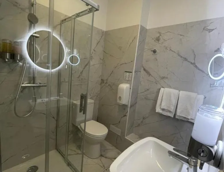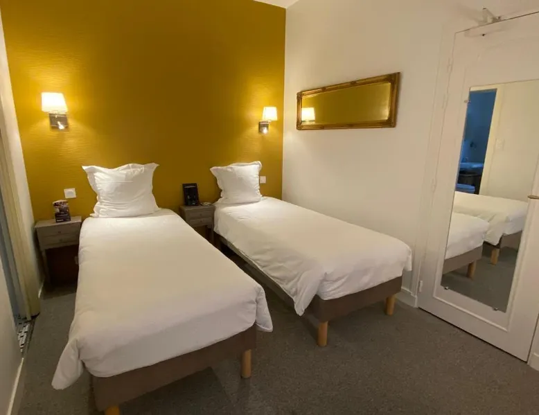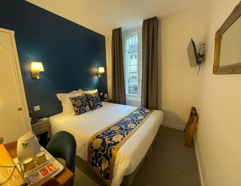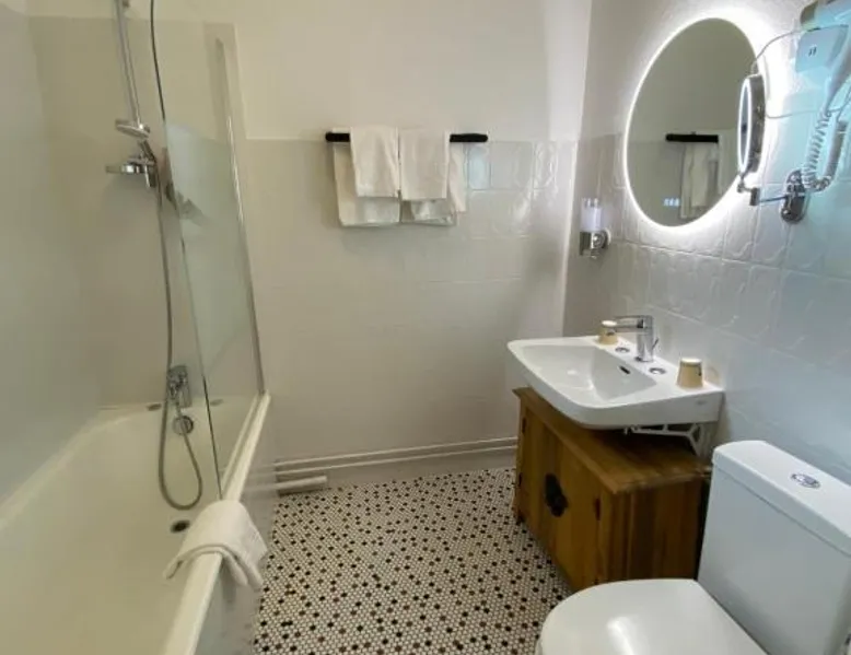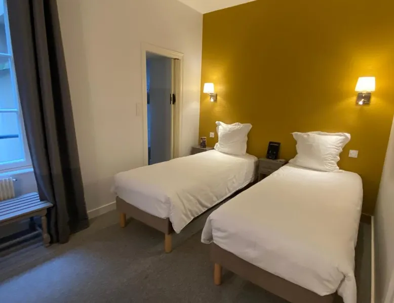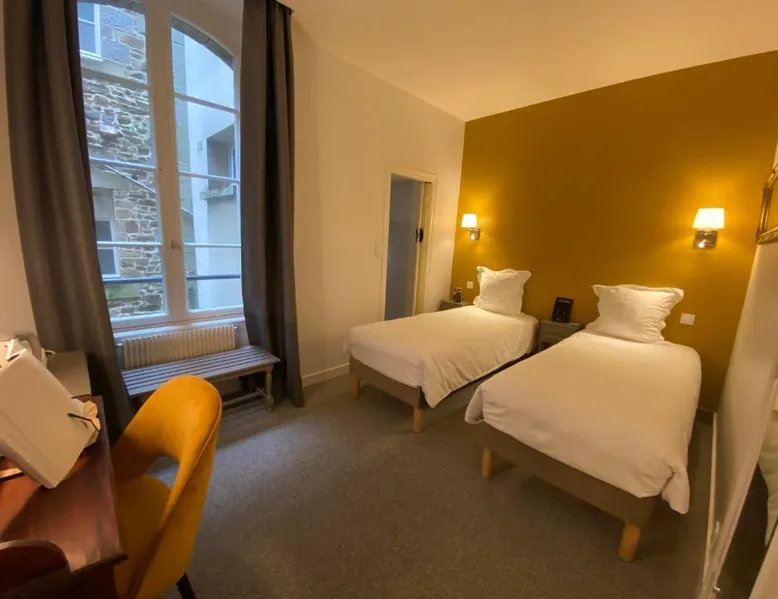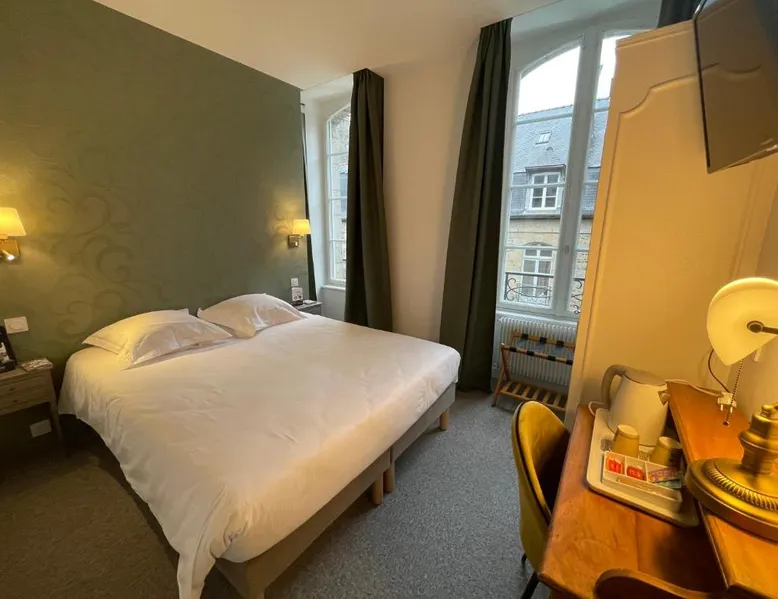 Comfortable Accommodations: Balzac Hôtel Restaurant in Fougères offers private bathrooms with free toiletries, city views, and modern amenities such as a TV and work desk. Each room includes a tea and coffee maker, electric kettle, and wardrobe. Dining Experience: Guests can enjoy French cuisine at the on-site restaurant, which serves dinner. Breakfast includes a continental buffet with fresh pastries, cheese, fruits, and juice. A coffee shop and lounge provide additional dining options. Convenient Facilities: The hotel features free WiFi, a lounge, elevator, bicycle parking, express check-in and check-out, and luggage storage. Additional amenities include a washing machine, kitchen, and dishwasher. Prime Location: Located 35 mi from Rennes–Saint-Jacques Airport, the hotel is near attractions such as the Scriptorial of Avranches (29 mi) and Mont Saint-Michel Abbey (29 mi). Guests appreciate the convenient and central location. With a flat-screen TV and satellite channels, this heated room features free Wi-Fi internet access.