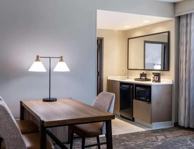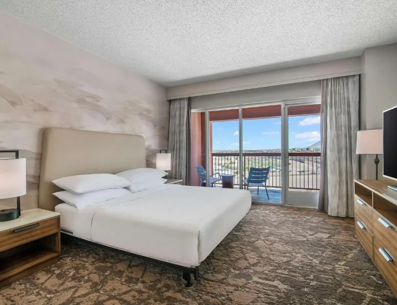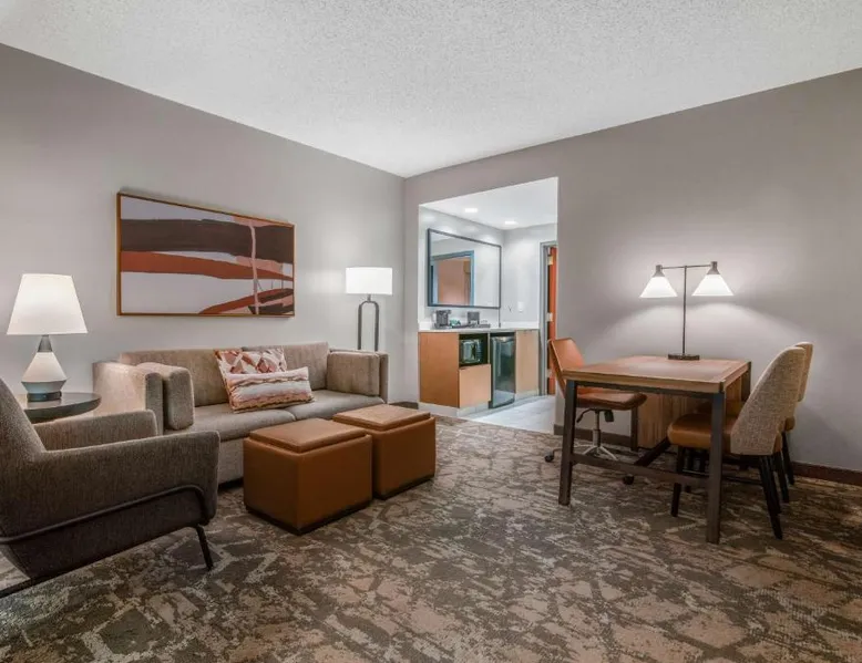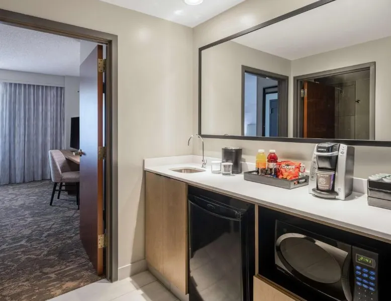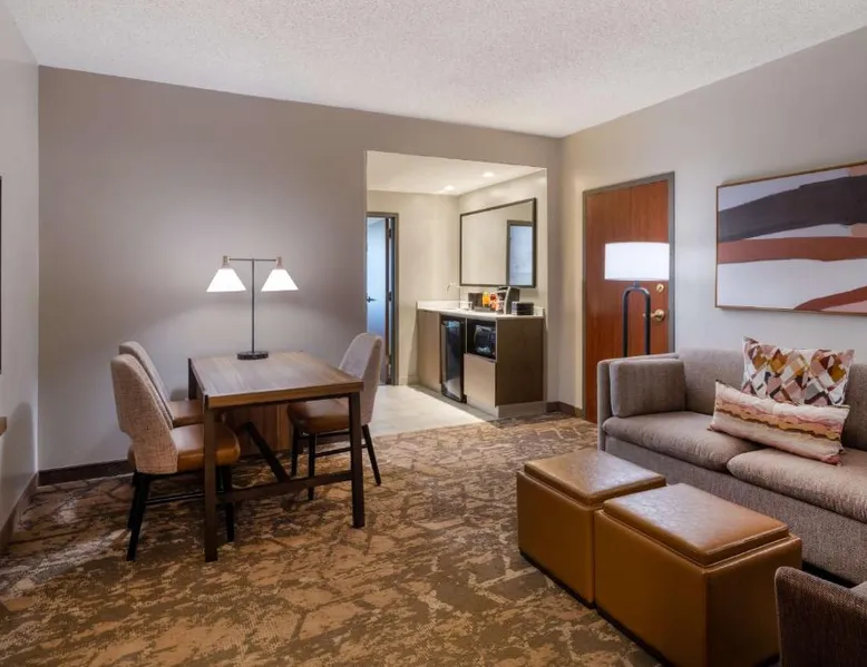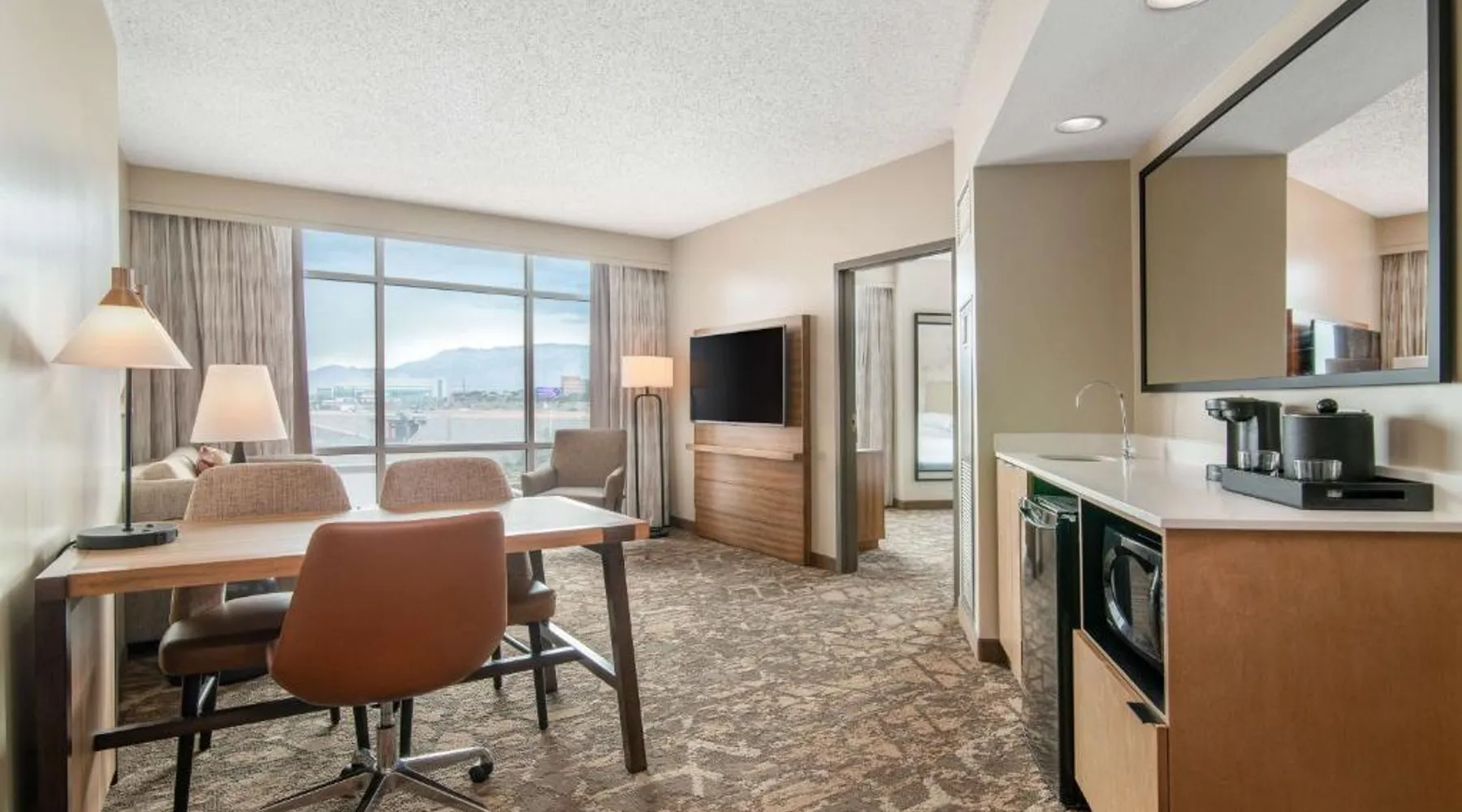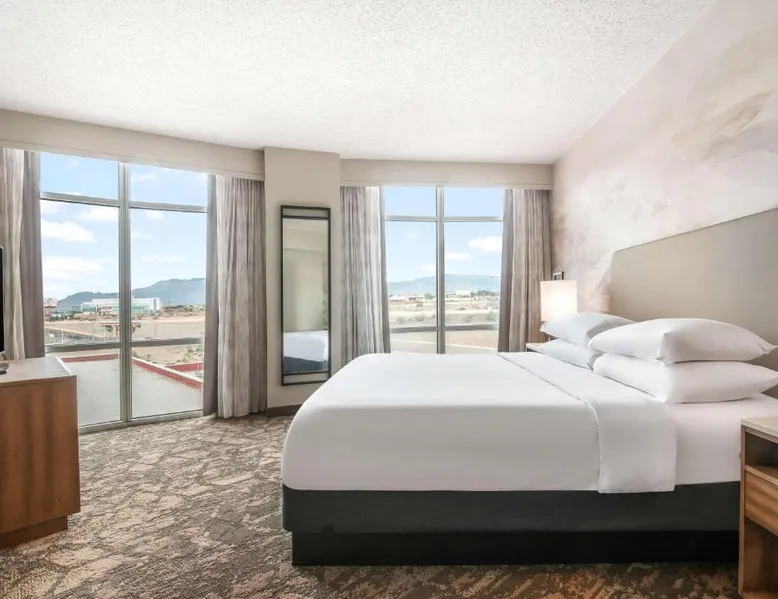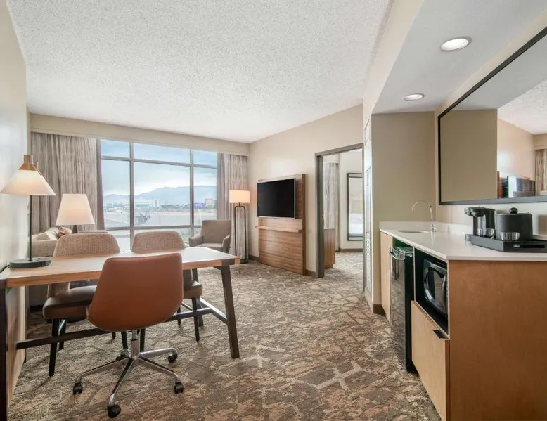 This downtown Albuquerque all-suite hotel includes a full-service spa. The hotel also features an indoor pool, a restaurant with cooked-to-order breakfasts and the suites provide cable TV with HBO. At the Embassy Suites by Hilton Albuquerque, each spacious 2-room suite includes a coffee maker, a microwave and a refrigerator. Guests can watch pay-per-view movies or sit on the balcony in select suites. The Embassy Suites by Hilton Albuquerque provides access to a gym. Guests can receive massages at the on-site spa or have a drink at the bar. Room service is available along with laundry facilities and a gift shop. Located close to the Embassy Suites by Hilton Albuquerque is the campus of the University of New Mexico as well as the Albuquerque Convention Center. The historic Old Town area, the Rio Grande Zoo and Sandia Casino are within driving distance. The suite offers air conditioning, a tea and coffee maker, a seating area, a safe deposit box and a flat-screen TV with cable channels. The unit offers 1 bed.