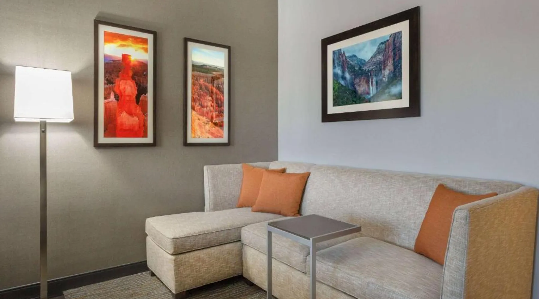 Comfortable Accommodations: Wingate by Wyndham Hurricane Zion National Park in Hurricane offers family rooms with air-conditioning, private bathrooms, and free WiFi. Each room includes a work desk, refrigerator, and TV. Leisure Facilities: Guests can enjoy a year-round outdoor swimming pool, hot tub, and outdoor fireplace. Additional amenities include a lounge, outdoor seating area, and bicycle parking. Dining Experience: A buffet breakfast is served daily, featuring juice, cheese, and fruits. The on-site minimarket provides convenience for guests. Location and Attractions: Located 17 mi from St. George Regional Airport, the hotel is near attractions such as St George Temple (18 mi) and Pine Valley Chapel (14 mi). Hiking opportunities are available nearby. Providing free toiletries, this family room includes a private bathroom with a bath, a shower and a hairdryer. The family room provides air conditioning, soundproof walls, a tea and coffee maker, a wardrobe, as well as a flat-screen TV with streaming services. The unit offers 2 beds.