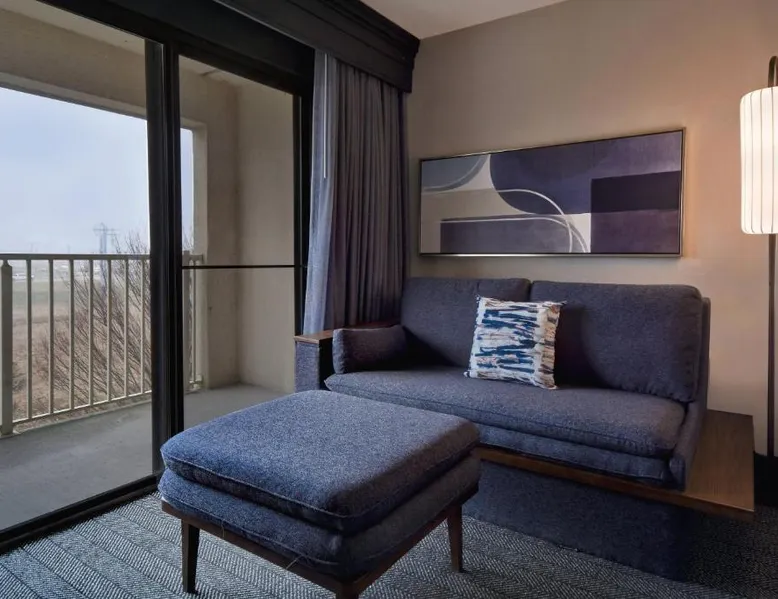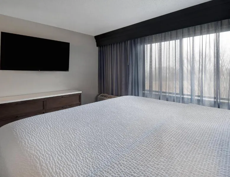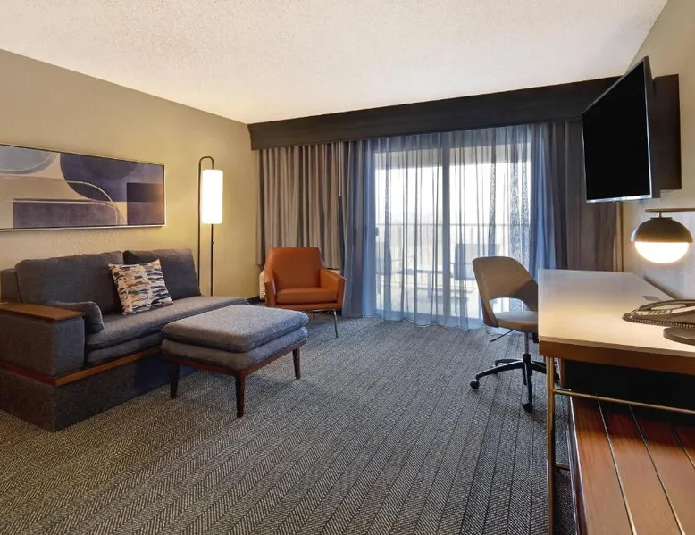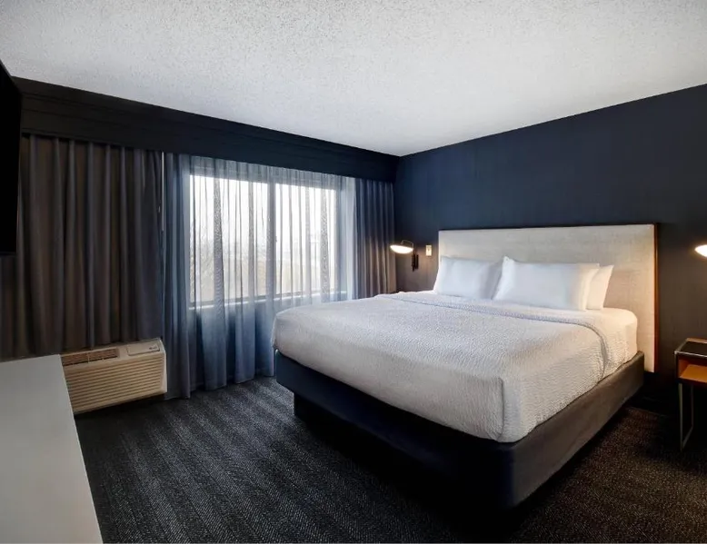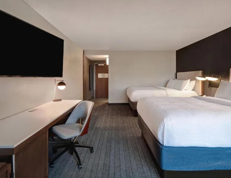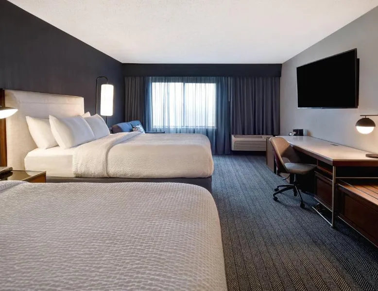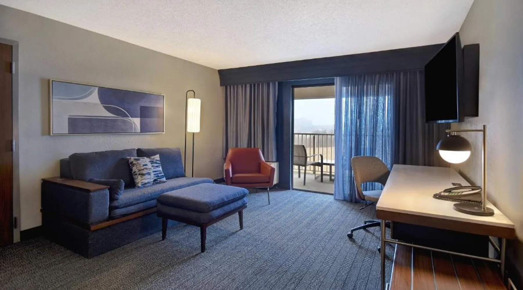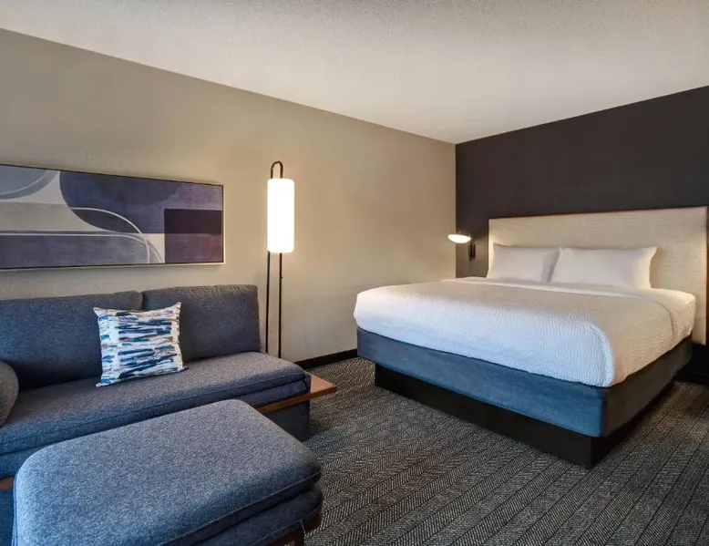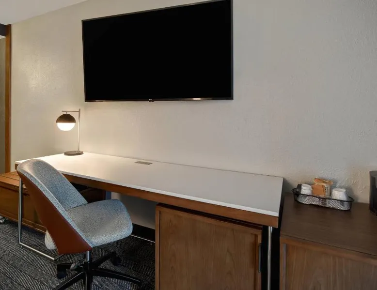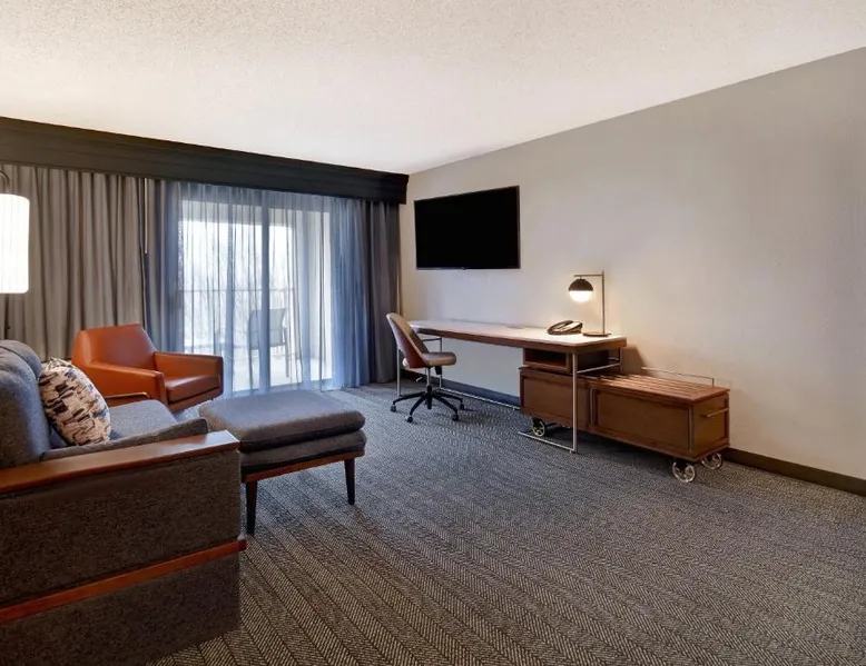 Comfortable Accommodations: Courtyard by Marriott Cincinnati Airport in Erlanger offers family rooms with air-conditioning, private bathrooms, and free WiFi. Each room includes a work desk, sofa bed, and TV. Dining and Amenities: The hotel features a restaurant serving American cuisine for dinner. Guests can relax on the sun terrace or enjoy the on-site restaurant. Additional facilities include a minimarket, picnic area, and electric vehicle charging station. Convenient Location: Located 1.2 mi from Cincinnati/Northern Kentucky International Airport, the hotel is close to attractions such as Pioneer Park (7.5 mi) and the Cincinnati Zoo (14 mi). Free on-site private parking is available. Guest Satisfaction: Highly rated for its convenient location, connectivity to the airport, and attentive staff, the hotel ensures a pleasant stay for all visitors. Featuring a seating area with a sofa bed, this room also has a flat-screen cable TV and a desk.