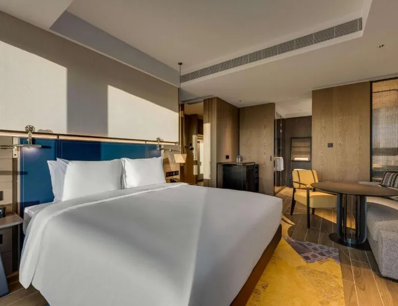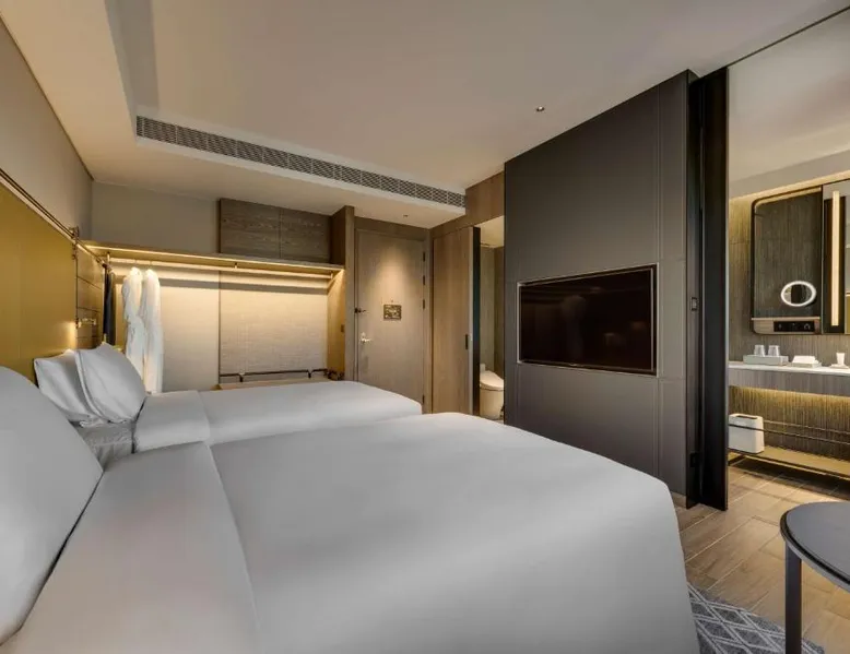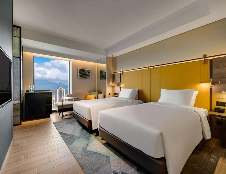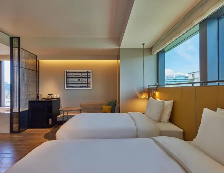 Comfortable Accommodations: Hotel Resonance Taipei, Tapestry Collection by Hilton in Taipei offers comfortable rooms with air-conditioning, balconies, and modern amenities. Each room includes a tea and coffee maker, mini-bar, and free WiFi. Exceptional Facilities: Guests can enjoy a fitness center, free WiFi in public areas, and a paid airport shuttle service. Additional facilities include a coffee shop, 24-hour front desk, daily housekeeping, full-day security, and a tour desk. Prime Location: Located 2.5 mi from Taipei Songshan Airport, the hotel is an 8-minute walk from Taipei Main Station. Nearby attractions include National Chiang Kai-Shek Memorial Hall (0.9 mi) and Taipei Botanical Garden (1.7 mi). Guest Satisfaction: Highly rated for its convenient location, room comfort, and attentive staff, the hotel ensures a pleasant stay for all visitors. The spacious double room provides air conditioning, a mini-bar, a tea and coffee maker, a safe deposit box, as well as a flat-screen TV with cable channels. The unit offers 2 beds.