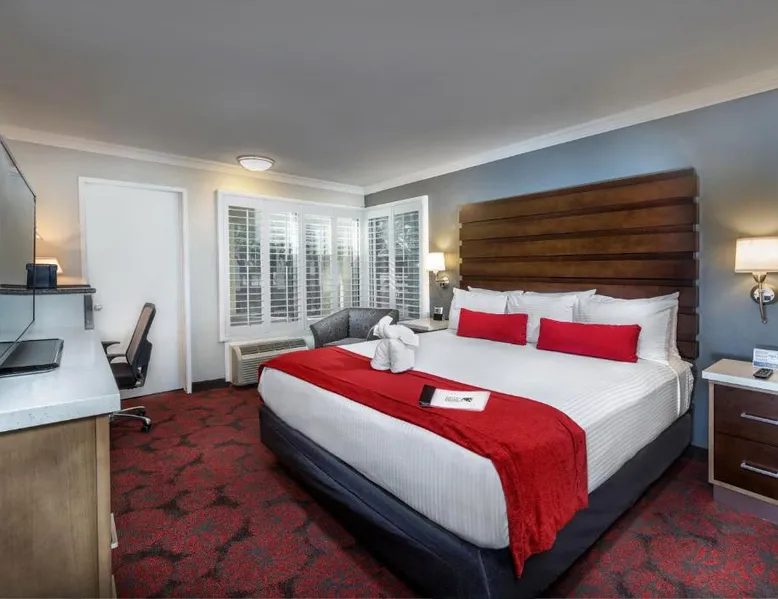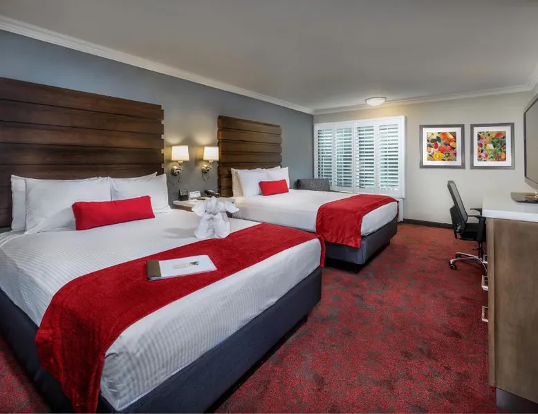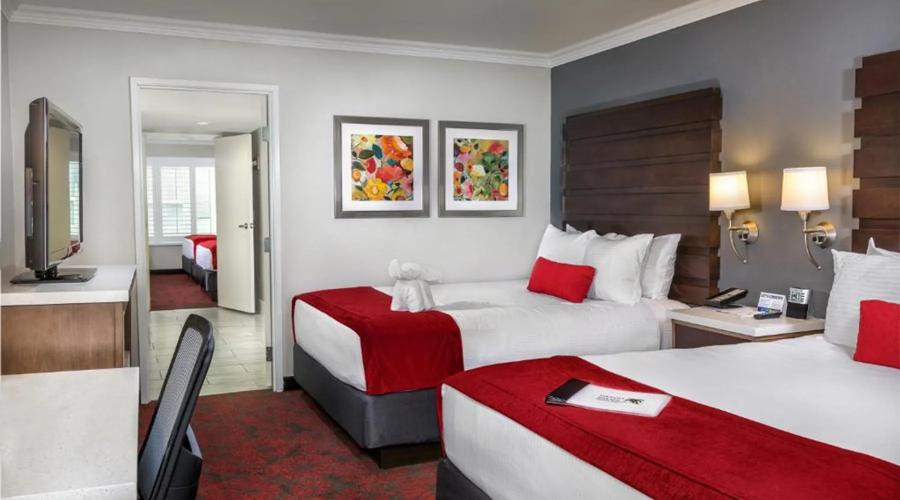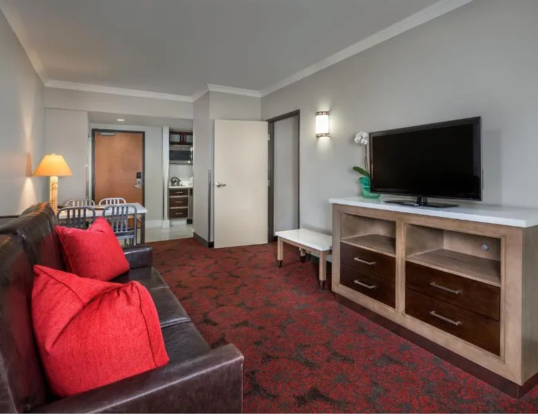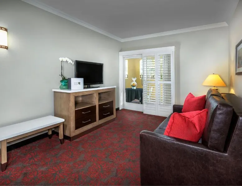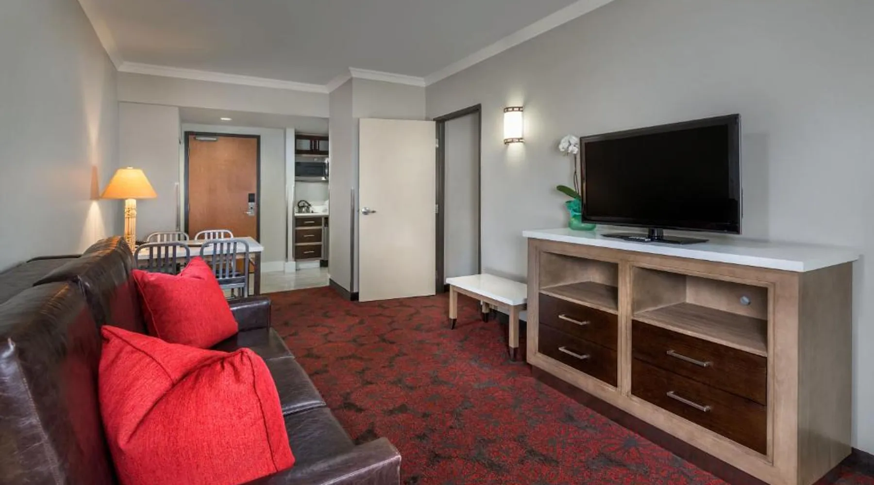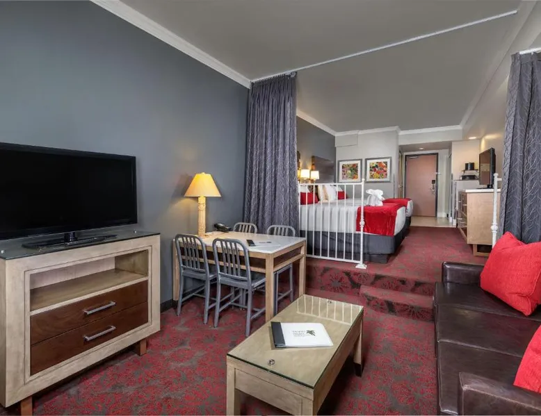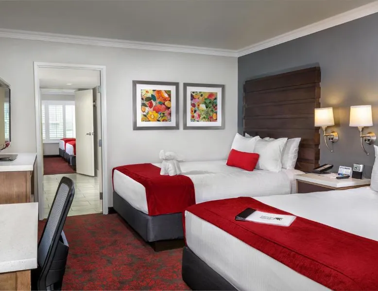 This Anaheim hotel is within a 10-minute walk of Disneyland. It have an outdoor swimming pool. Desert Palms Hotel & Suites Anaheim Resort features a refrigerator and microwave in every guest room. Cable TV and free Wi-Fi are also included in each room. Suites offer separate sitting areas. Guests can use the gym or the 24-hour business center at the Anaheim Desert Palms. Disneyland tickets are available from the front desk. The Anaheim Convention Center is across the street from the Desert Palms in Anaheim. The Honda Center entertainment and event venue is 10 minutes away. Spacious suite offers a kitchenette