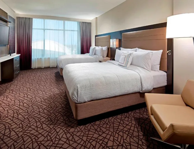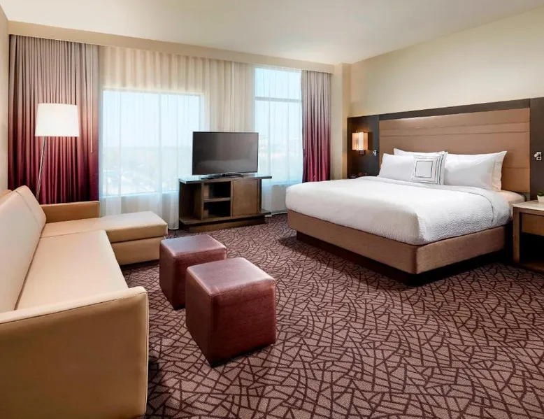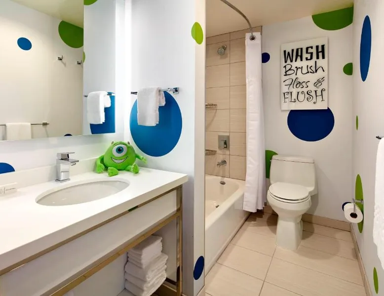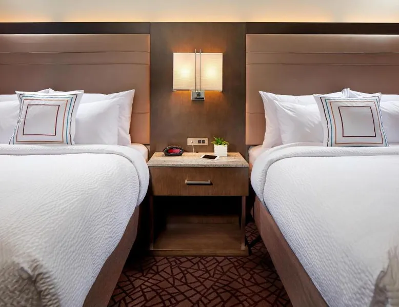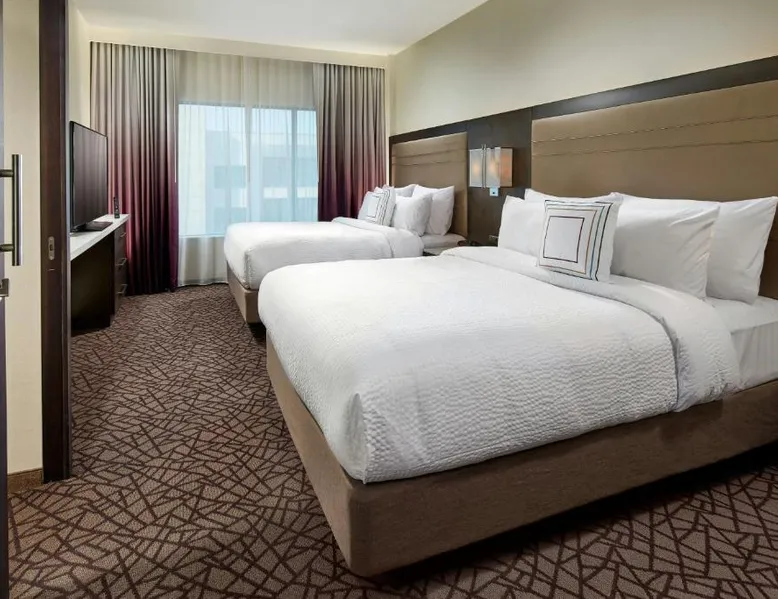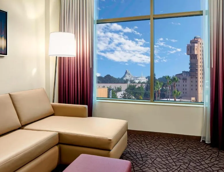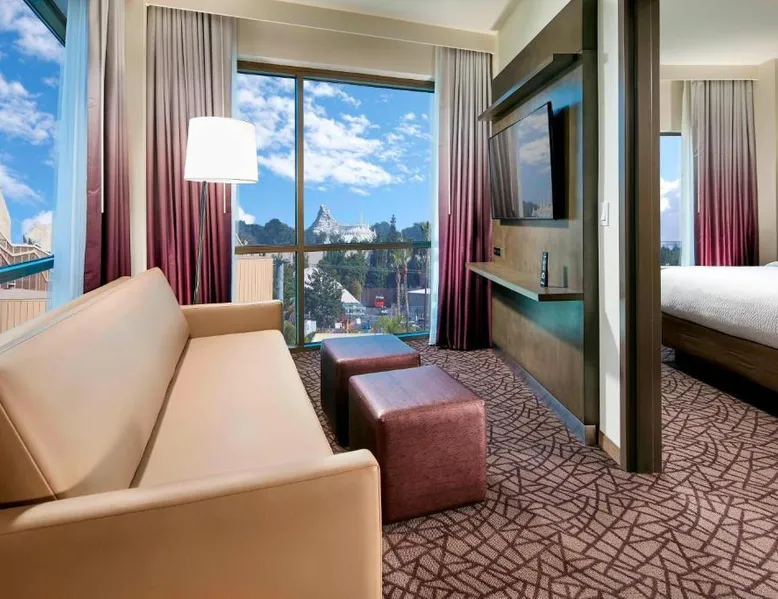 Just 1 mile from Disneyland Adventure Park'd entrance, this Residence Inn offers spacious rooms with a cable TV. It features a sun deck. All rooms are warmly decorated and are furnished with a seating area and granite bathroom counter tops. Disney themed suites are available. Each room has a fully equipped kitchen. The spacious studios, both the 1- and 2-bedroom suites, separate the living and sleeping areas. Kids' suites are brightly themed with bunk beds and bathroom. Guests can enjoy free access to the fitness center next to the hotel and the concierge desk is available to assist with tourism planning. Guests can also access the rooftop pool with cabanas. Daily breakfast is provided. A convenience store is located onsite. This Residence Inn offers 1 meeting room, 275 square feet. The Anaheim Convention Center is also 4 minutes walk from this hotel, and Riverview Golf Course is 4.6 miles away. The John Wayne Airport is 12 mi away. This suite offers 1 bedroom with 2 queen beds. It includes a queen size sofa bed in the living room. The suite has a microwave, a TV with cable channels, and a seating area.