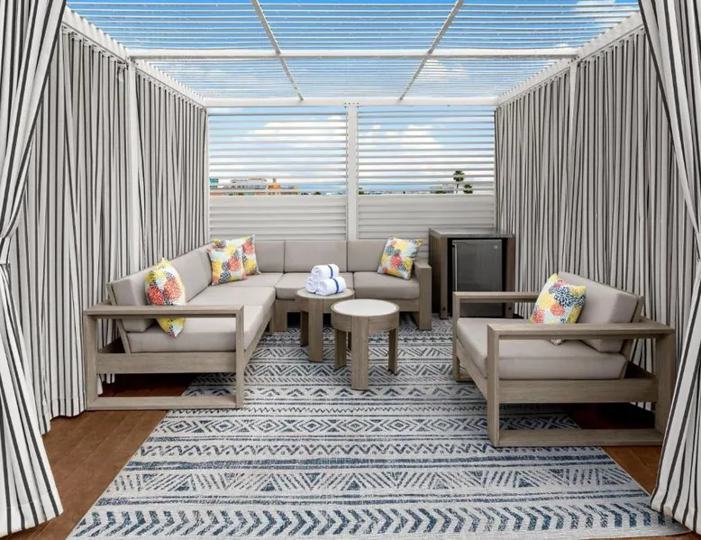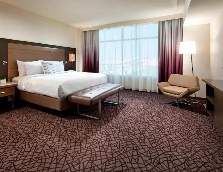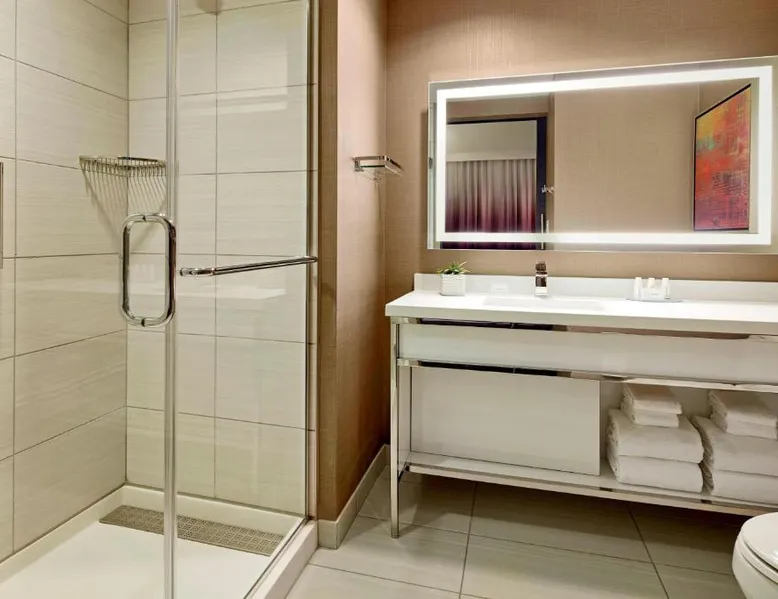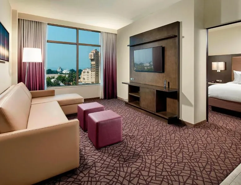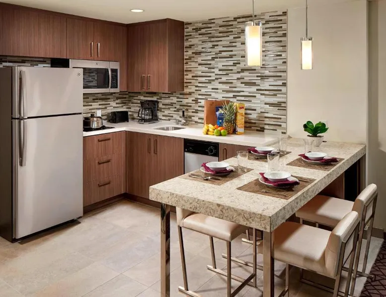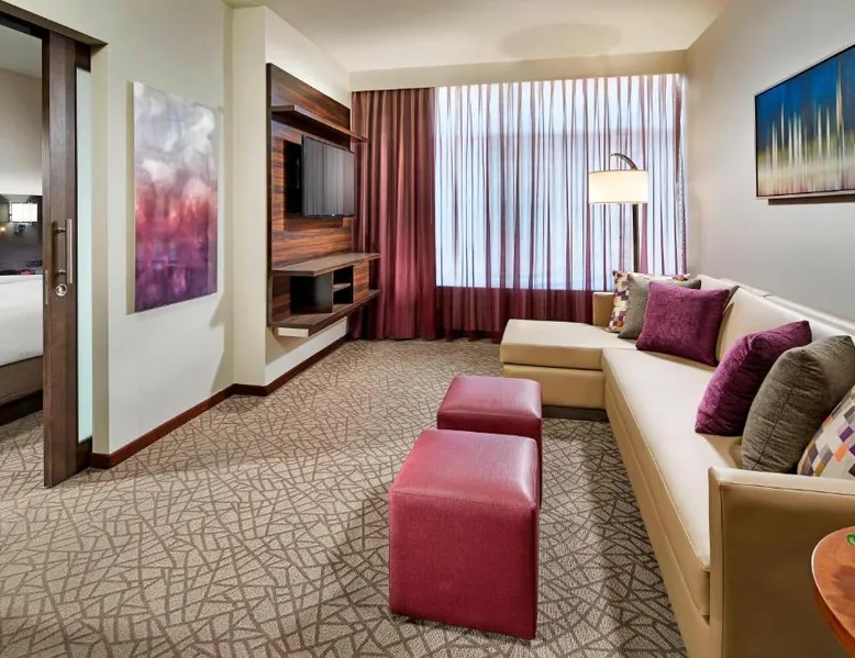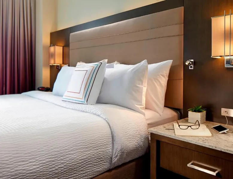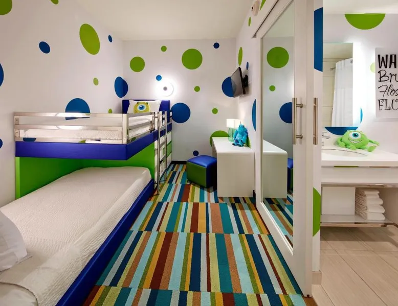 Just 1 mile from Disneyland Adventure Park'd entrance, this Residence Inn offers spacious rooms with a cable TV. It features a sun deck. All rooms are warmly decorated and are furnished with a seating area and granite bathroom counter tops. Disney themed suites are available. Each room has a fully equipped kitchen. The spacious studios, both the 1- and 2-bedroom suites, separate the living and sleeping areas. Kids' suites are brightly themed with bunk beds and bathroom. Guests can enjoy free access to the fitness center next to the hotel and the concierge desk is available to assist with tourism planning. Guests can also access the rooftop pool with cabanas. Daily breakfast is provided. A convenience store is located onsite. This Residence Inn offers 1 meeting room, 275 square feet. The Anaheim Convention Center is also 4 minutes walk from this hotel, and Riverview Golf Course is 4.6 miles away. The John Wayne Airport is 12 mi away. This suite offers 1 bedroom with 2 queen beds. It includes a queen size sofa bed in the living room. The suite has a microwave, a TV with cable channels, and a seating area.